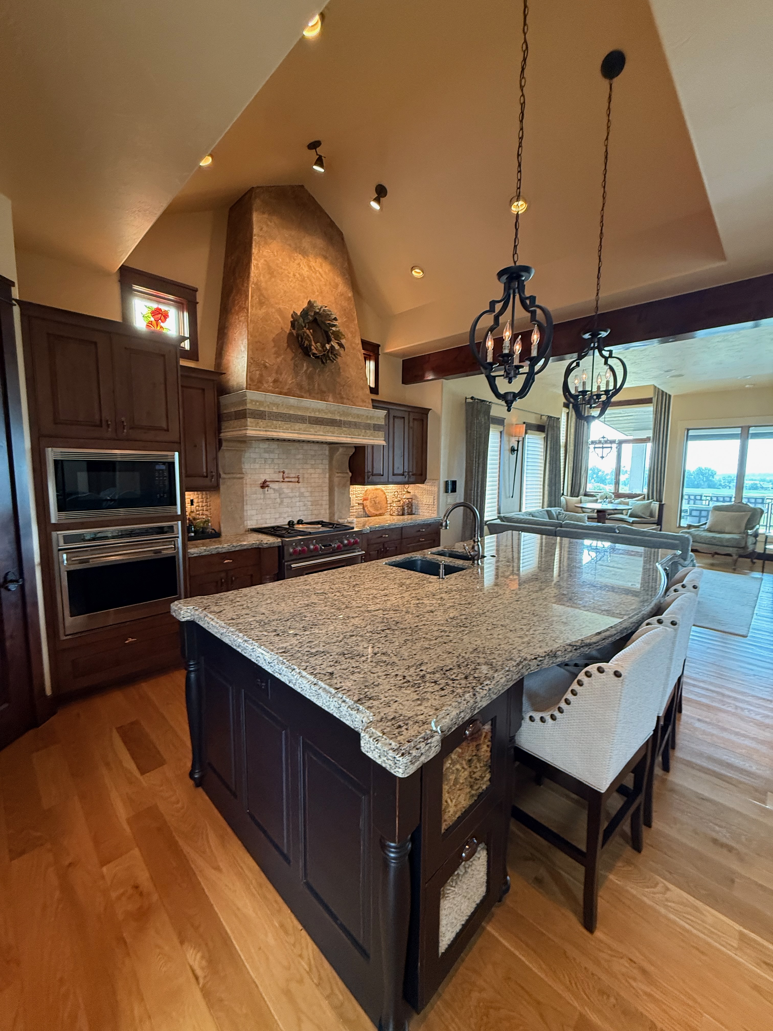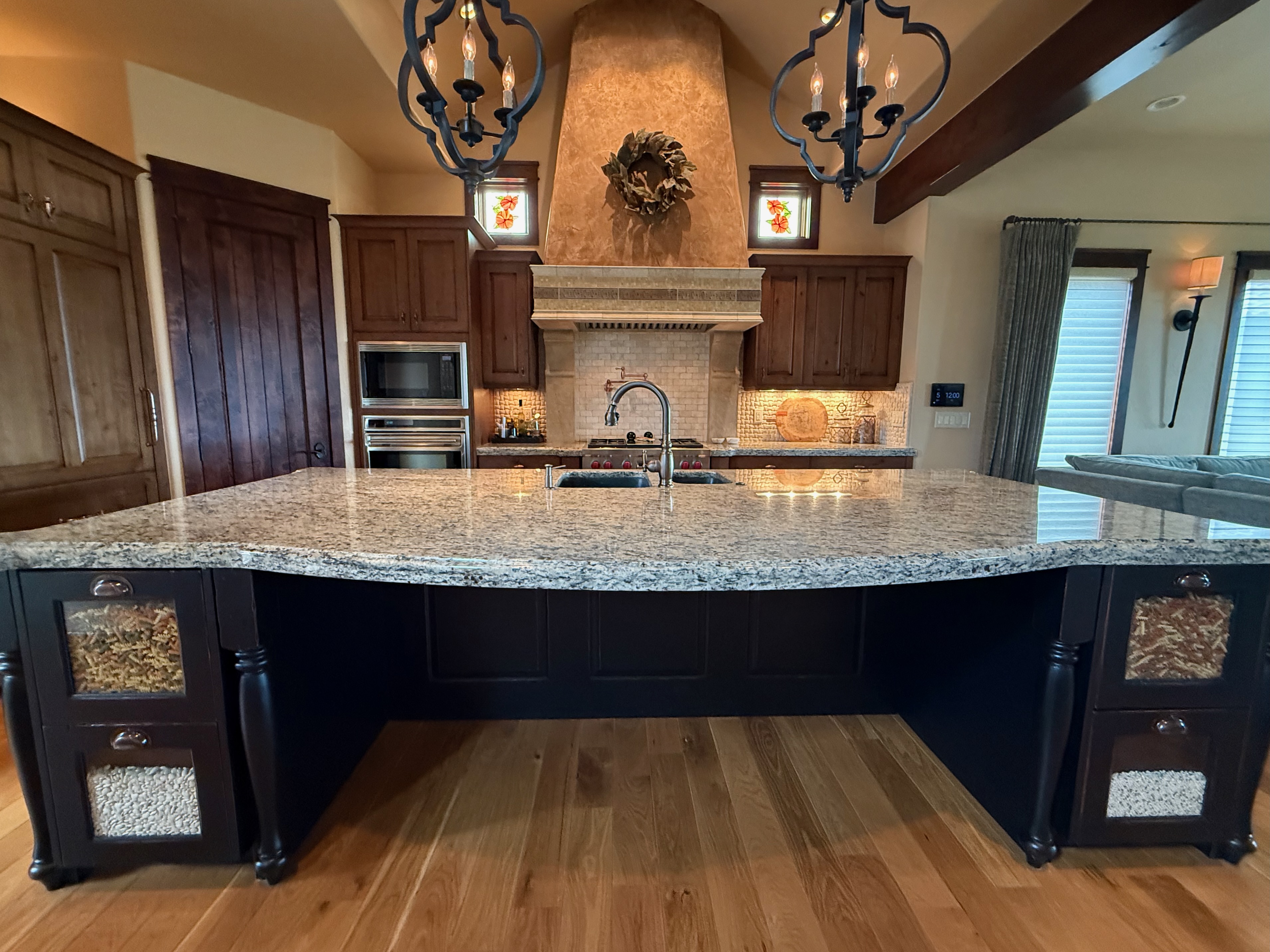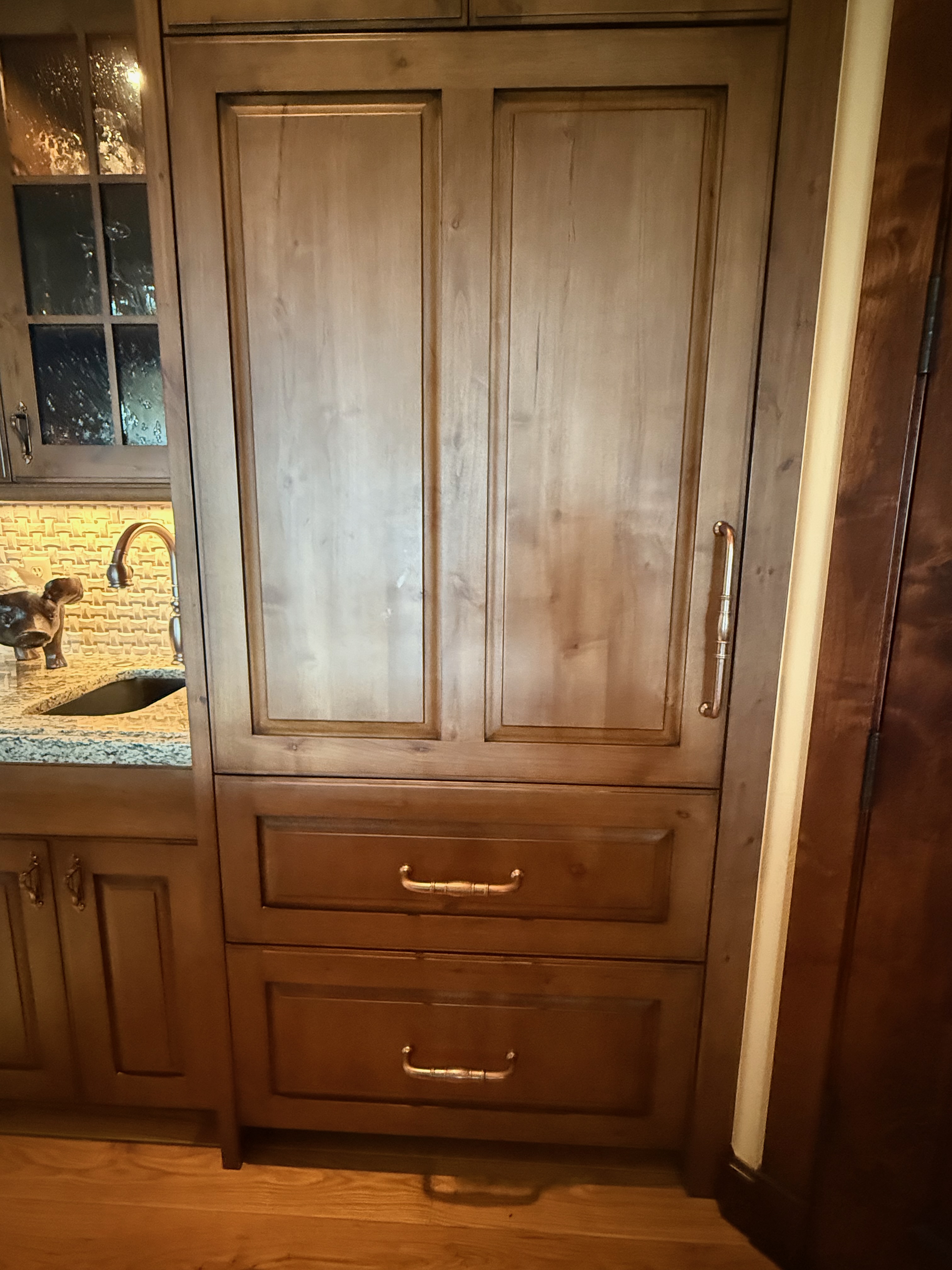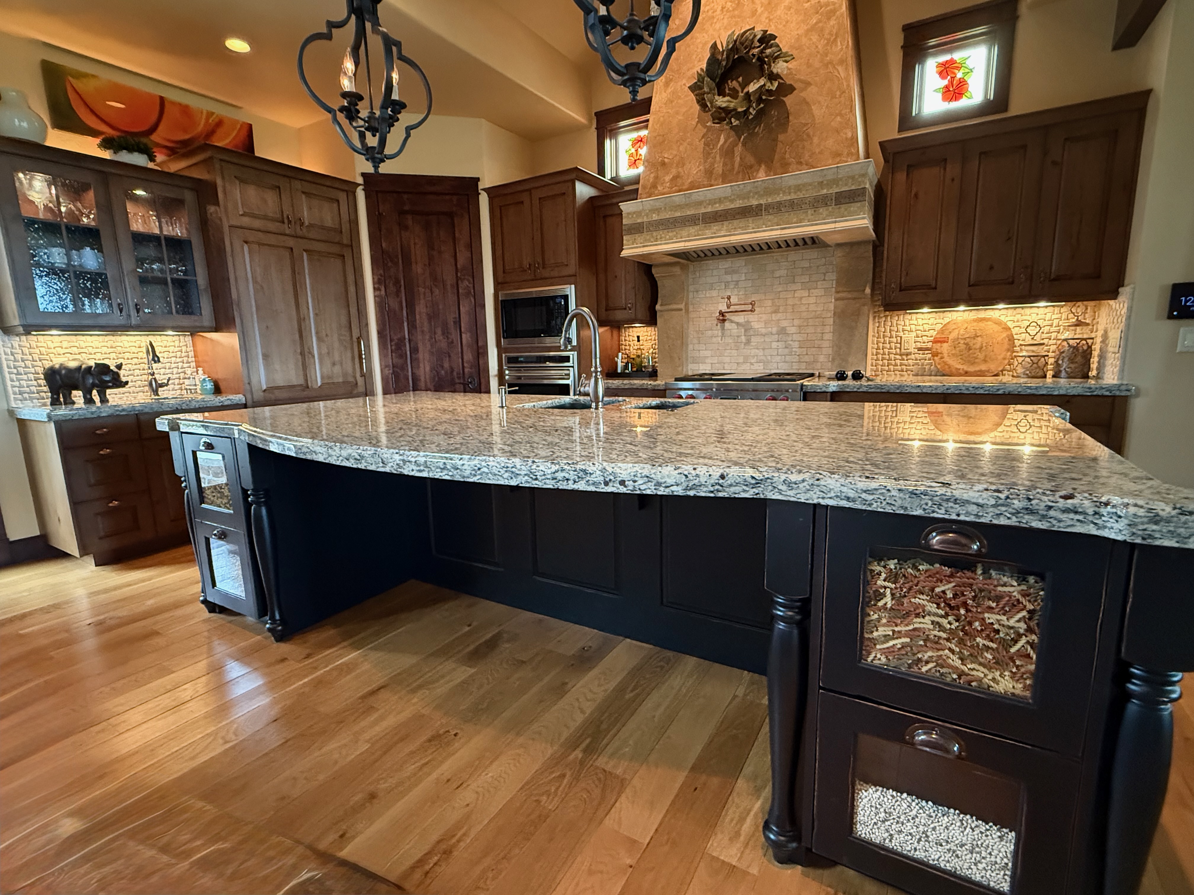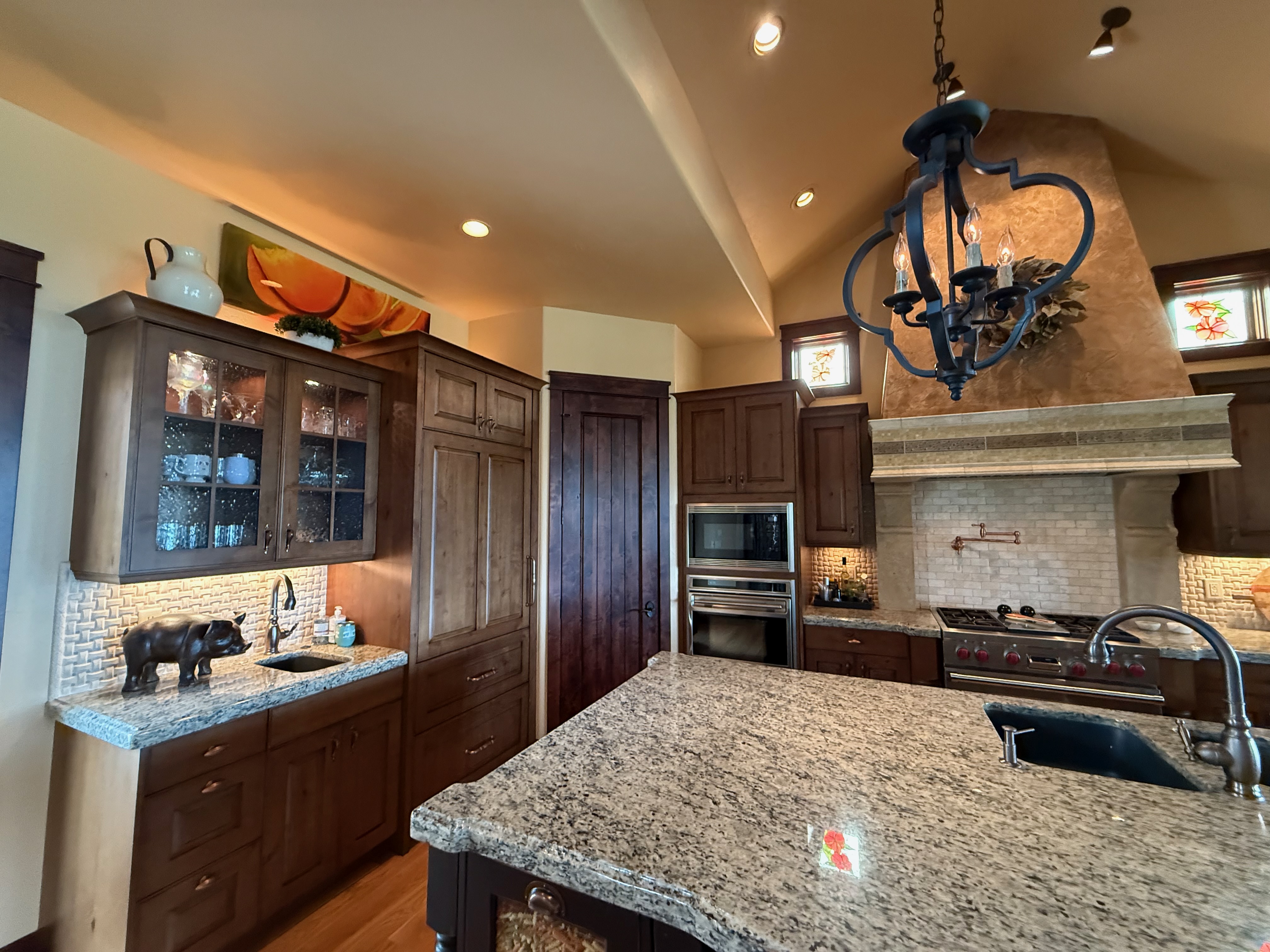 Nice! Rustic Colorado "Aspen Leaf" Knotty Alder Wood Kitchen and Wet Bar Cabinetry in a brushed Walnut finish. The perimeter cabinets are in a natural Knotty Alder Wood finish. The island and wet bar cabinets are in a matching Knotty Alder Wood in a black antique finish. All the drawer cabinets have the soft close feature. The kitchen package includes high-end Wolf and Sub-Zero appliances. The kitchen also has slab granite countertops included as well as two pendant lights. Cabinet drawings can be emailed. Pricing for the kitchen and wet bar below.