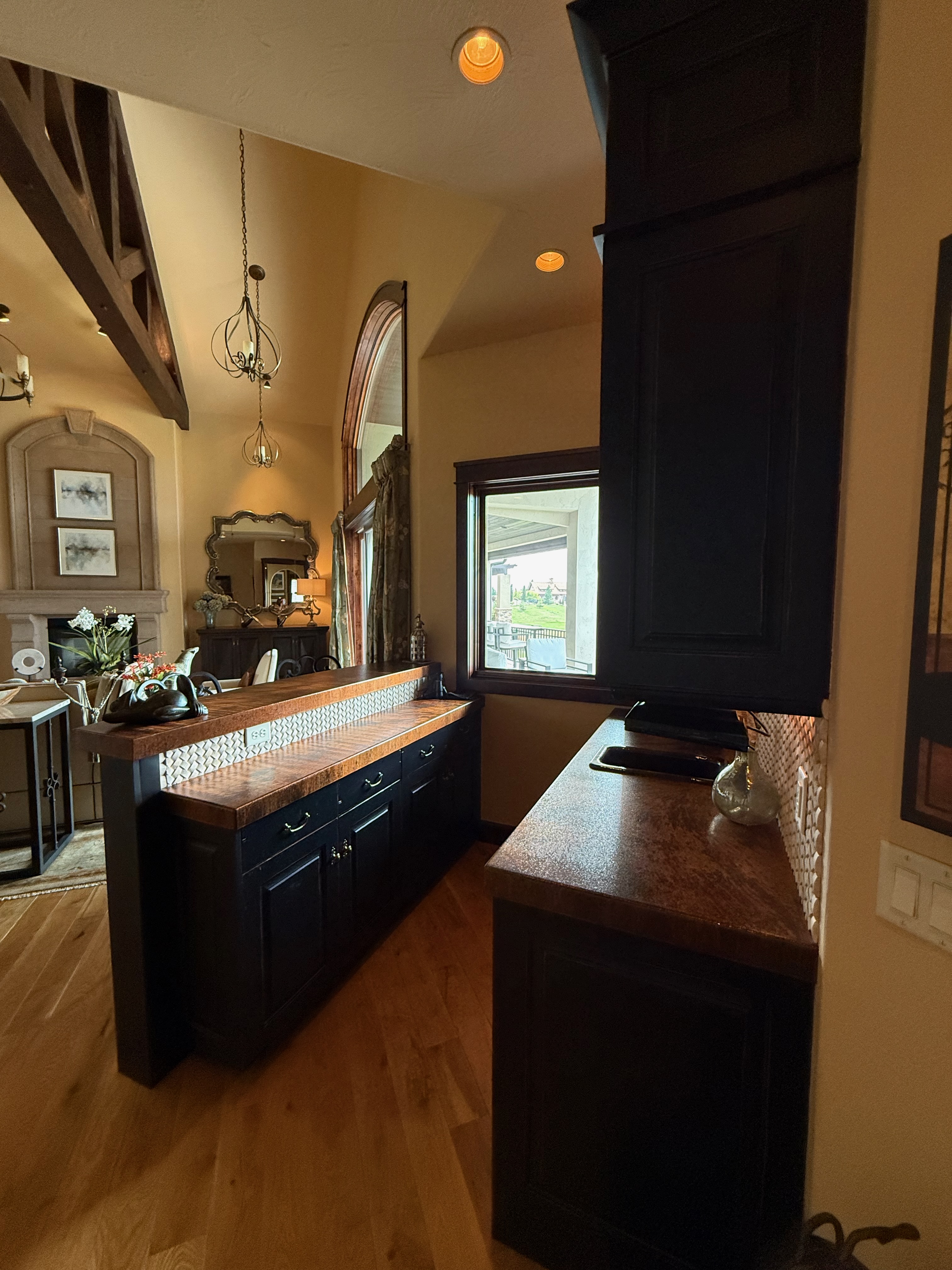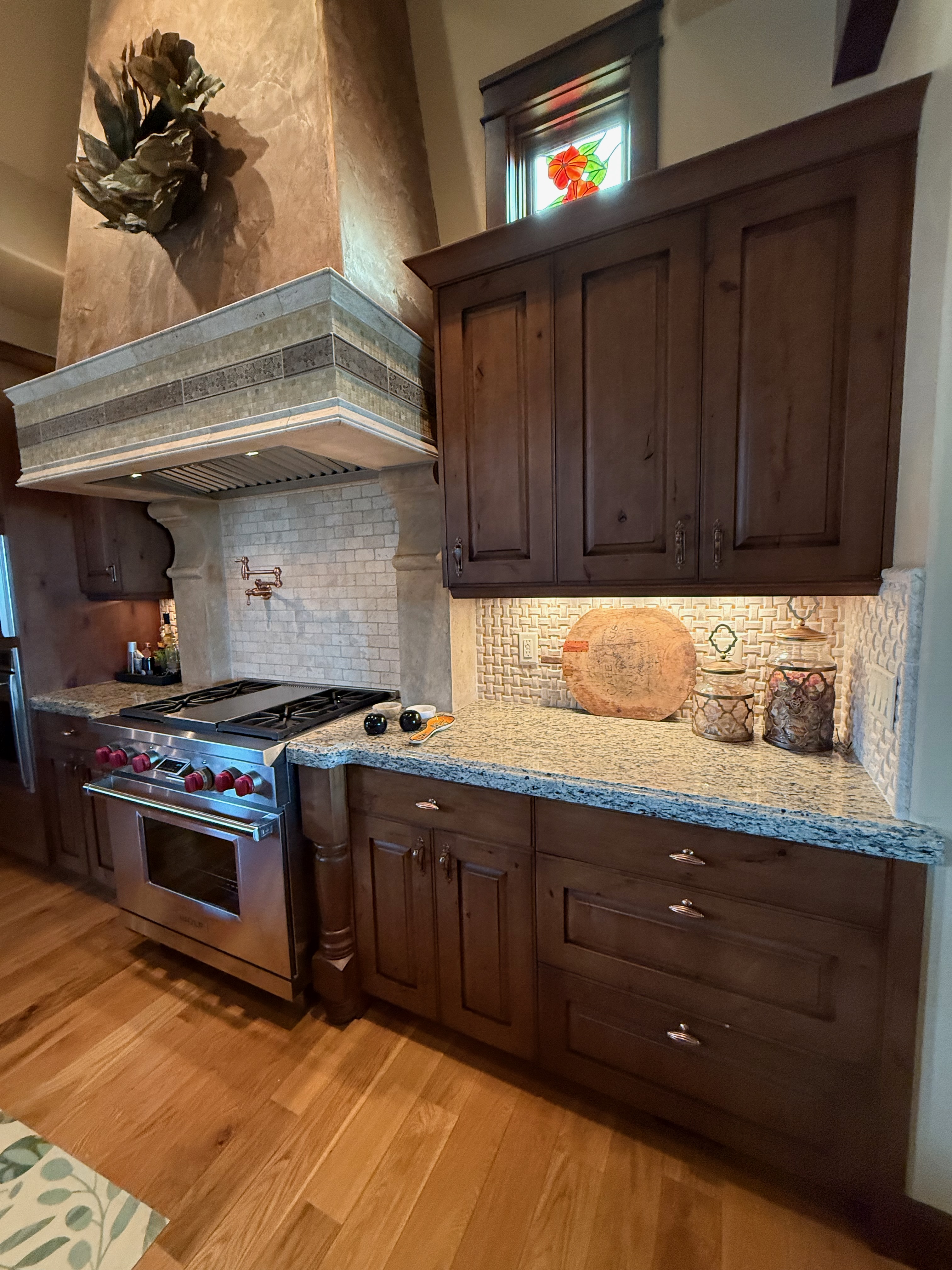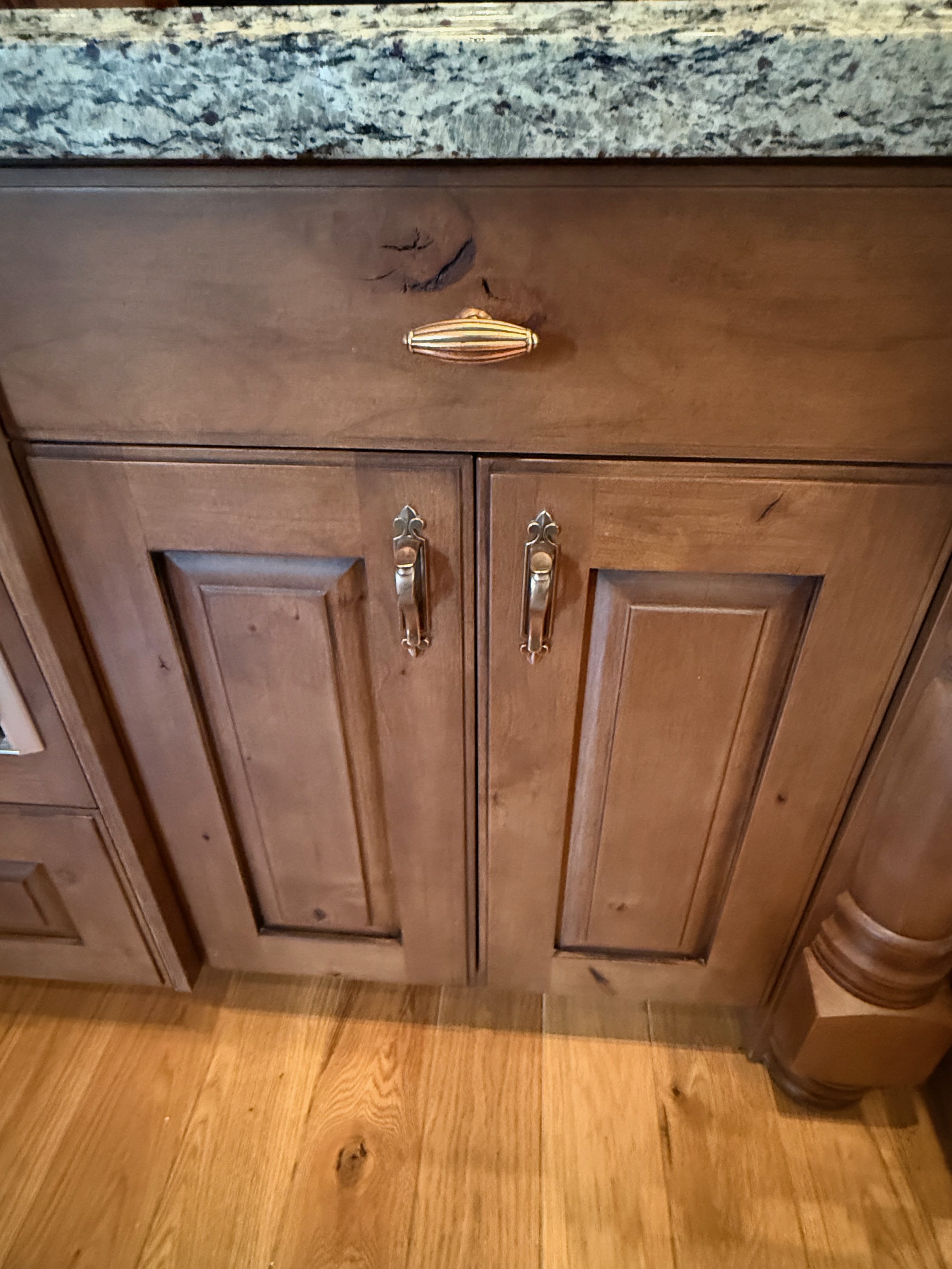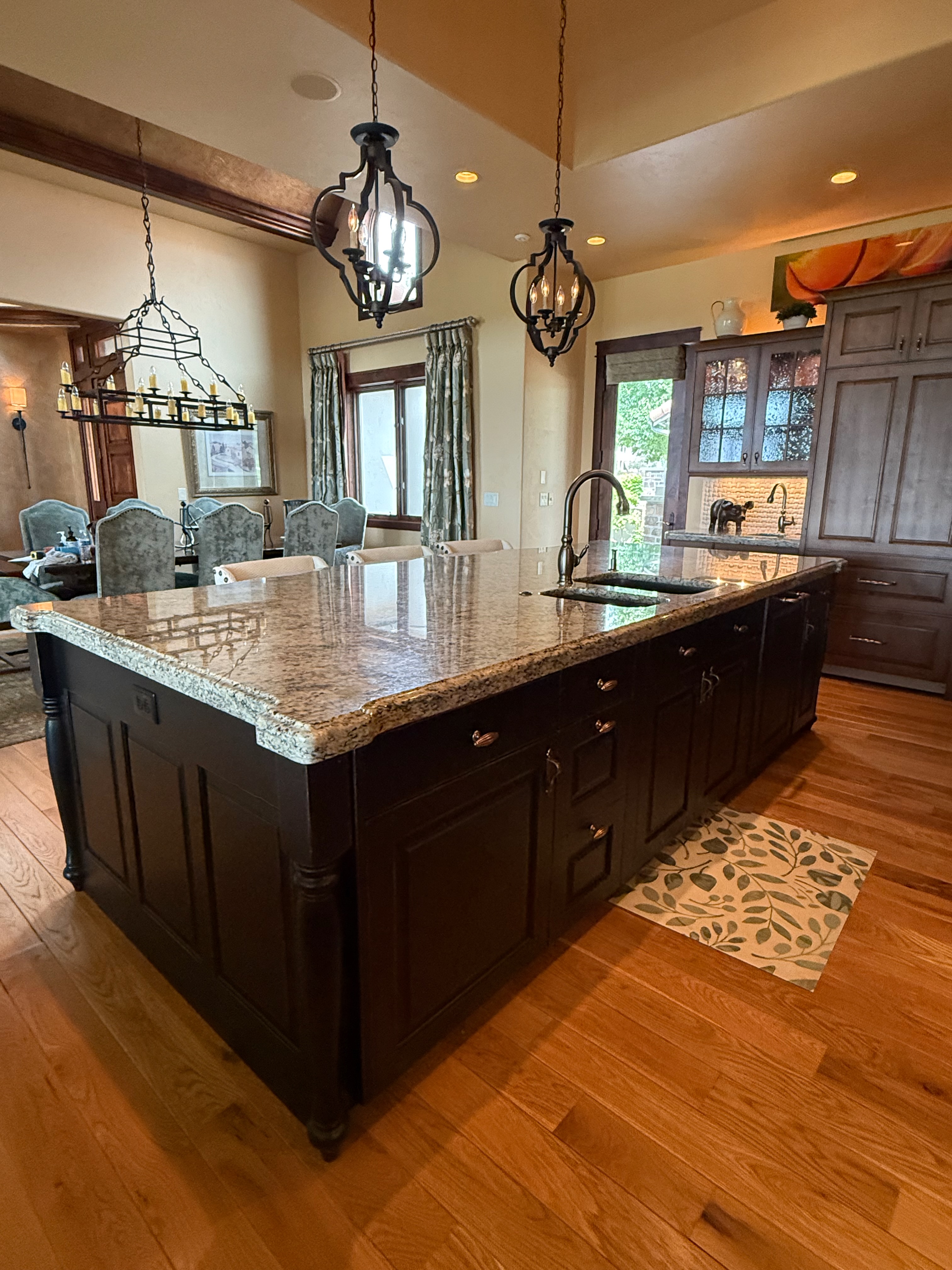 Nice! Rustic Colorado "Aspen Leaf" Knotty Alder Wood Kitchen and Wet Bar Cabinetry in a brushed Walnut finish. The perimeter cabinets are in a natural Knotty Alder Wood finish. The island and wet bar cabinets are in a matching Knotty Alder Wood in a black antique finish. All the drawer cabinets have the soft close feature. The kitchen package includes high-end Wolf and Sub-Zero appliances. The kitchen also has slab granite countertops included as well as two pendant lights. Cabinet drawings can be emailed. Pricing for the kitchen and wet bar below.