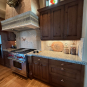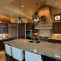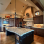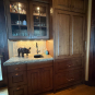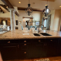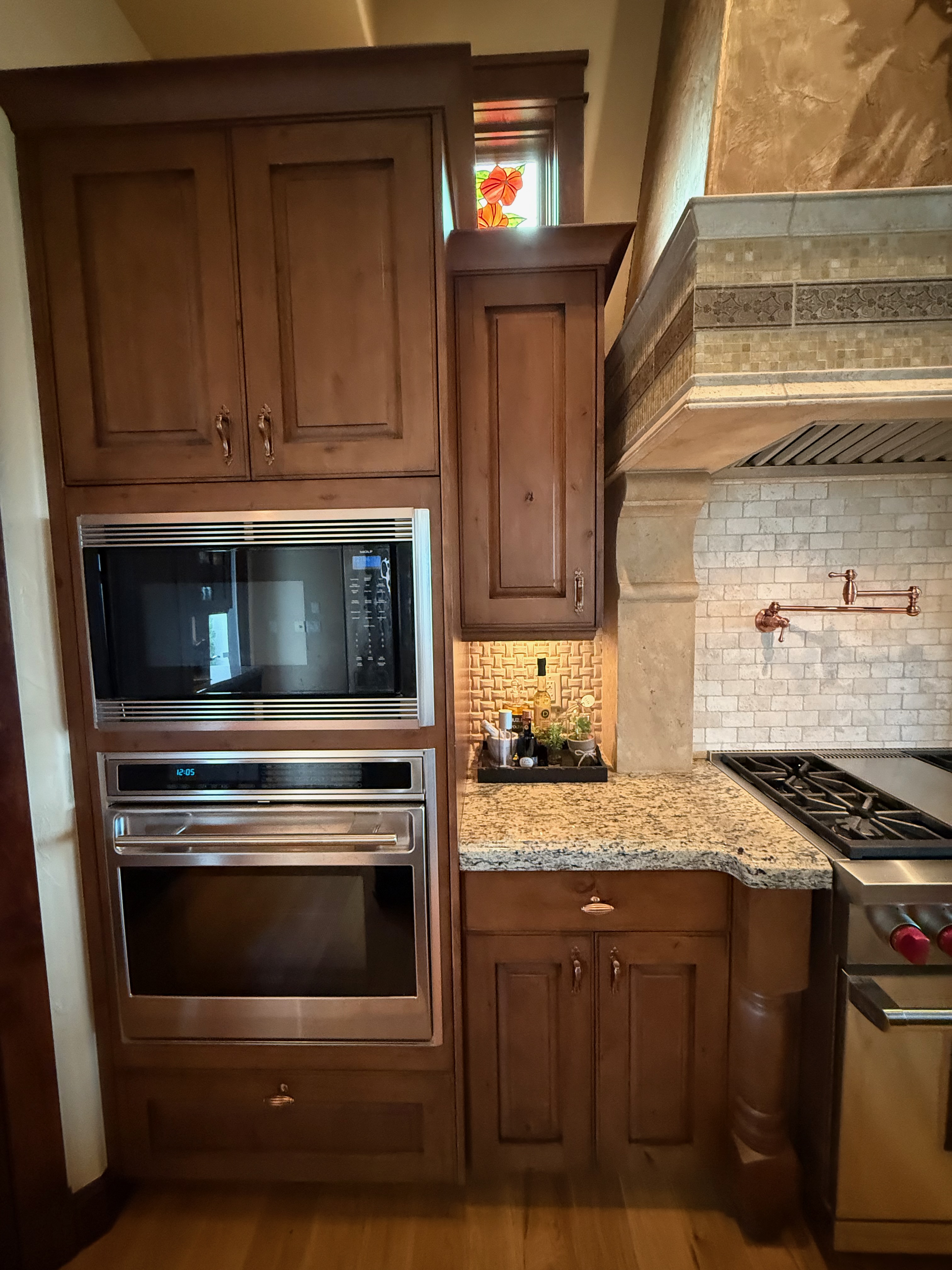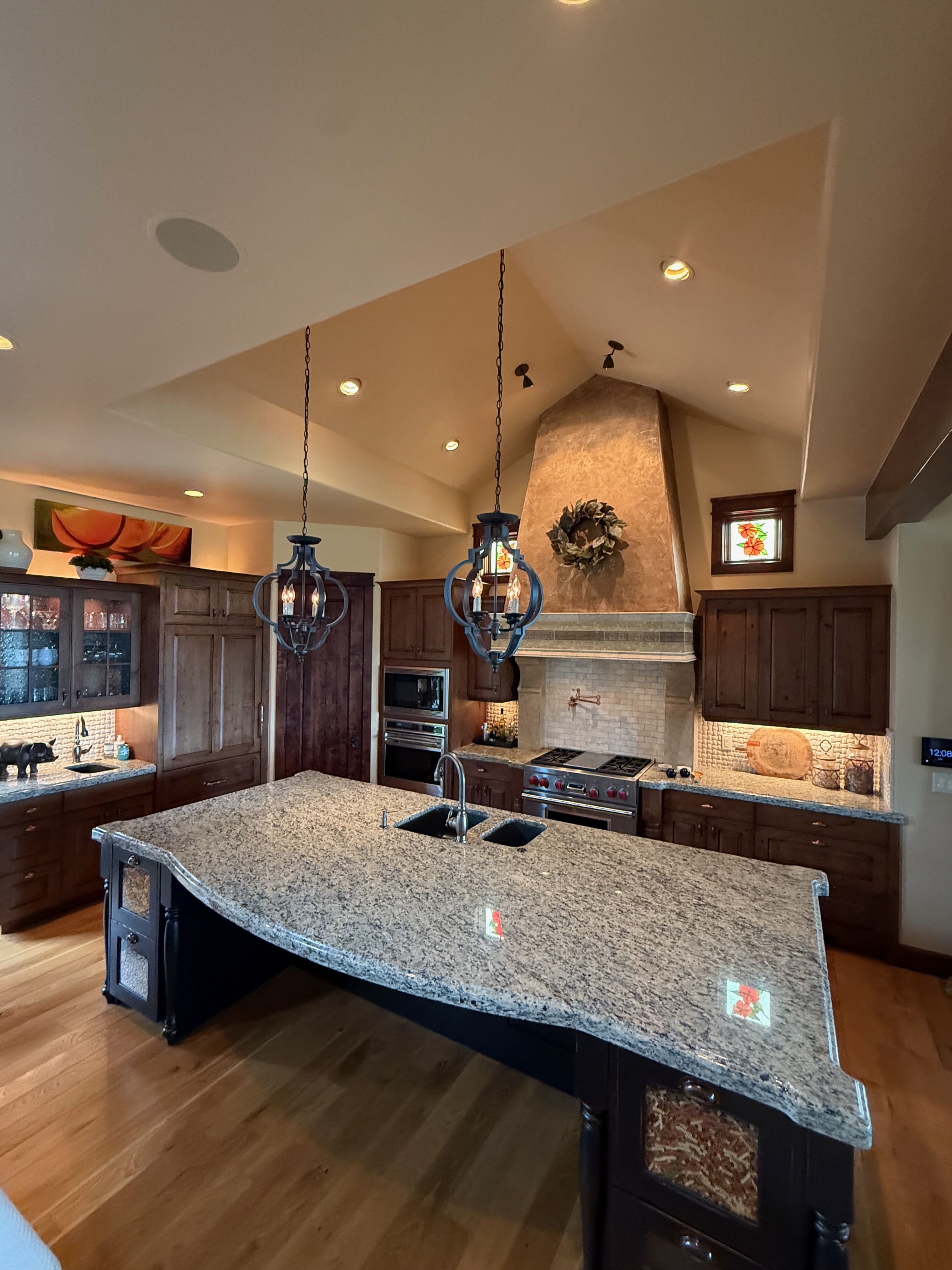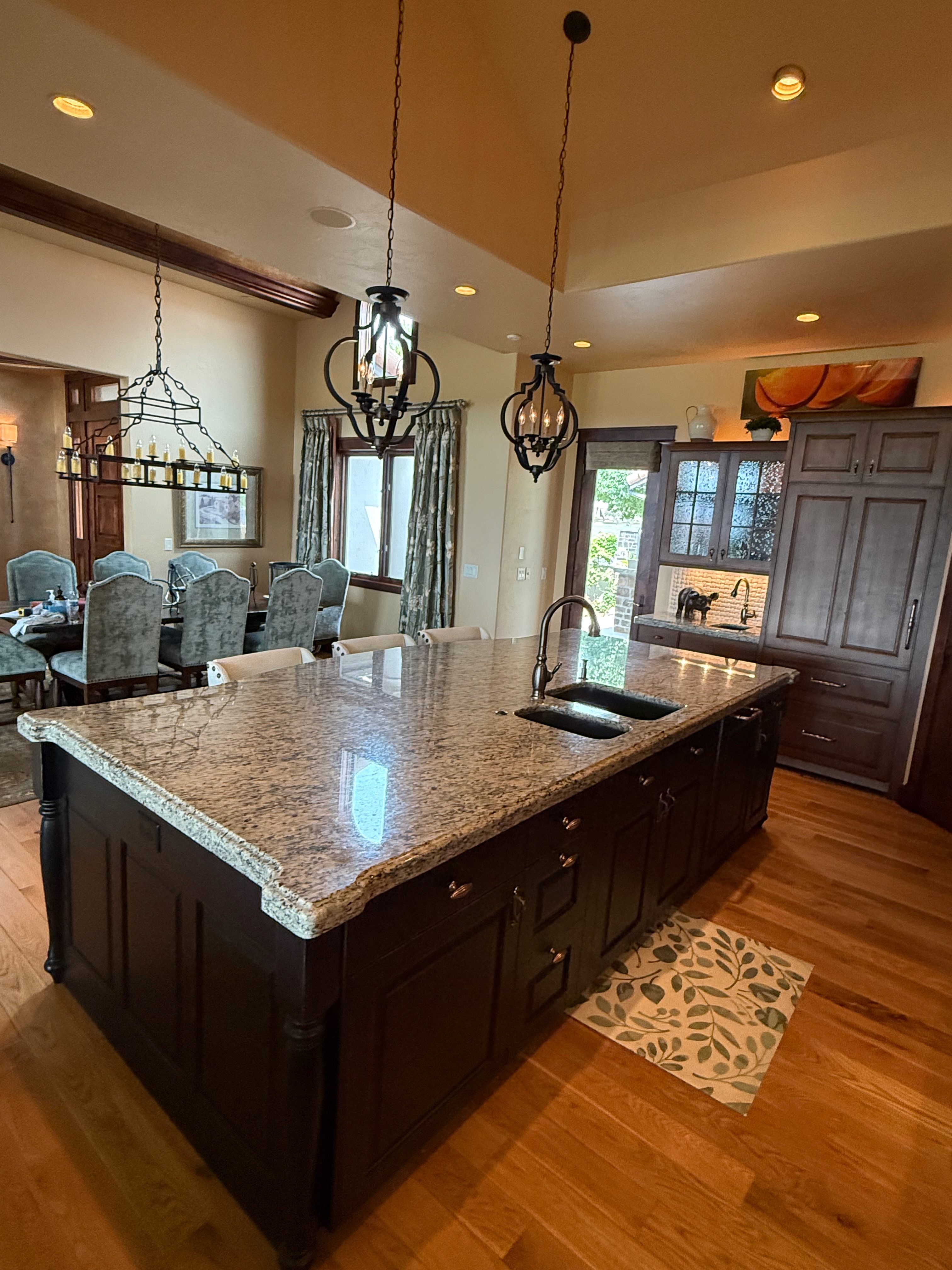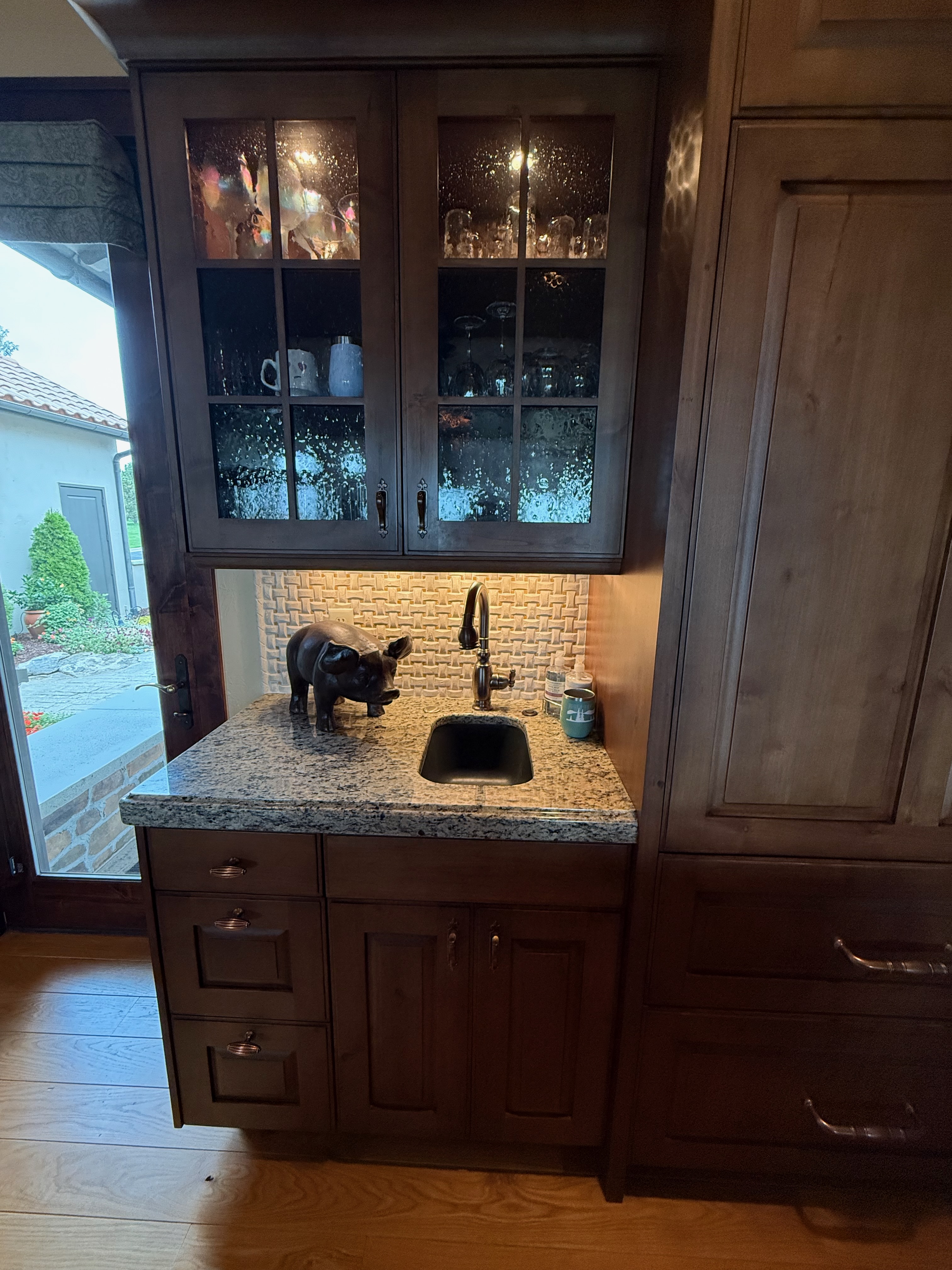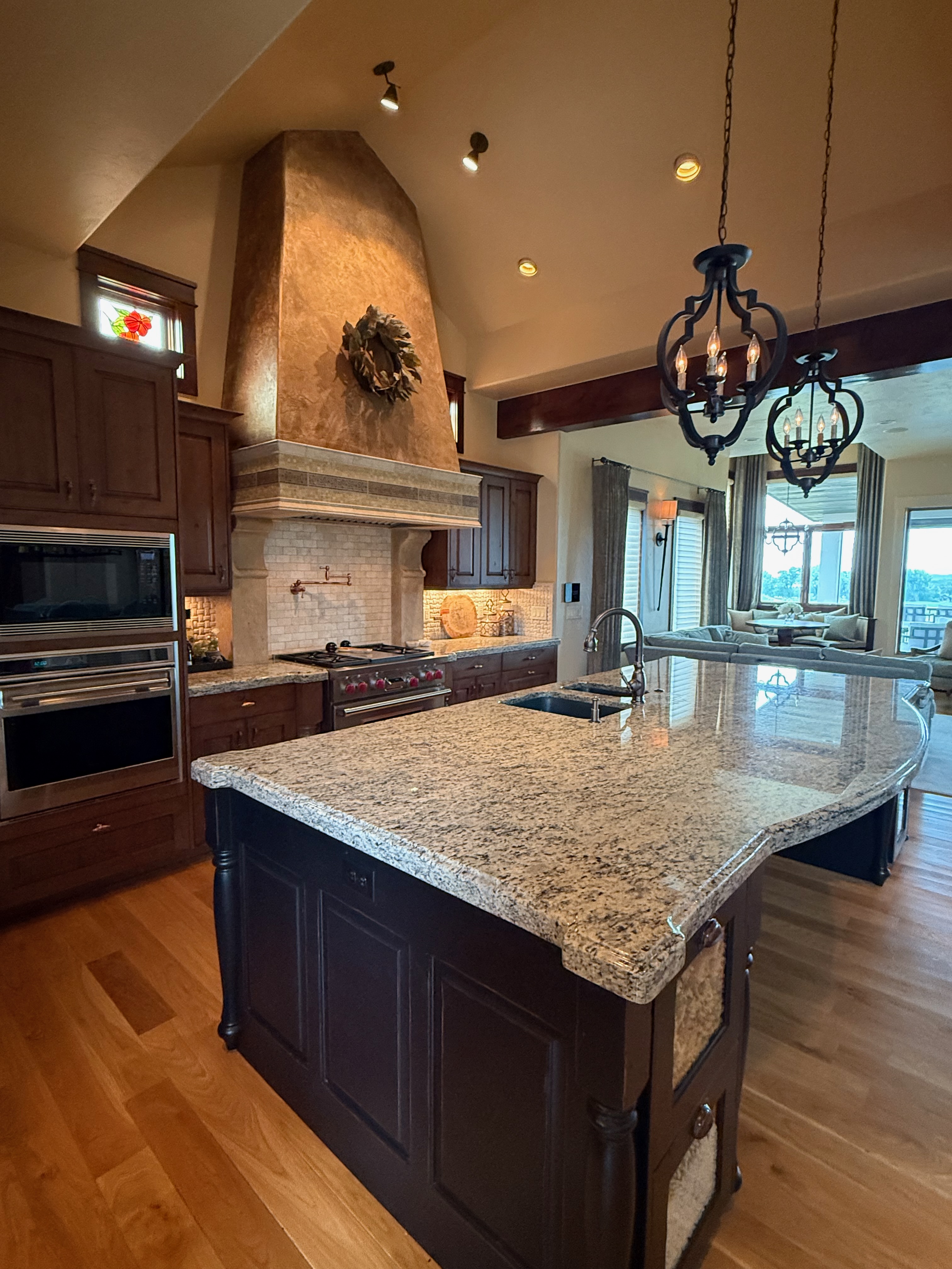 Nice! Rustic Colorado "Aspen Leaf" Knotty Alder Wood Kitchen and Wet Bar Cabinetry in a brushed Walnut finish. The perimeter cabinets are in a natural Knotty Alder Wood finish. The island and wet bar cabinets are in a matching Knotty Alder Wood in a black antique finish. All the drawer cabinets have the soft close feature. The kitchen package includes high-end Wolf and Sub-Zero appliances. The kitchen also has slab granite countertops included as well as two pendant lights. Cabinet drawings can be emailed. Pricing for the kitchen and wet bar below.