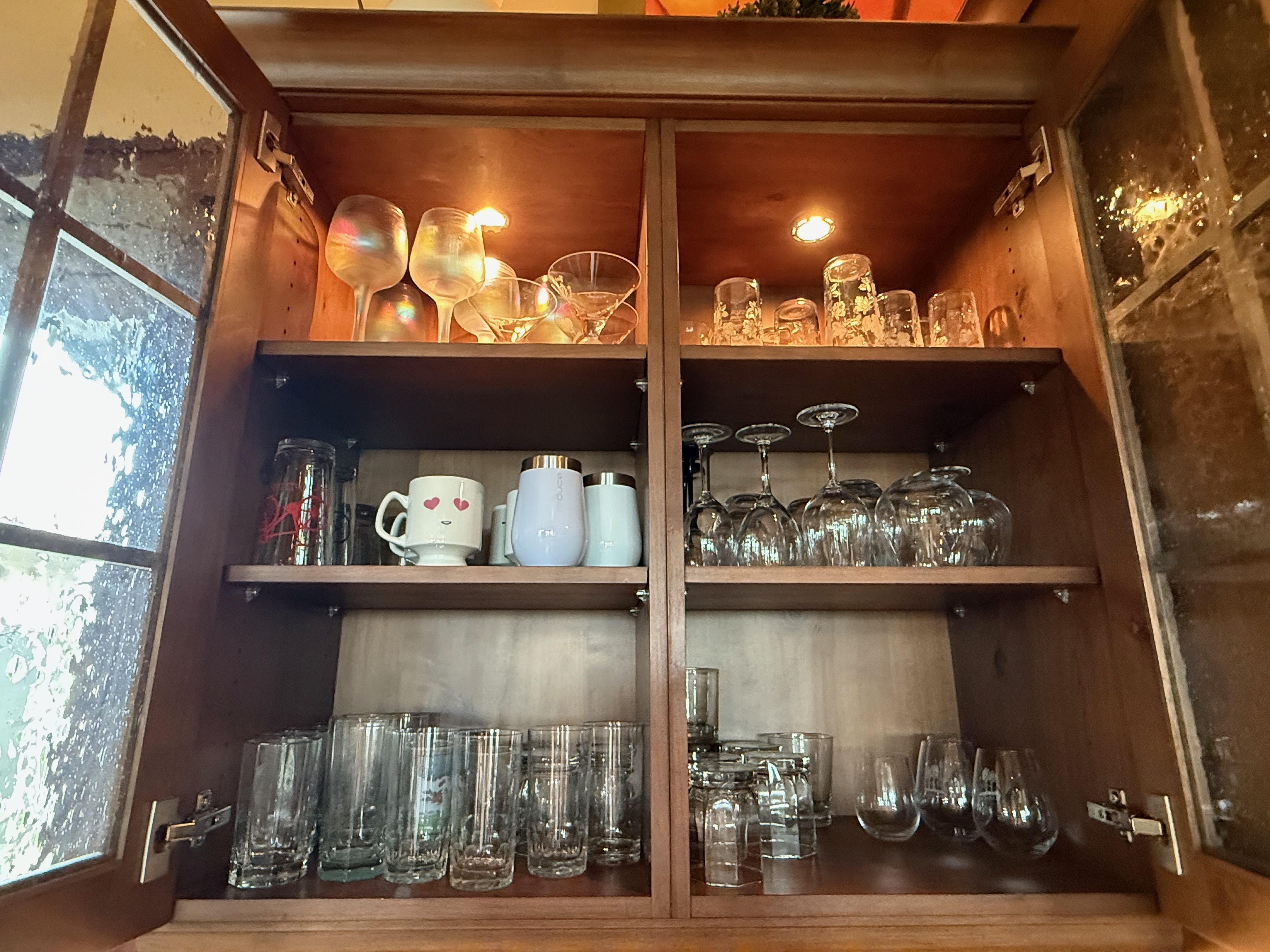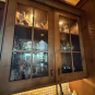2-One top glass front door with a solid door below, puck lights inside Dim.: 18”w/20 ¼”w x 34 ¼”h bottom cabinet only/47”h both cabinets/48”h w/bottom trim overall 51”h x 15 ½”d