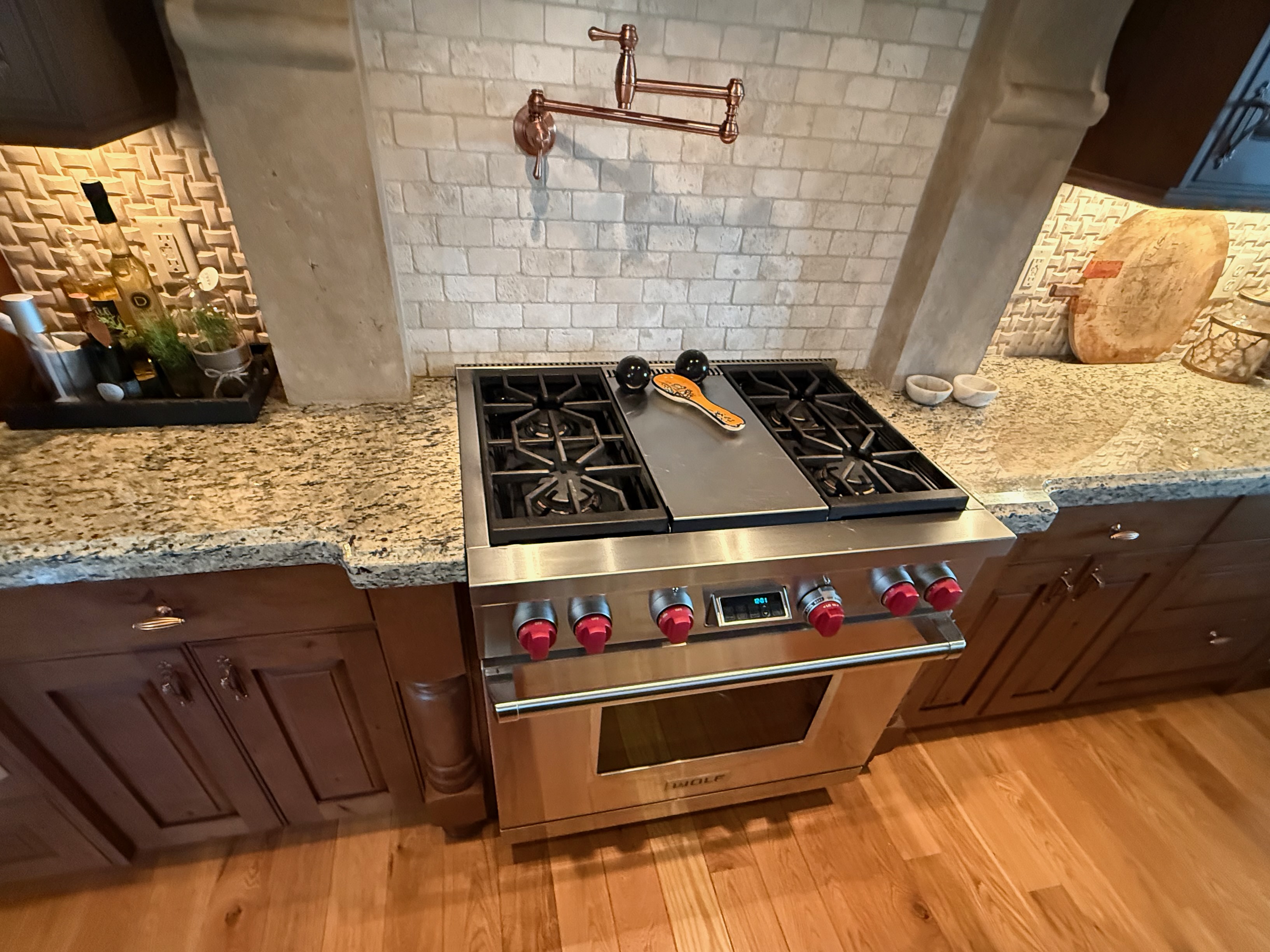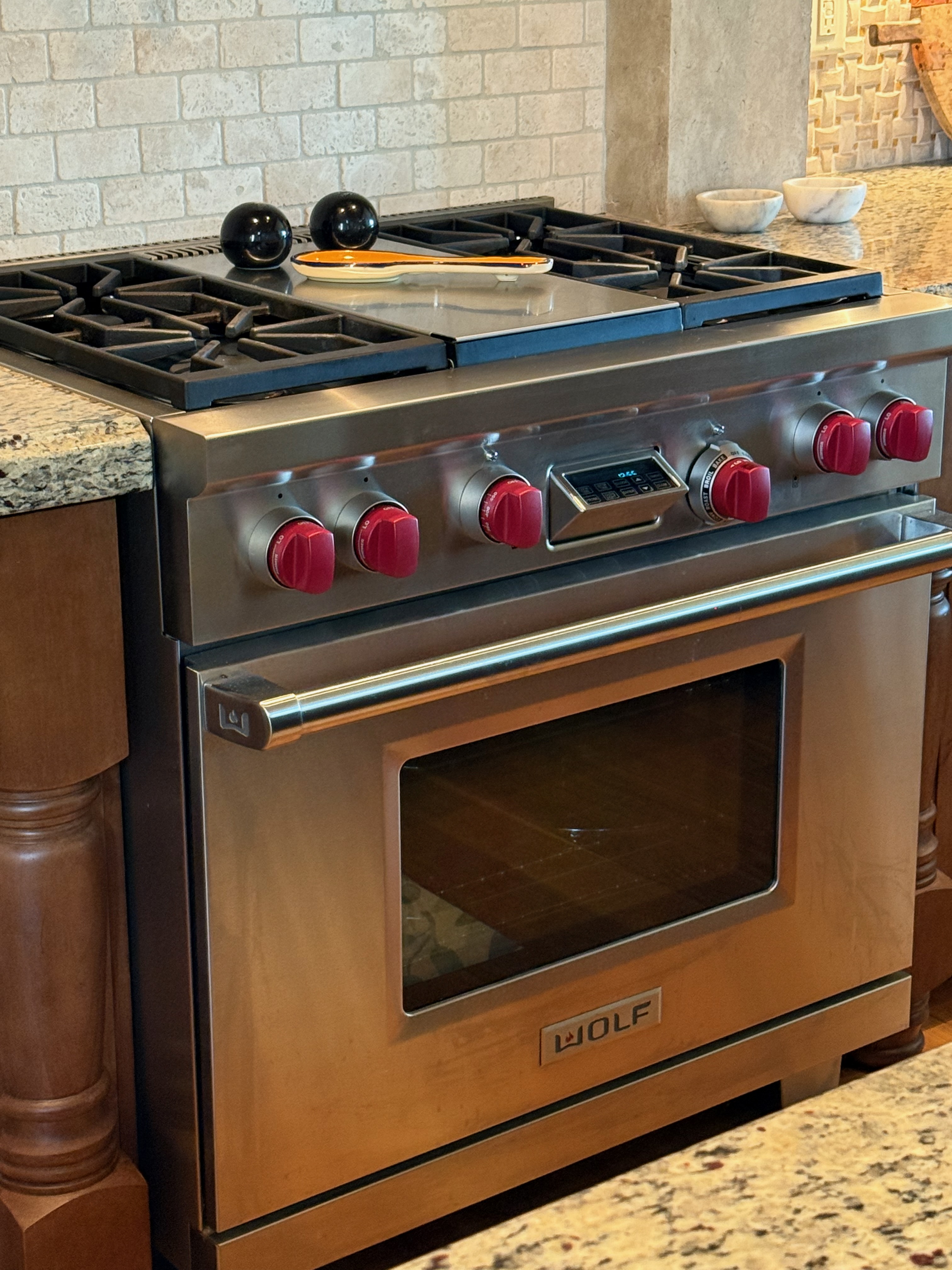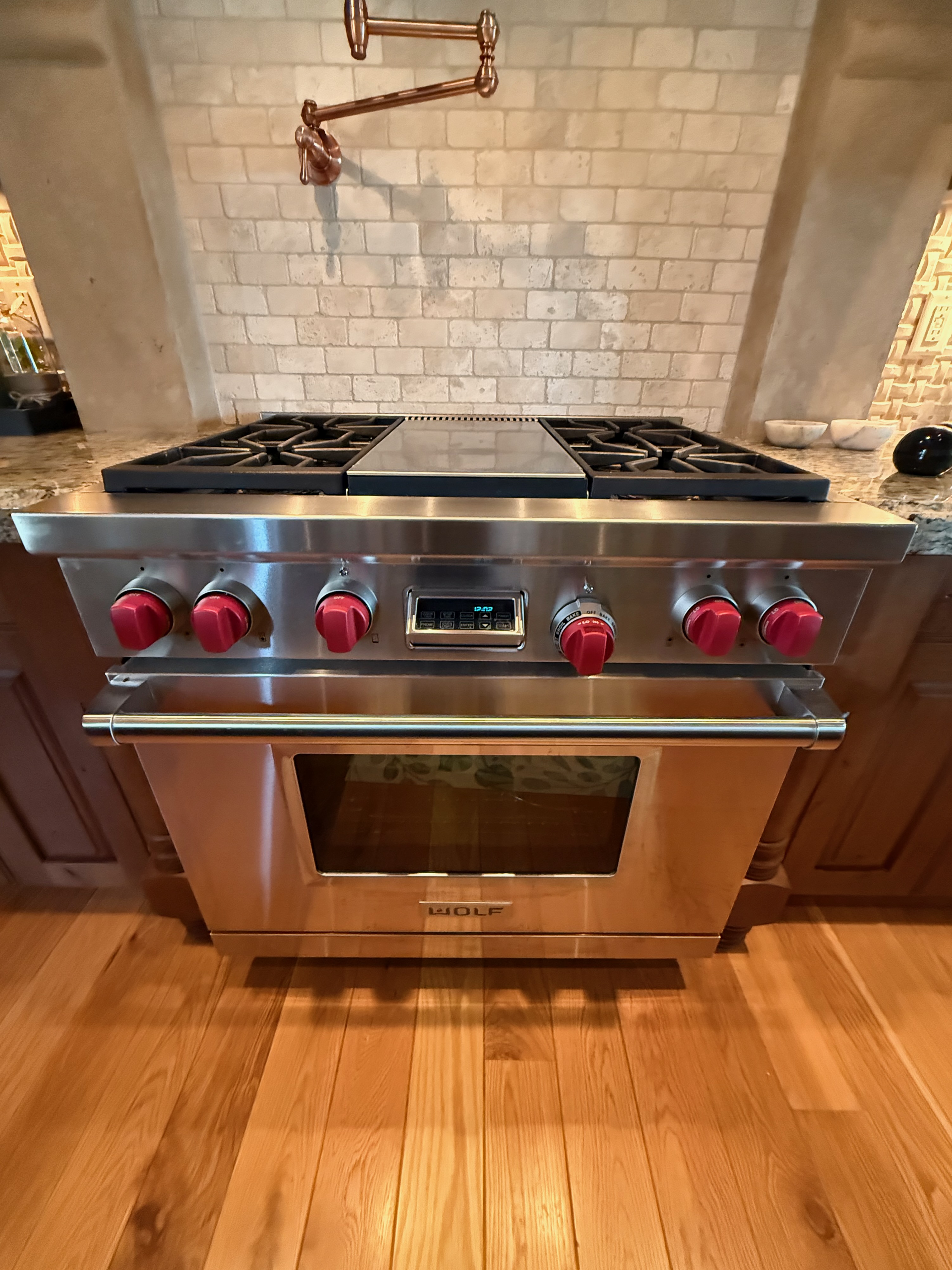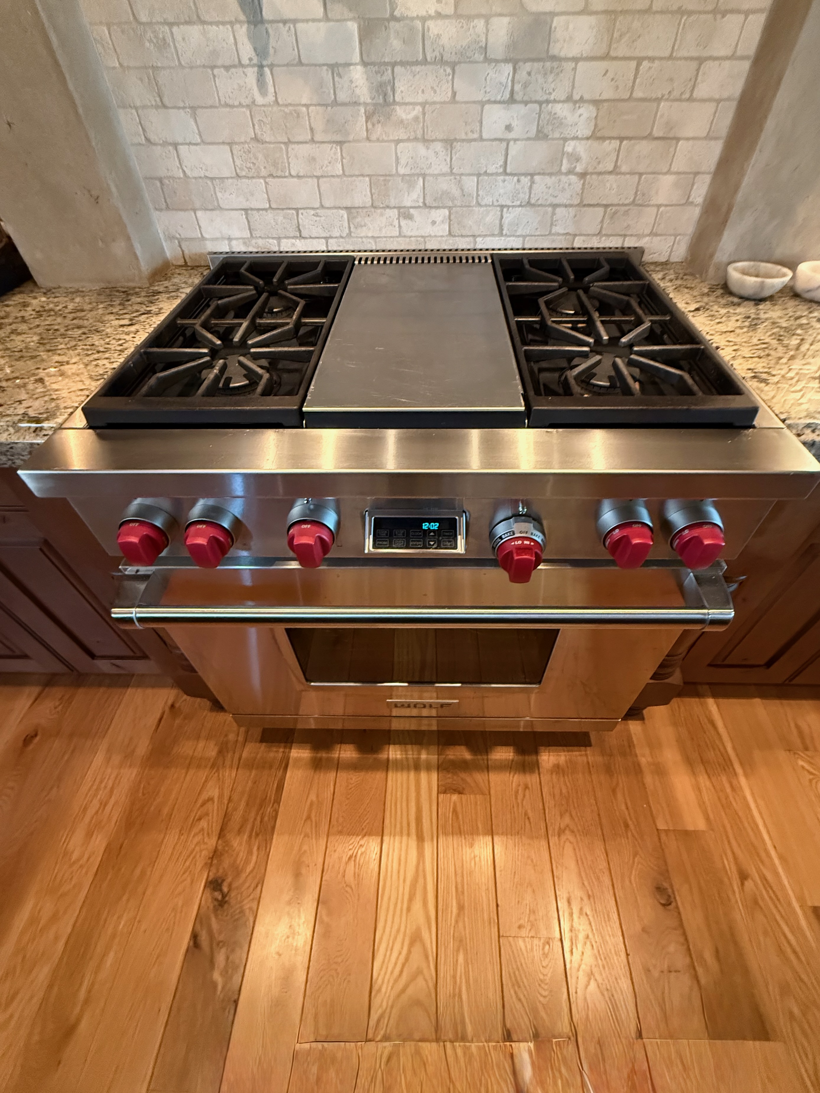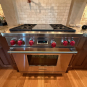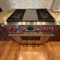 36” Wolf Range, Dual Fuel Range - 4 Burners and Infrared Griddle, Model #DF364G, Serial #017074682, Listing price new $11,075