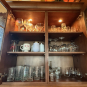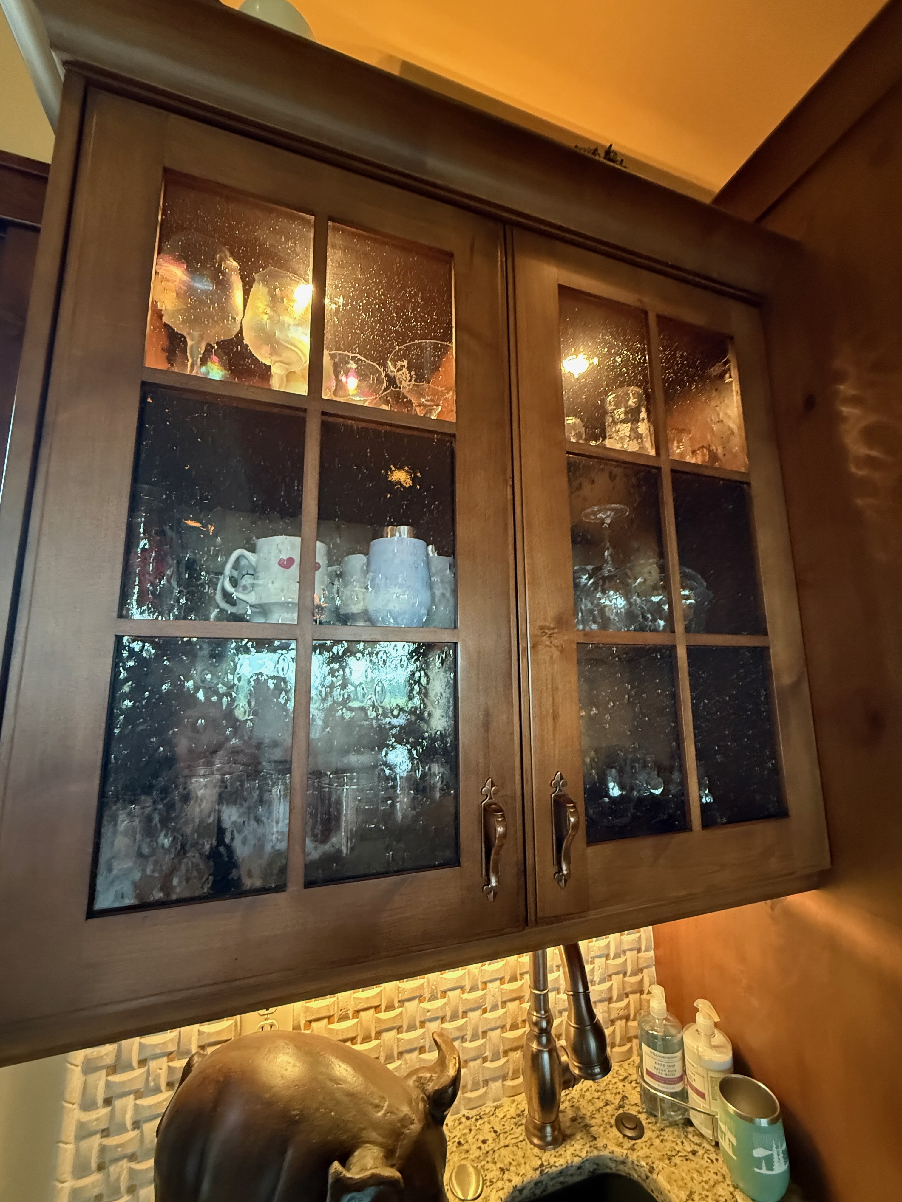 1-Two door upper cabinet with glass fronts Dim.: 38” w/38 1/2”w with finish panel left x 35”h cabinet only/36” w/bottom trim/39”h w/ crown x 16” d