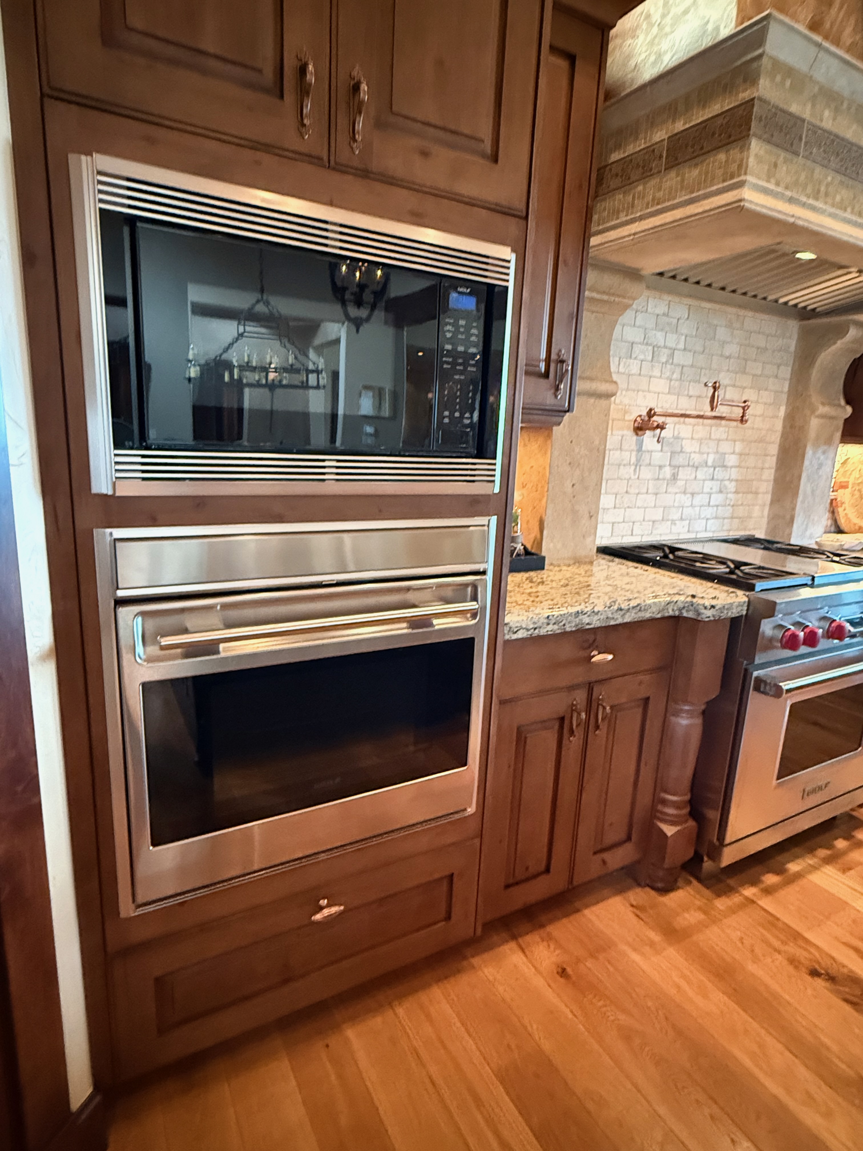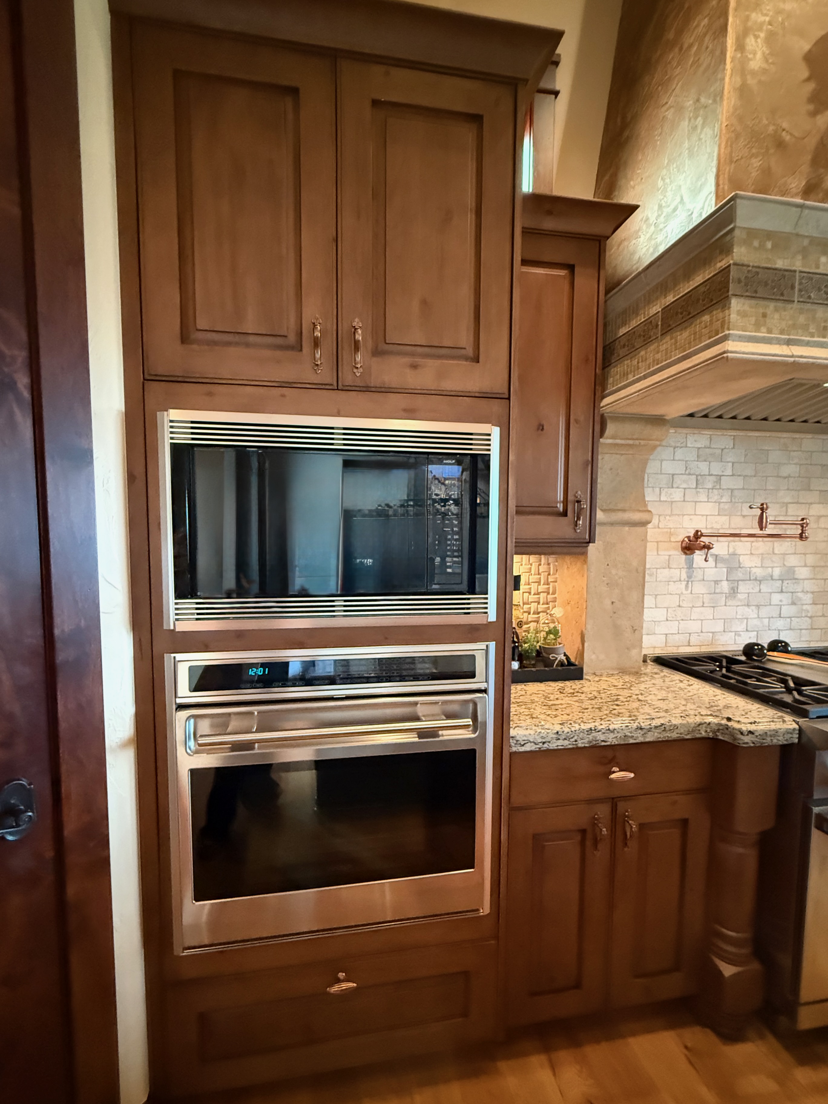 1-Two door double tall cabinet that holds the Microwave, Oven and warming drawer Dim.: 32” w/34”w x 96”h cabinet only/98 ¾” with crown x 24” d