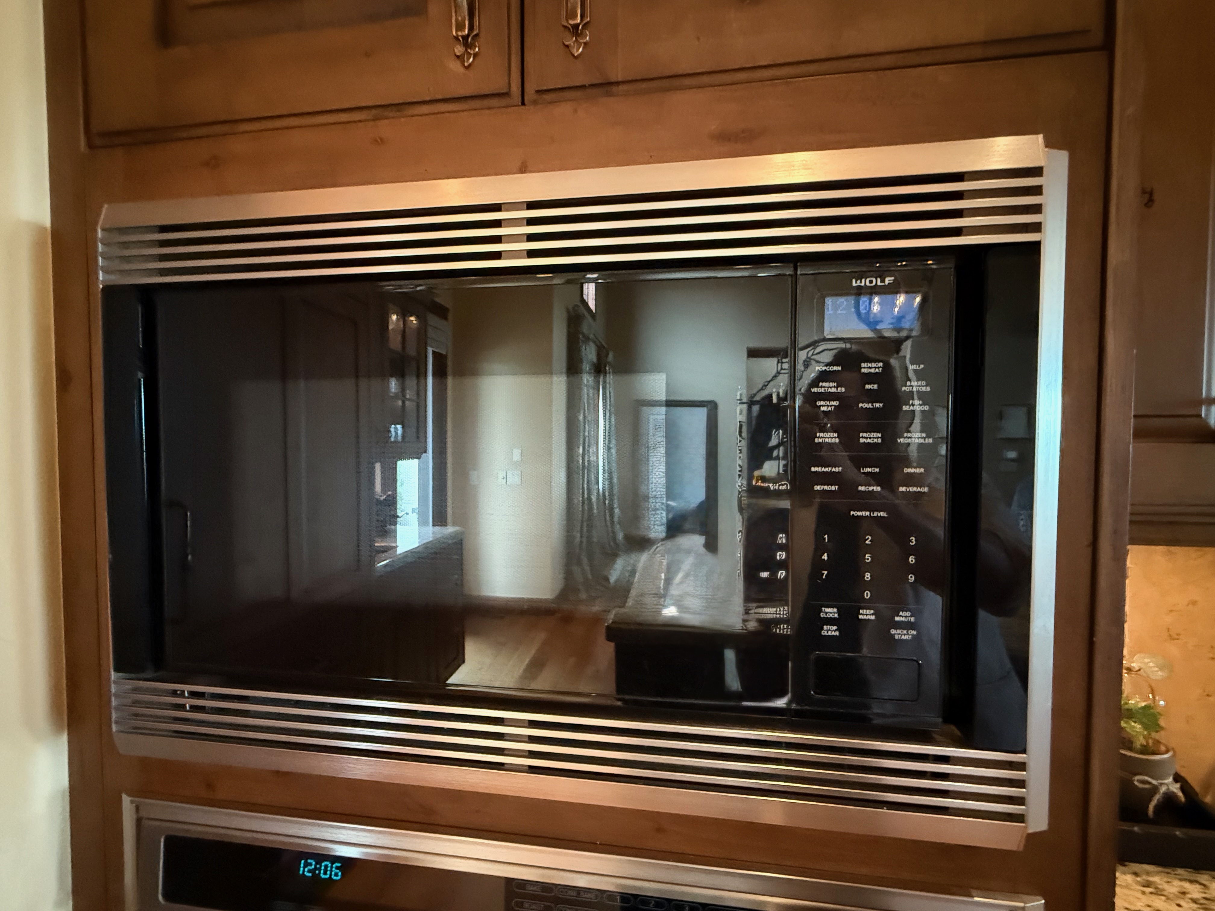 30’ Wolf microwave 2.0 cu. ft. Countertop Microwave Oven with 1200 Cooking Watts, 11 Power Levels, Sensor Cooking, Warming Feature and Interactive Display Model #MW24, Serial #12044607 05/08, Listing price new $1,540