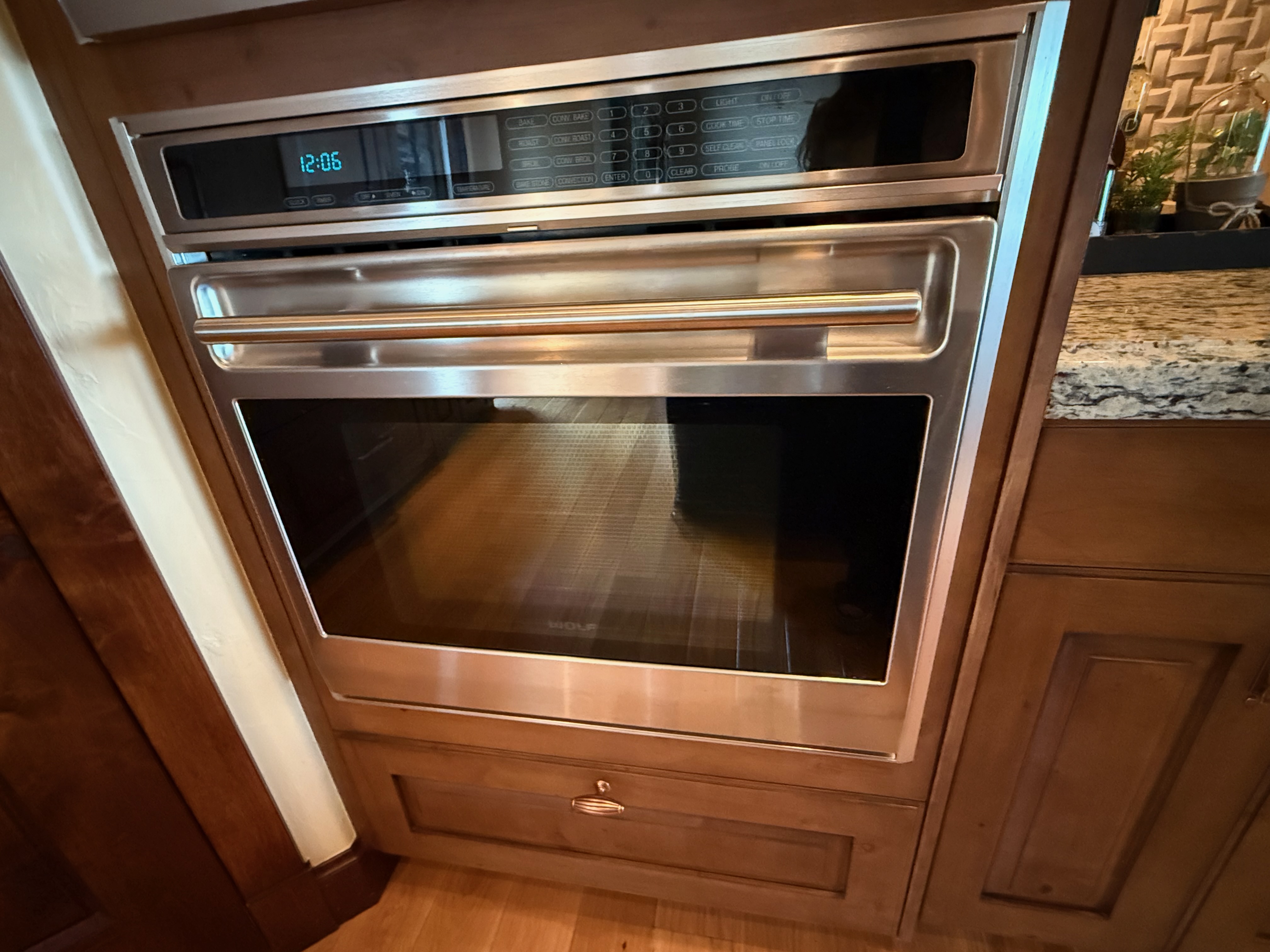 30” Wolf single wall oven 30 Inch Single Electric Wall Oven with 4.5 cu. ft. Dual Convection Oven, Self-Clean, 10 Cooking Modes, Sabbath Mode, Cobalt Blue Interior and Rotating Glass Touch Control Model #SO30F/S Serial #17104557, Listing price new $5,530