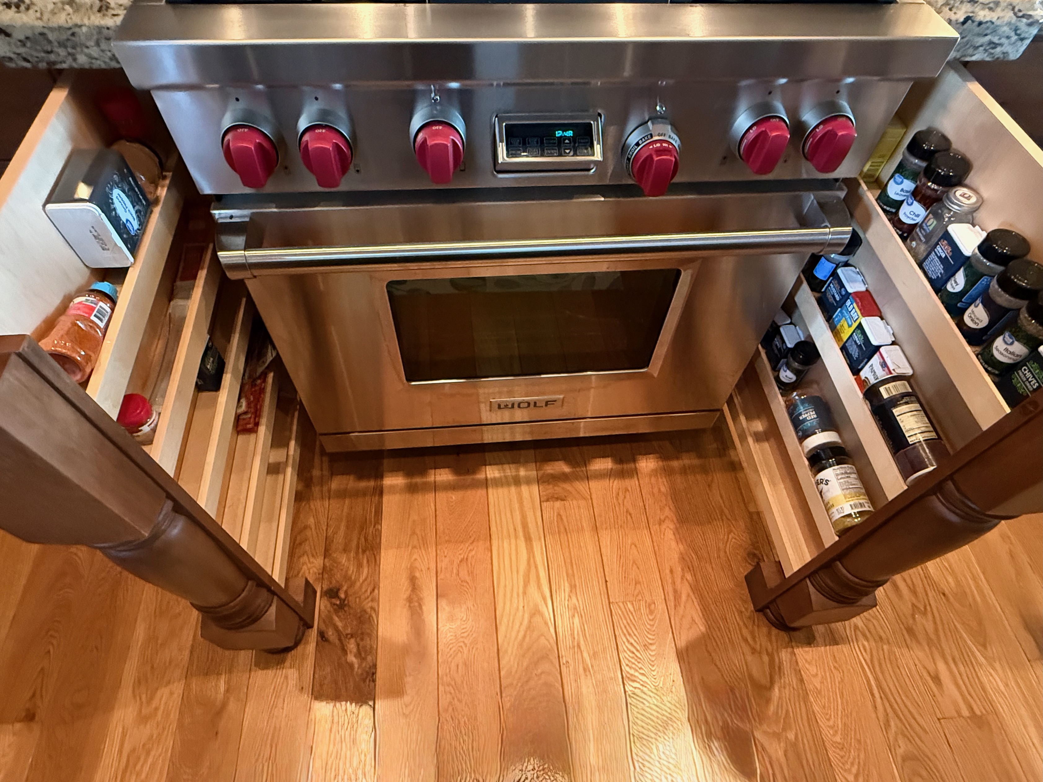 2-Pull-out door spice pull-outs on each side of the range Dim.: 5” w x 34 ½”h/37”h x 24” d