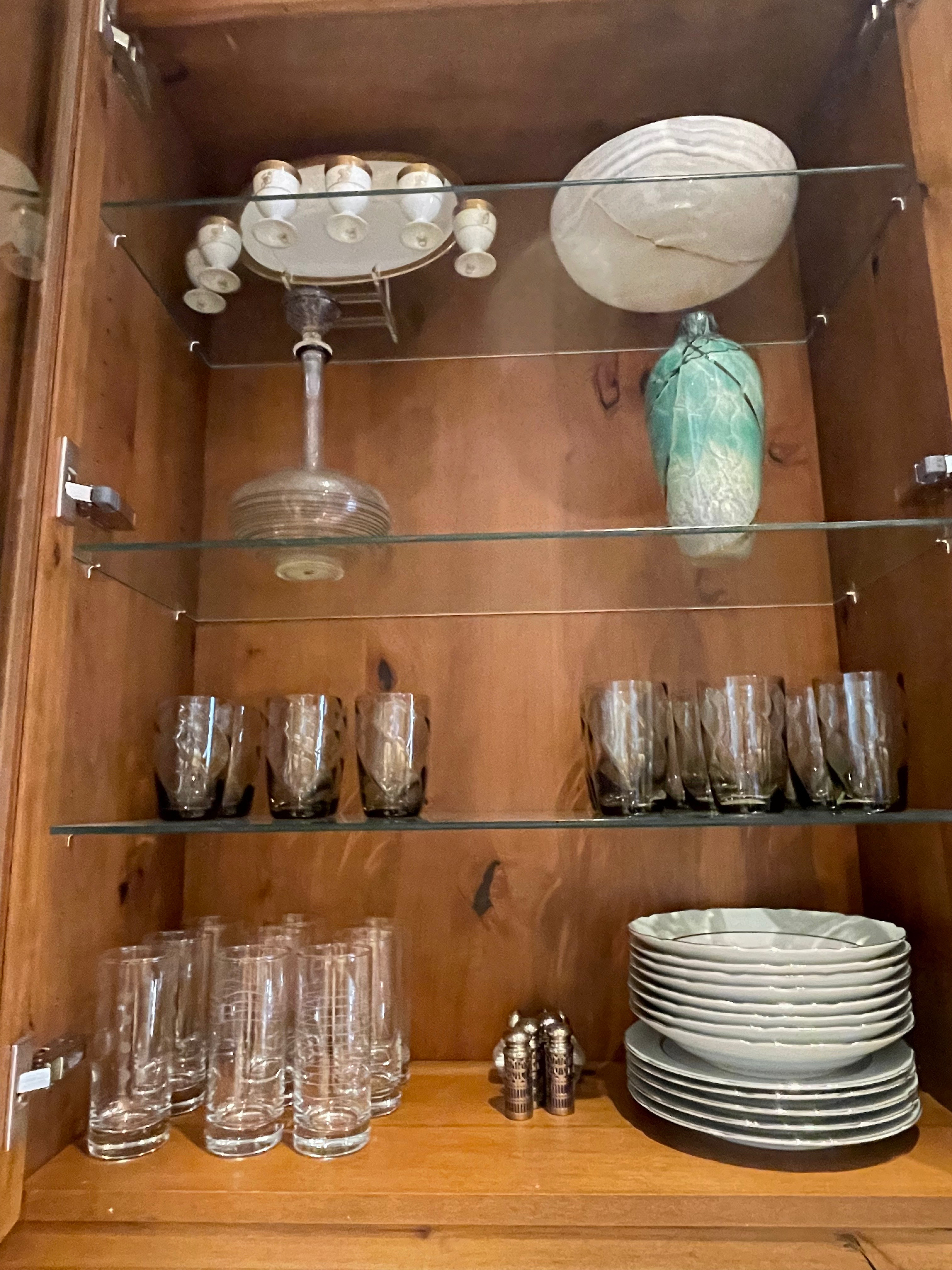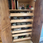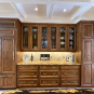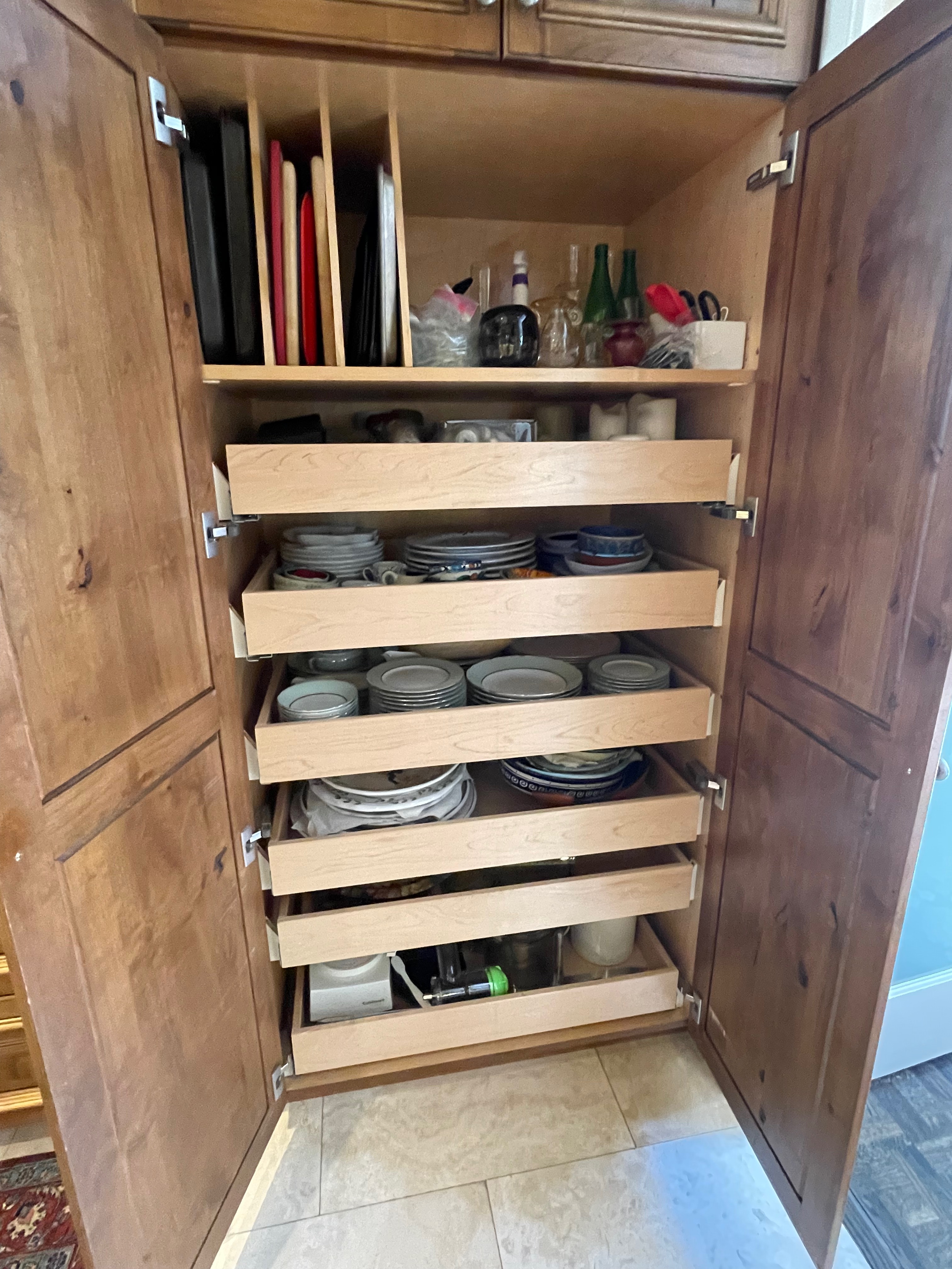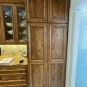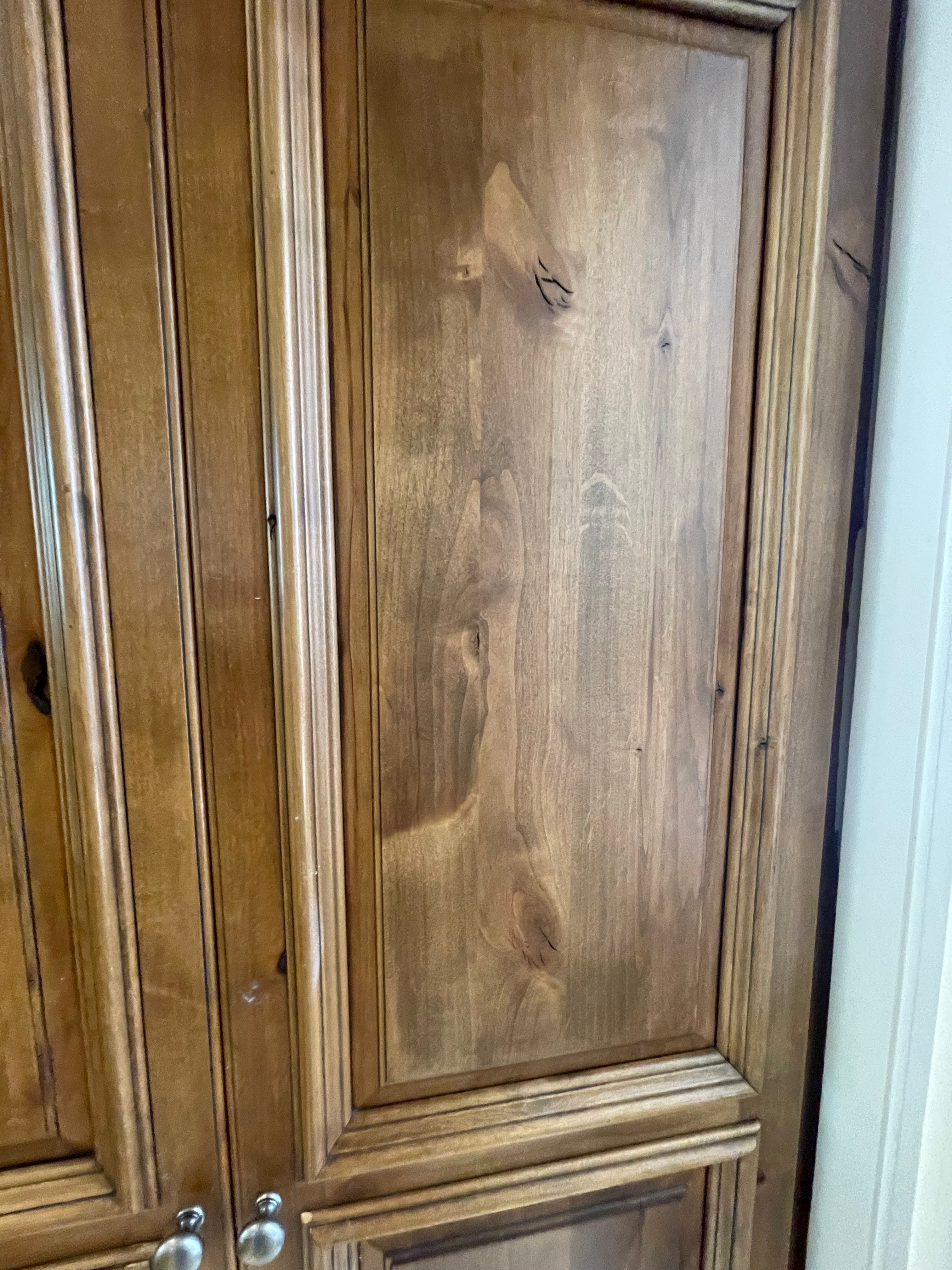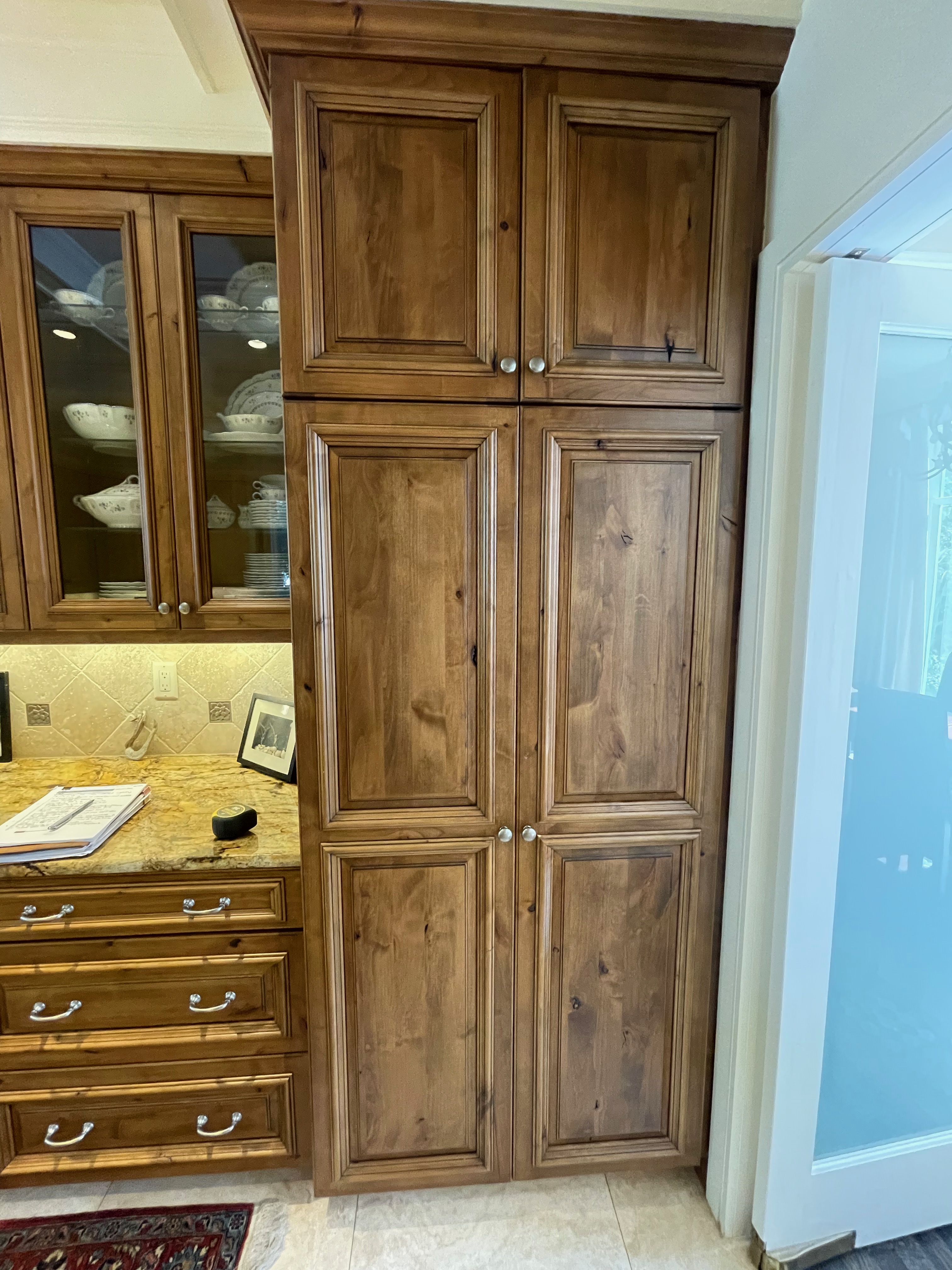 1-Four door double tall wall cabinet in Alder wood w/ 6 pull-out wood drawers inside Dim.: 36“ w x 95“ h cabinet only/97 1/4”h w/ crown x 24”d