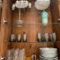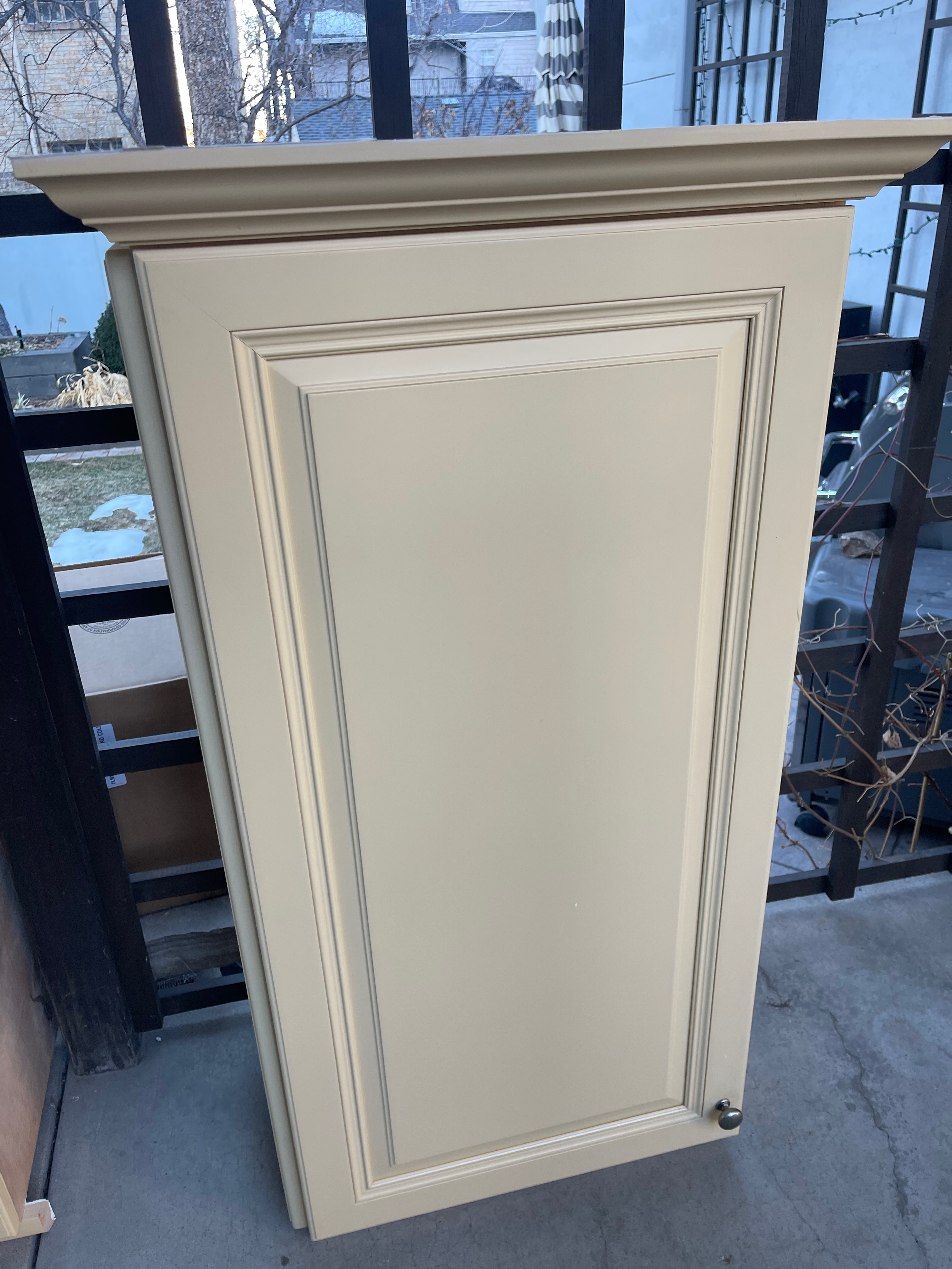 1-One door wall cabinet in cream Dim.: 21“w/21 ½” w finished panel x 42”h/44”h w/crown/45 ½”h w/base trim x 12” d