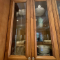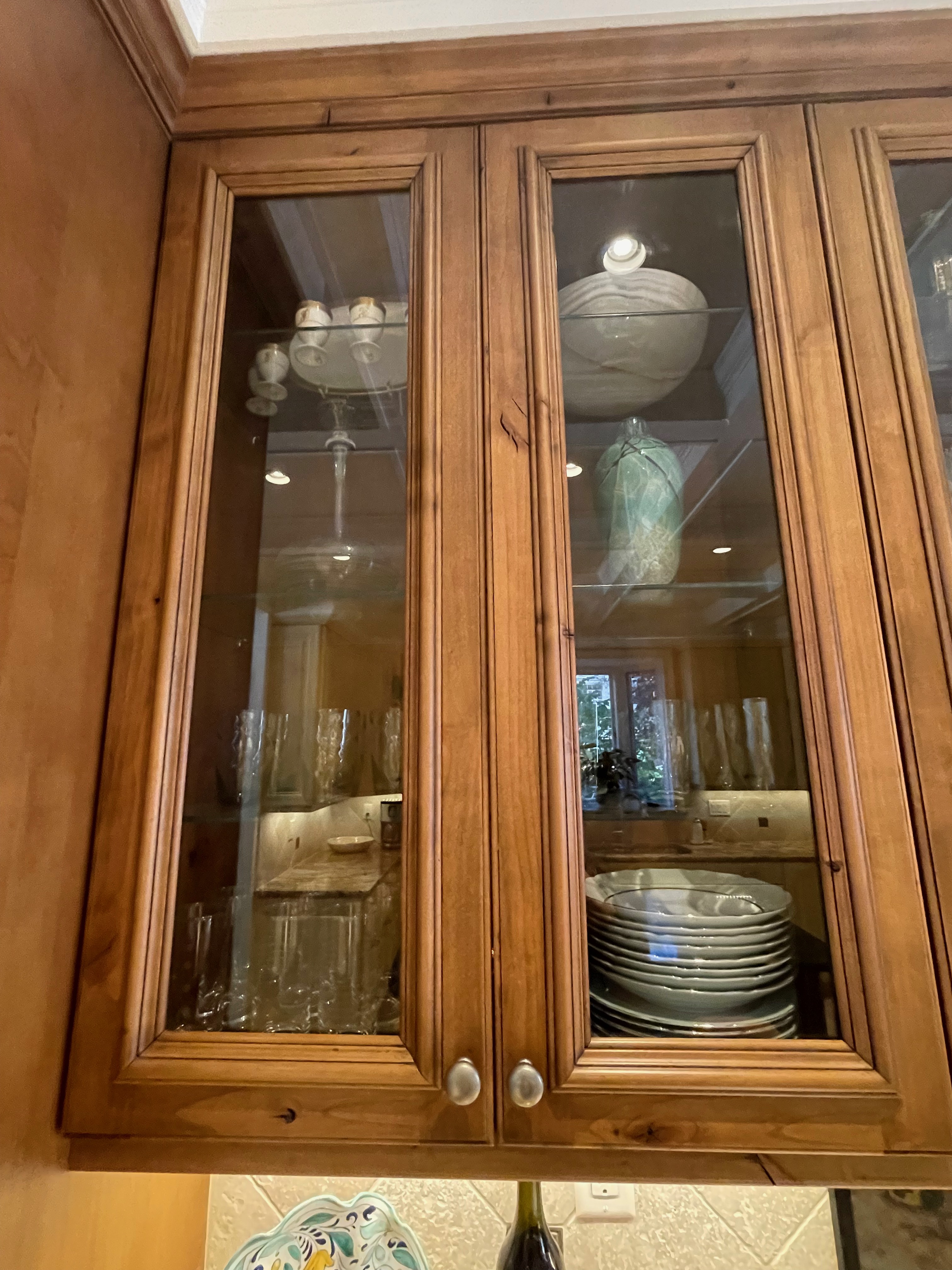 3-Two door glass front wall cabinets in Alder wood Dim.:30“w x 42”h/44”h w/crown/45 ½”h w/base trim x 12 “d