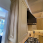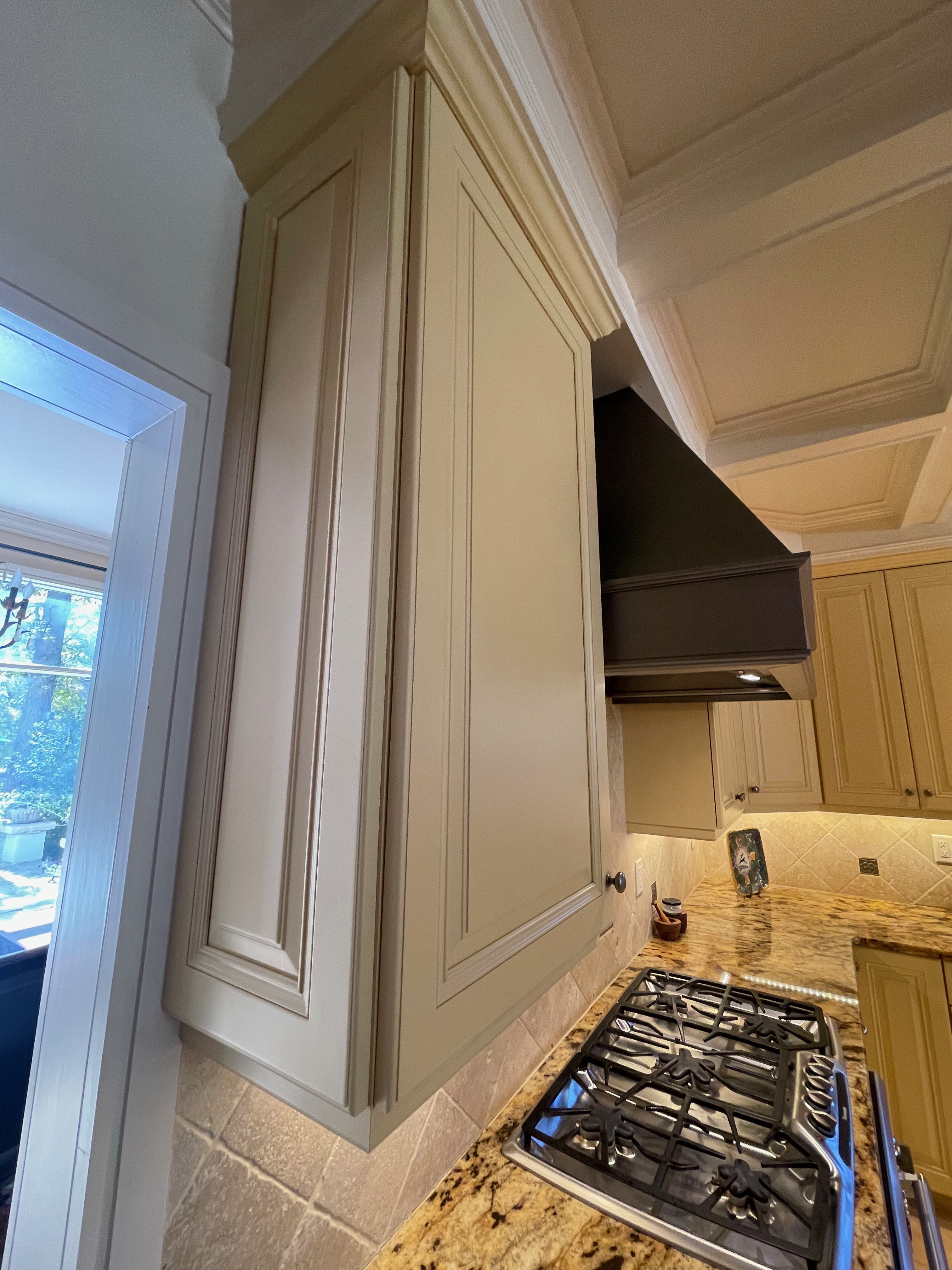2- One door corner wall cabinet in cream Dim.: 24” w finished panel x 42”h/44”h w/crown/45 ½”h w/base trim x 12” d