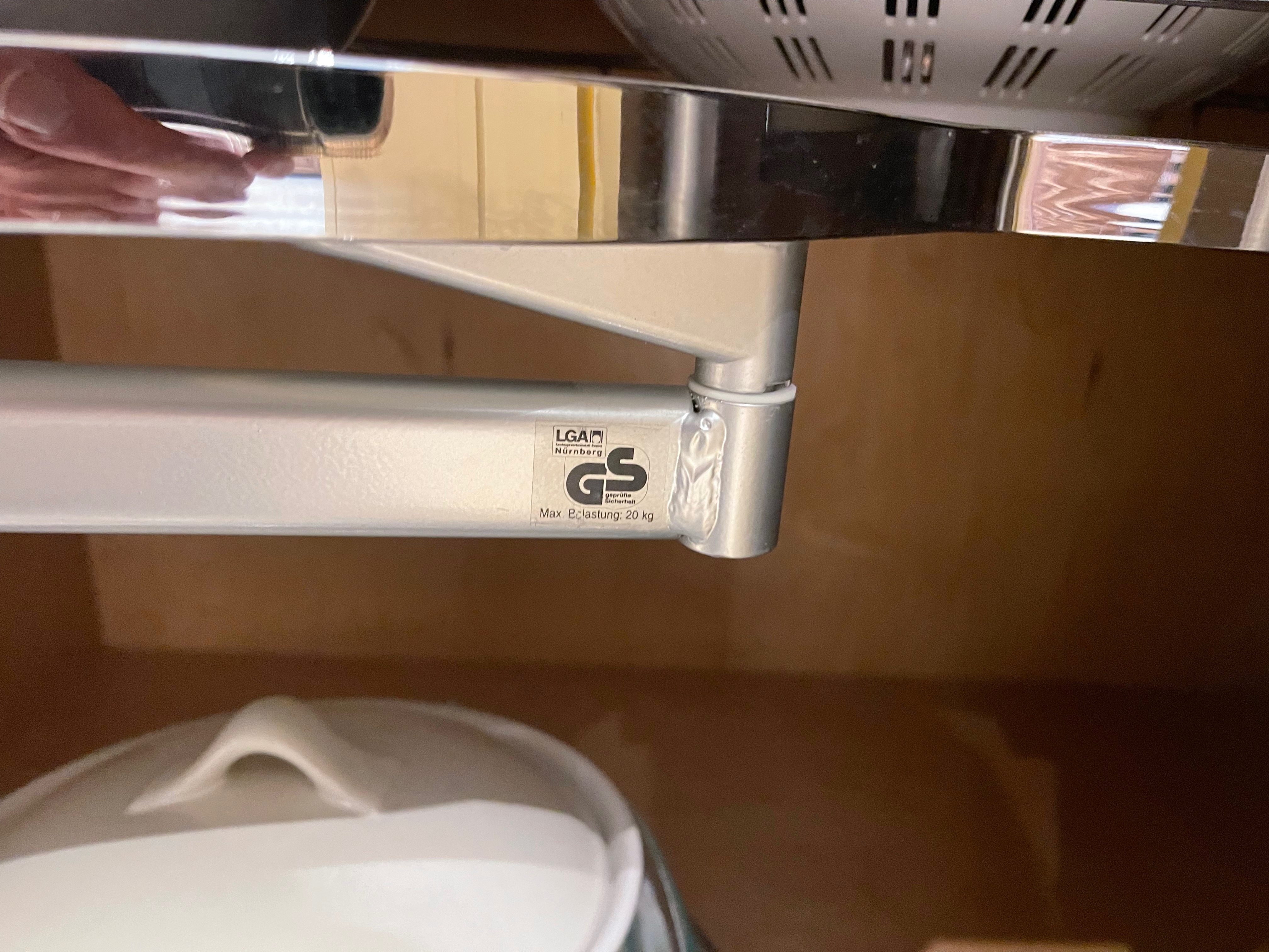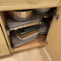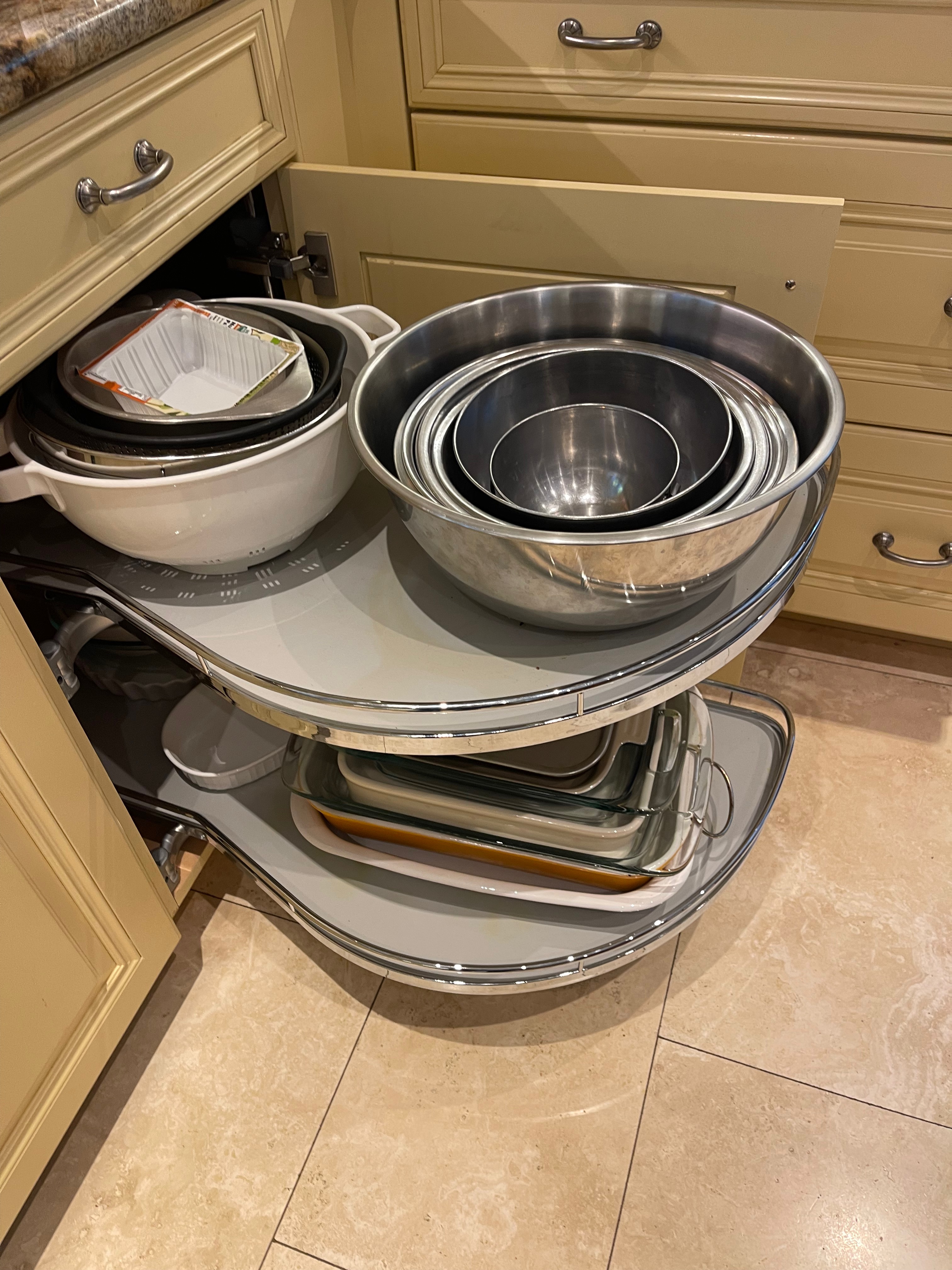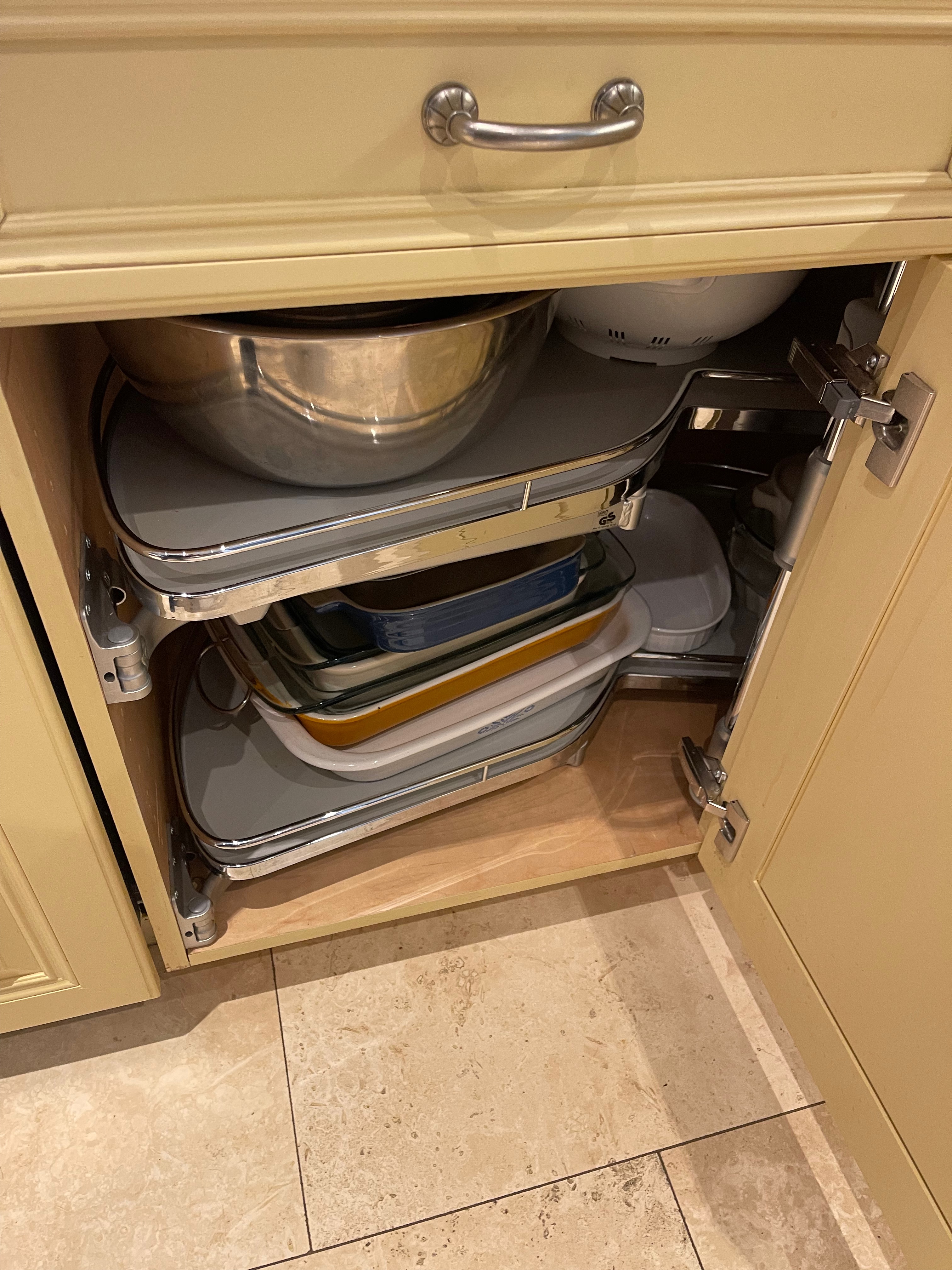 1-One drawer, One door blind corner base cabinet in cream Dim.: 49 “w x 36”h x24“d*Blind corner cabinet organizer $685