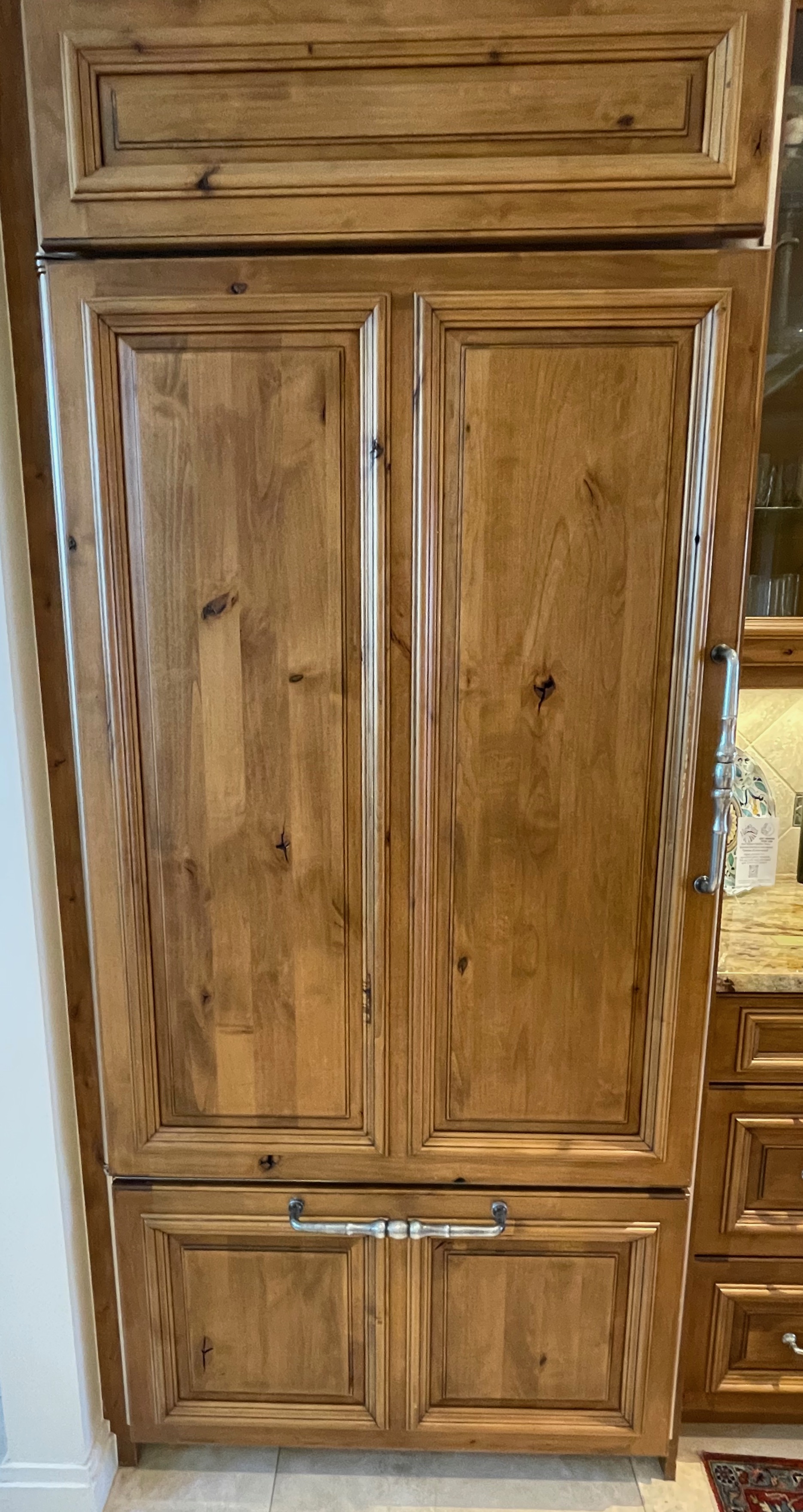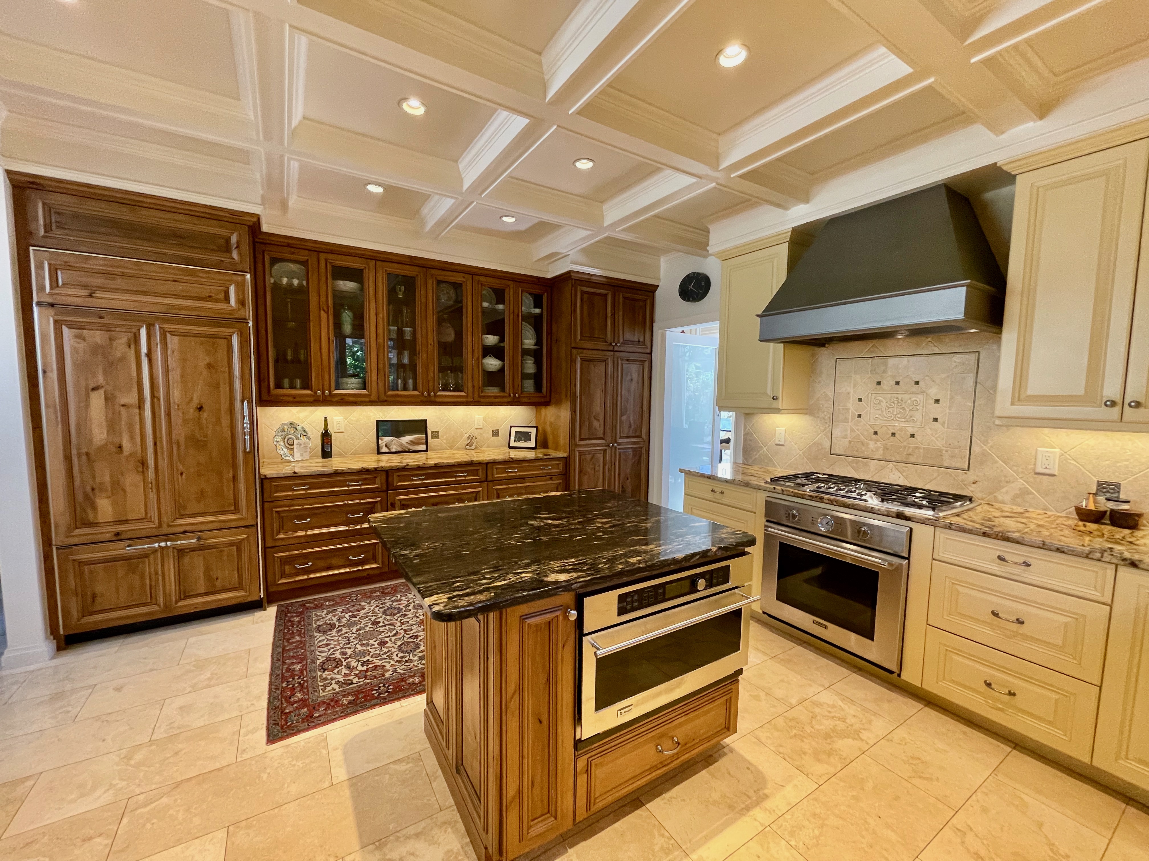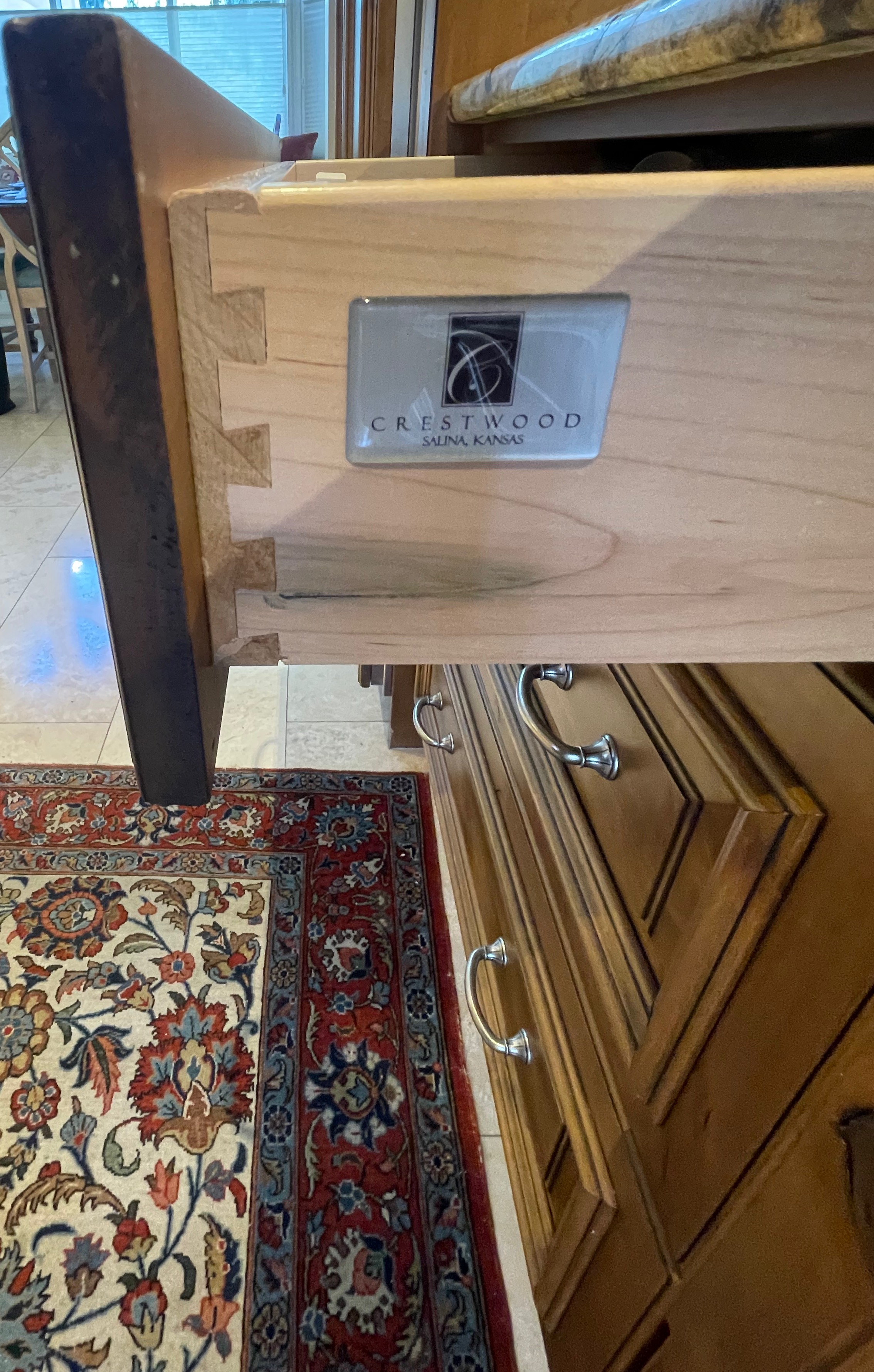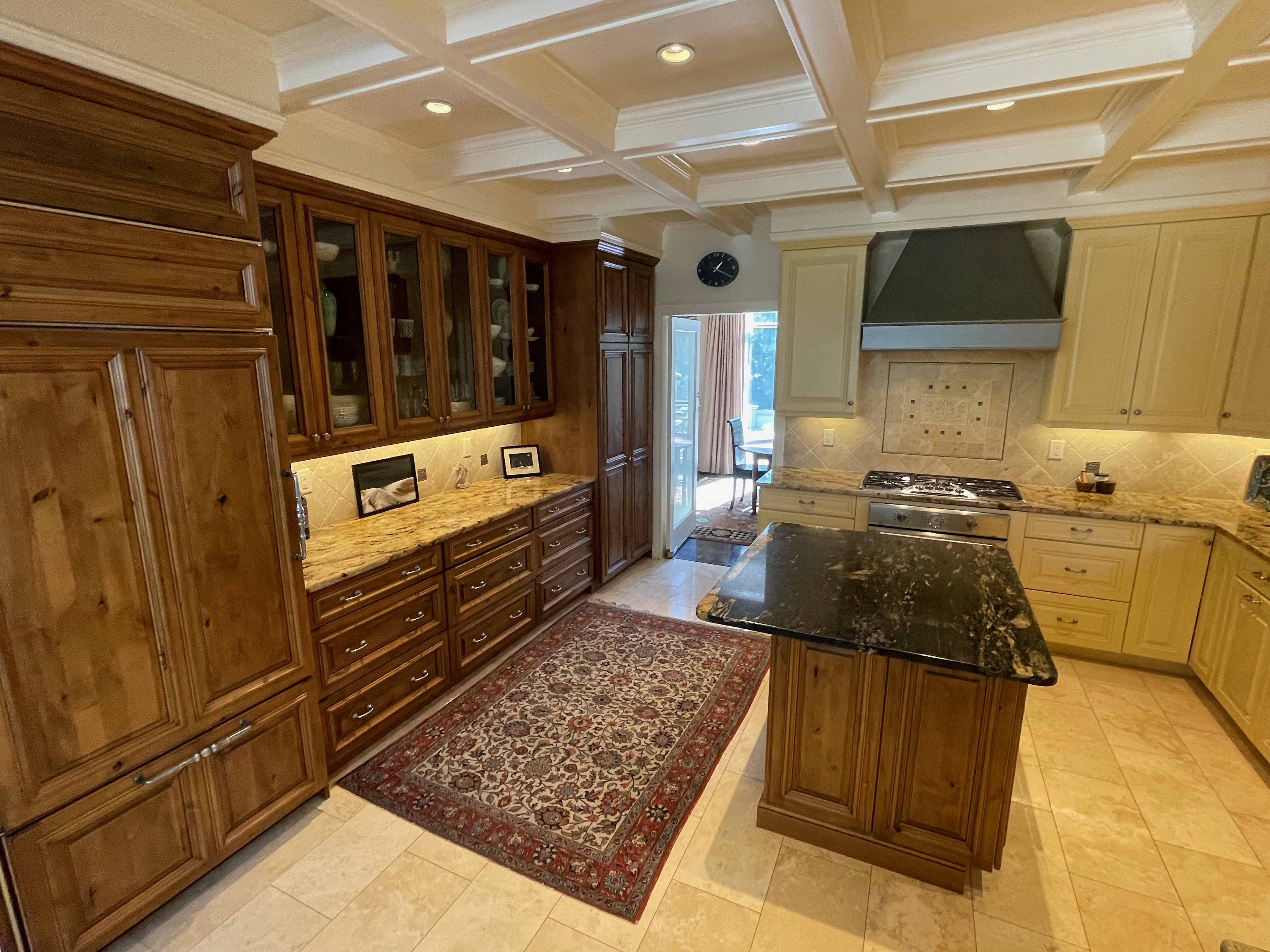 Classic Crestwood Kitchen with Knotty Alder wood and contrasting cream cabinetry. The cabinet drawers are soft-close and dovetail. The kitchen has a Sub-Zero Refrigerator and Thermador Stainless Steel appliances. The cabinets have high-end plywood boxes, soft close and dovetail drawers. This is a beautiful classic set. The lighting in the house made some of the perimeter wall cabinets look yellow but they are a nice cream color in natural light outside in the last few photos. Must see in person! The kitchen has been professionally removed to storage and is ready for pick up! Price for the package below.
