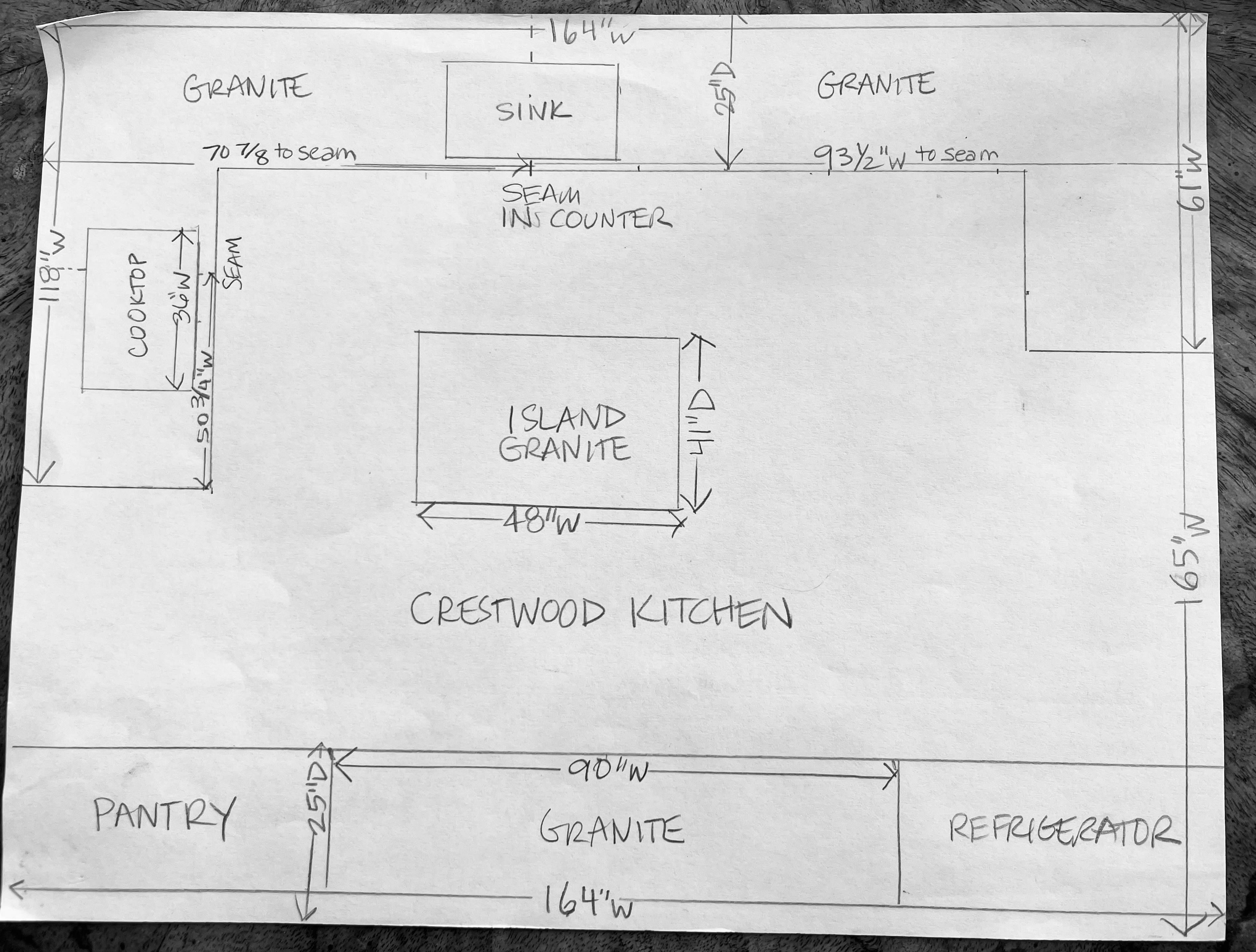 ISLAND-2 48”x 41” granite,9” overhang for seating /40”x 30’ cabinets