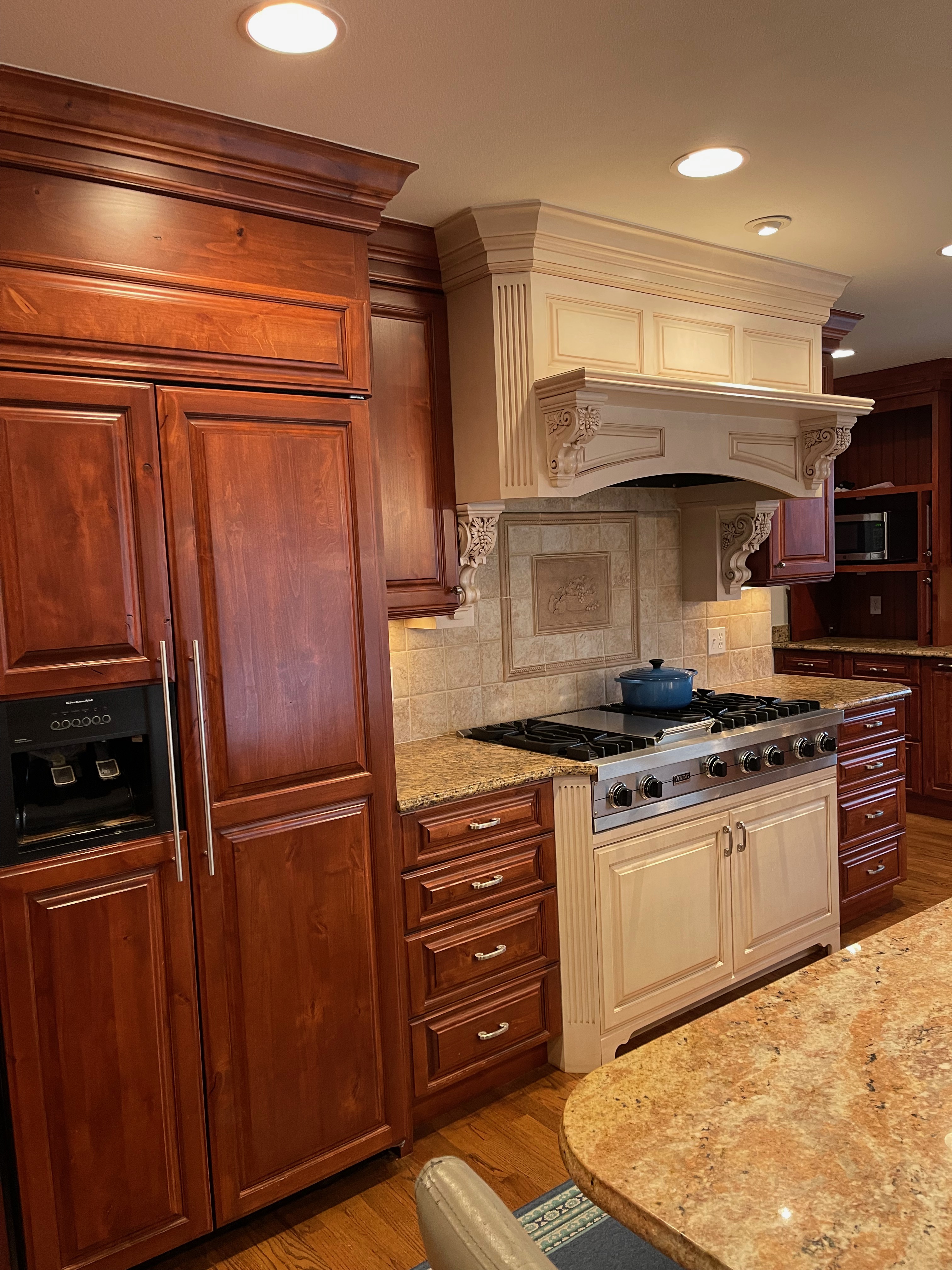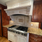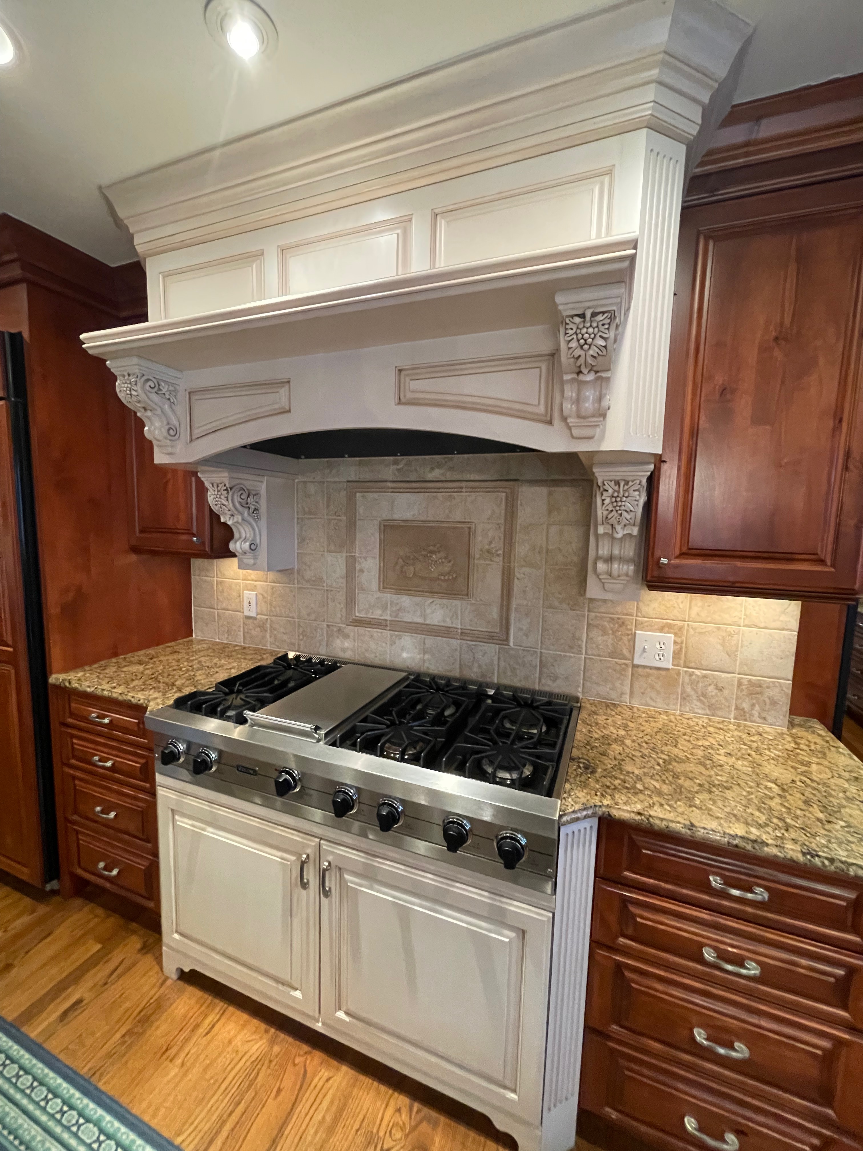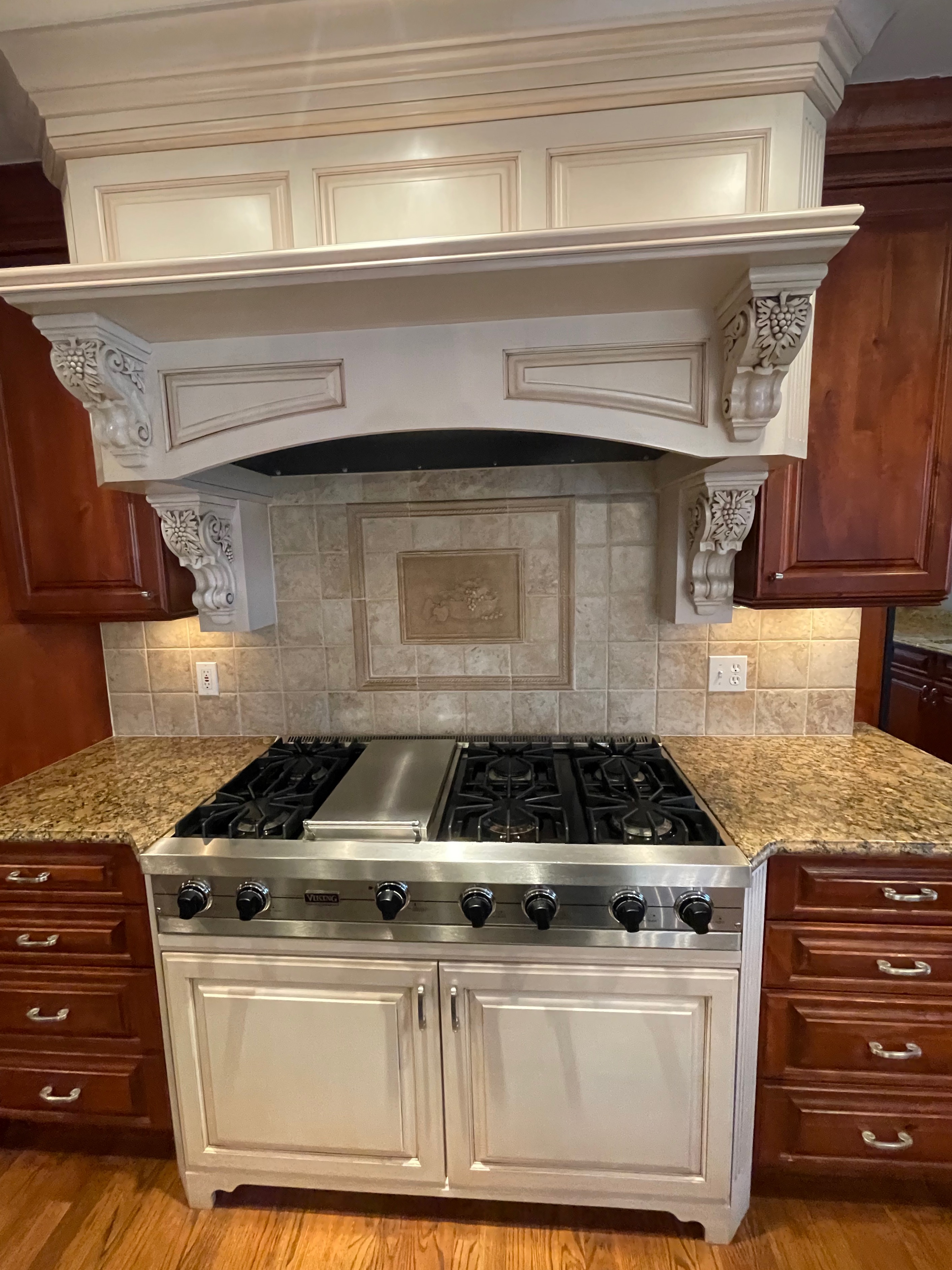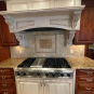 *Decorative cream wall hood Dim.:54”w/60”w overall x 30”h + additional 15”h w/ corbels x 32”d w/ mantle