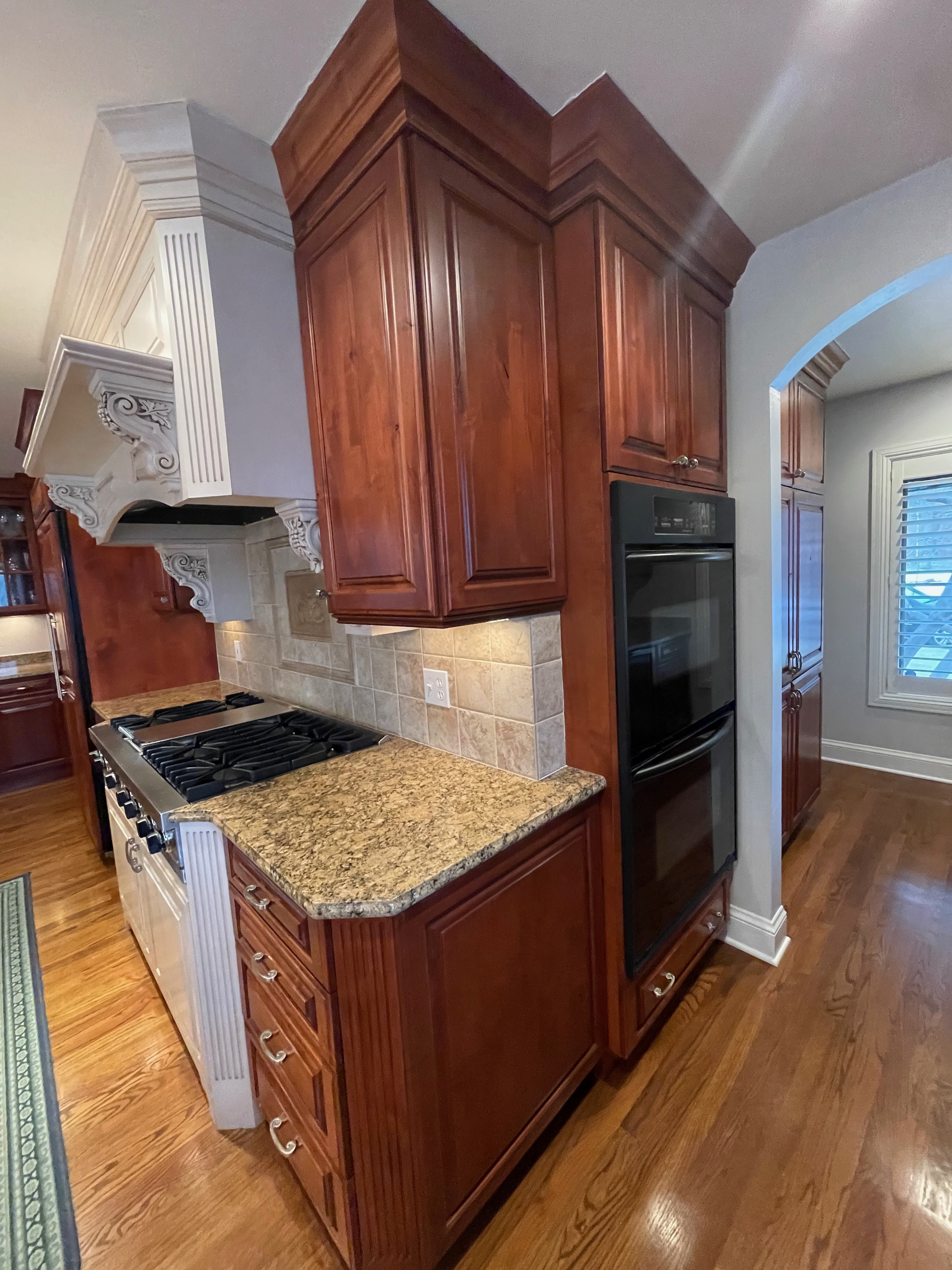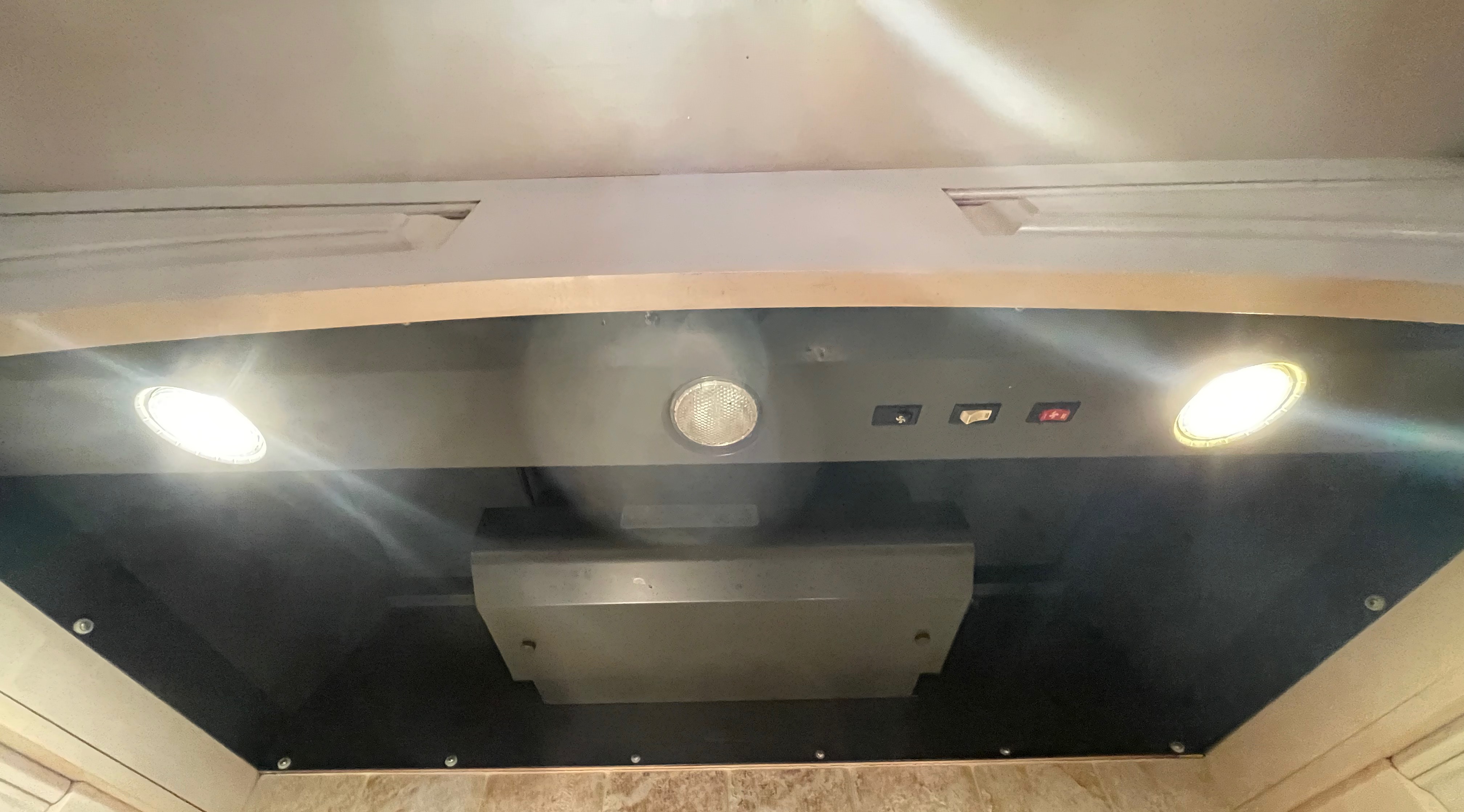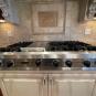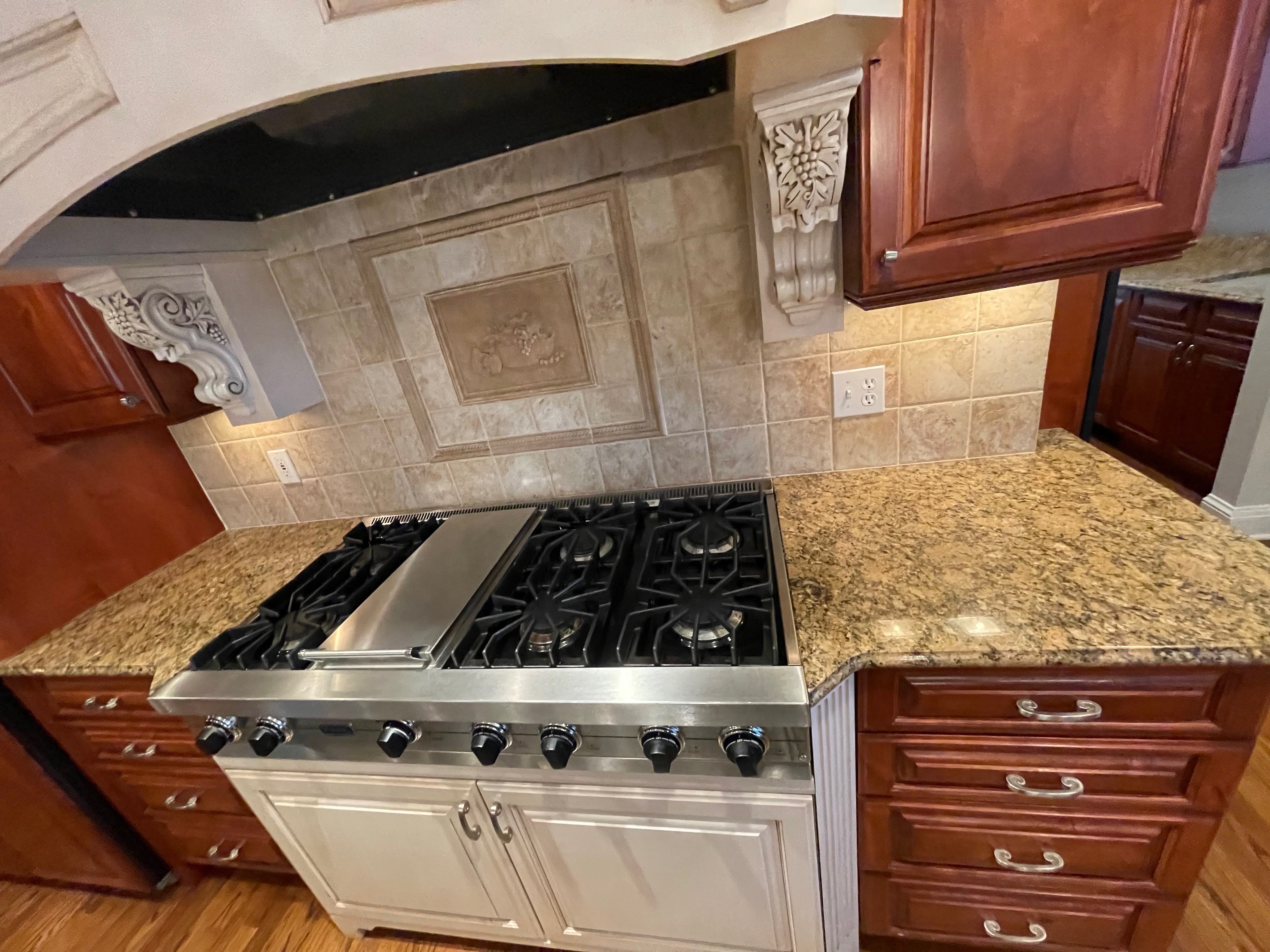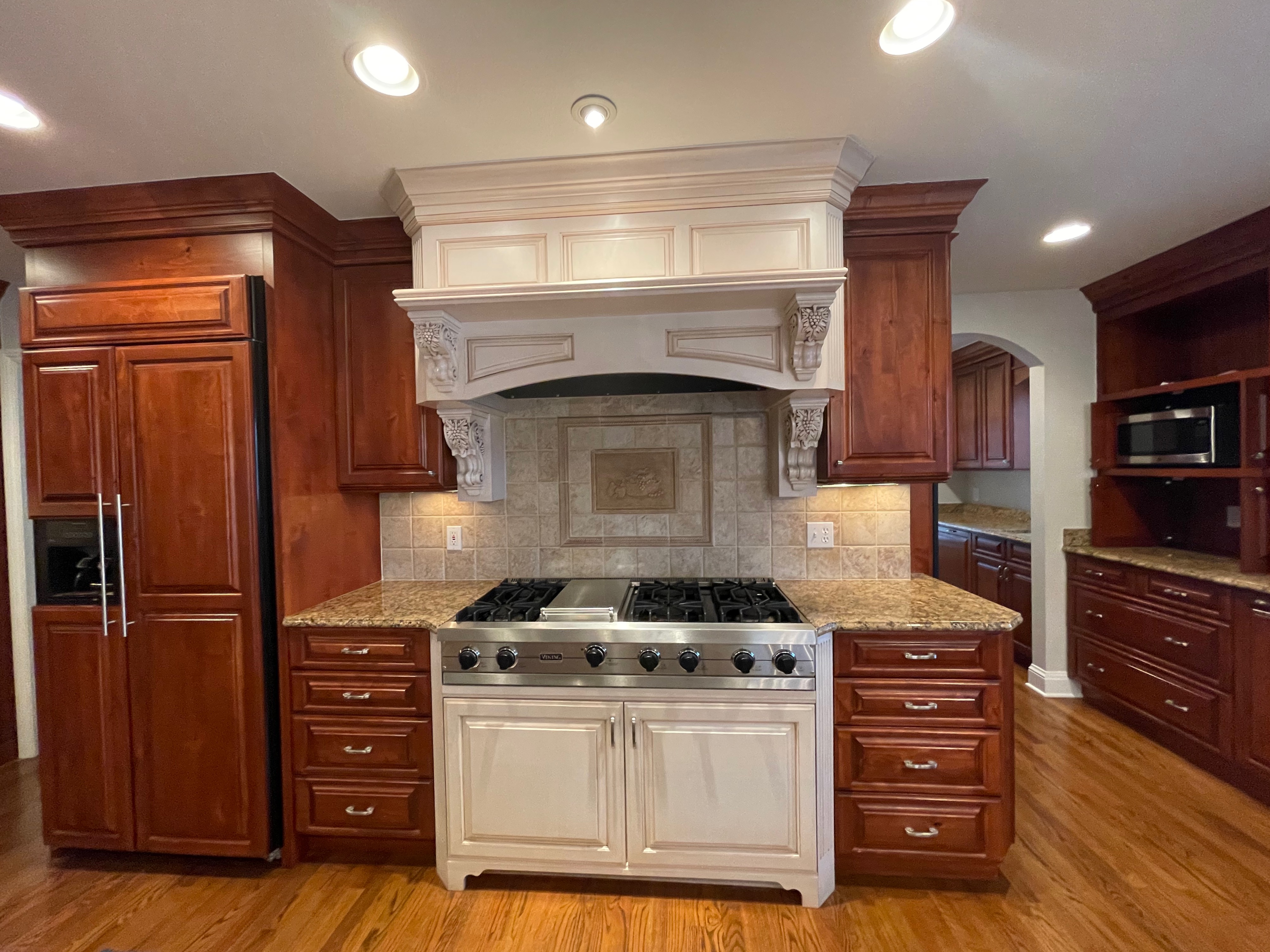 *Decorative cream wall hood Dim.:54”w/60”w overall x 30”h + additional 15”h w/ corbels x 32”d w/ mantle