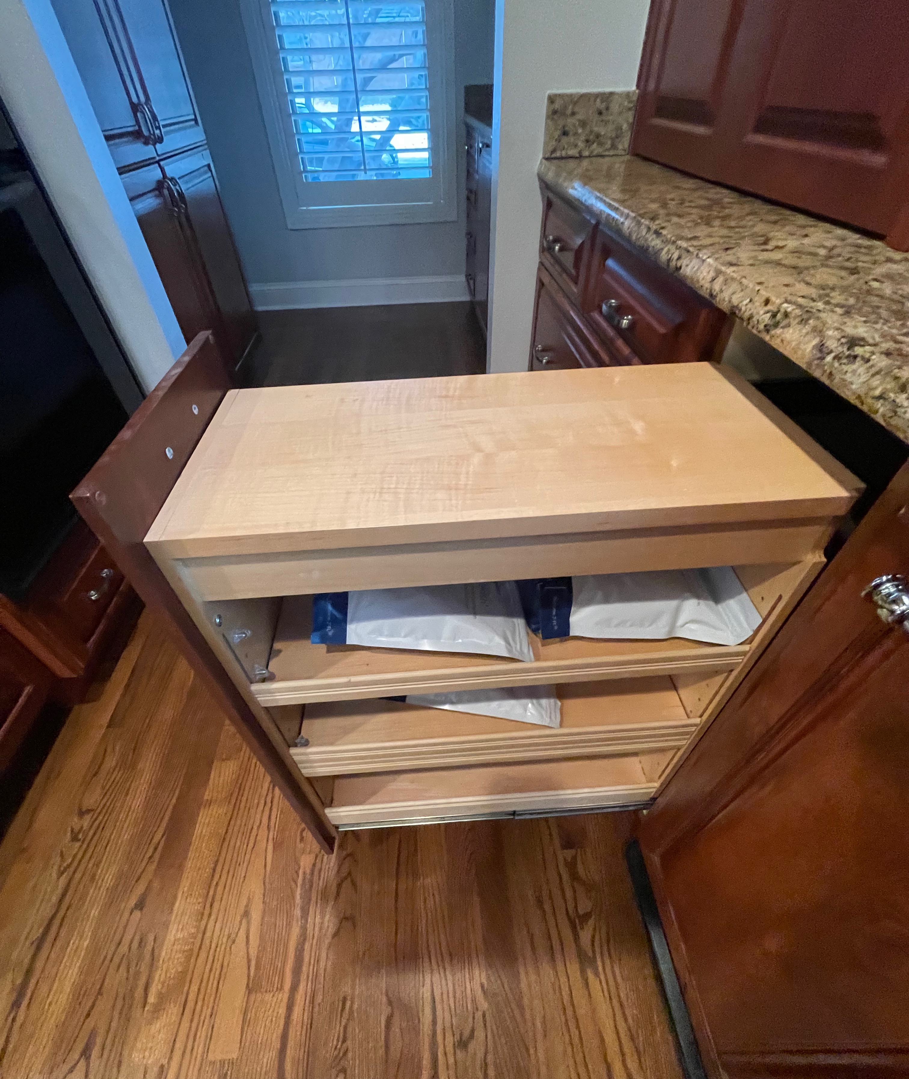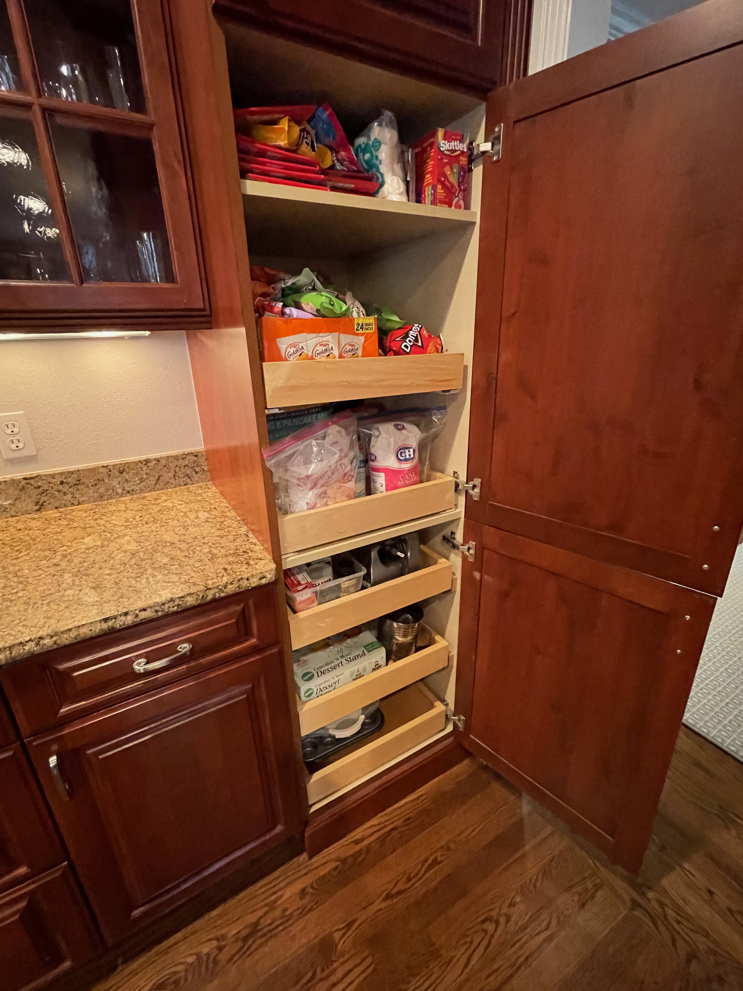1-One door pull out w/pull out cutting board and spice/condiment drawers Dim.: 12”w x 36”h x 24”d