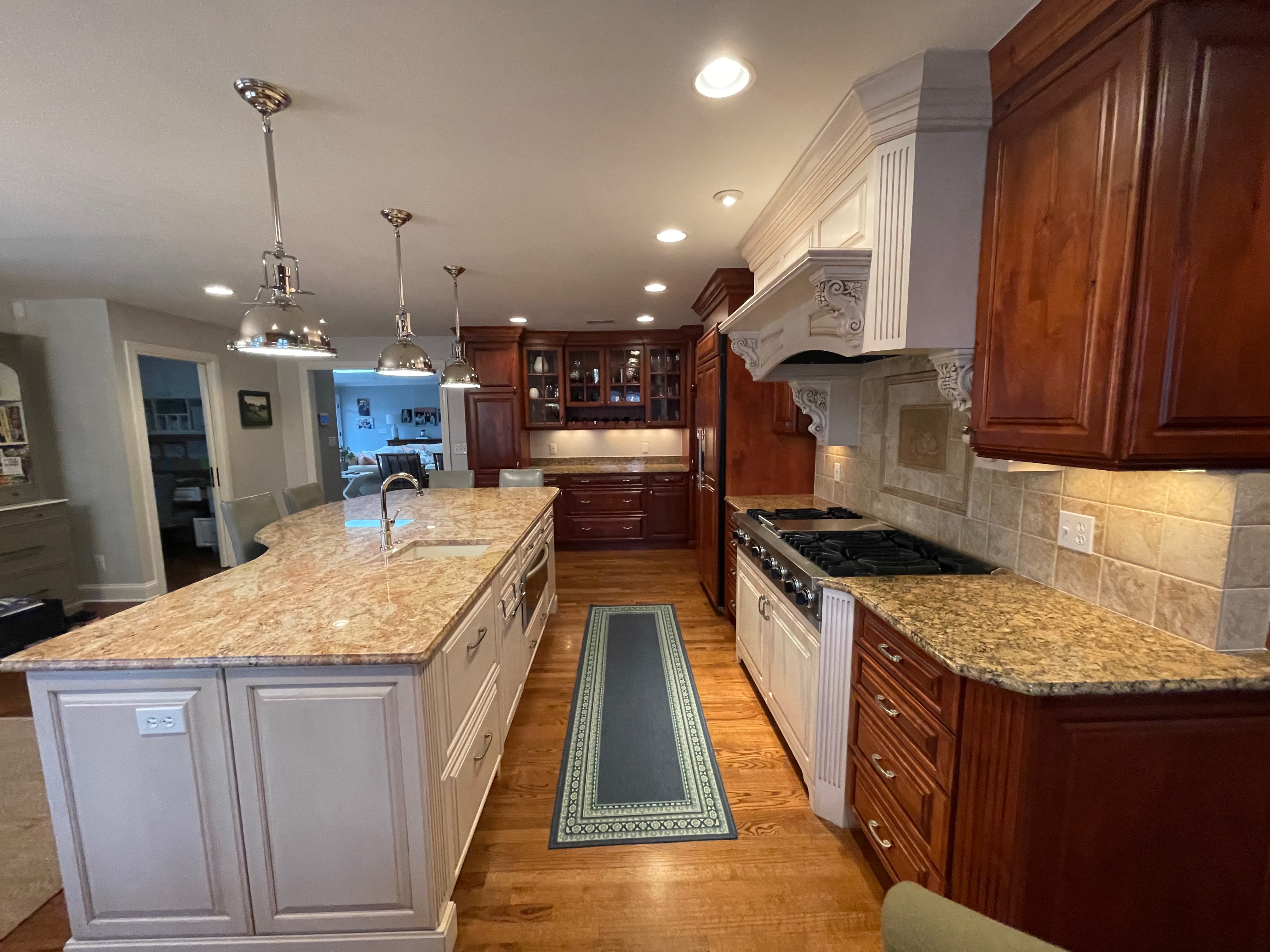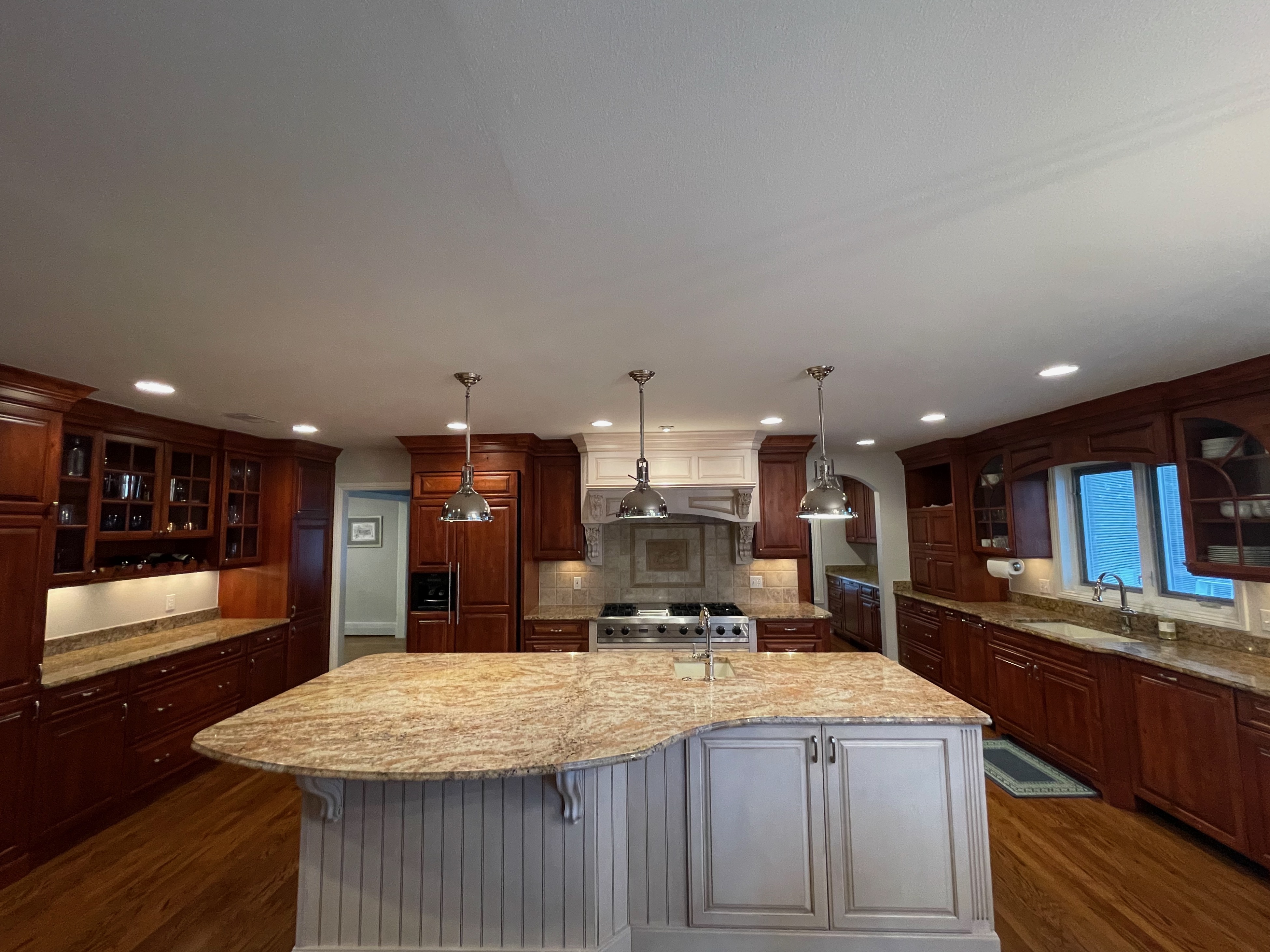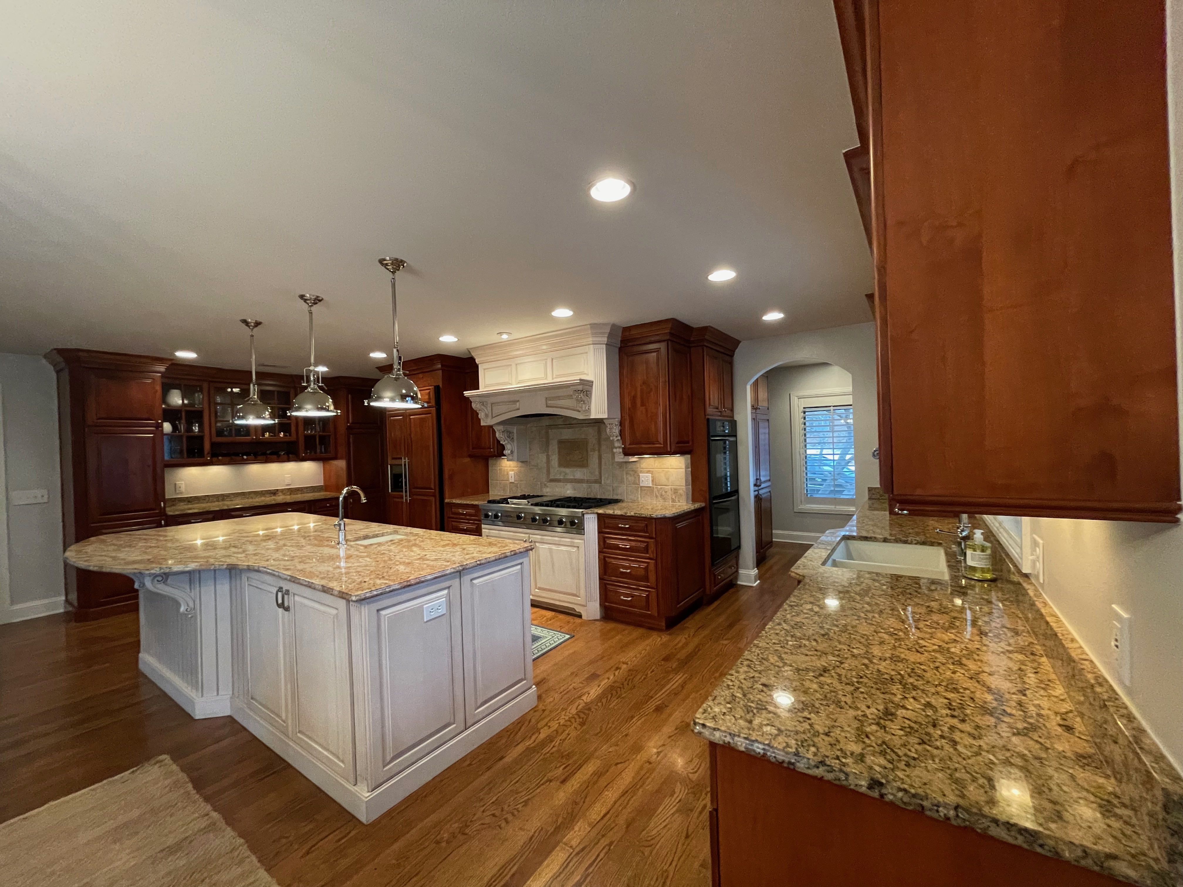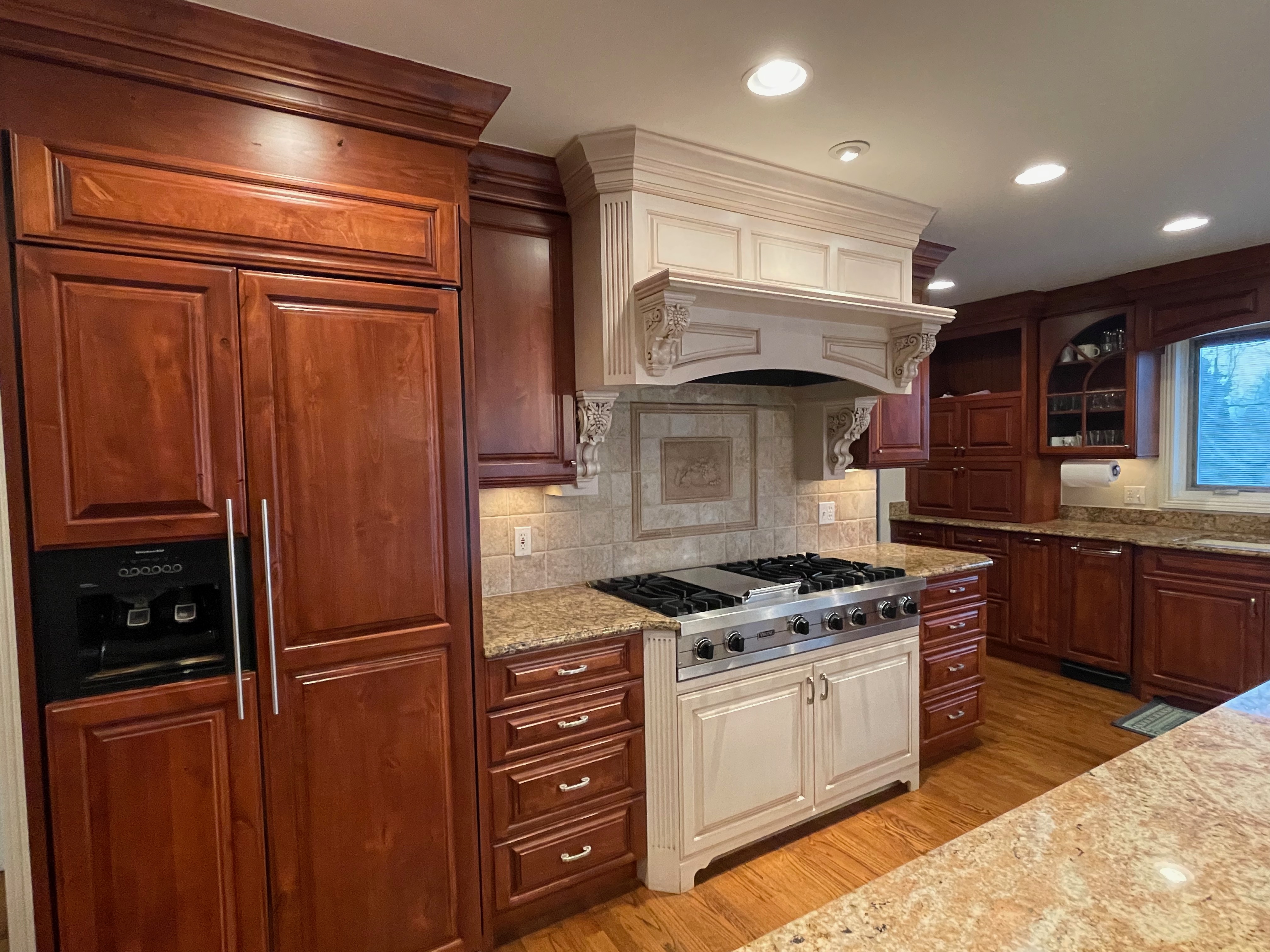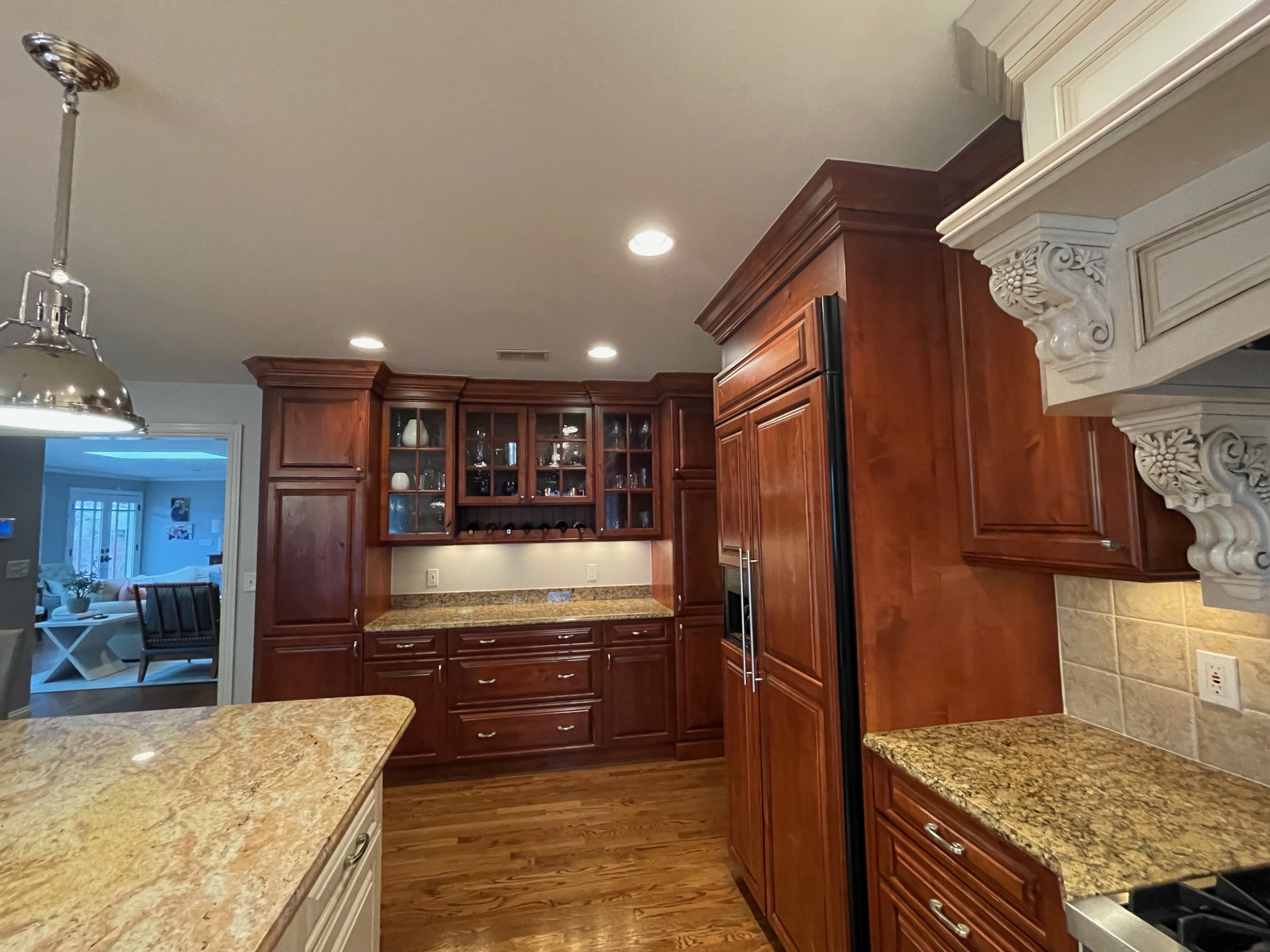 Nice “Crystal Cabinet Works” kitchen cabinets in a knotty cherry wood with contrasting cream island and wall cabinetry. The cabinets have dovetail joinery and the soft close feature. All of the appliances are included with a nice stainless steel Viking range top! To complete the package are slab granite counter tops, sinks, faucet sets and a disposal. The kitchen will fit in a kitchen with 8’ceilings. The set will be available to be removed by a qualified buyer early April or sub-contractors can be hired for the removal. Price for the package below.