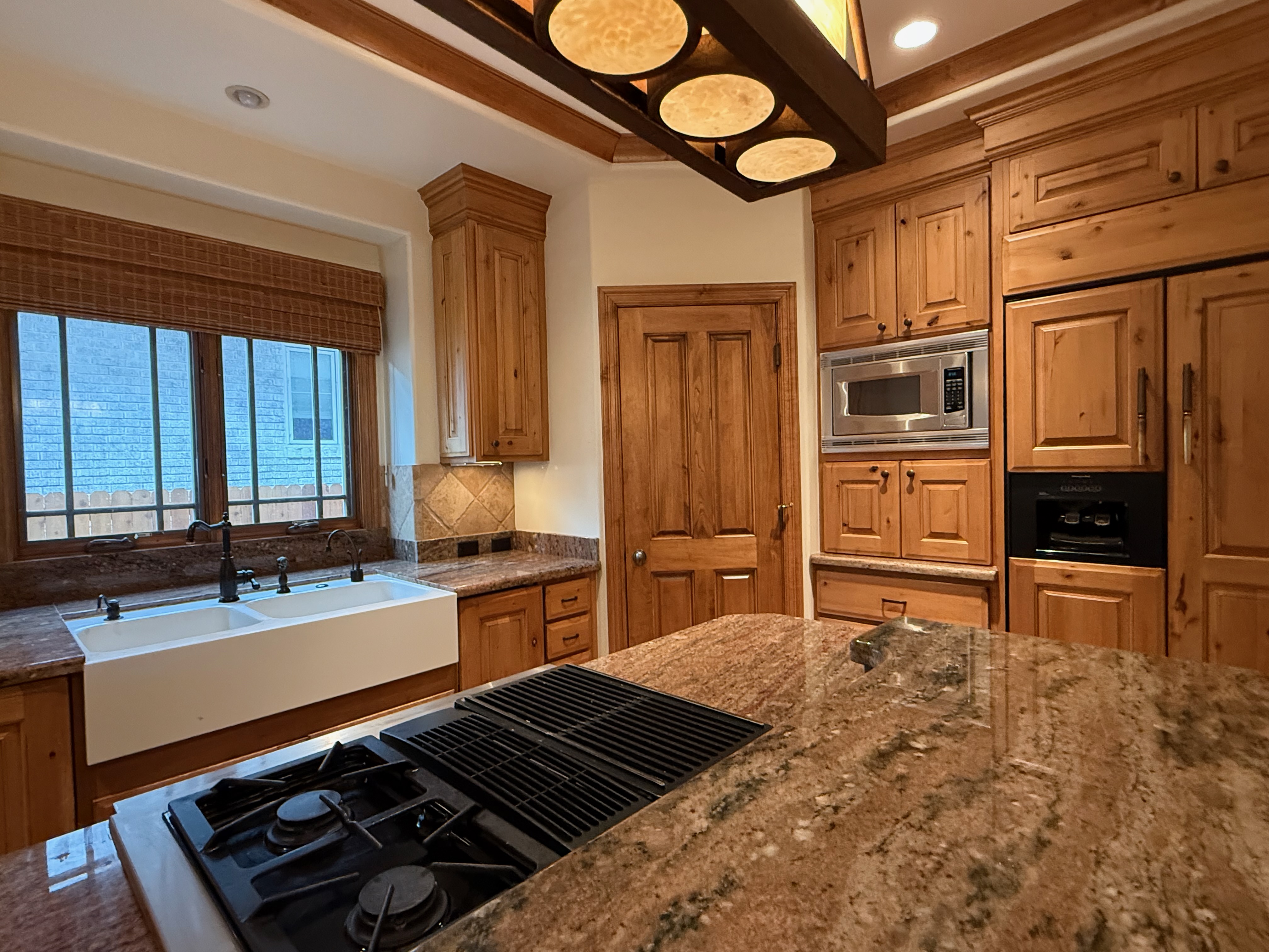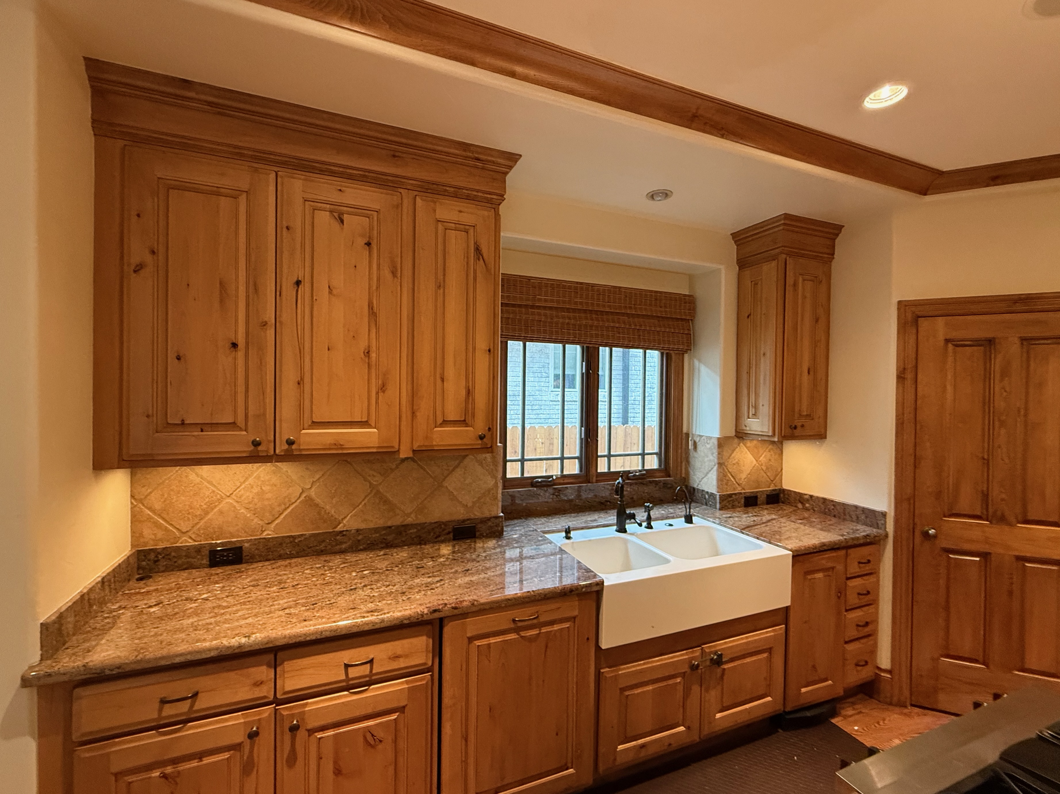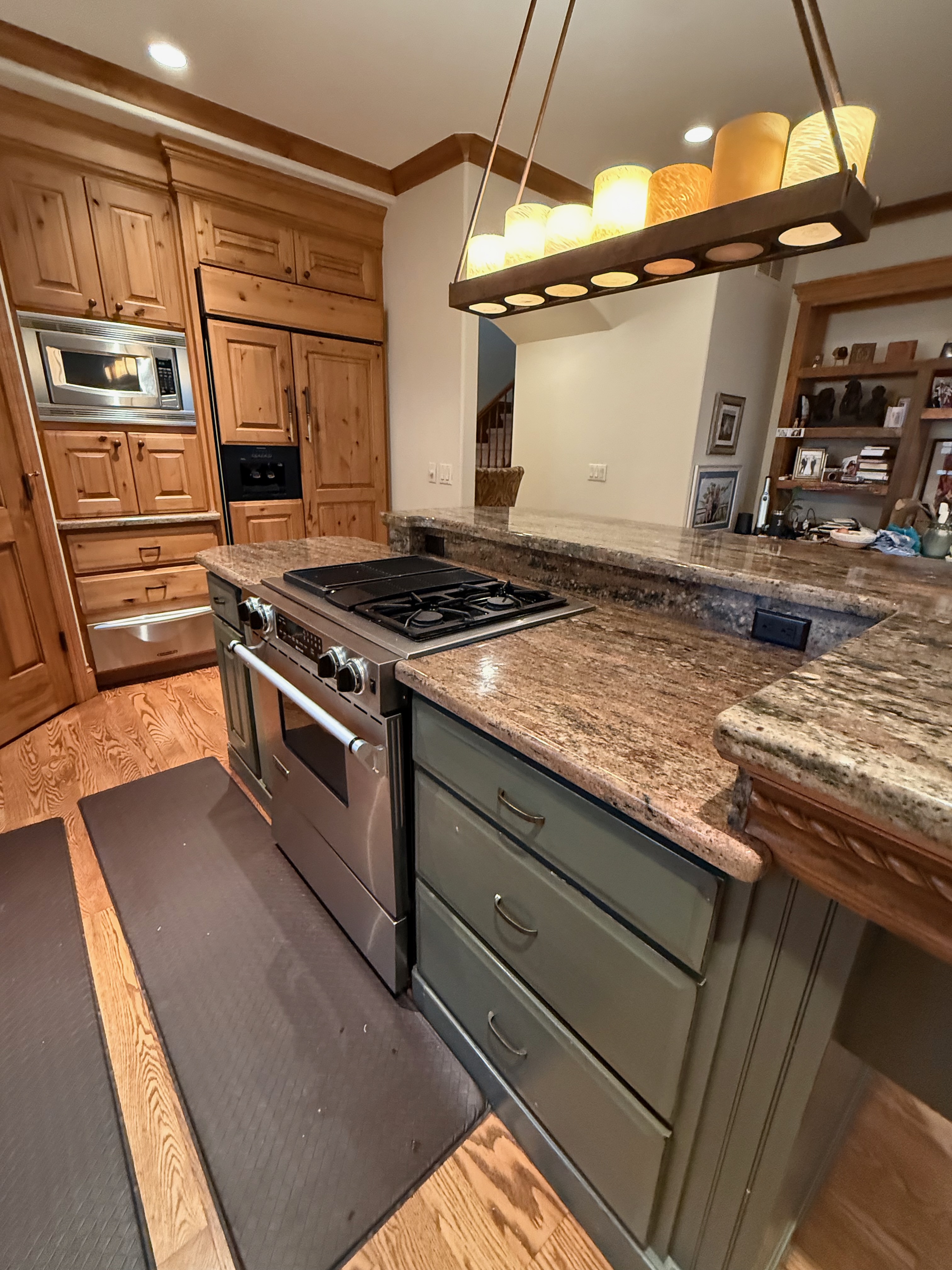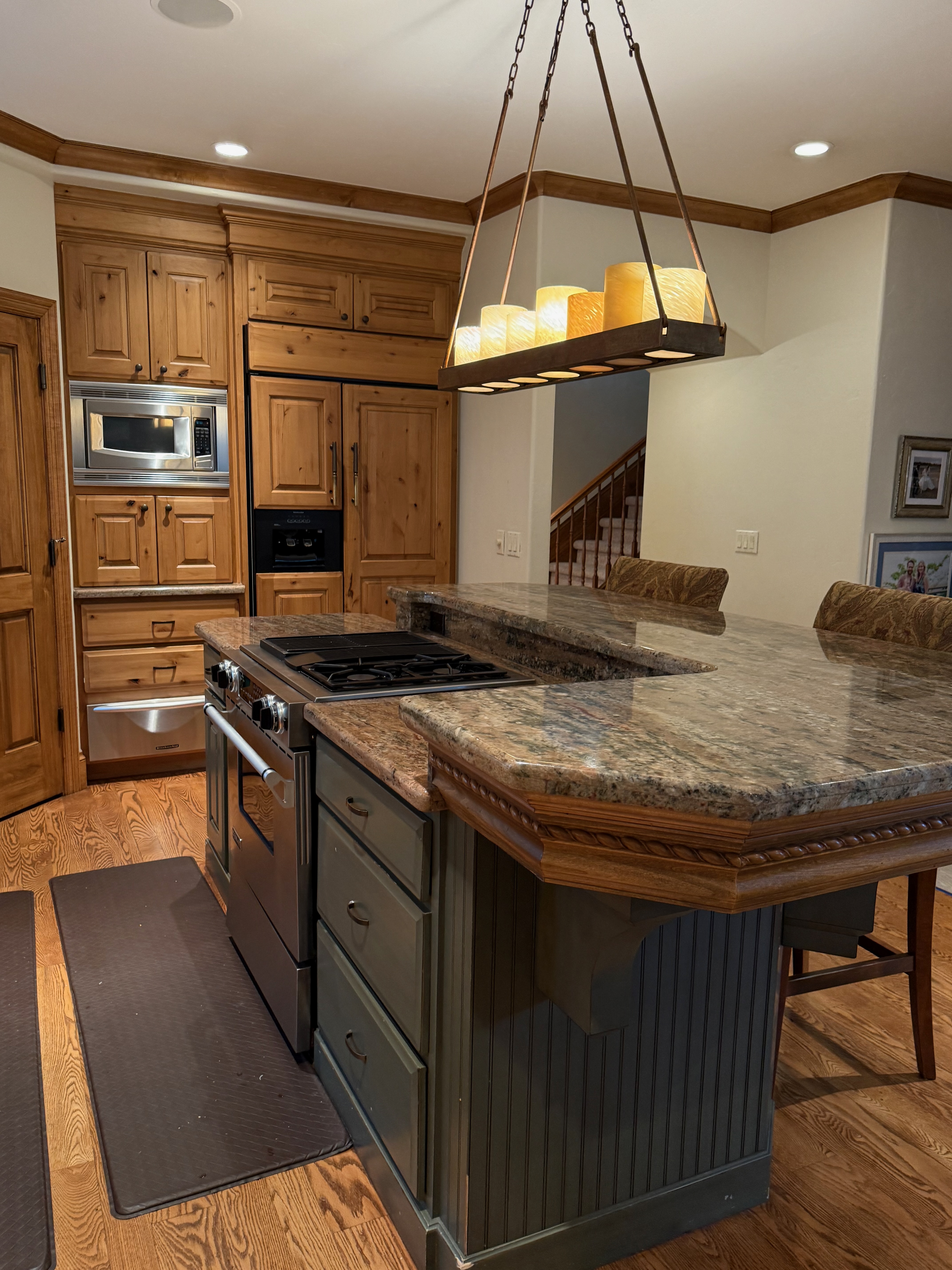 Natural Knotty Alder wood Craftsman style Kitchen cabinets made by Custom Cupboards makers of fine custom cabinetry. In excellent shape with dovetail joinery drawers. KitchenAid stainless steel appliance package with granite countertops. The island is in a contrasting earth-tone sage green finish with a beautiful wood rope molding detail and bead board surround on the back. The is a matching bathroom vanity cabinet in the natural Alder wood. The Kitchen package is available to be removed, tbd January 2026, by a licensed contractor or we have licensed contractors available to hire to remove the kitchen and move it to your home. Pricing below.