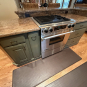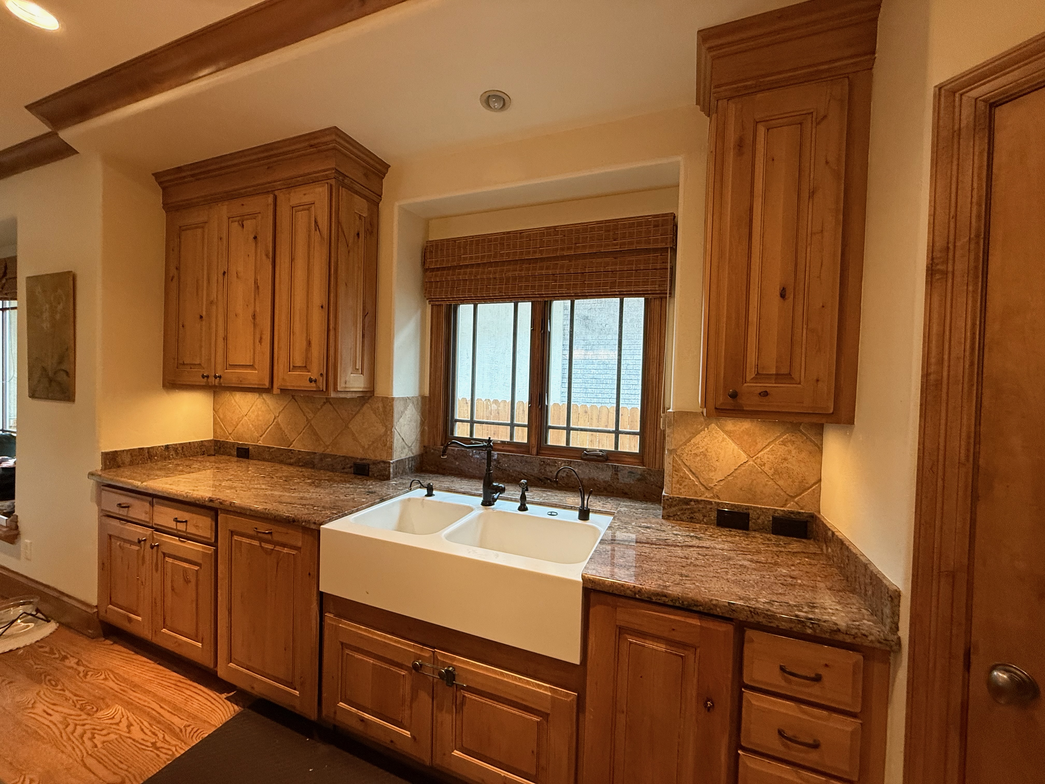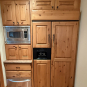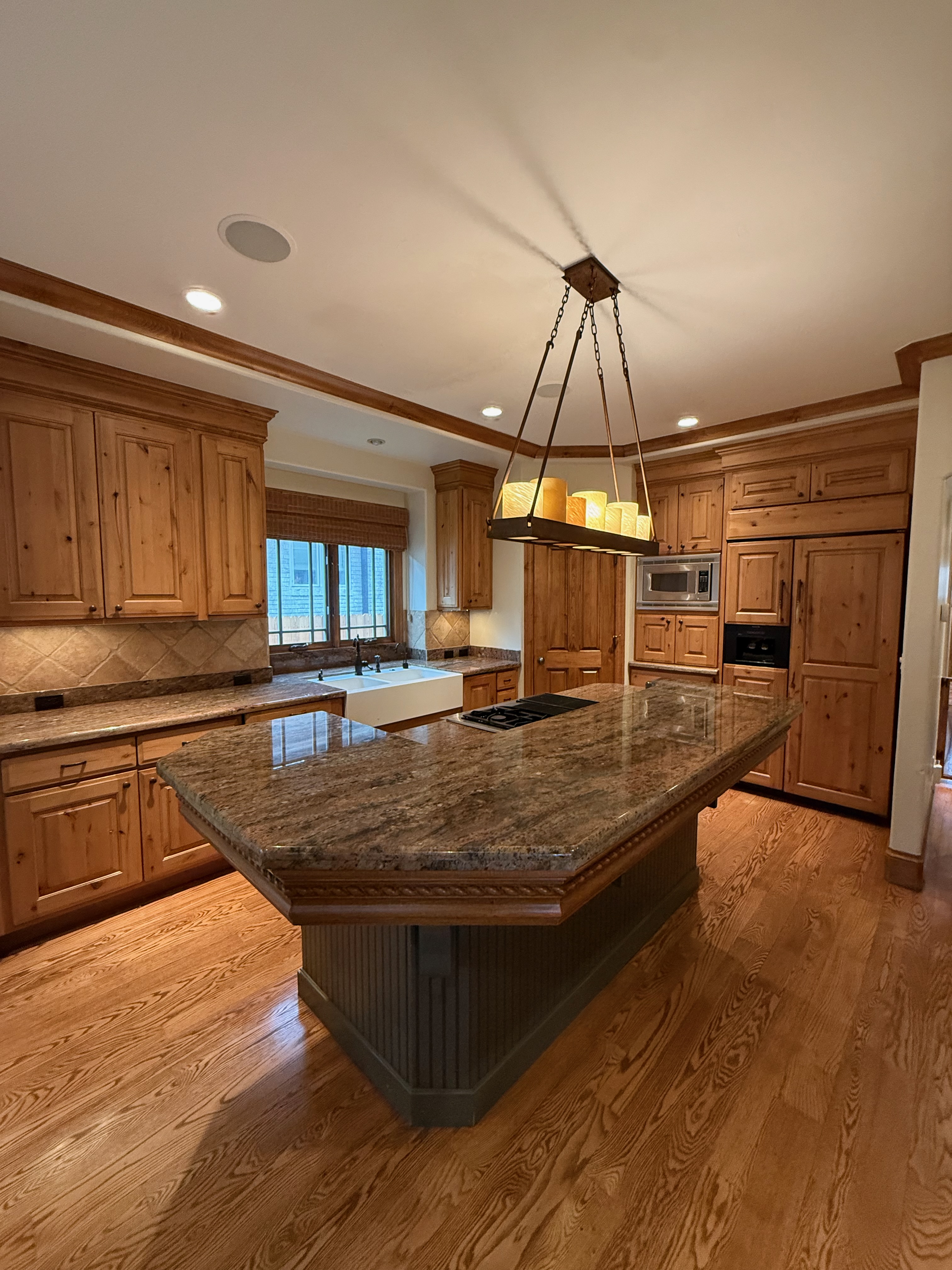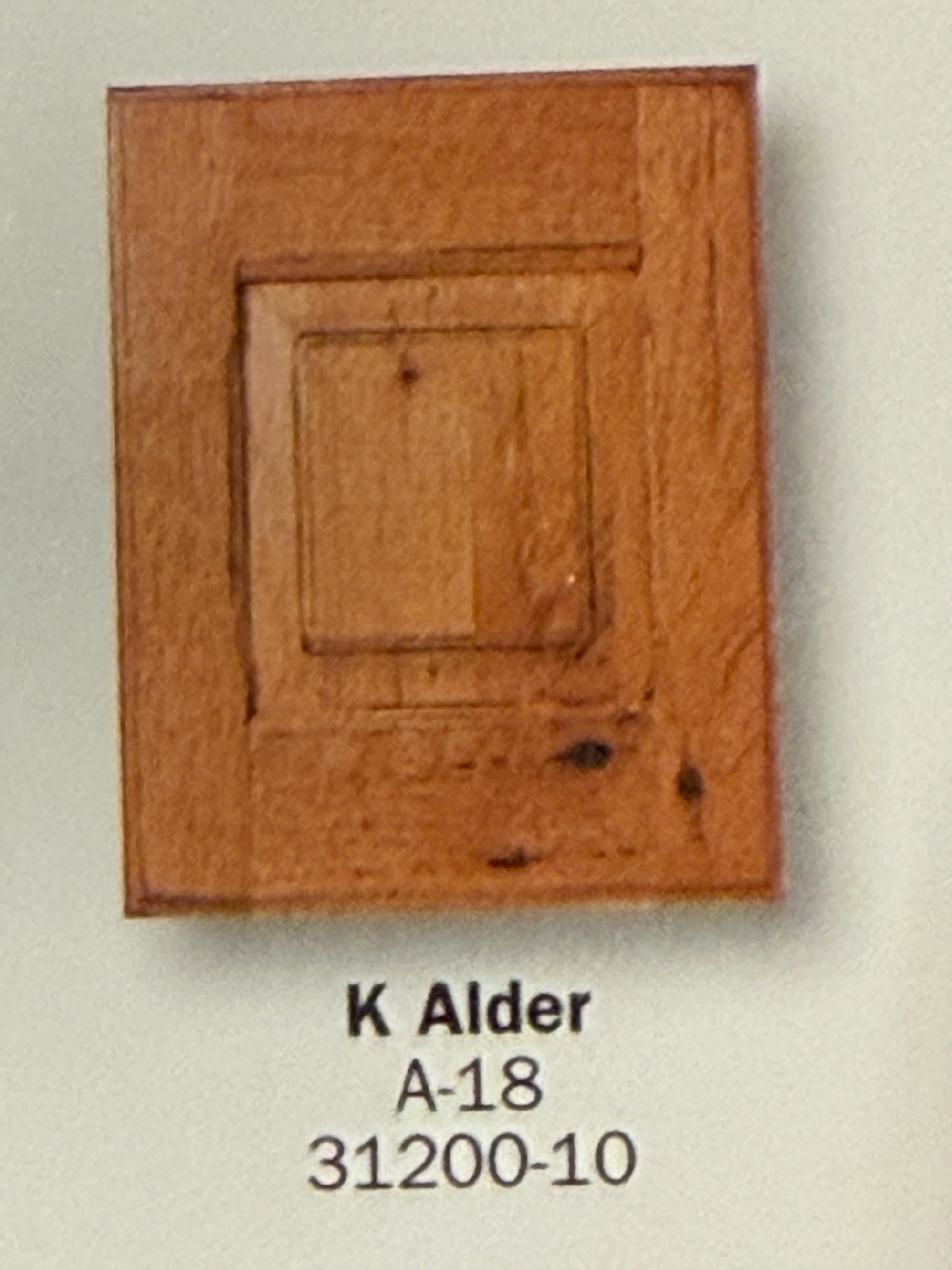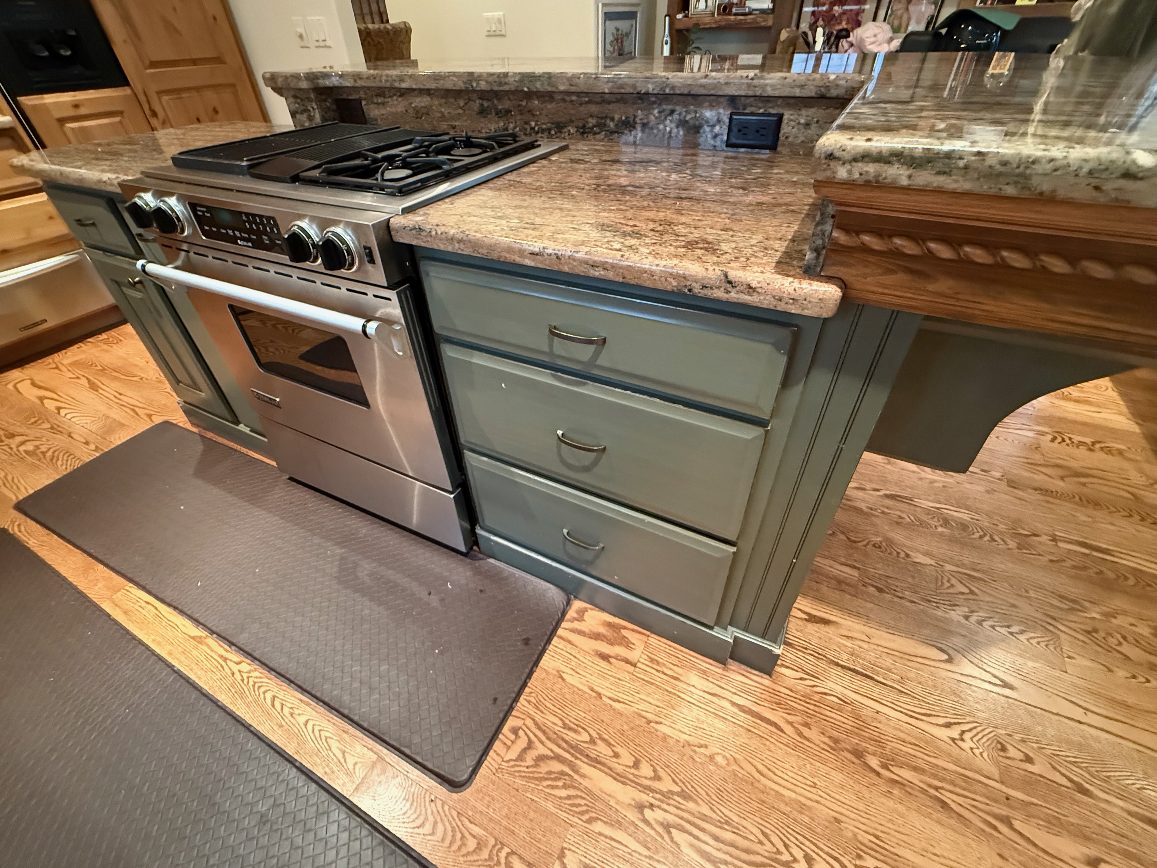 Natural Knotty Alder wood Craftsman style Kitchen cabinets made by Custom Cupboards makers of fine custom cabinetry. In excellent shape with dovetail joinery drawers. KitchenAid stainless steel appliance package with granite countertops. The island is in a contrasting earth-tone sage green finish with a beautiful wood rope molding detail and bead board surround on the back. The is a matching bathroom vanity cabinet in the natural Alder wood. The Kitchen package is available to be removed, tbd January 2026, by a licensed contractor or we have licensed contractors available to hire to remove the kitchen and move it to your home. Pricing below.