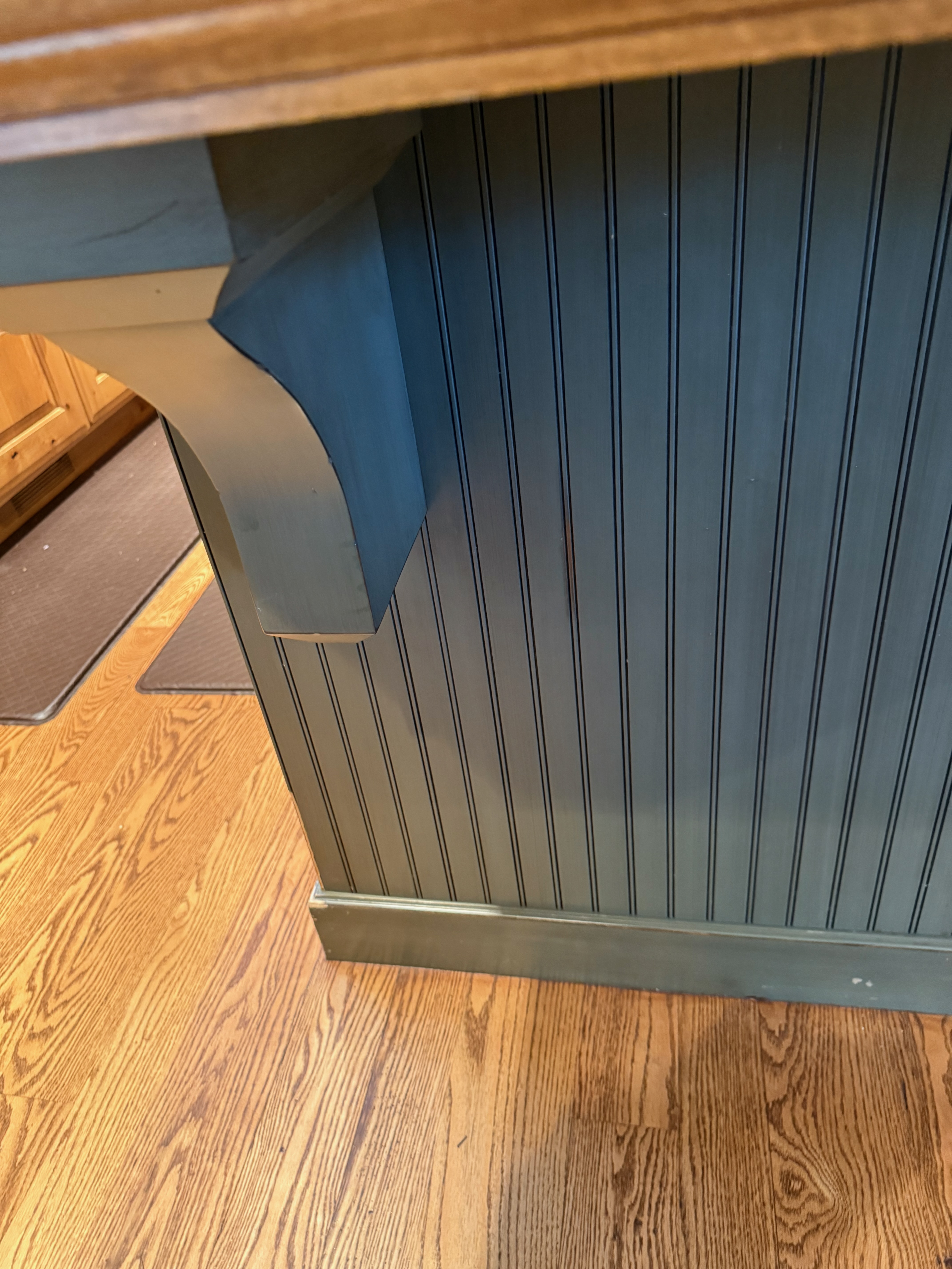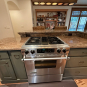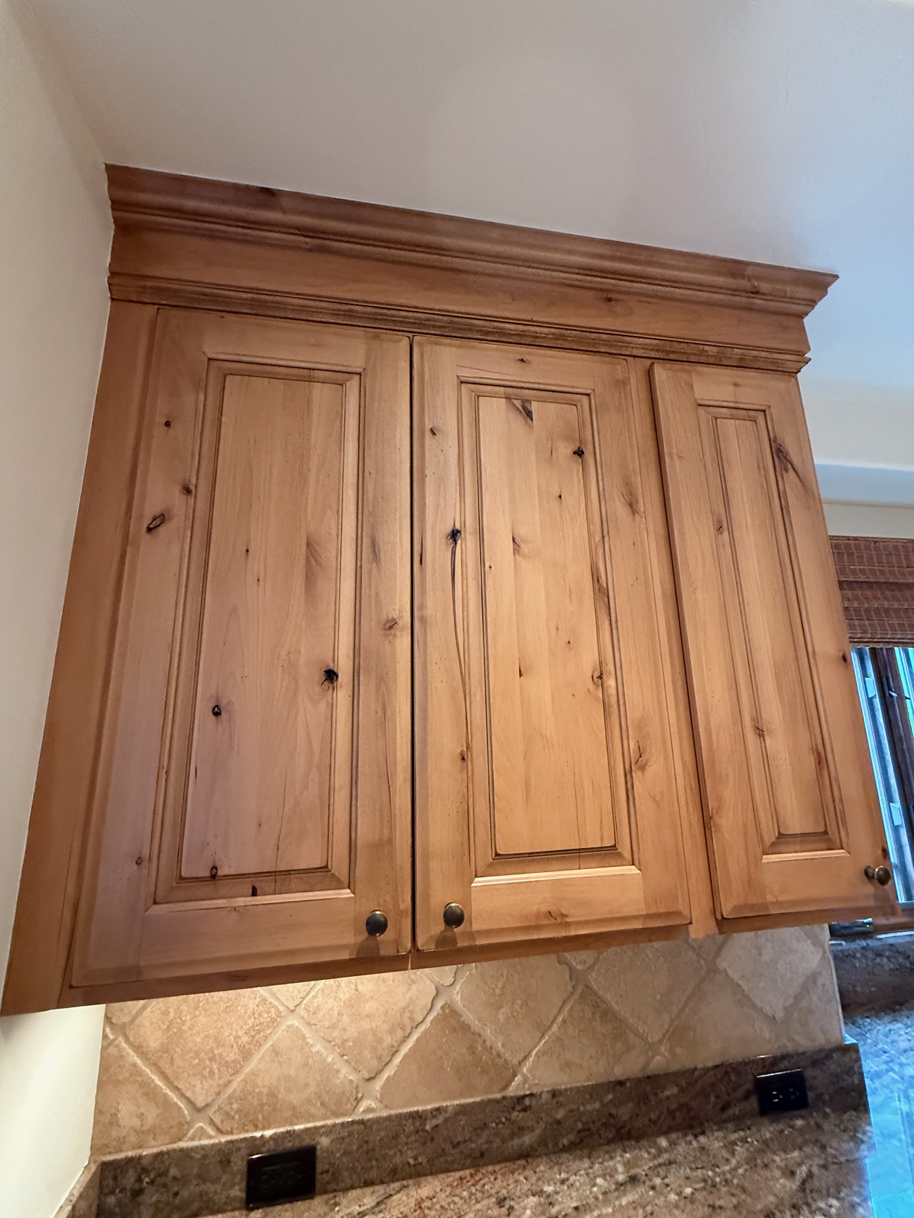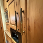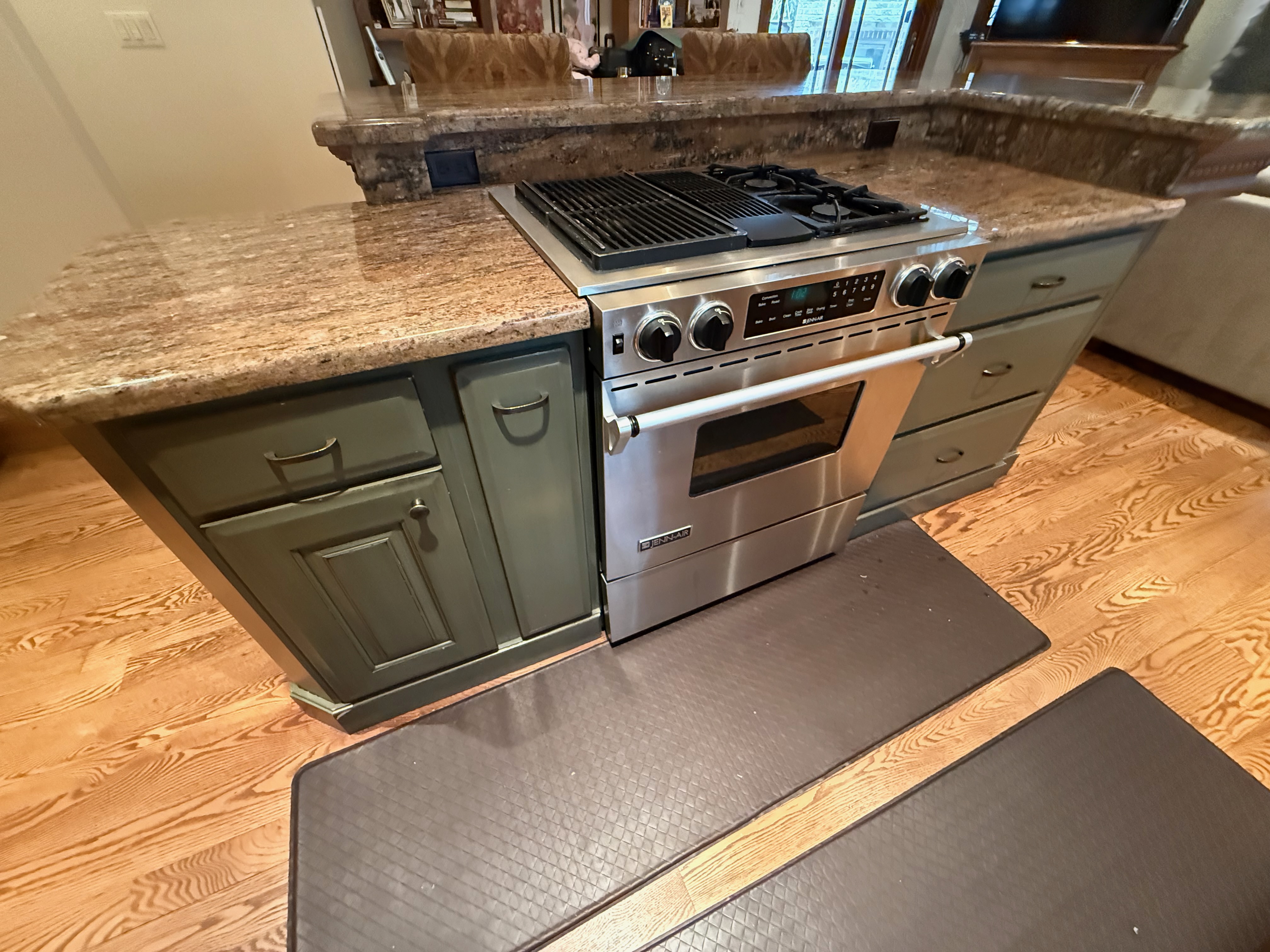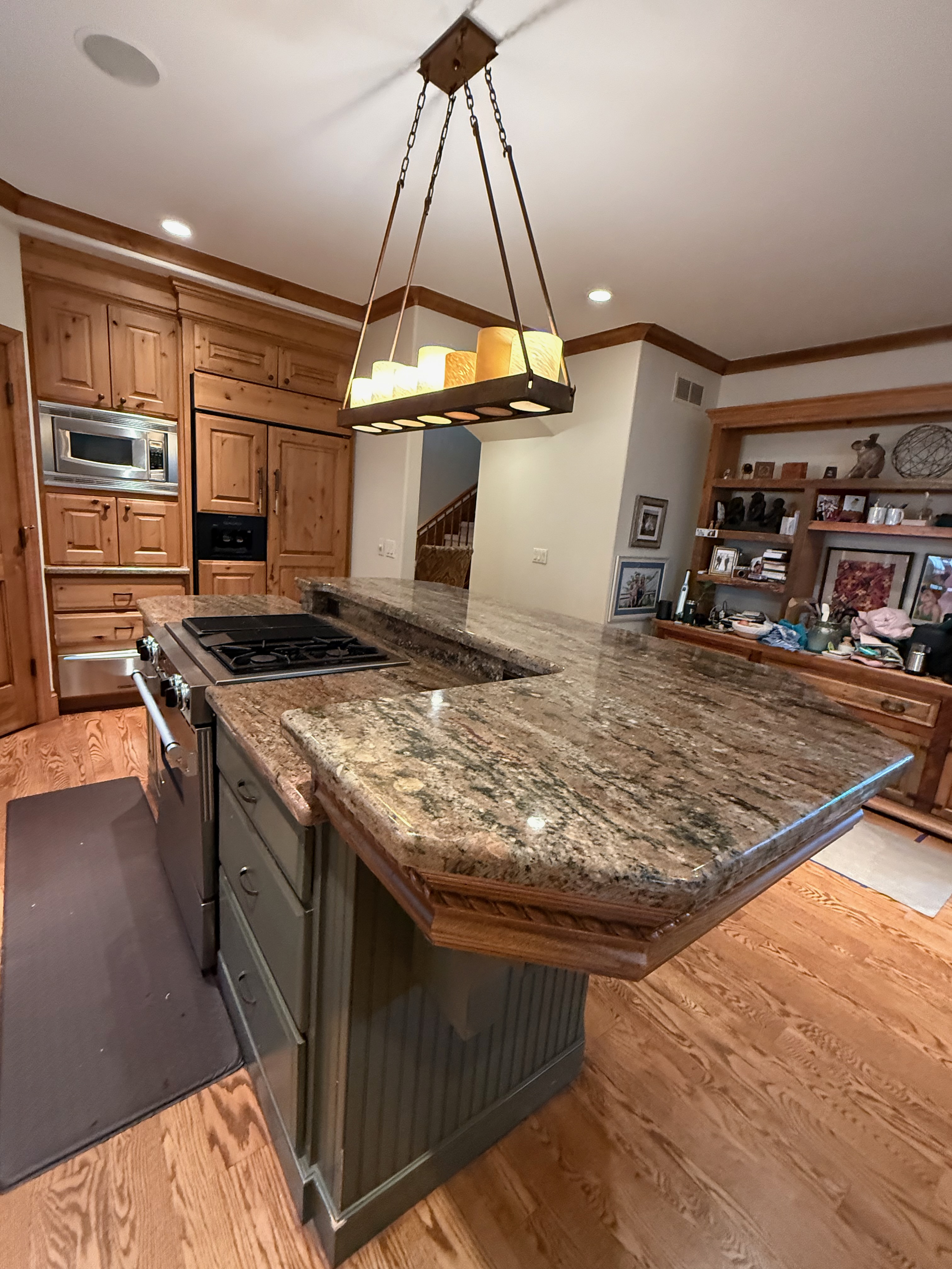 Natural Knotty Alder wood Craftsman style Kitchen cabinets made by Custom Cupboards makers of fine custom cabinetry. In excellent shape with dovetail joinery drawers. KitchenAid stainless steel appliance package with granite countertops. The island is in a contrasting earth-tone sage green finish with a beautiful wood rope molding detail and bead board surround on the back. The is a matching bathroom vanity cabinet in the natural Alder wood. The Kitchen package is available to be removed, tbd January 2026, by a licensed contractor or we have licensed contractors available to hire to remove the kitchen and move it to your home. Pricing below.