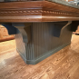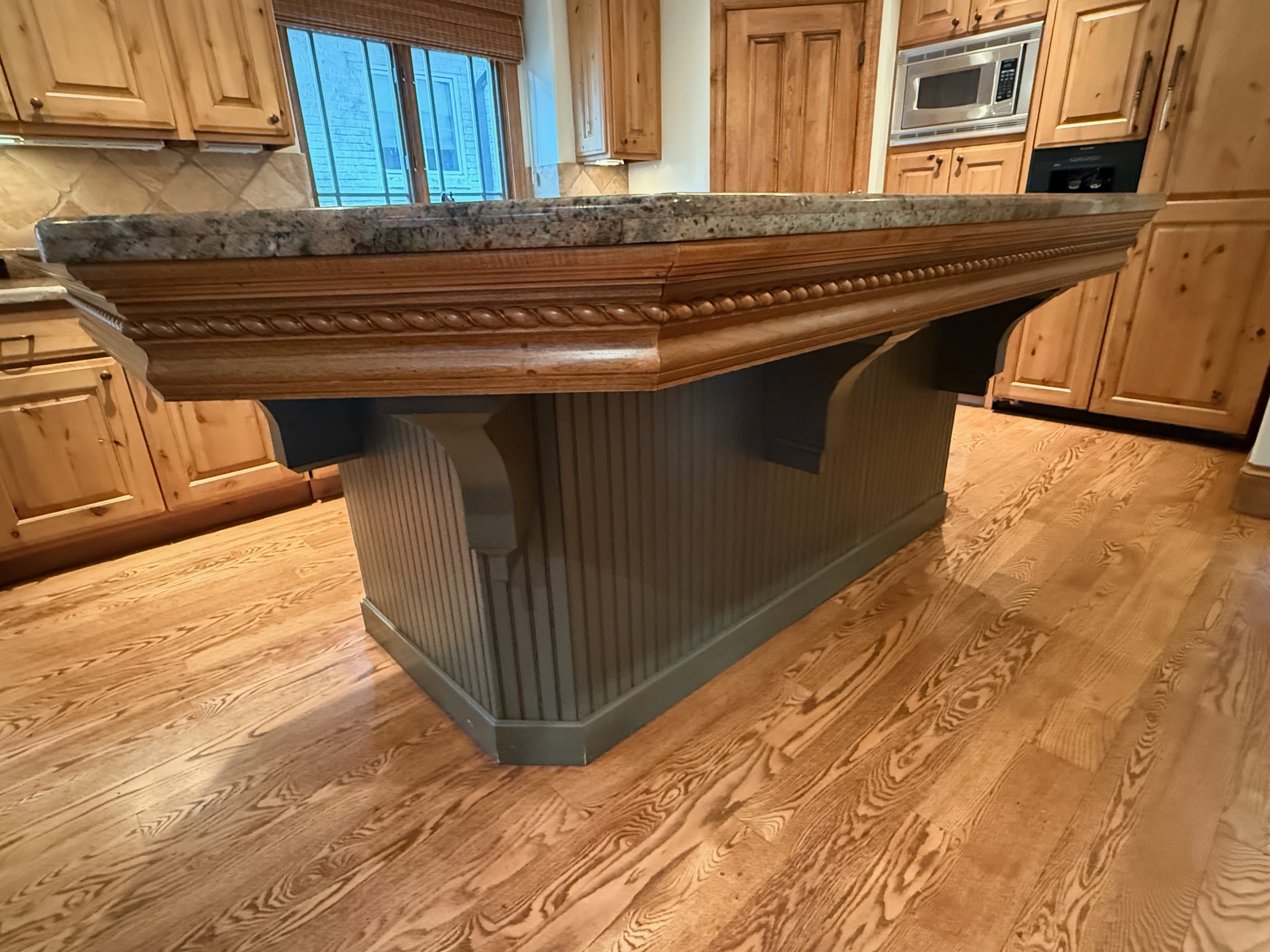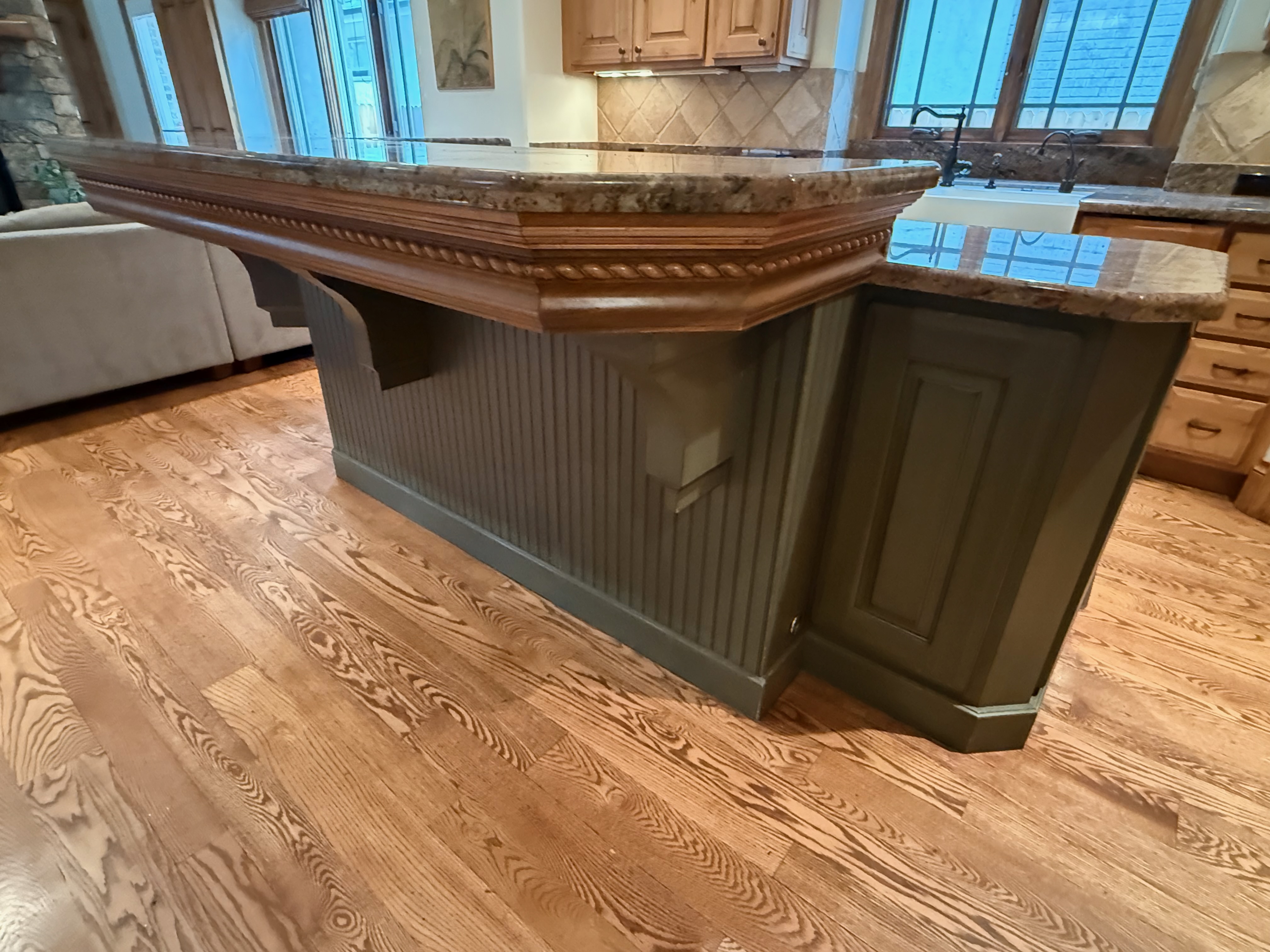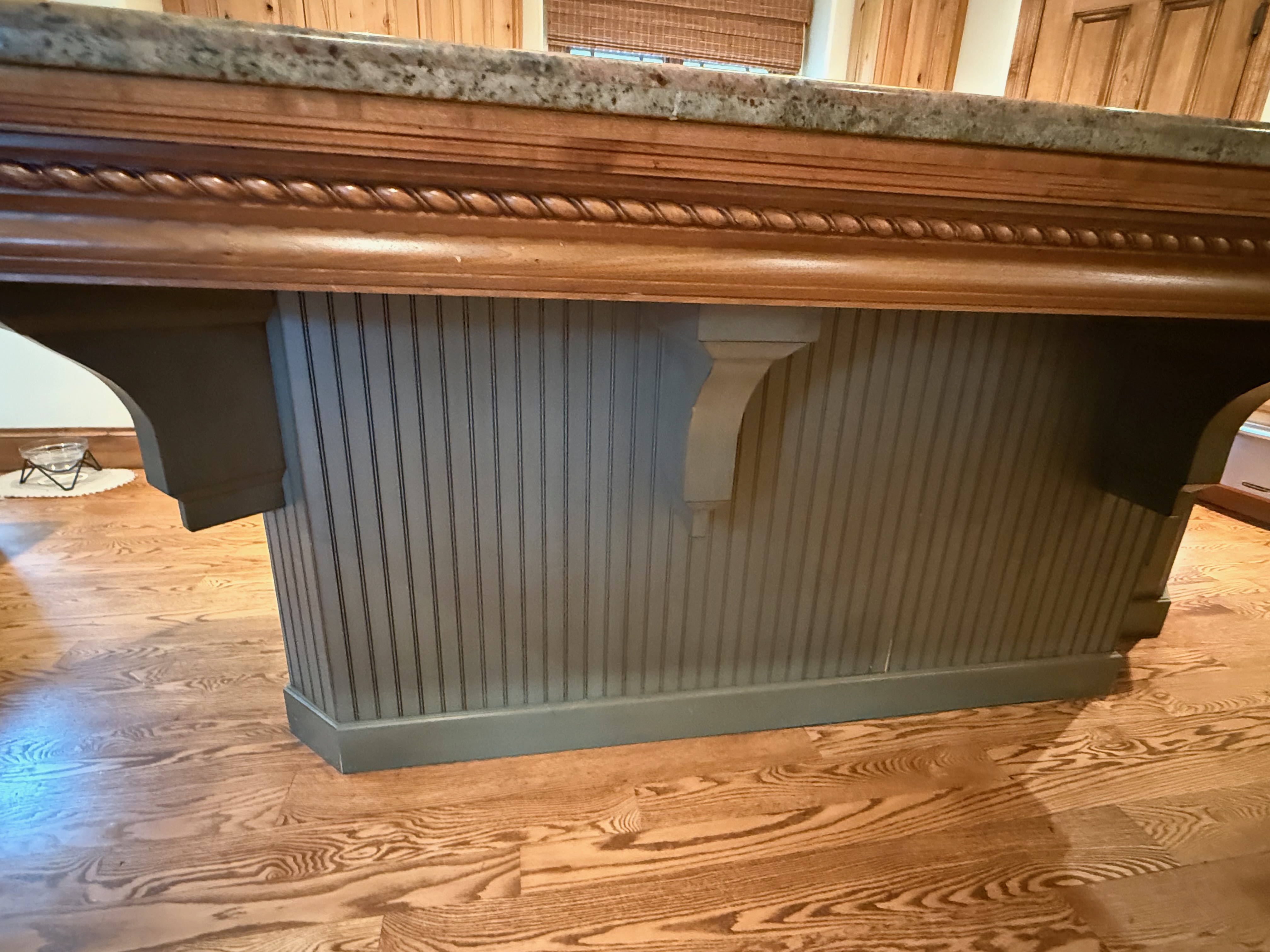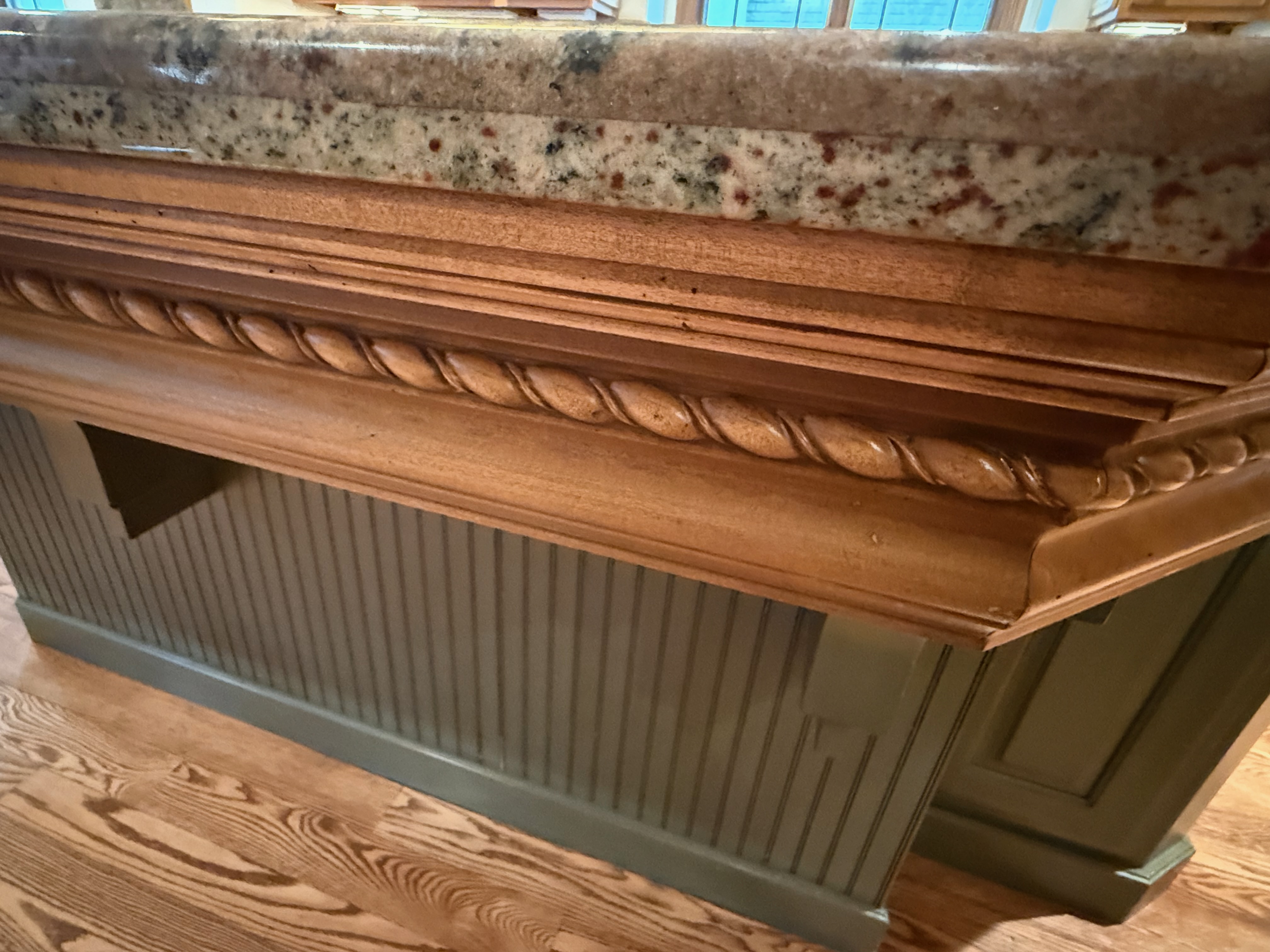 ISLAND-Contrasting jade green painted cabinets with a beautiful decorative rope molding wood detail