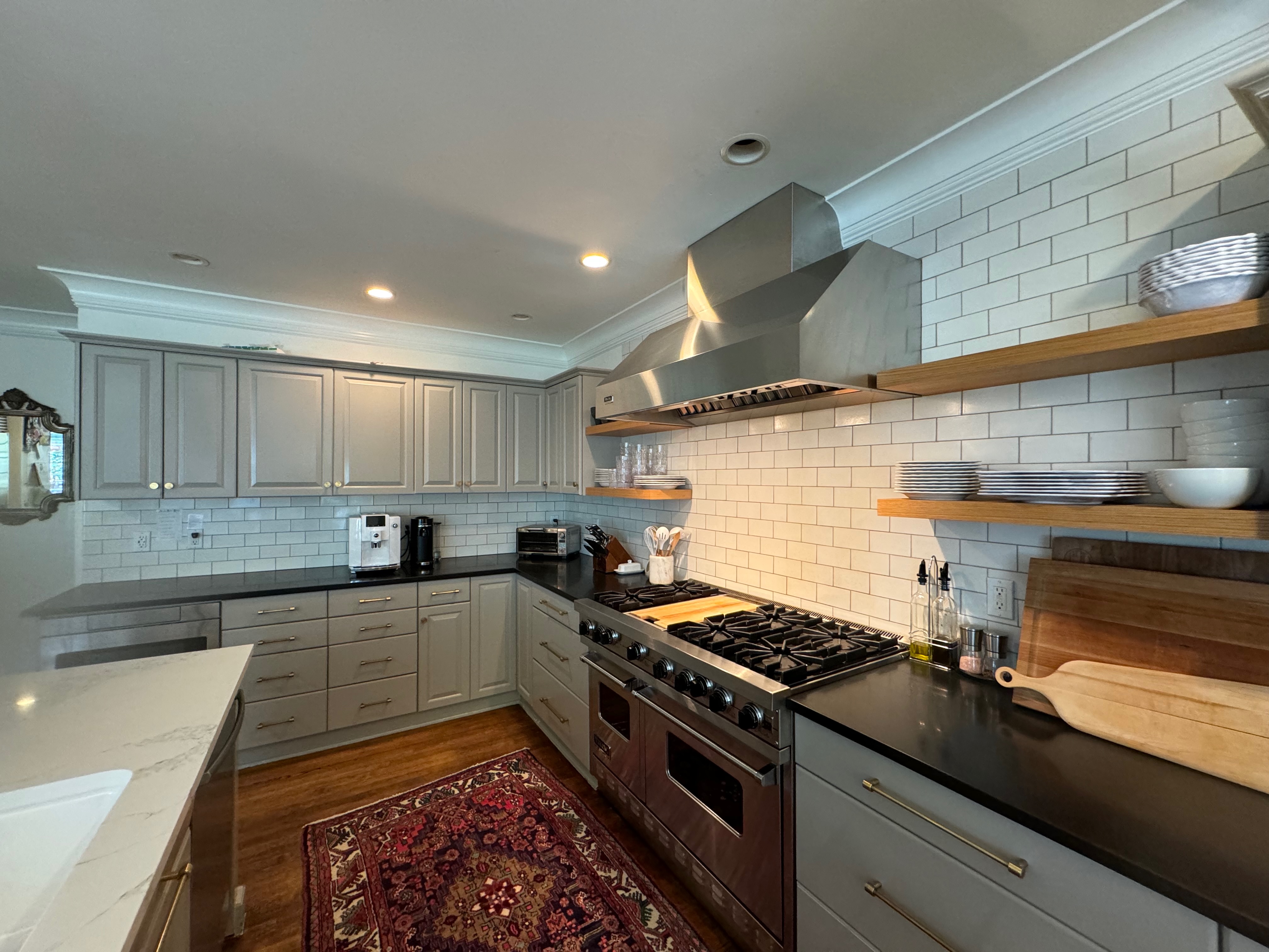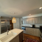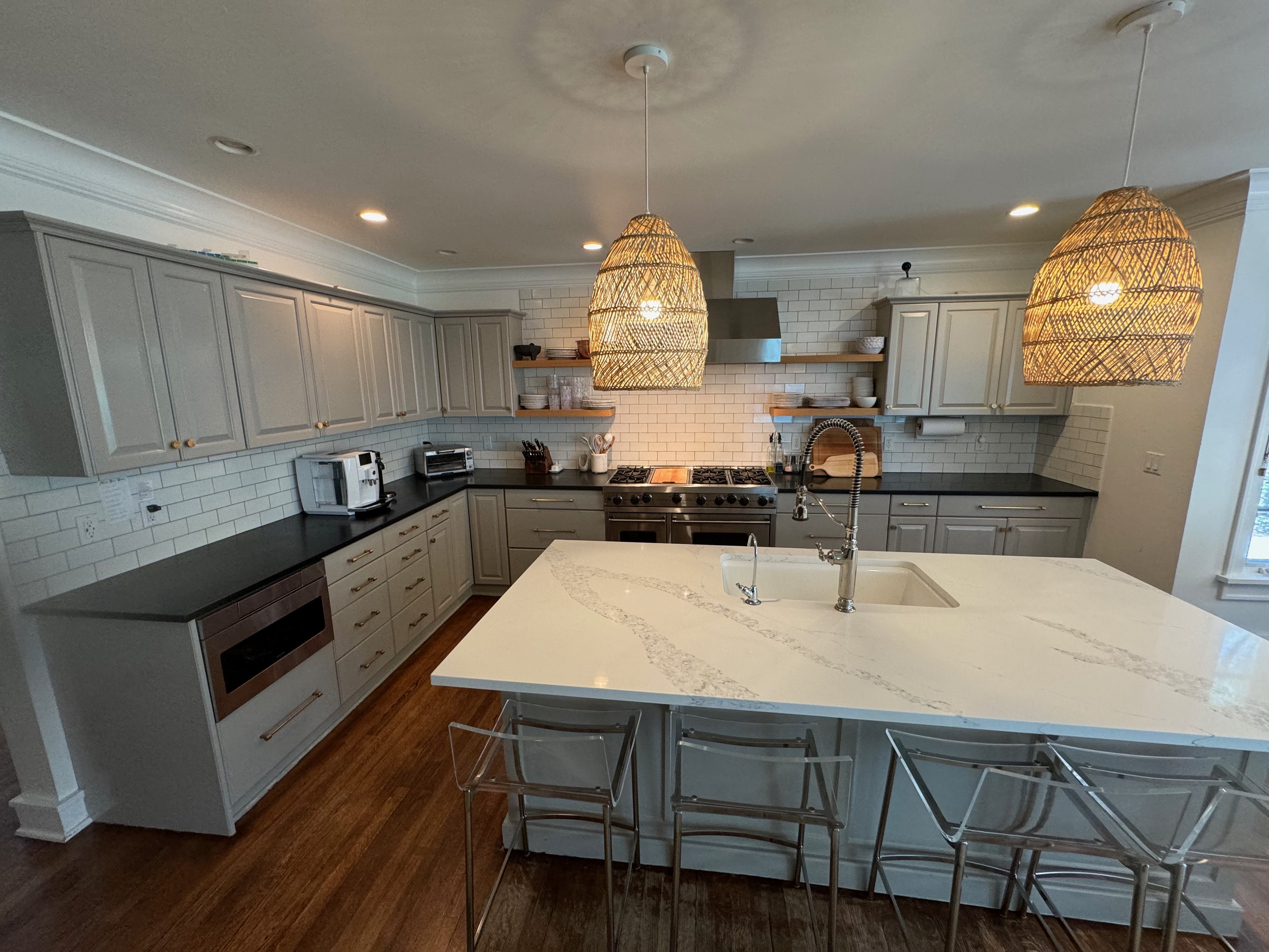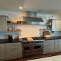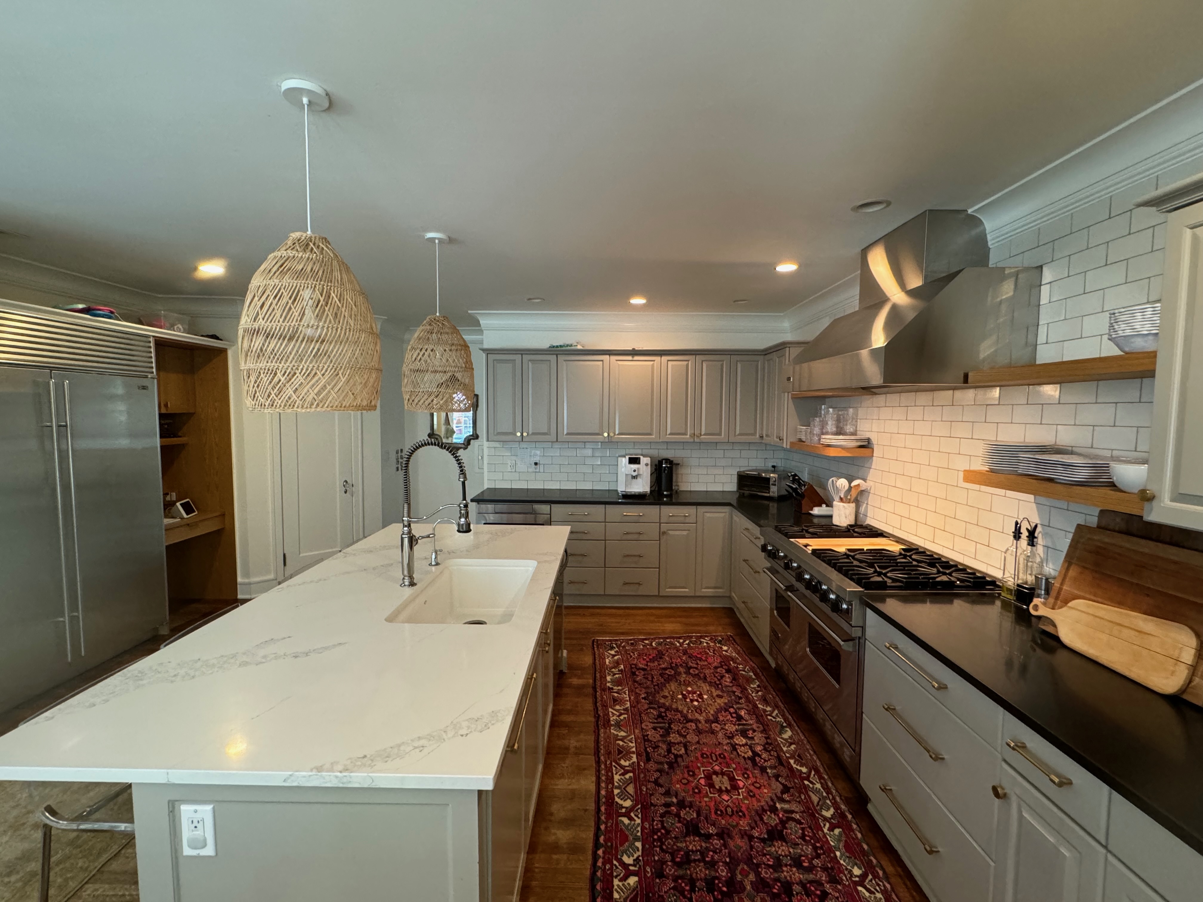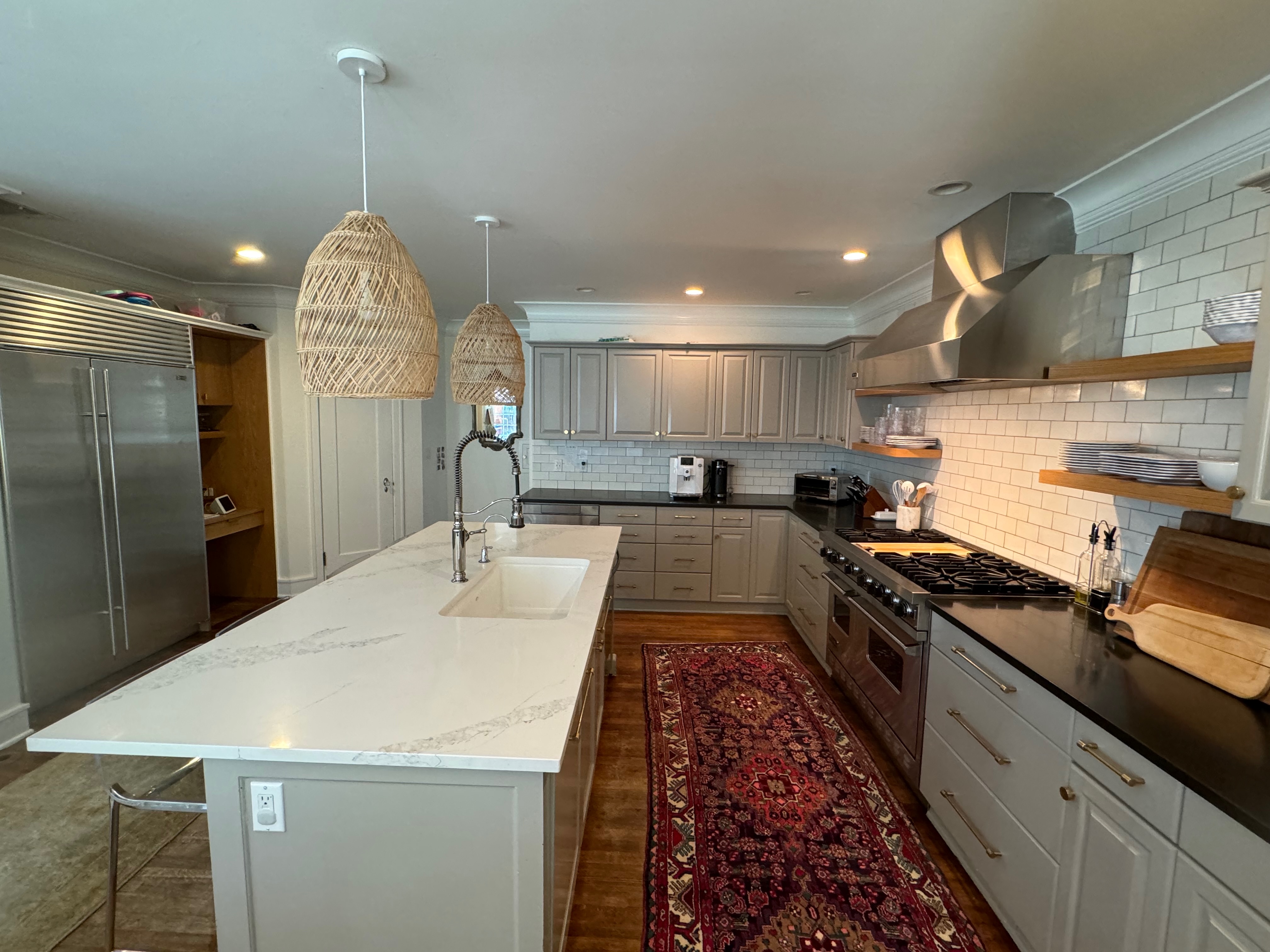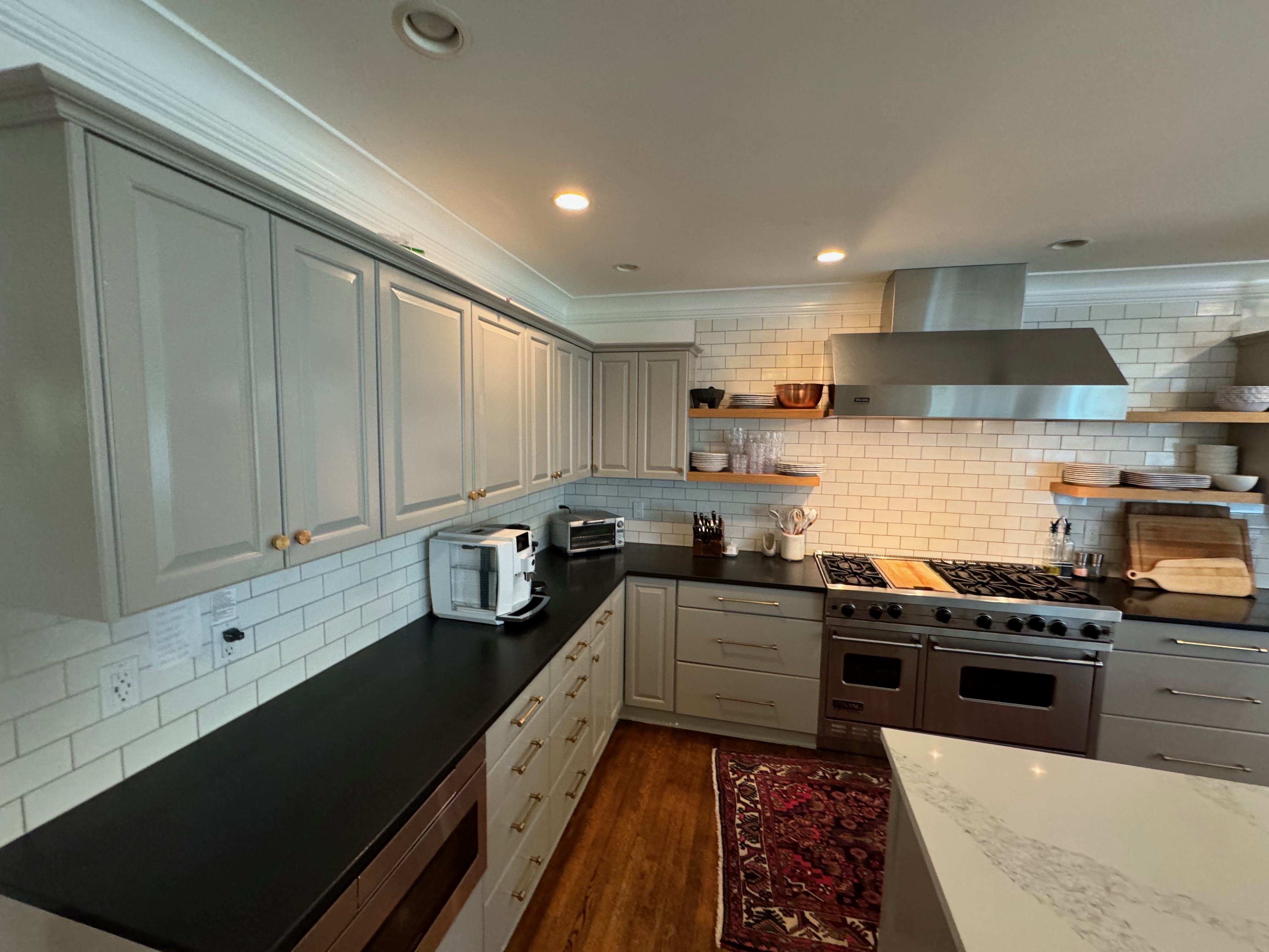 Great Deal! Nice Pale Gray painted Kitchen Cabinets with stylish brass door hardware! This Kitchen Package includes a 48" Viking Range + Viking Hood along with a Stainless Steel Sub-Zero Refrigerator. The is also a beautiful new Quartz island countertop! Must go by Labor Day weekend 8/24. The kitchen is available to be removed by a qualified buyer or there are licensed contractors available to hire. Price for the kitchen package below.
