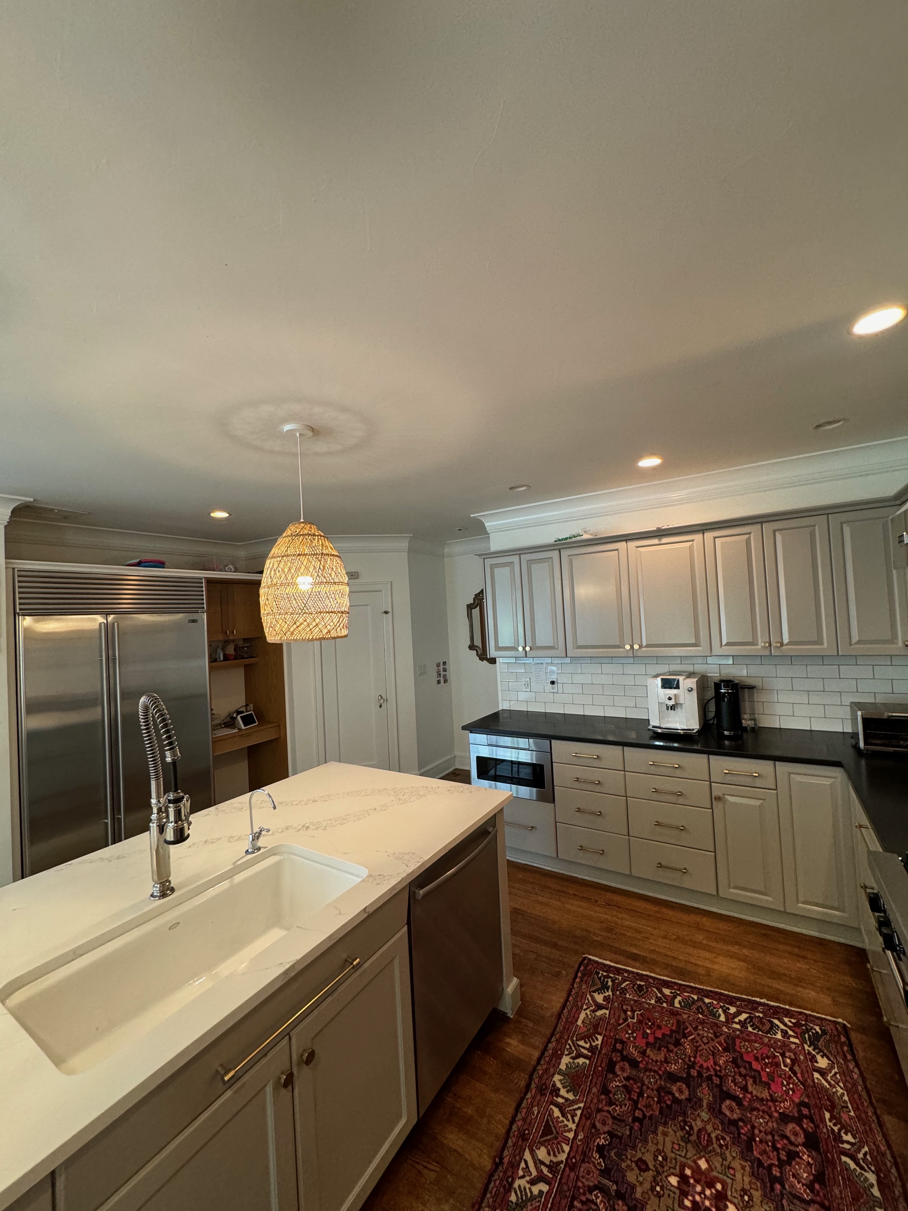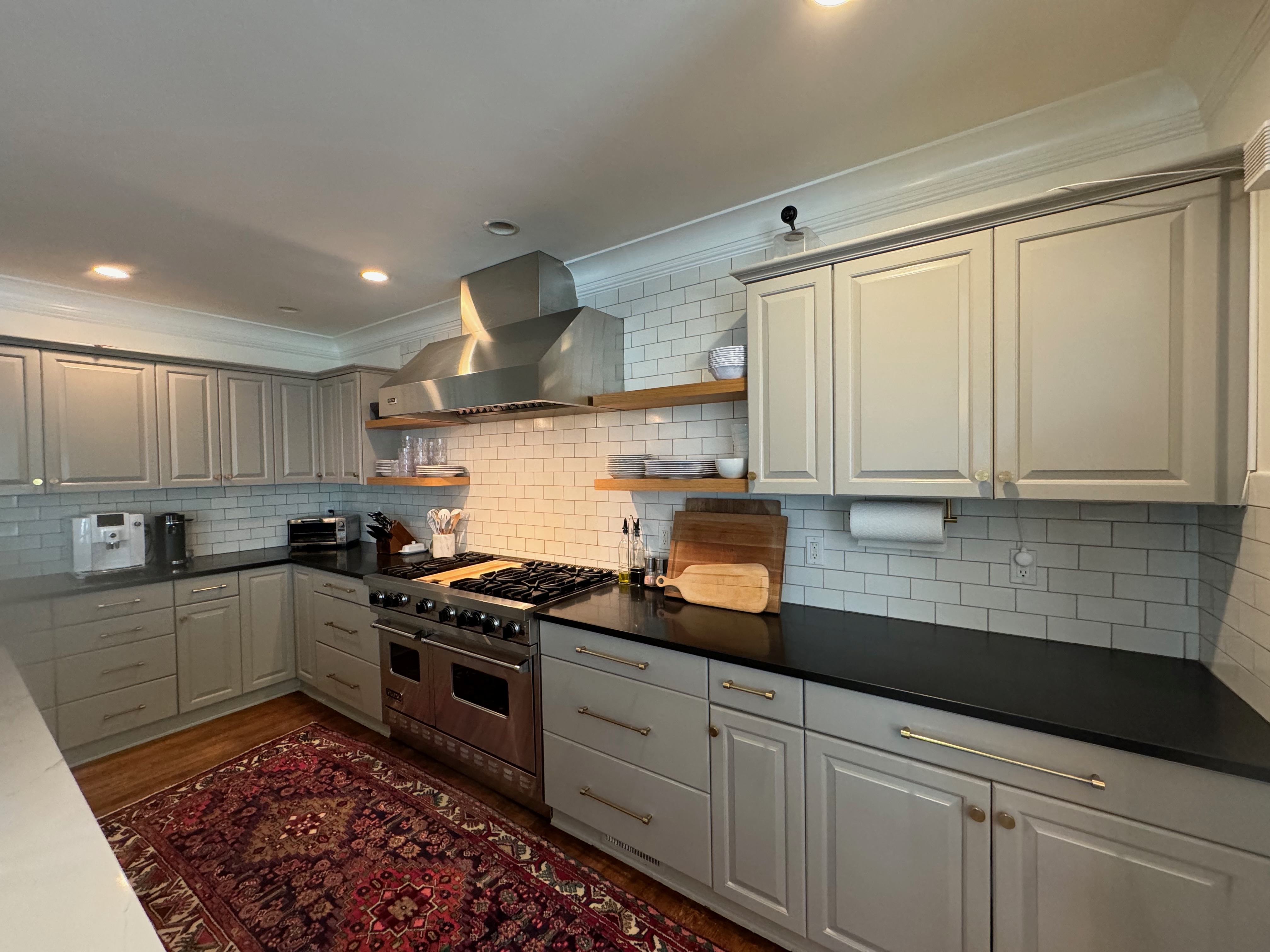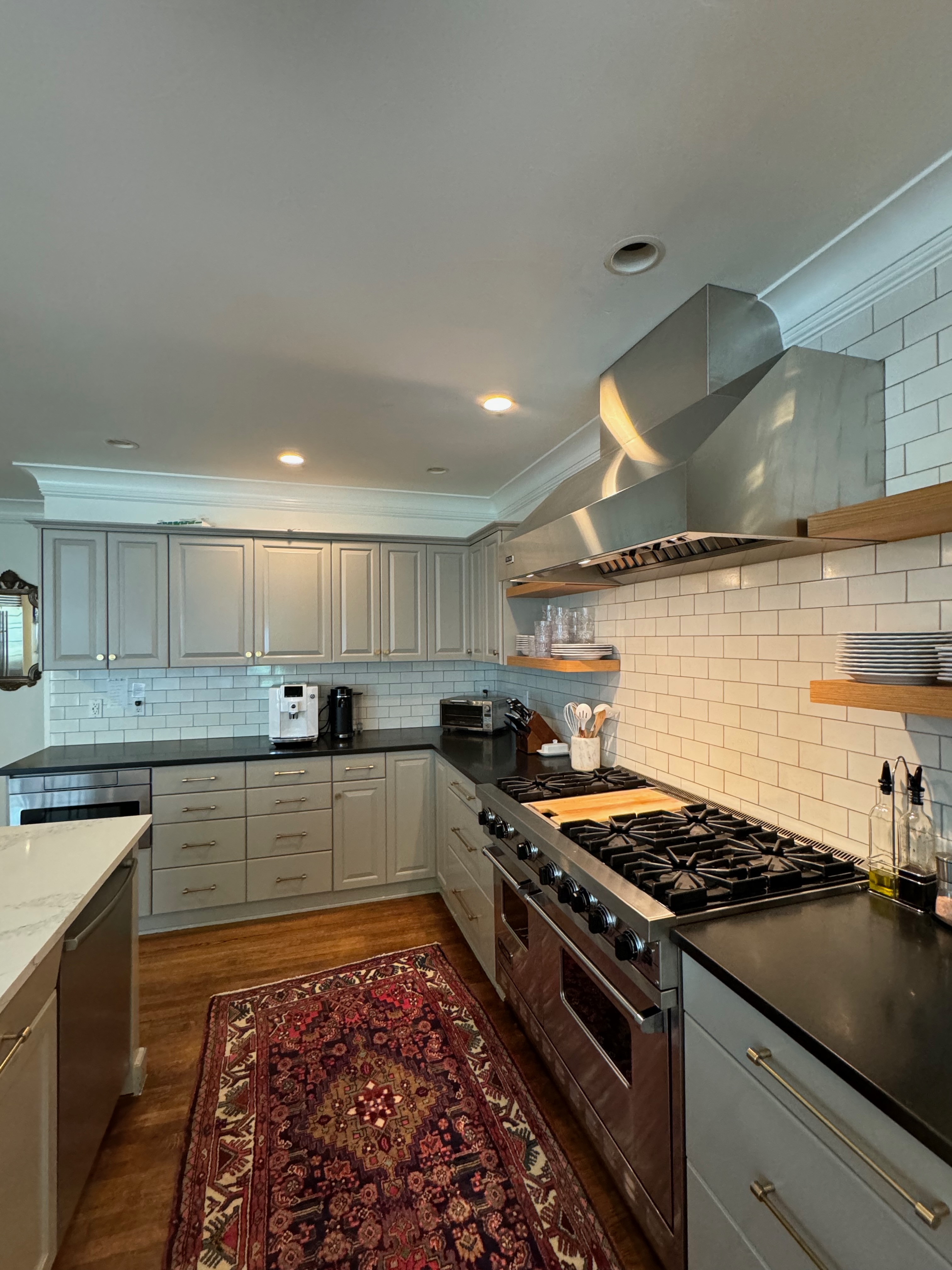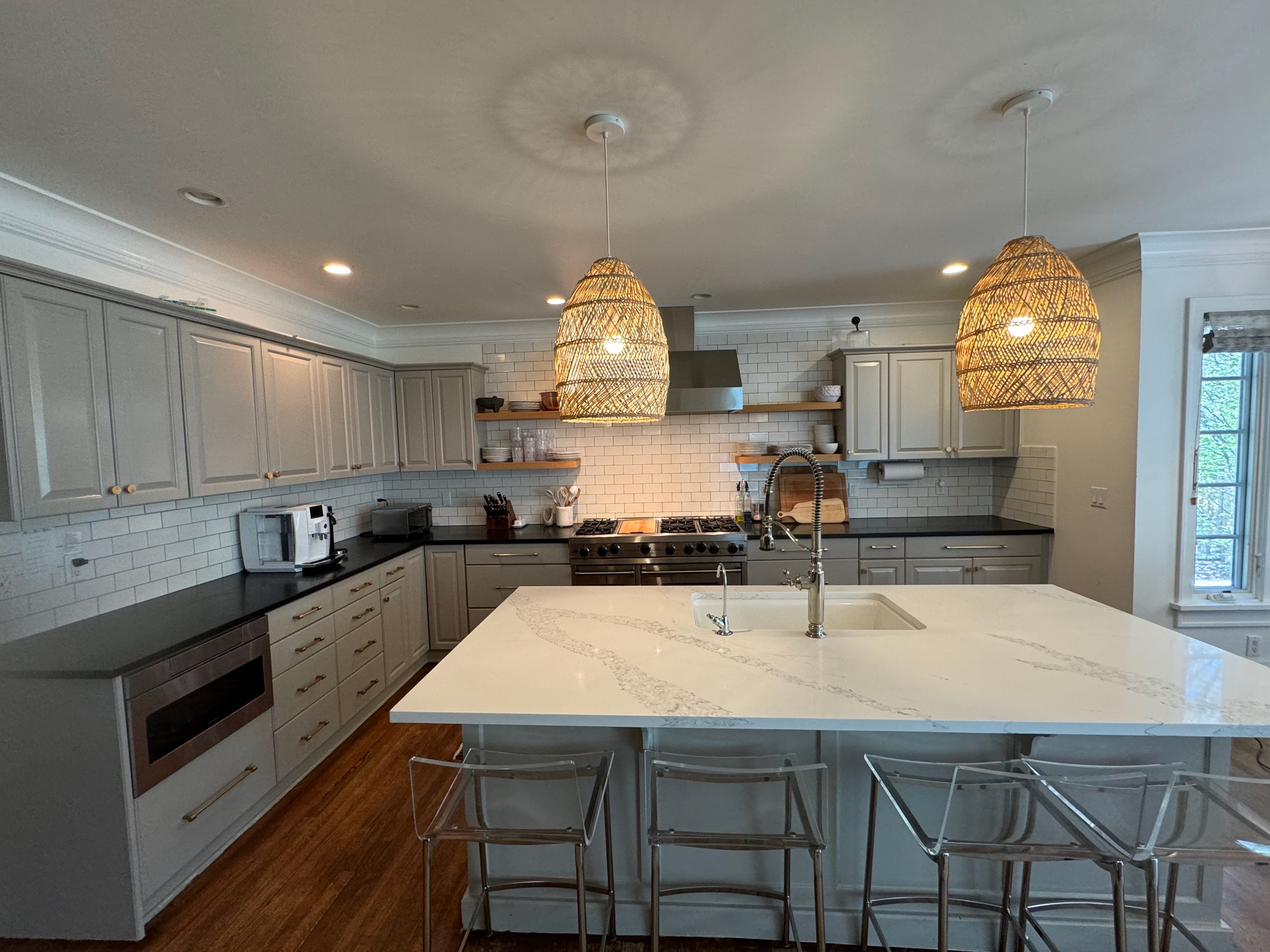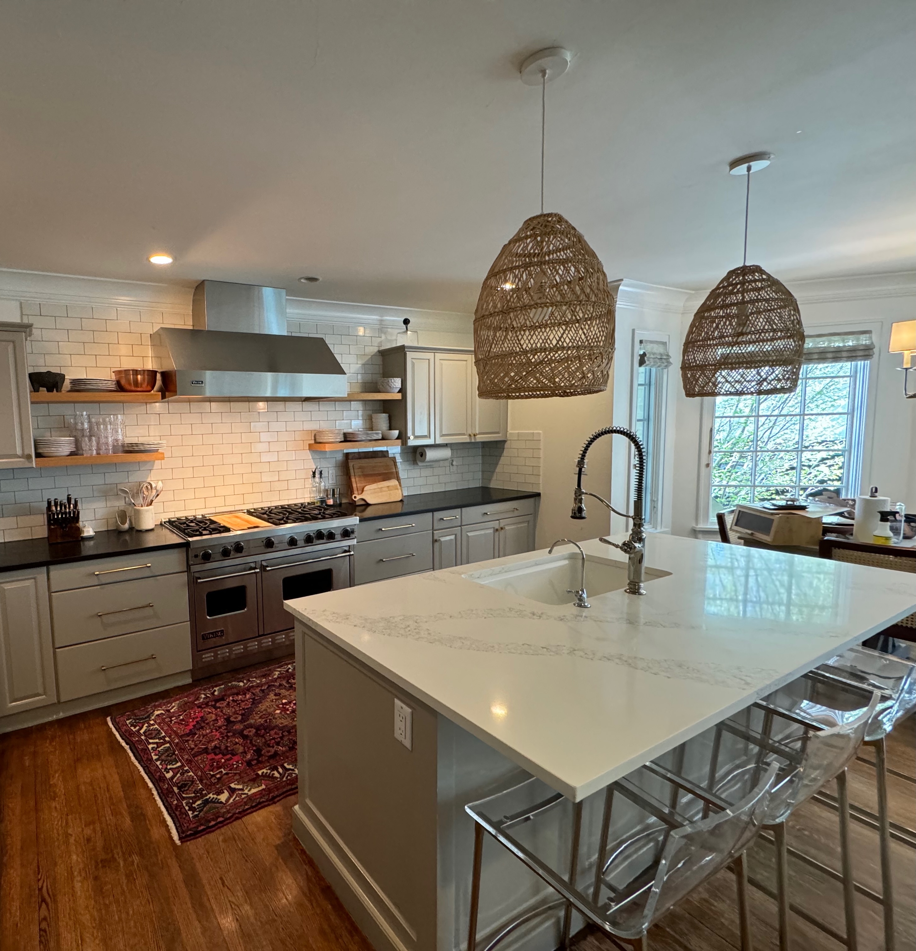 Great Deal! Nice Pale Gray painted Kitchen Cabinets with stylish brass door hardware! This Kitchen Package includes a 48" Viking Range + Viking Hood along with a Stainless Steel Sub-Zero Refrigerator. The is also a beautiful new Quartz island countertop! Must go by Labor Day weekend 8/24. The kitchen is available to be removed by a qualified buyer or there are licensed contractors available to hire. Price for the kitchen package below.