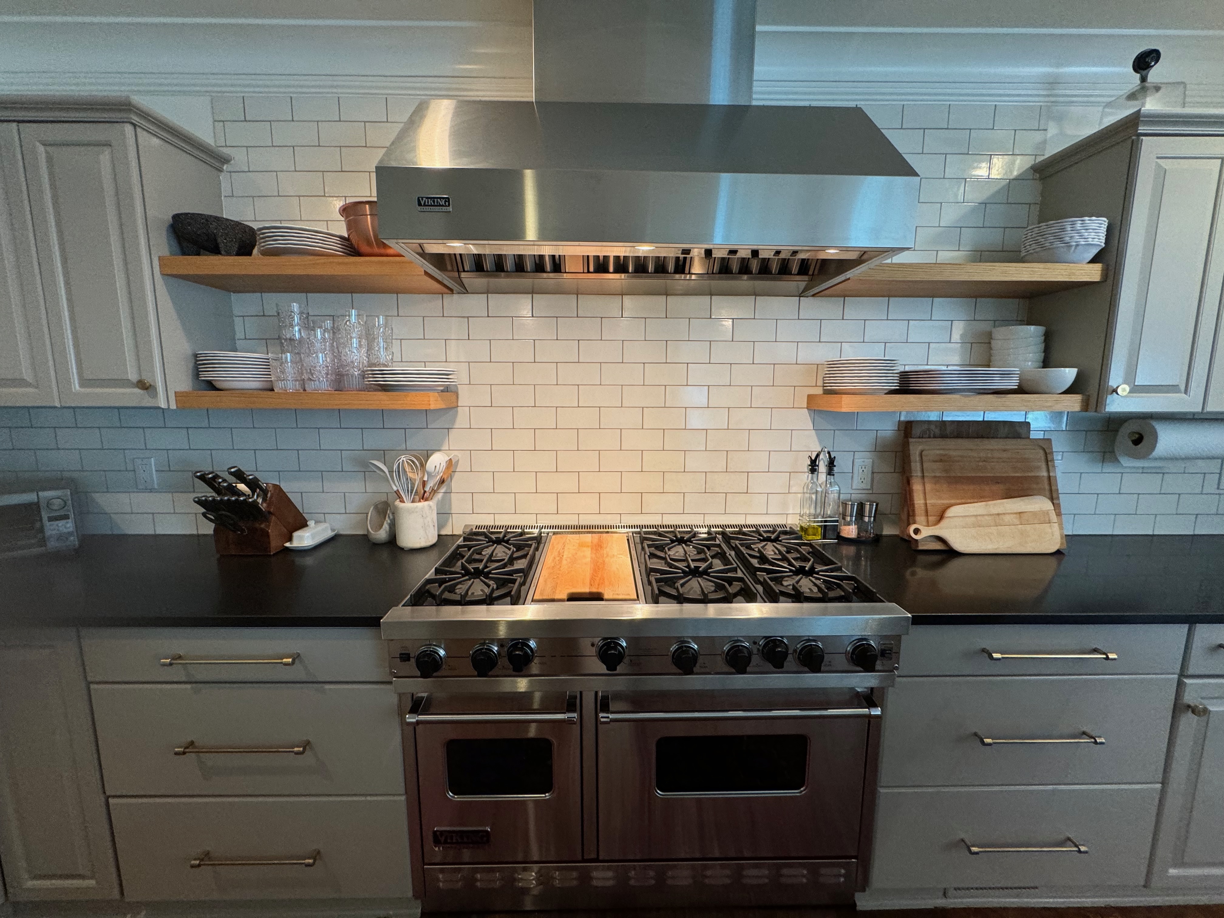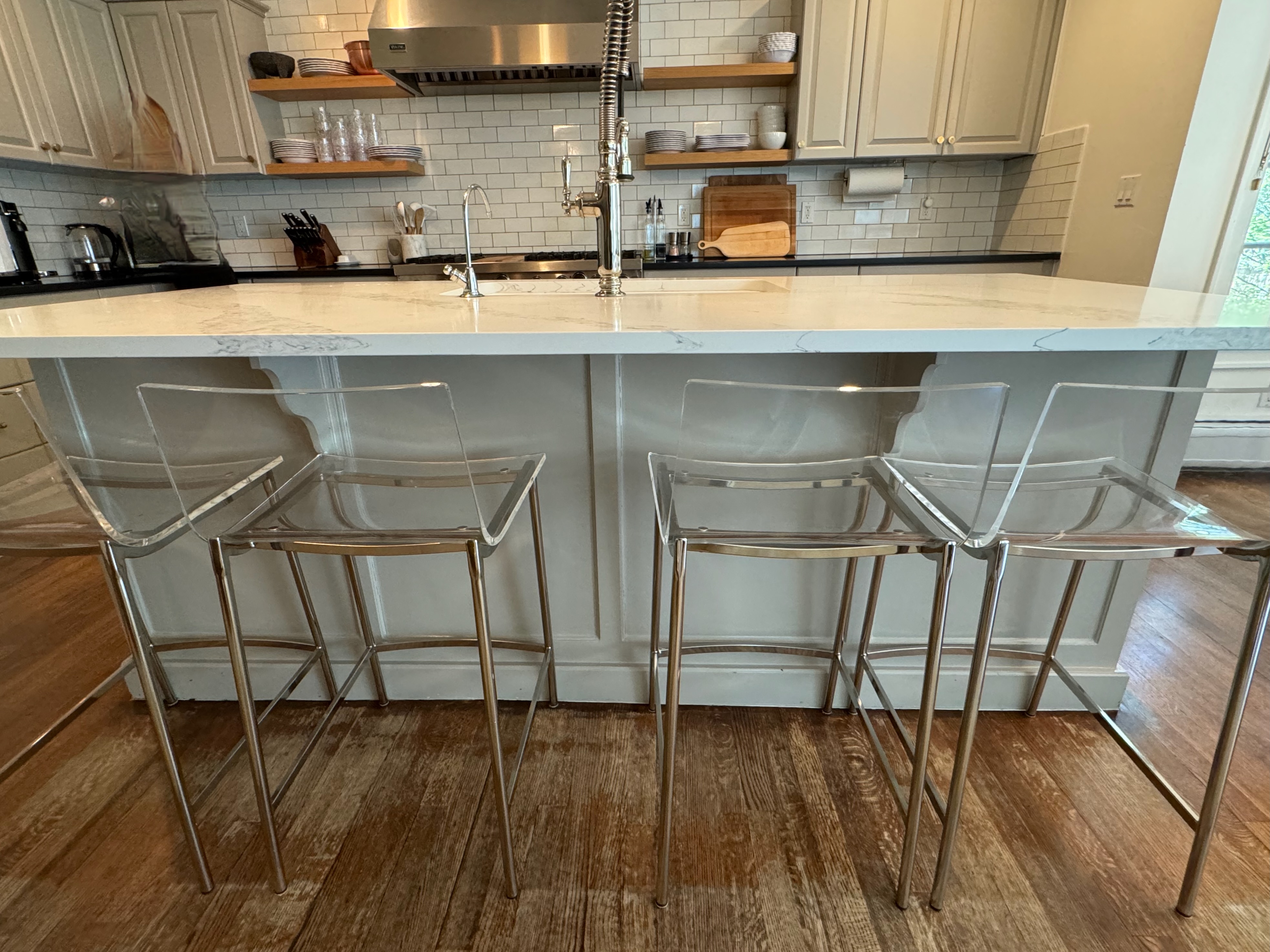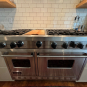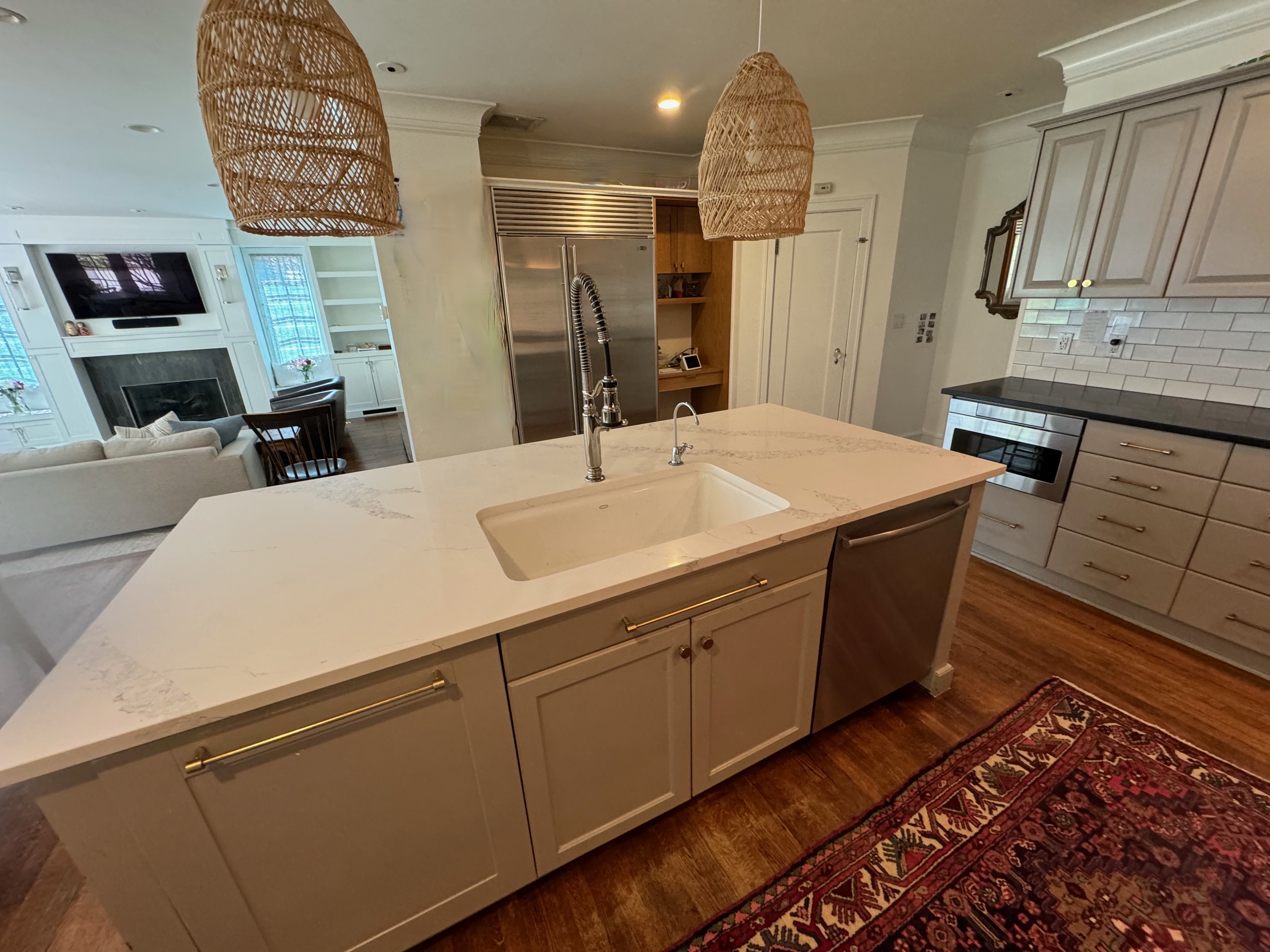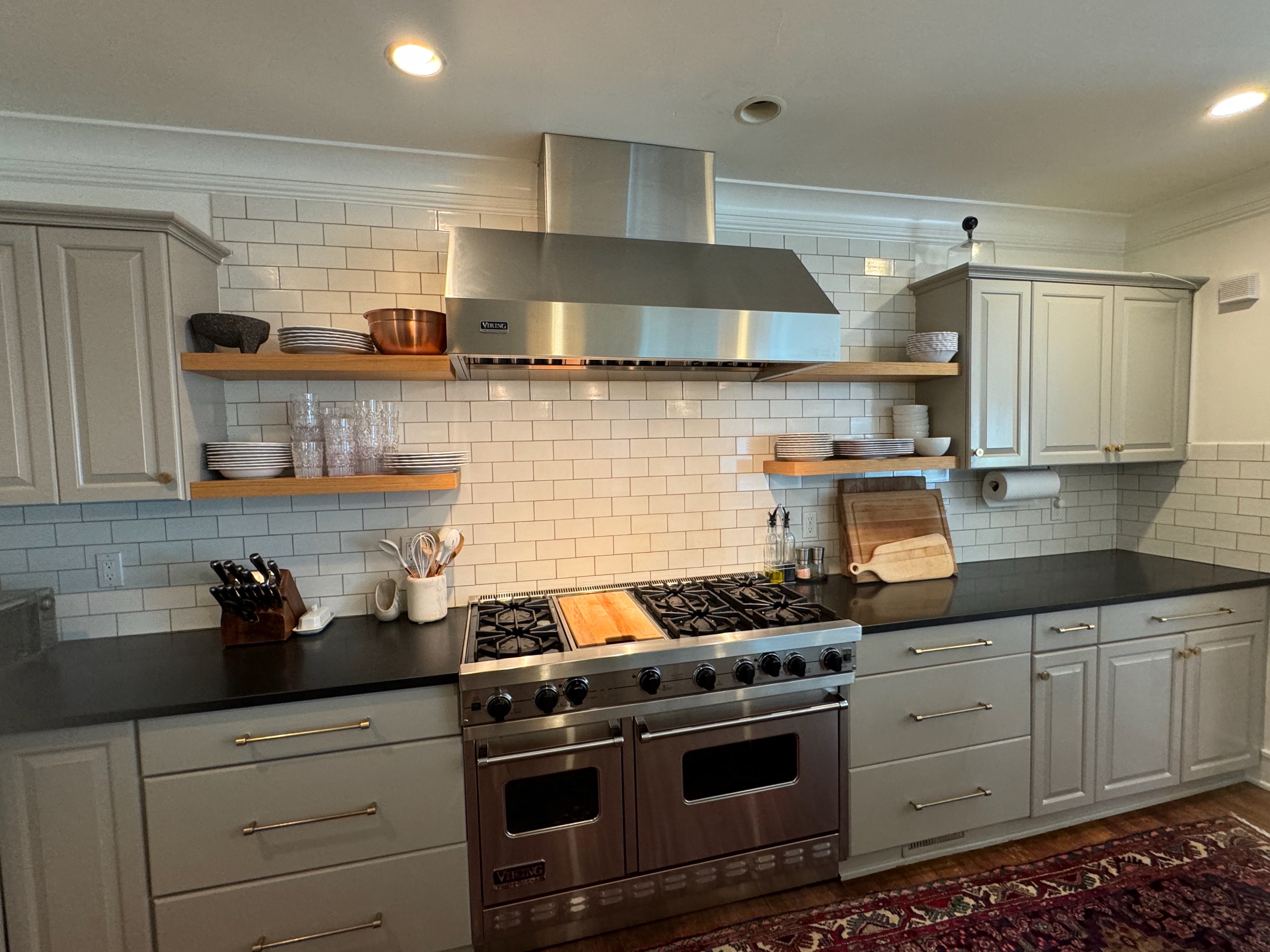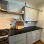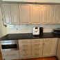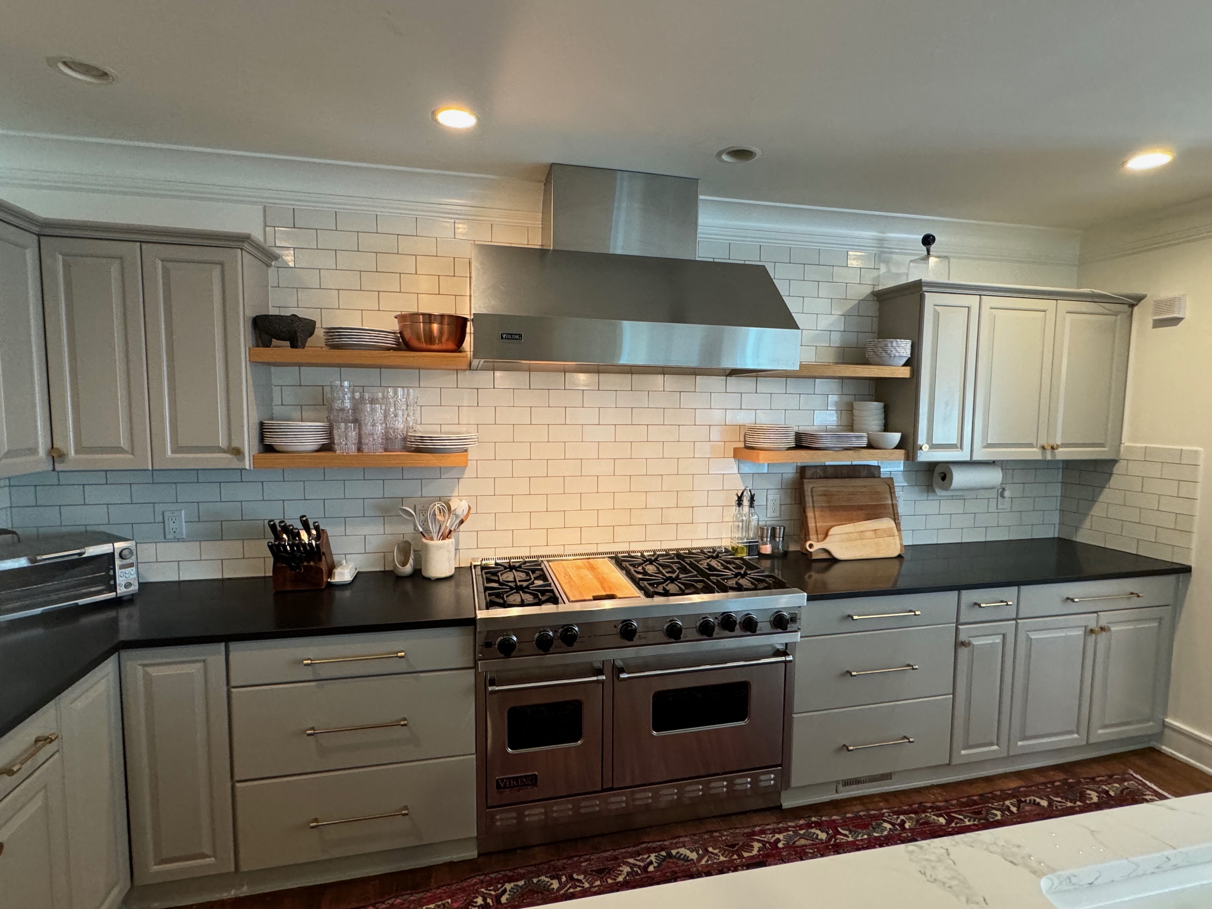 Great Deal! Nice Pale Gray painted Kitchen Cabinets with stylish brass door hardware! This Kitchen Package includes a 48" Viking Range + Viking Hood along with a Stainless Steel Sub-Zero Refrigerator. The is also a beautiful new Quartz island countertop! Must go by Labor Day weekend 8/24. The kitchen is available to be removed by a qualified buyer or there are licensed contractors available to hire. Price for the kitchen package below.