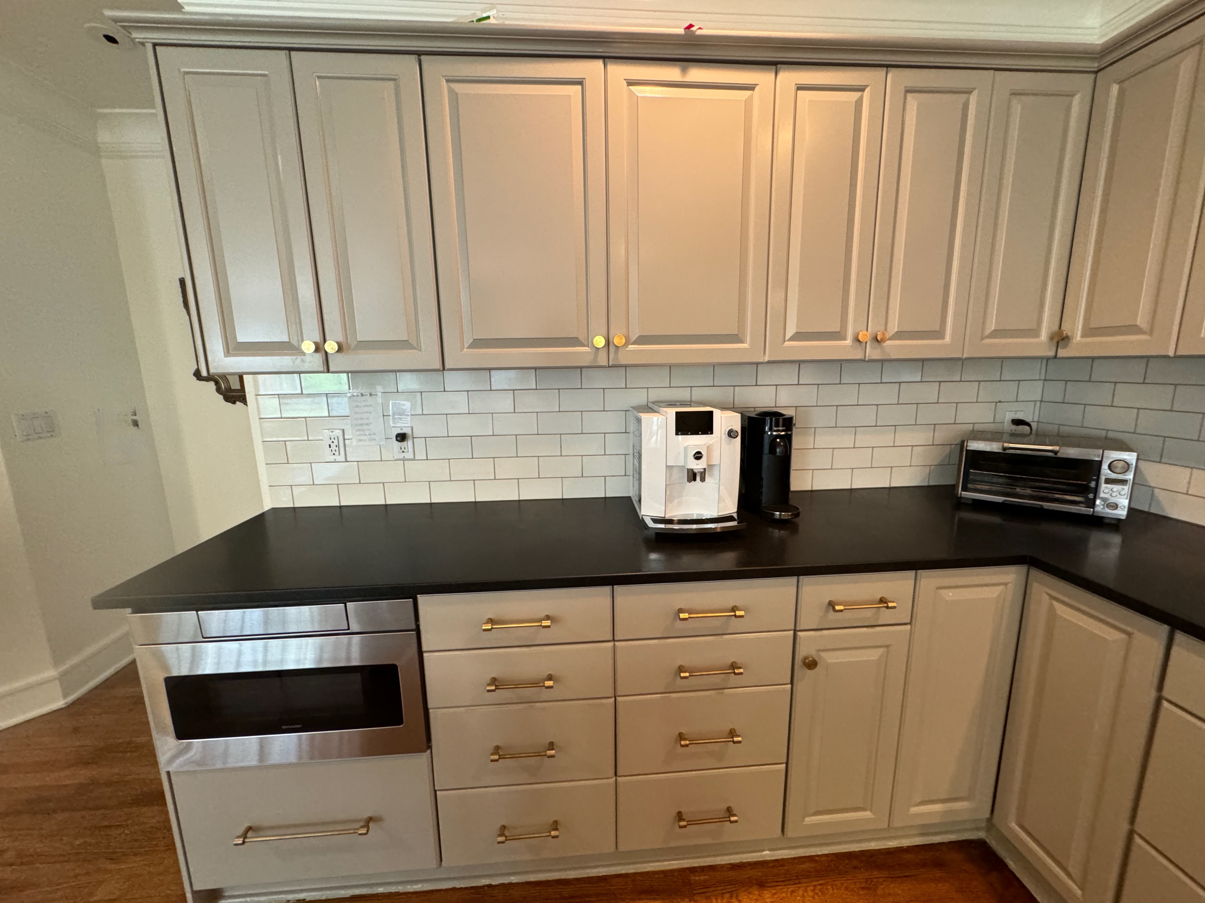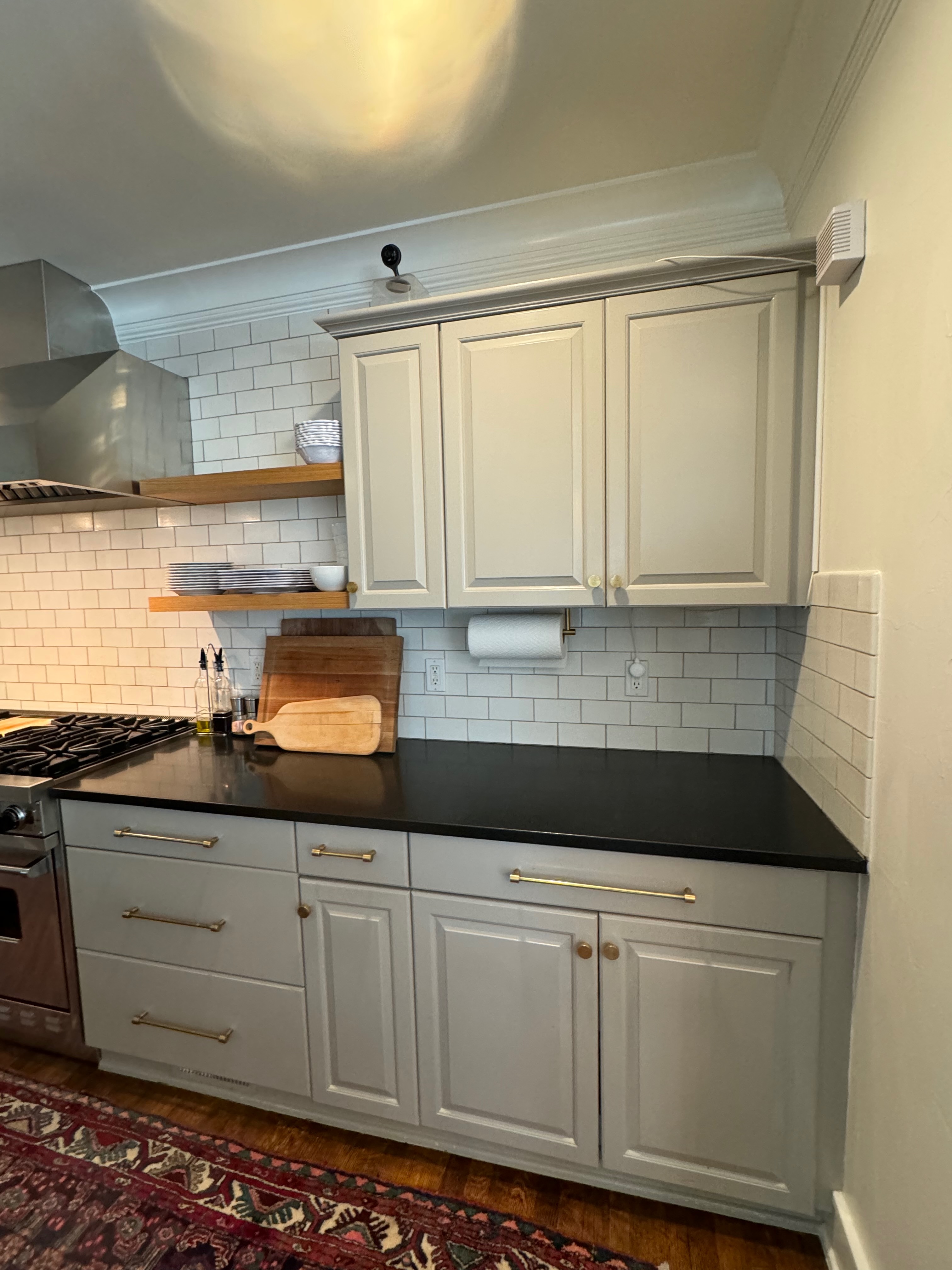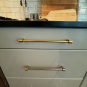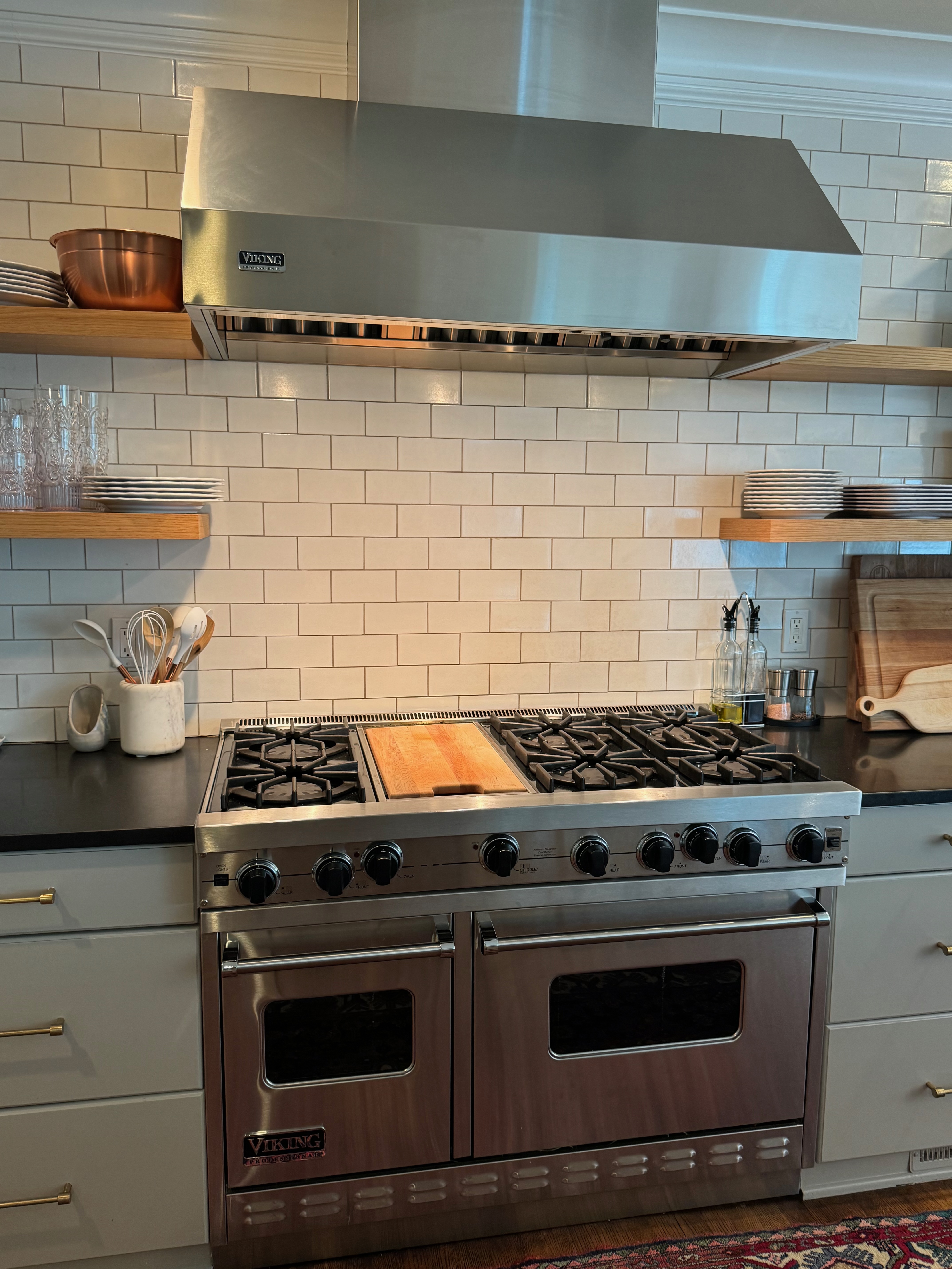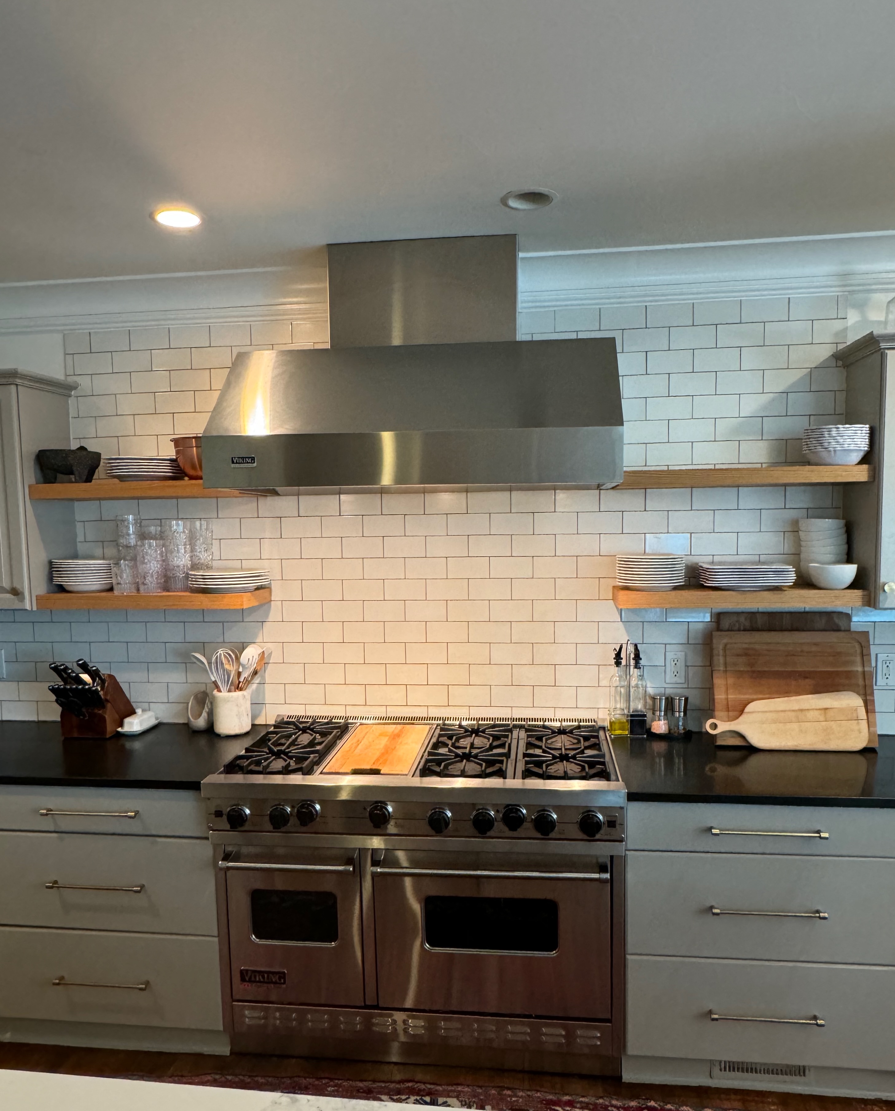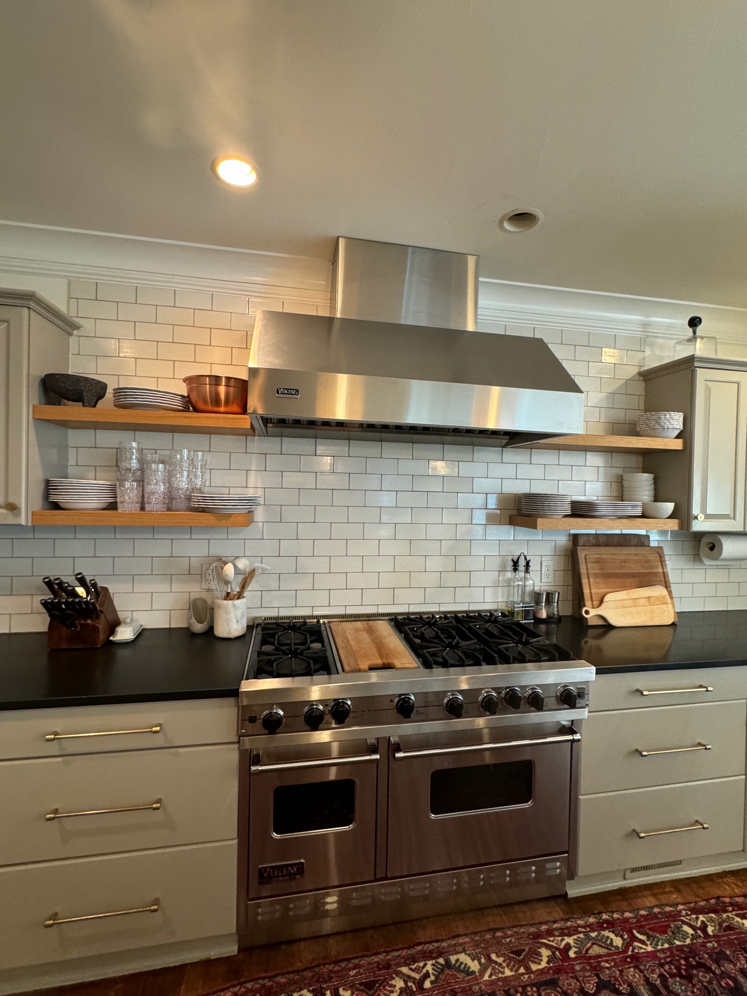 Great Deal! Nice Pale Gray painted Kitchen Cabinets with stylish brass door hardware! This Kitchen Package includes a 48" Viking Range + Viking Hood along with a Stainless Steel Sub-Zero Refrigerator. The is also a beautiful new Quartz island countertop! Must go by Labor Day weekend 8/24. The kitchen is available to be removed by a qualified buyer or there are licensed contractors available to hire. Price for the kitchen package below.