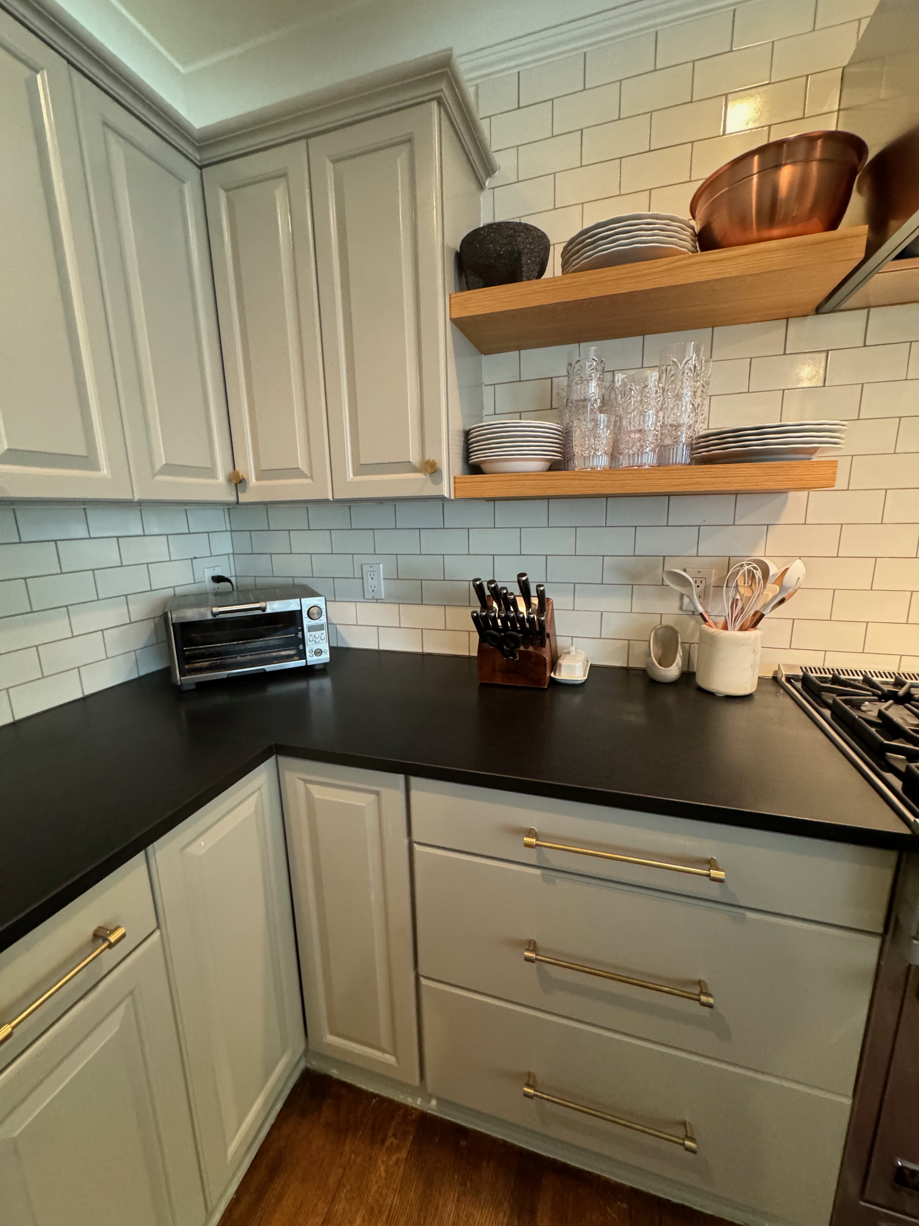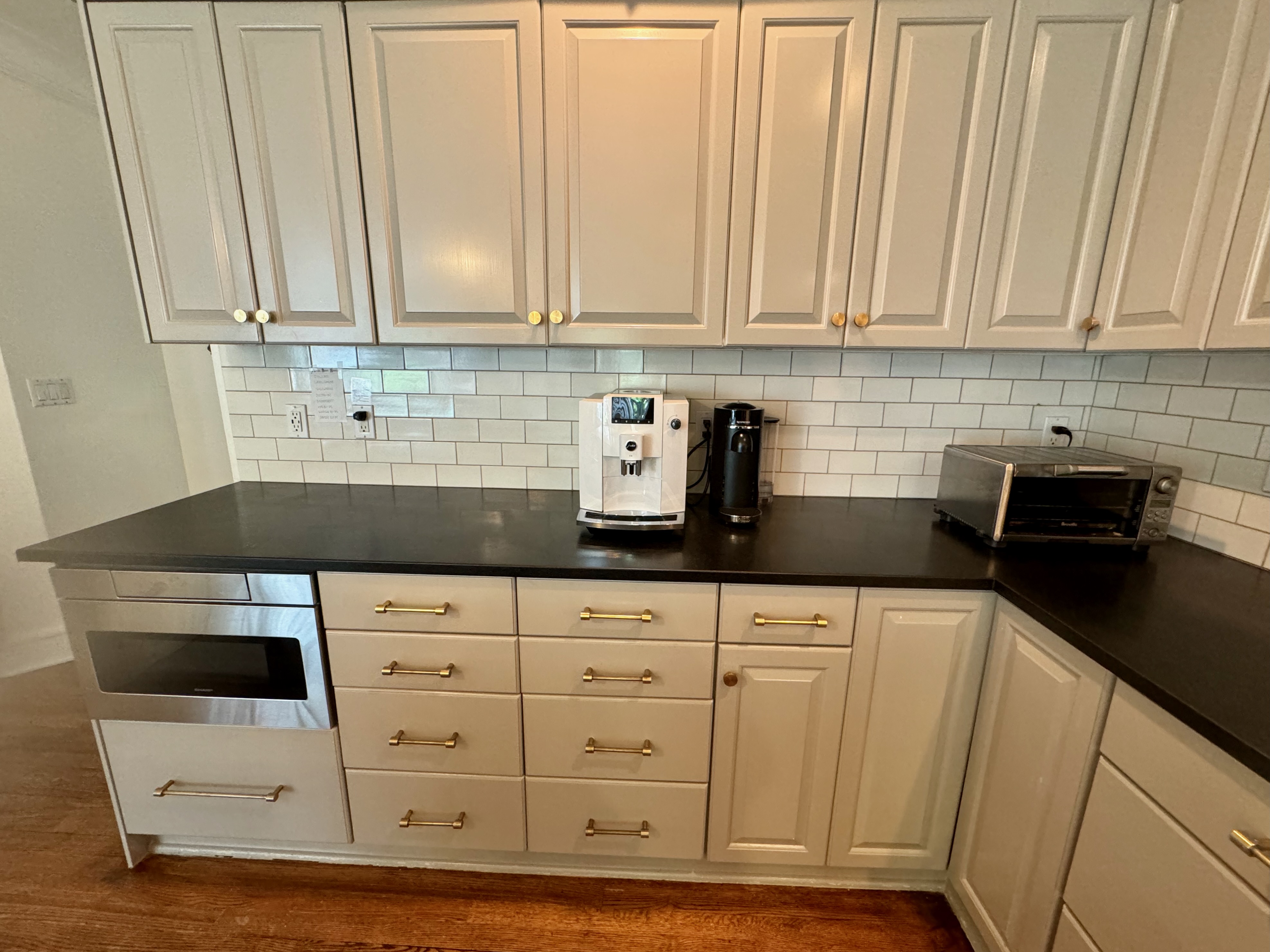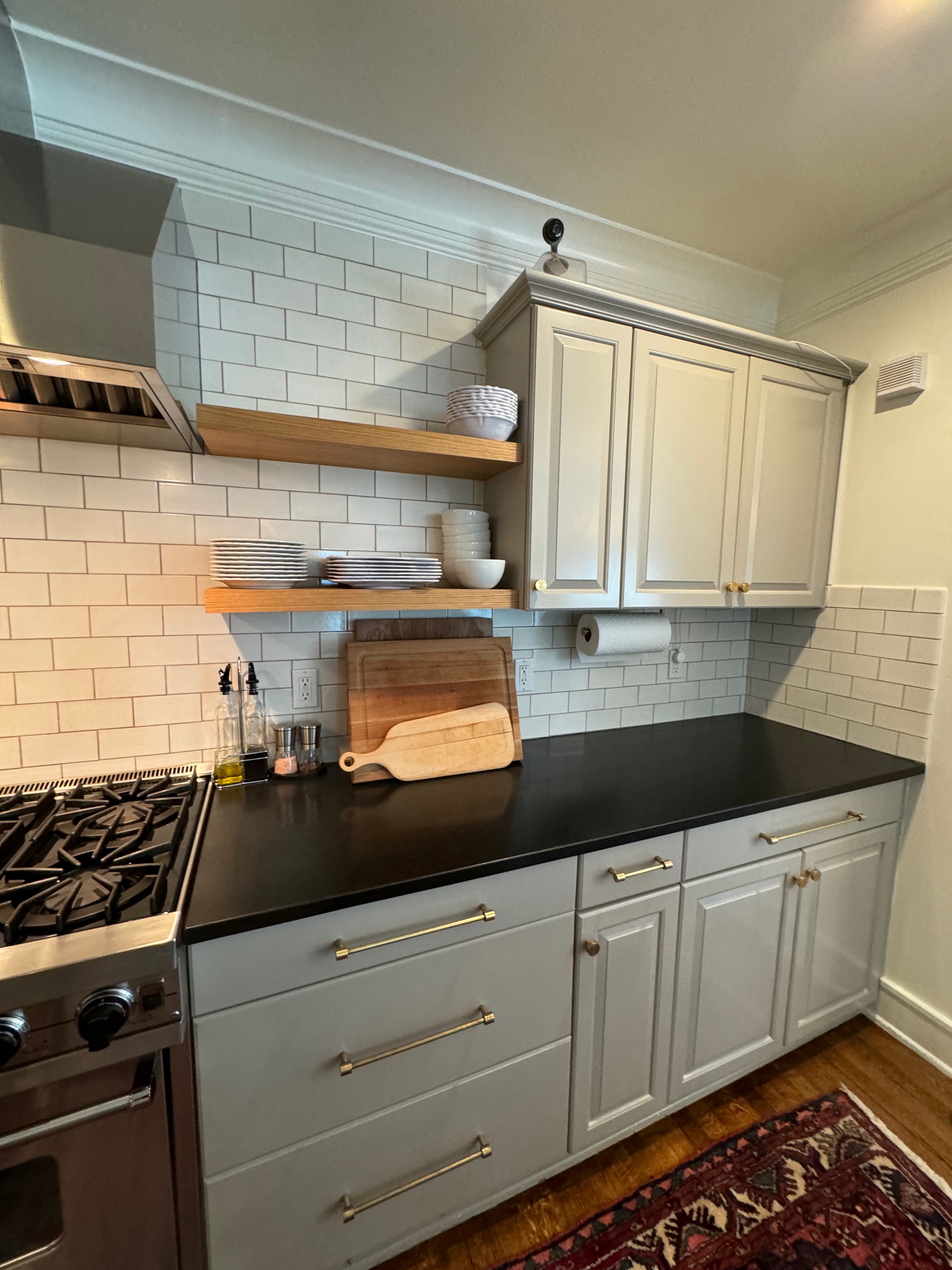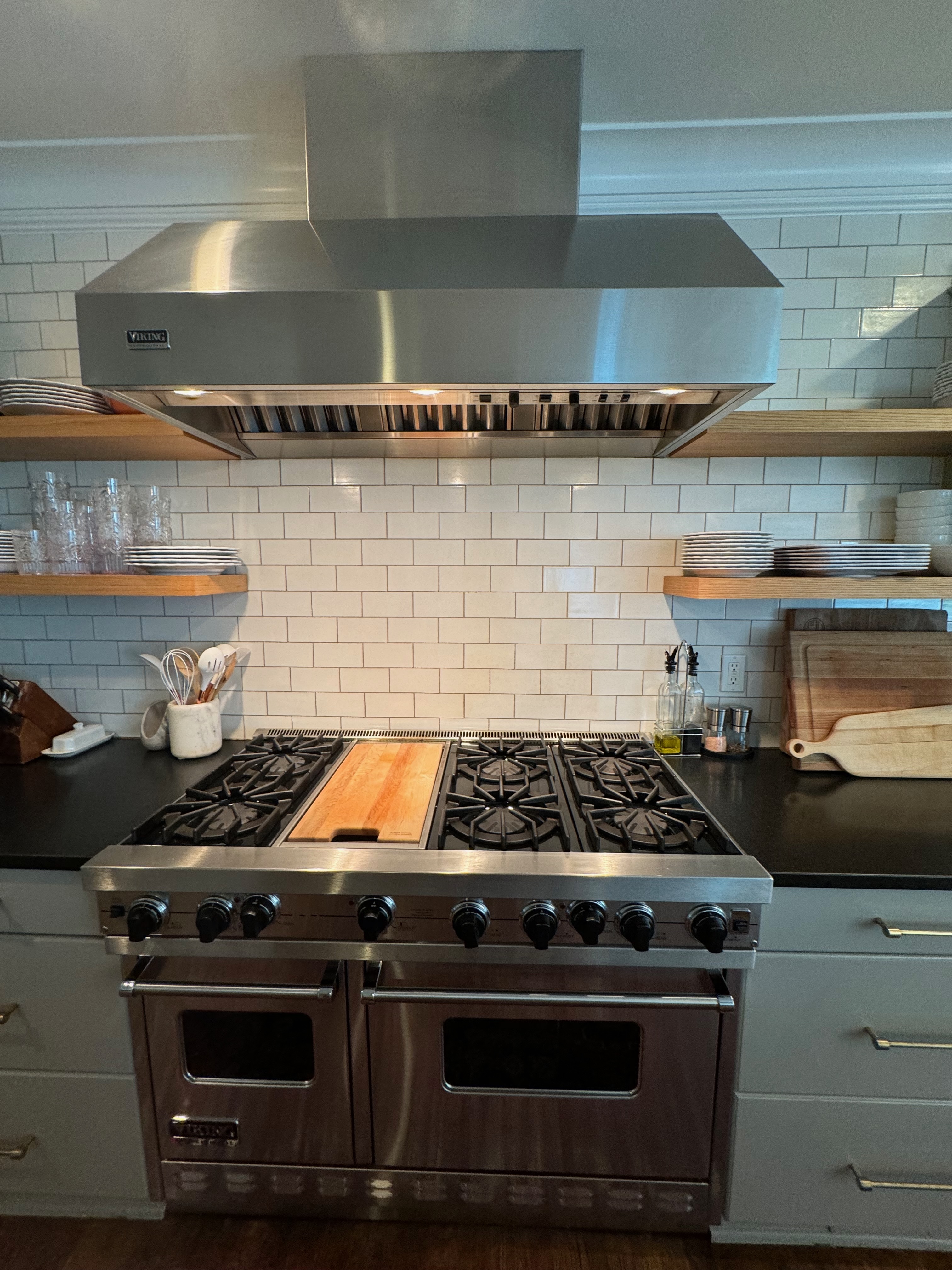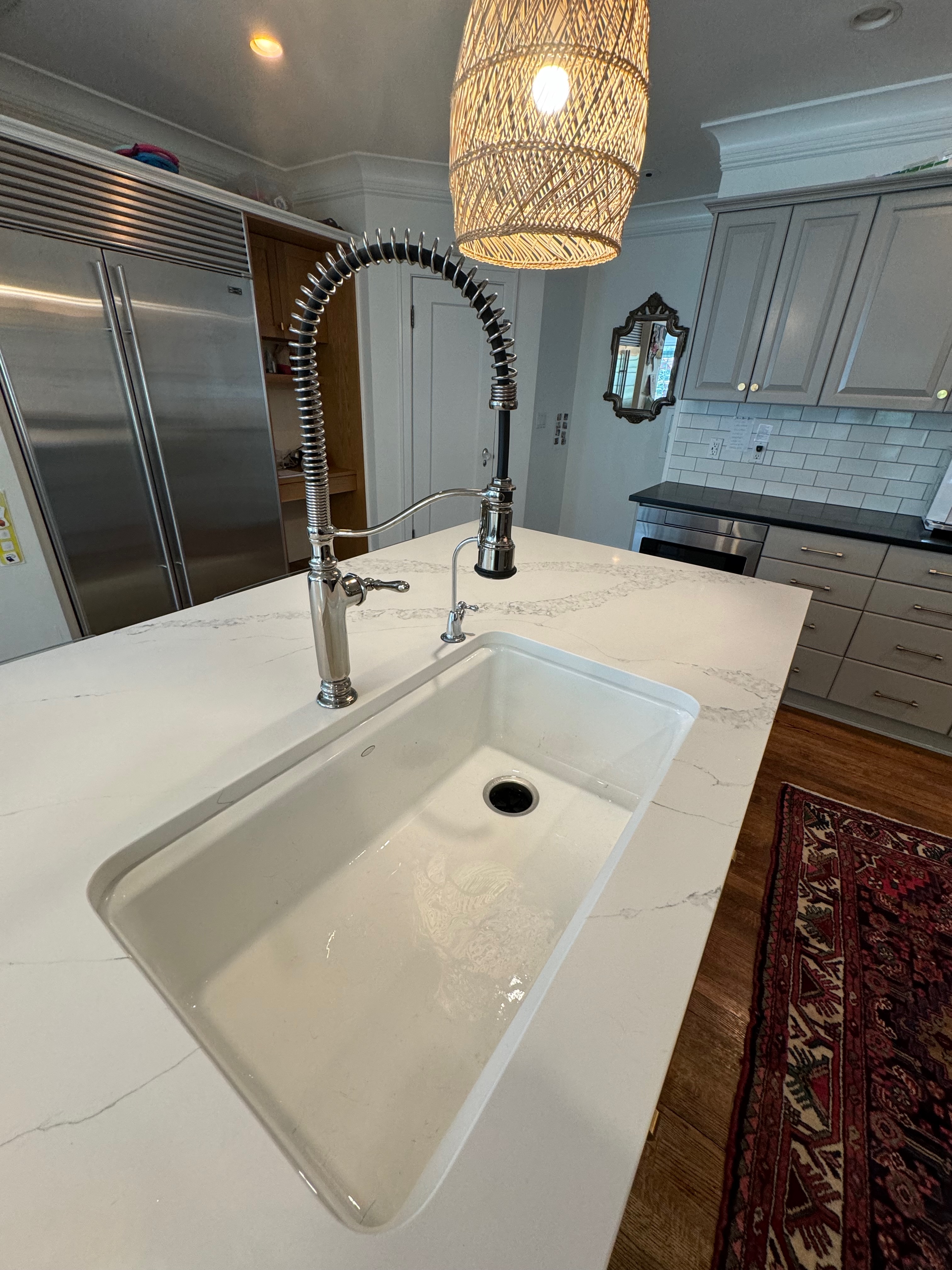 Great Deal! Nice Pale Gray painted Kitchen Cabinets with stylish brass door hardware! This Kitchen Package includes a 48" Viking Range + Viking Hood along with a Stainless Steel Sub-Zero Refrigerator. The is also a beautiful new Quartz island countertop! Must go by Labor Day weekend 8/24. The kitchen is available to be removed by a qualified buyer or there are licensed contractors available to hire. Price for the kitchen package below.
