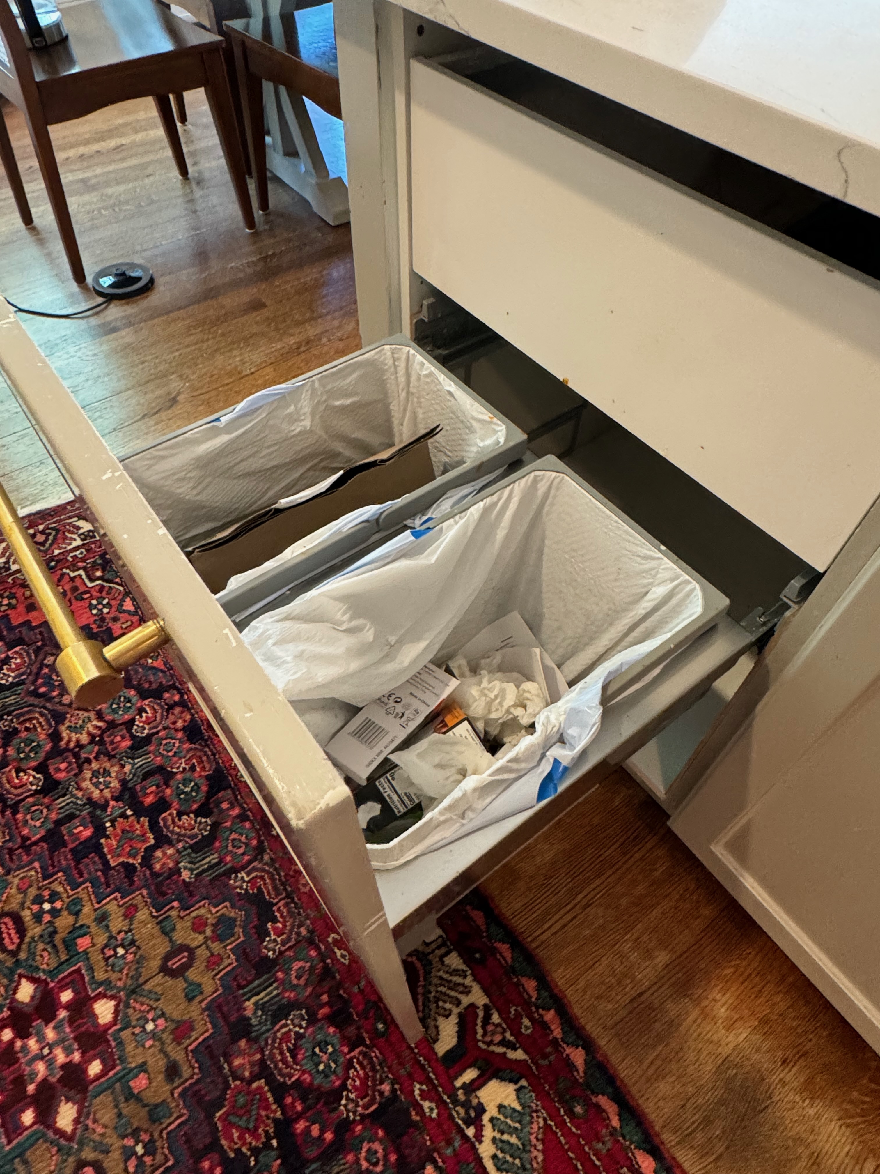 1-One door base cabinet w/ Two trash cans inside Dim.: 24” w x 36”h x 24”d