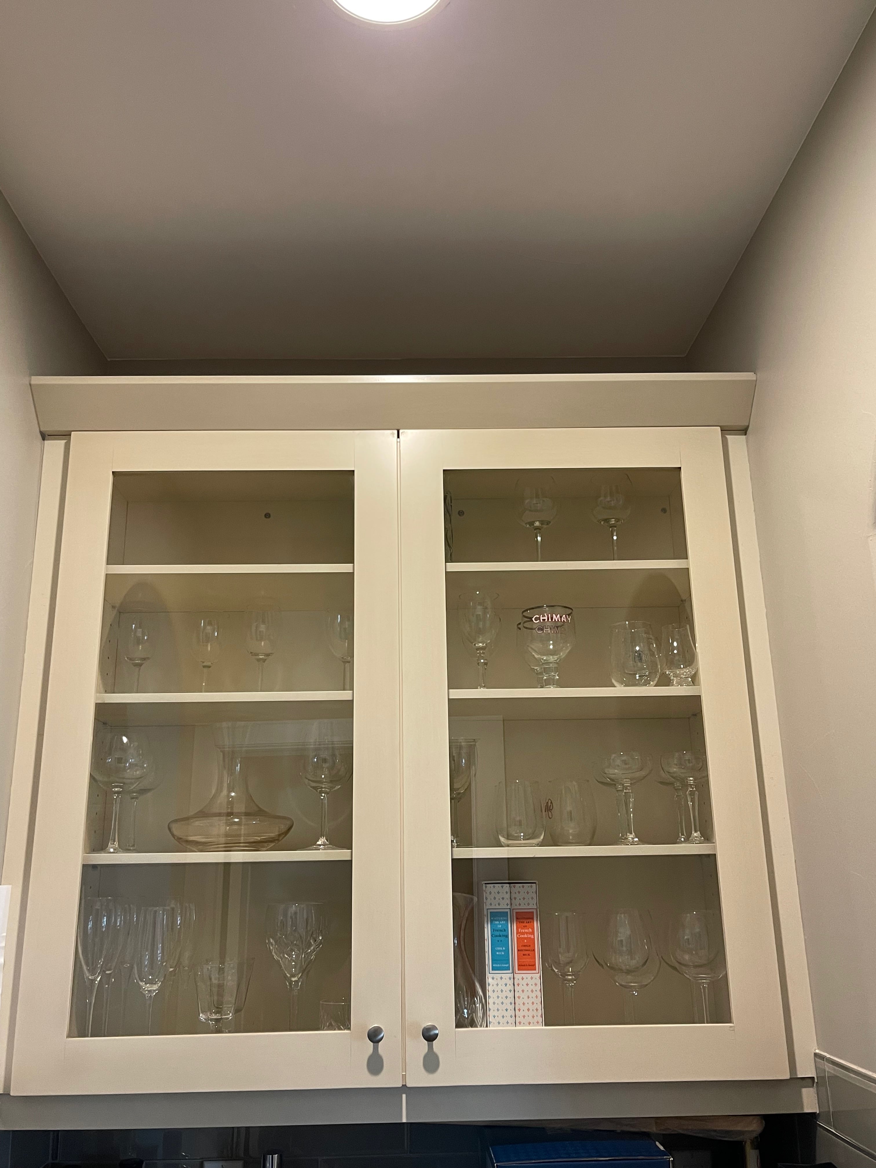 1-Two door glass front wall cabinet Dim.:48”w x 41”h cab./ 44 ½”d w/crown x 12”d