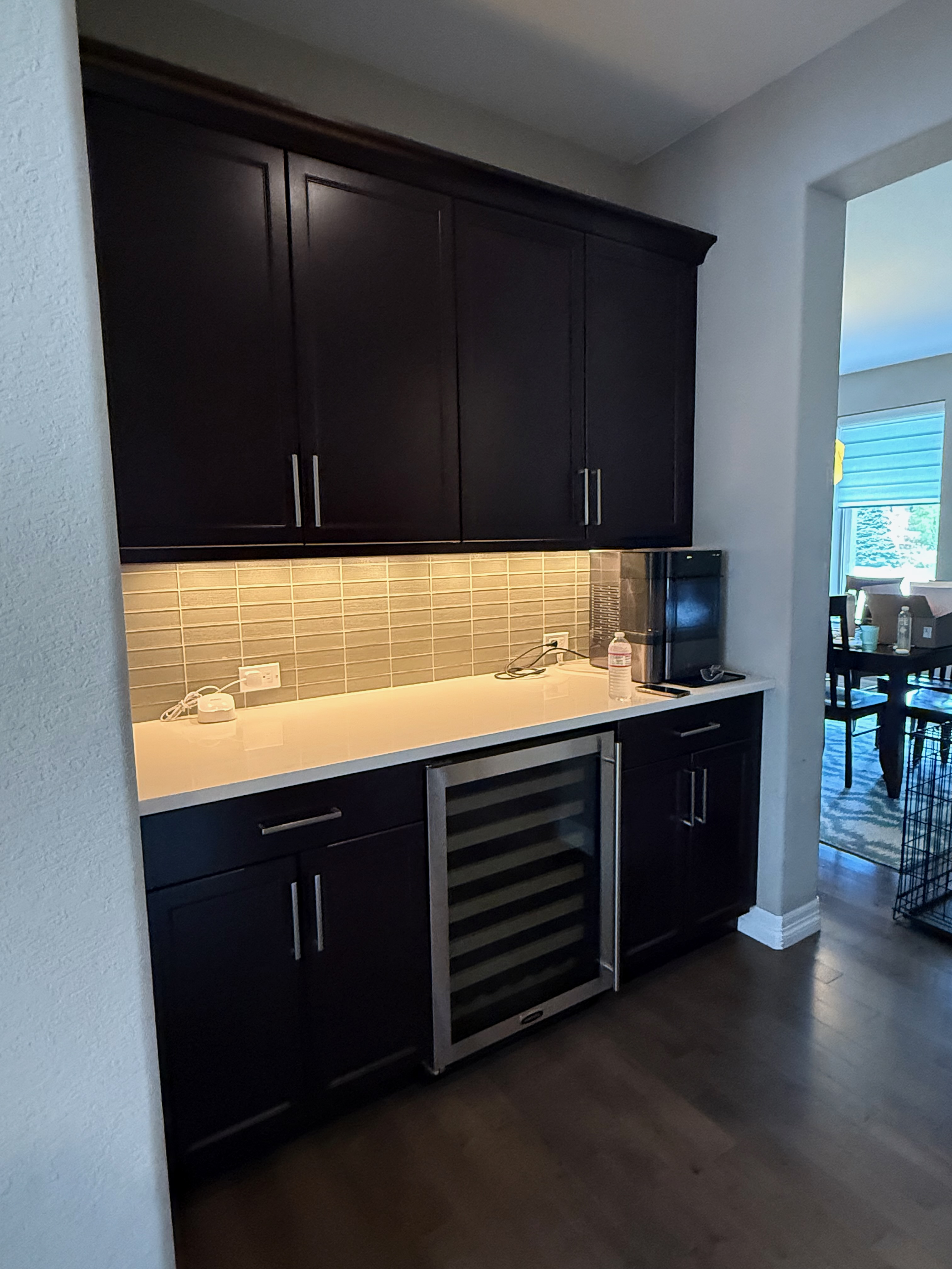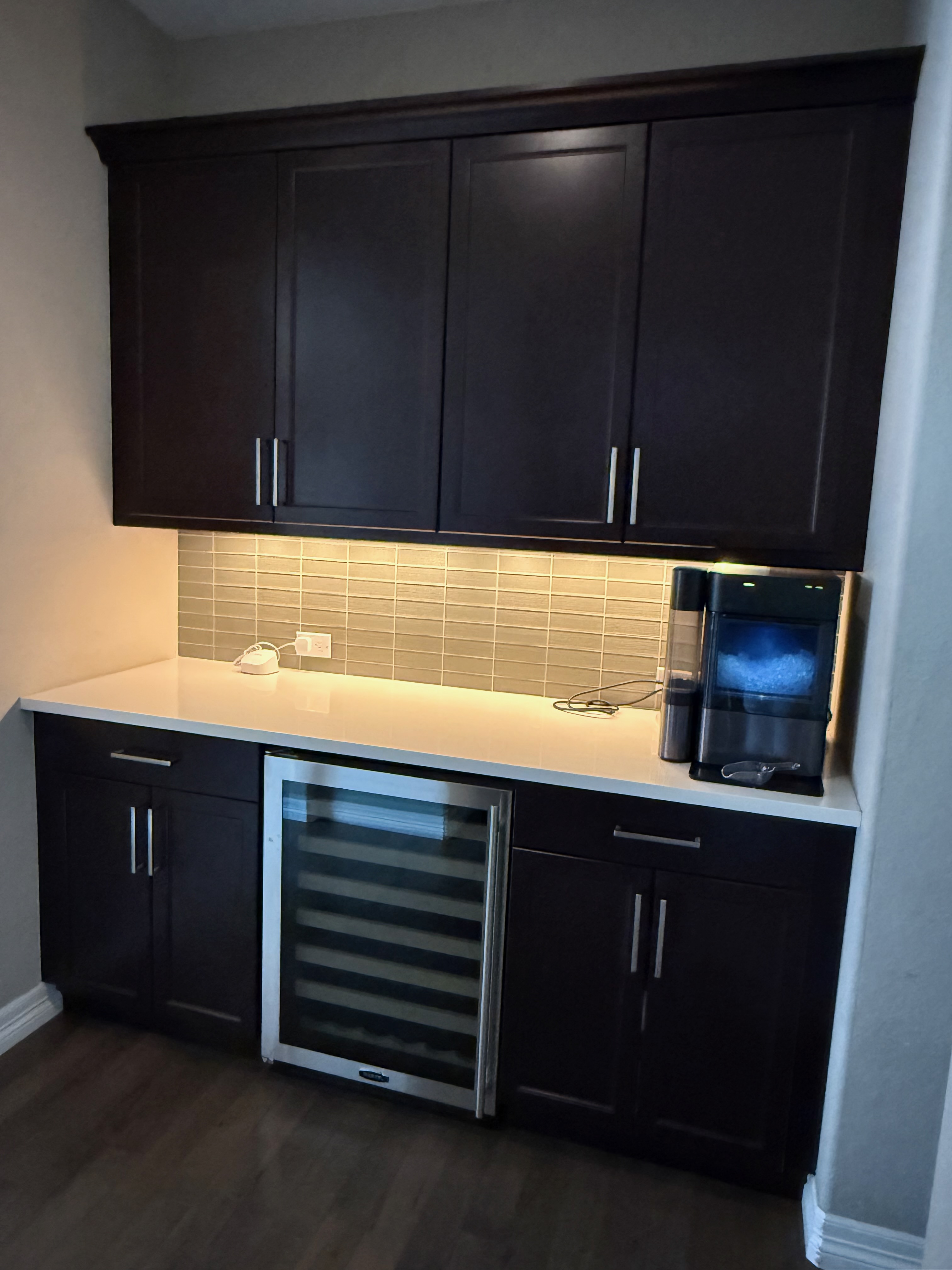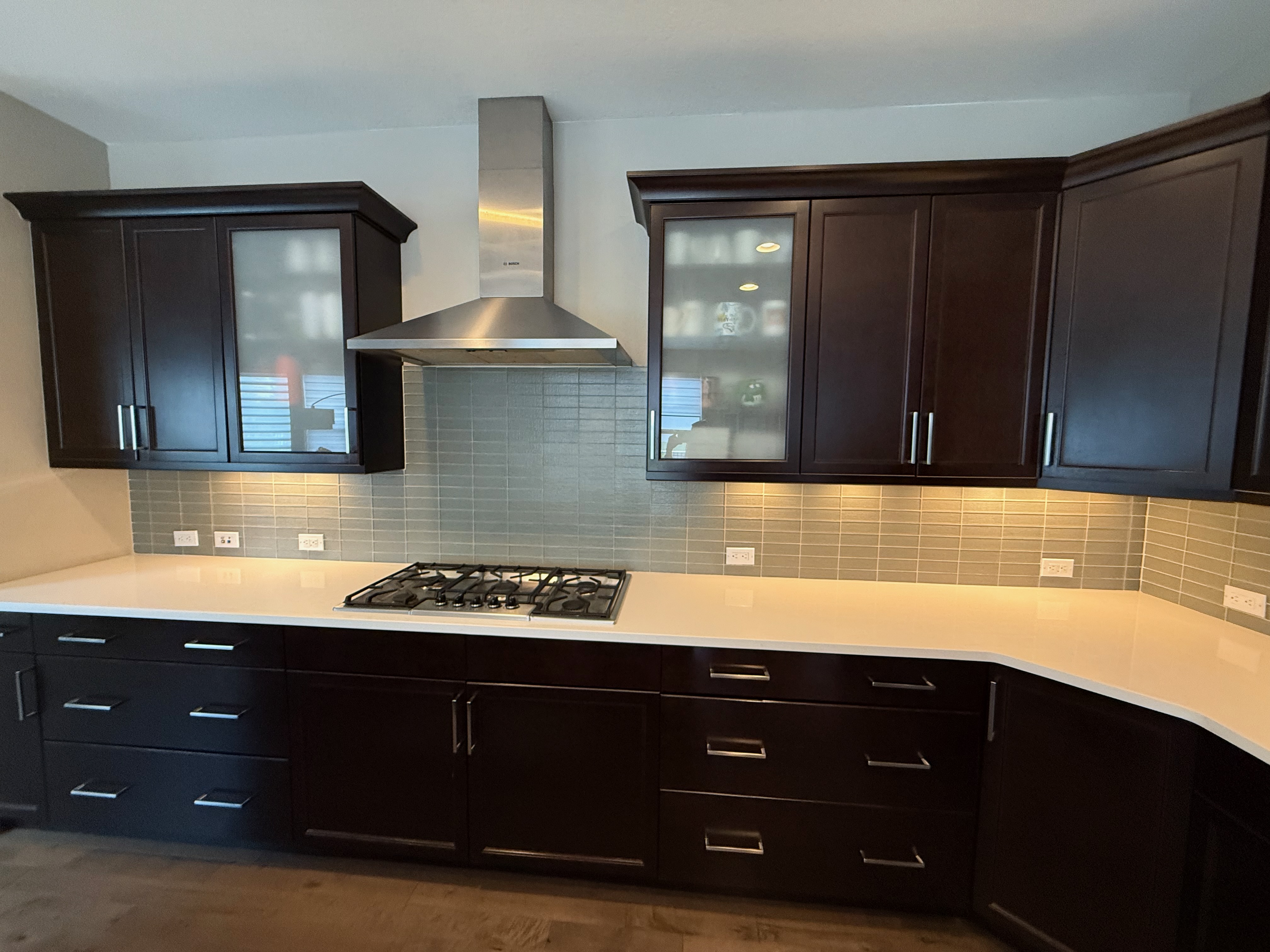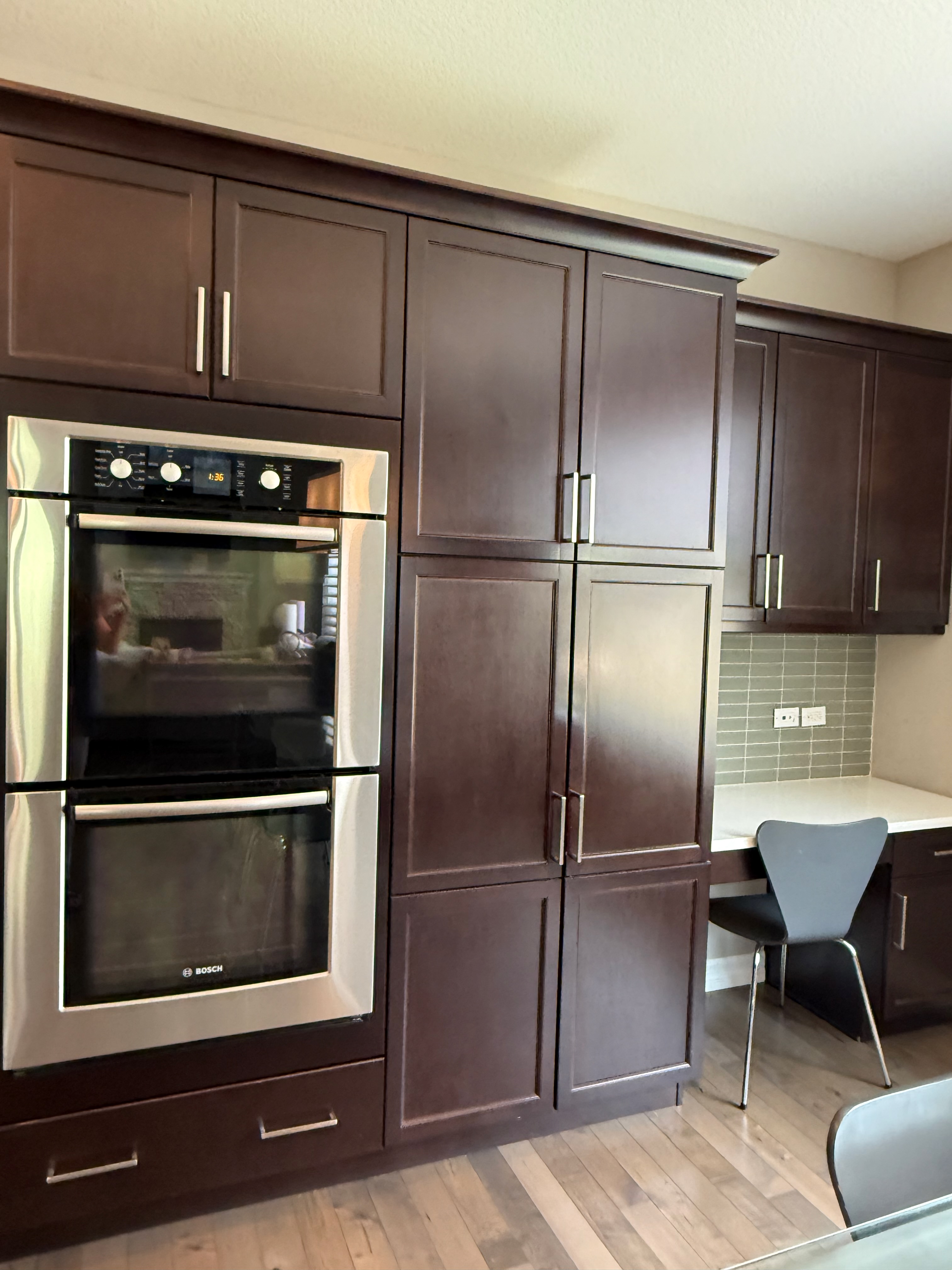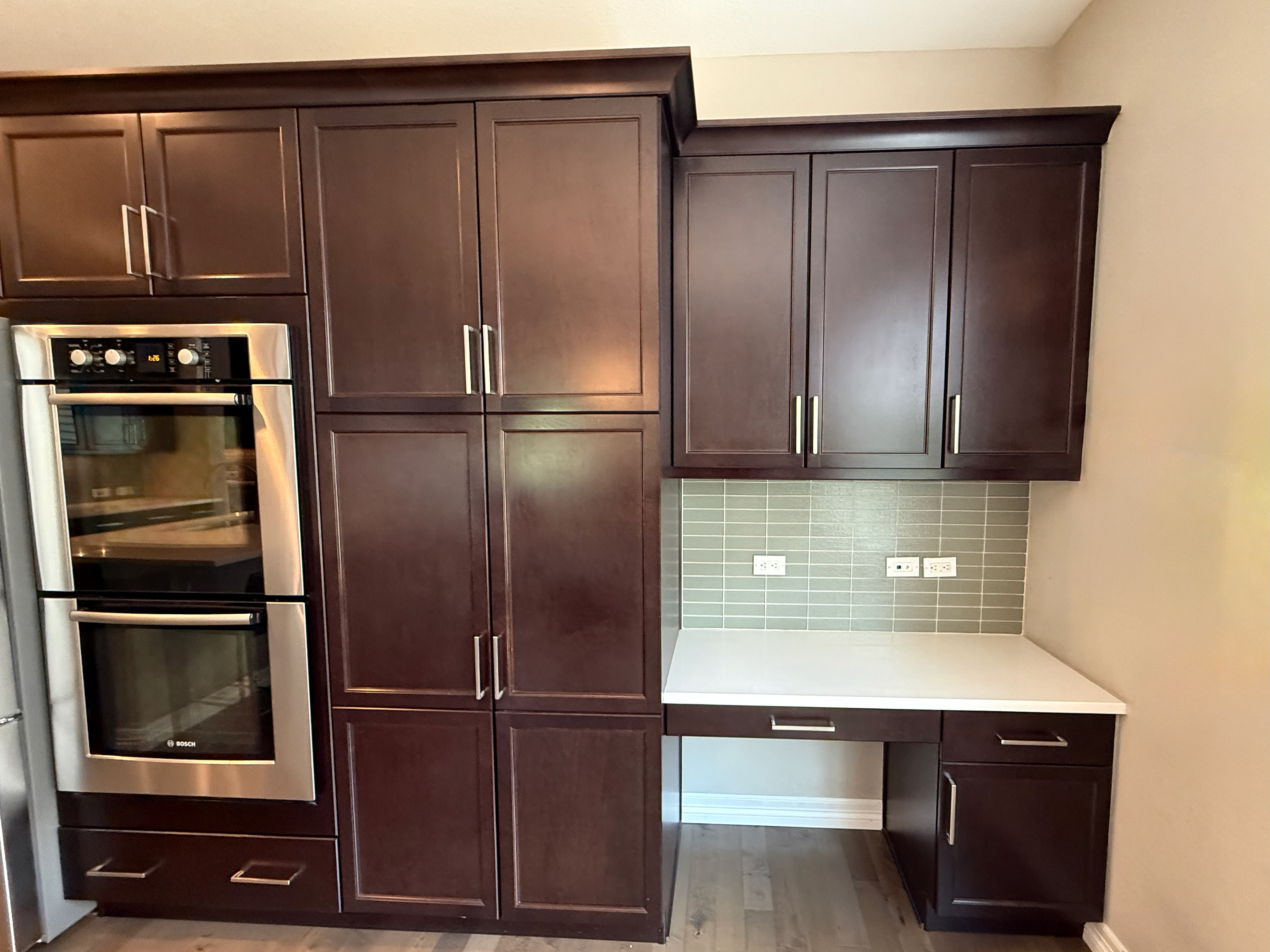 Nice Kitchen Craft Kitchen cabinets in an Espresso finish. The package includes nice Bosch Stainless steel appliances along with beautiful quartz slab countertops. The cabinets have dovetailed drawers. there is also a matching coffee/wine bar area included in the set. Available mid-end of July. Qualified buyers can remove the kitchen or licensed contractors and movers are available for hire. Price for the package below.