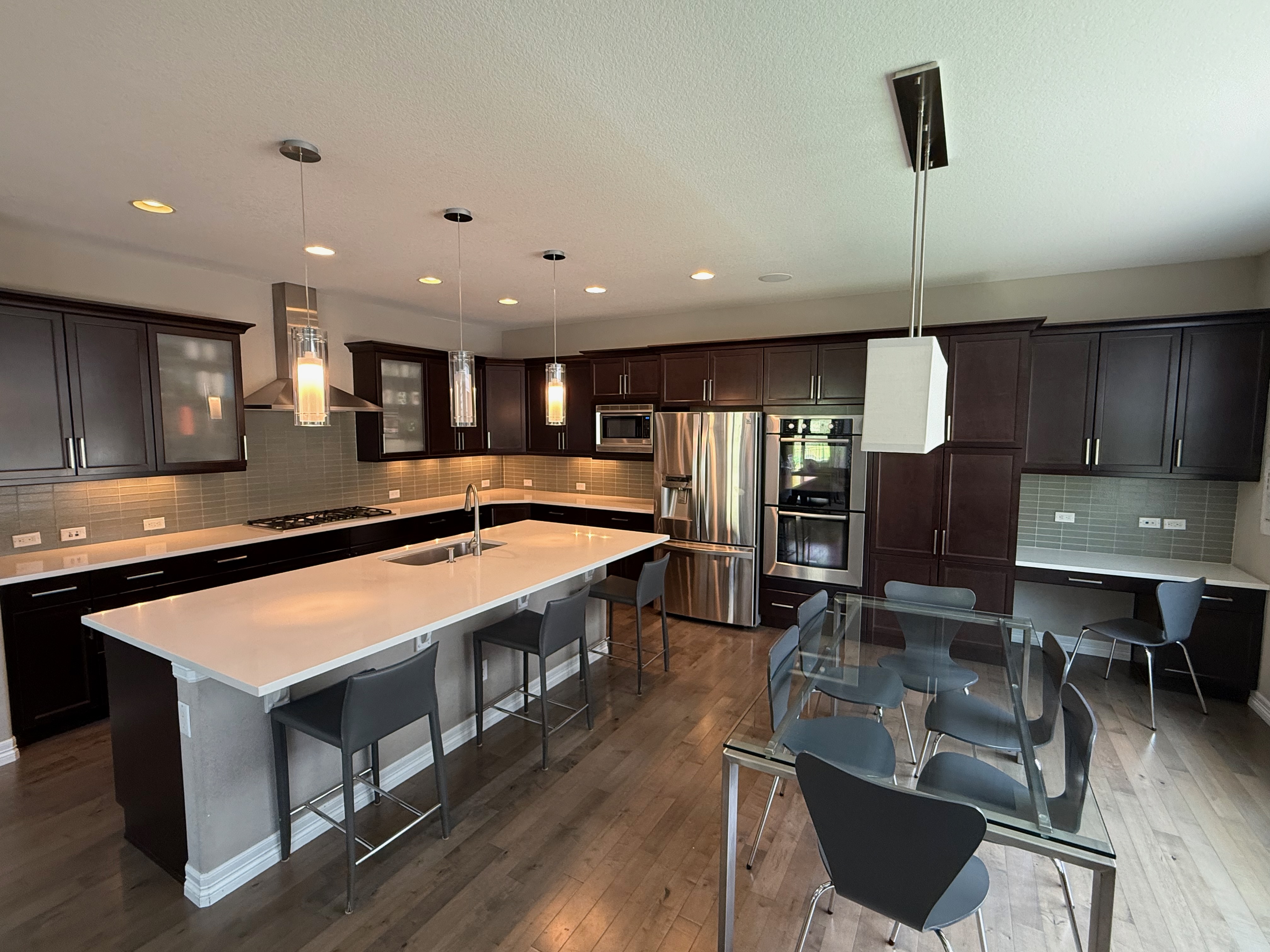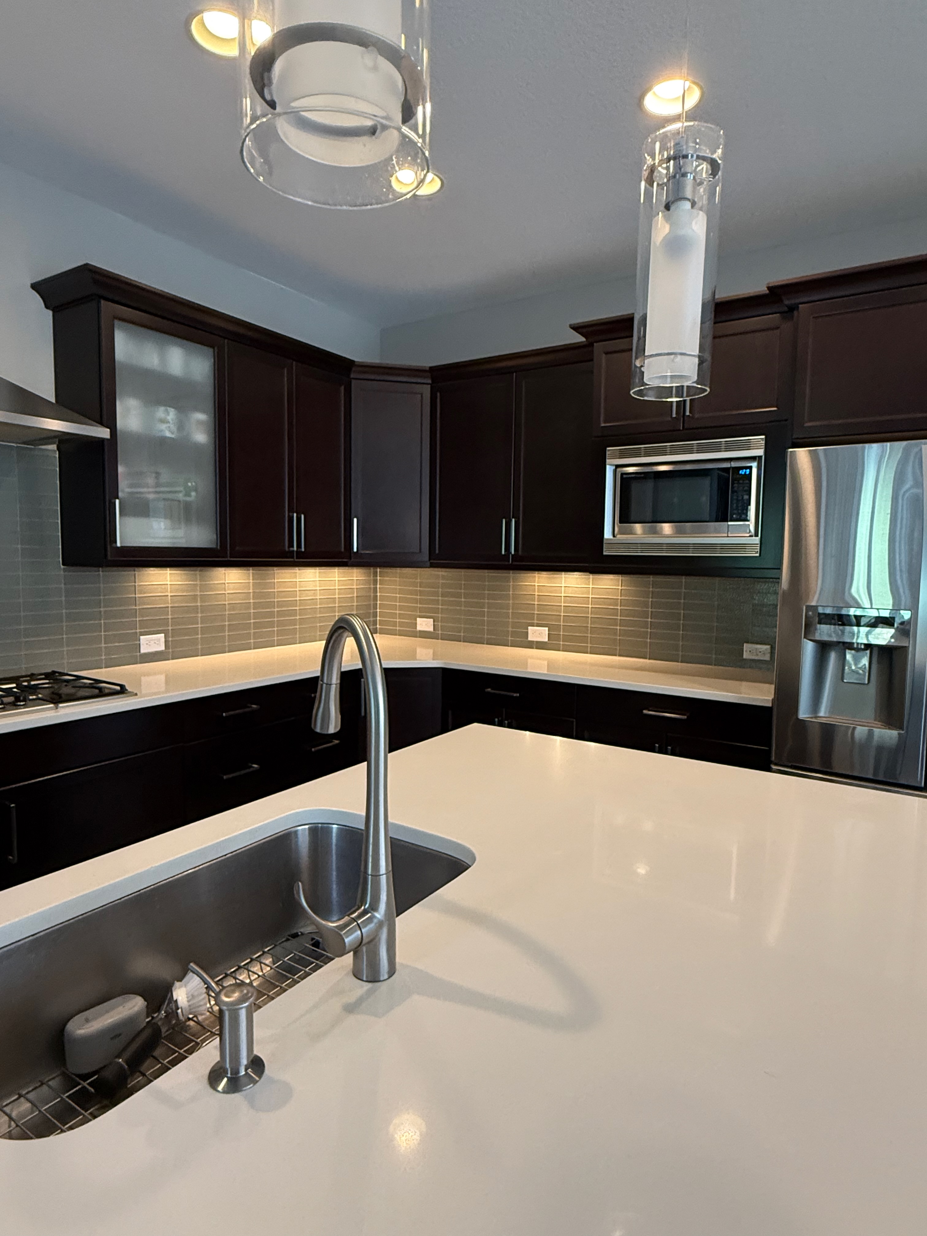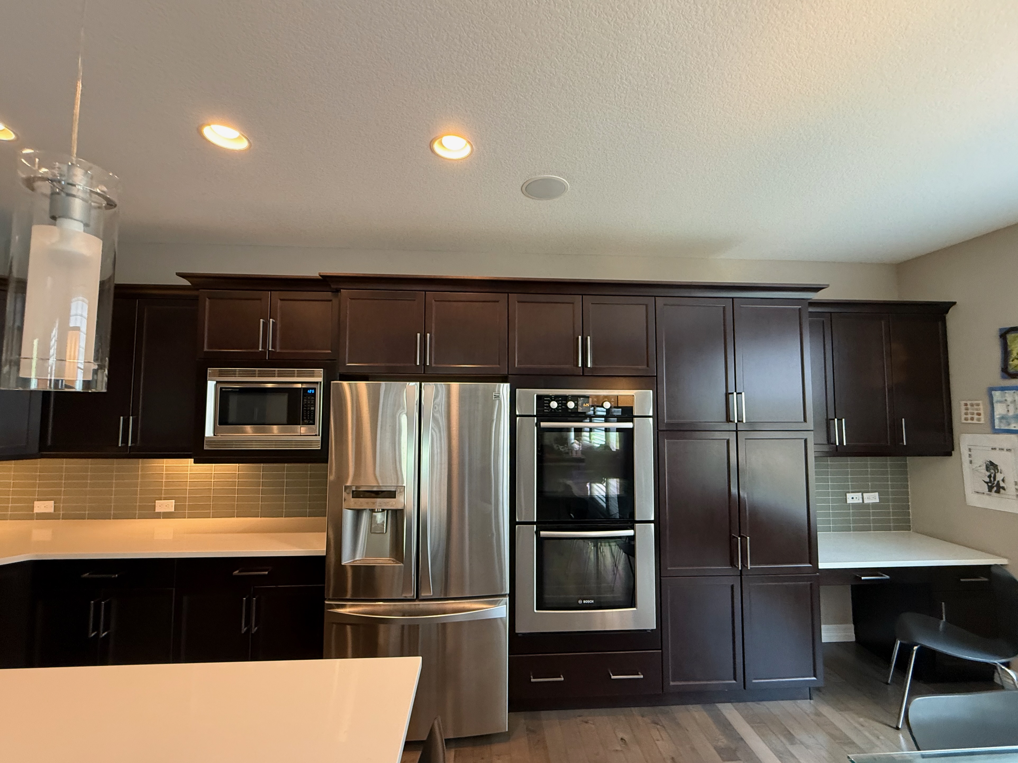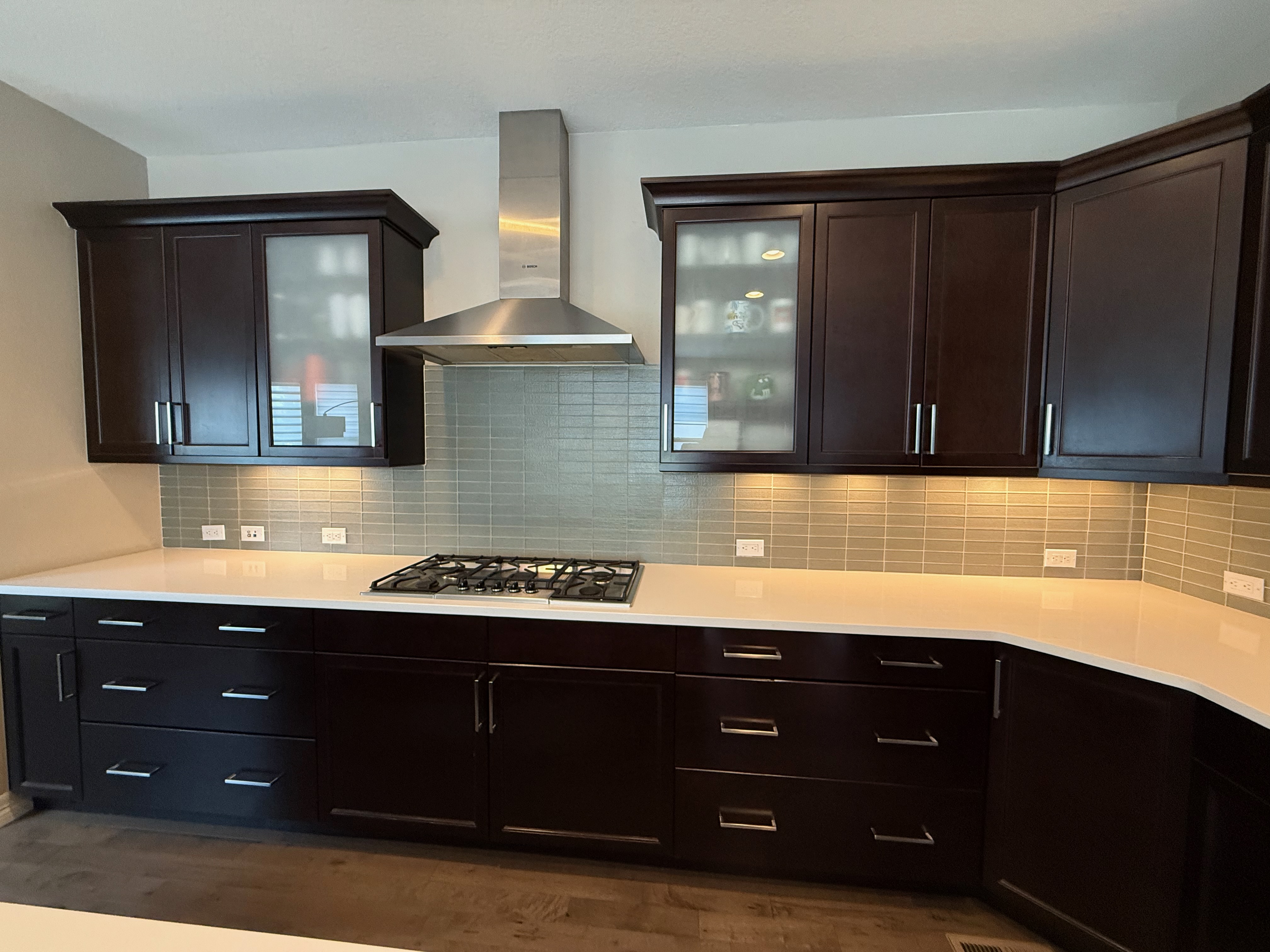 Nice Kitchen Craft Kitchen cabinets in an Espresso finish. The package includes nice Bosch Stainless steel appliances along with beautiful quartz slab countertops. The cabinets have dovetailed drawers. there is also a matching coffee/wine bar area included in the set. Available mid-end of July. Qualified buyers can remove the kitchen or licensed contractors and movers are available for hire. Price for the package below.
