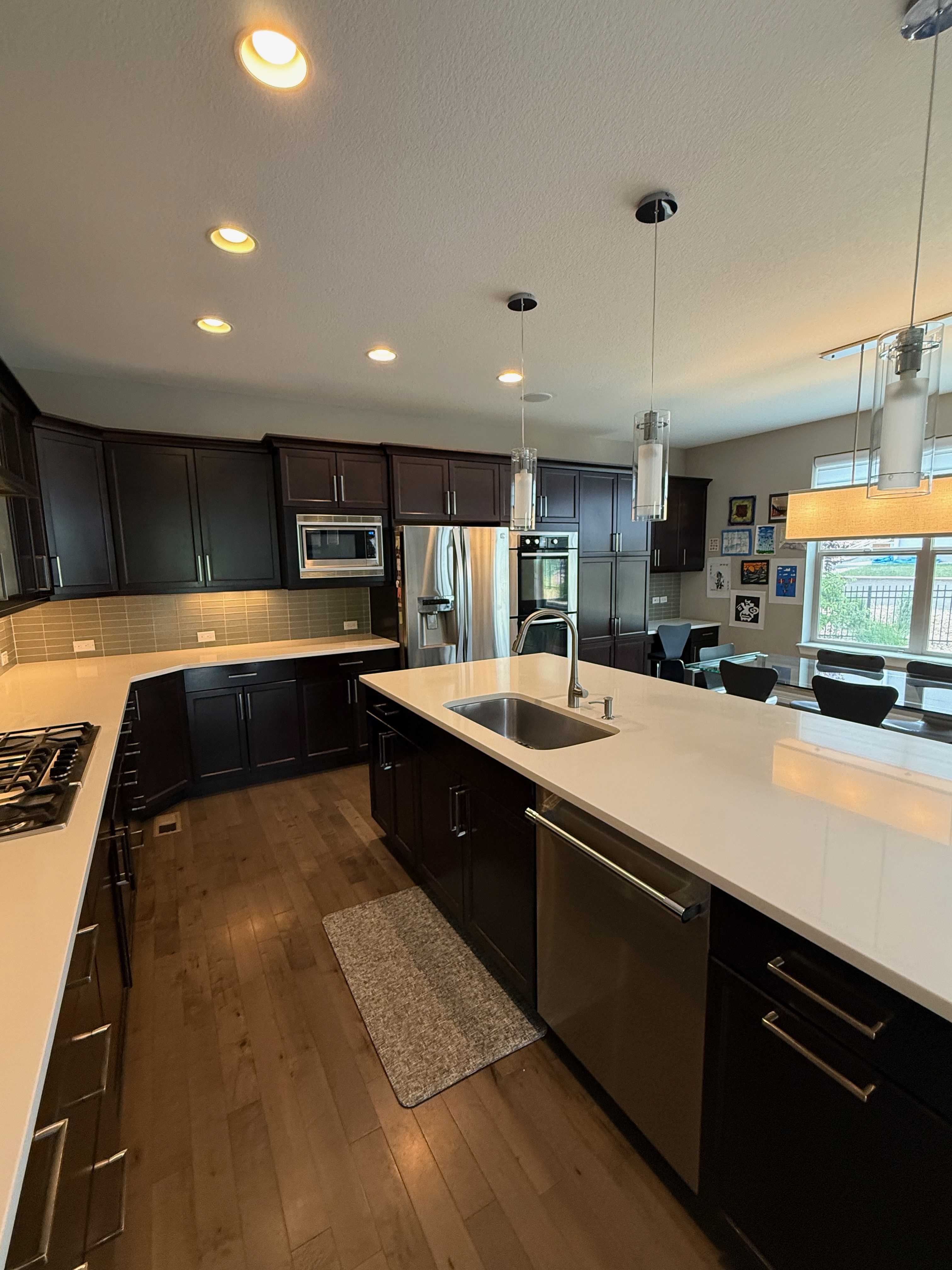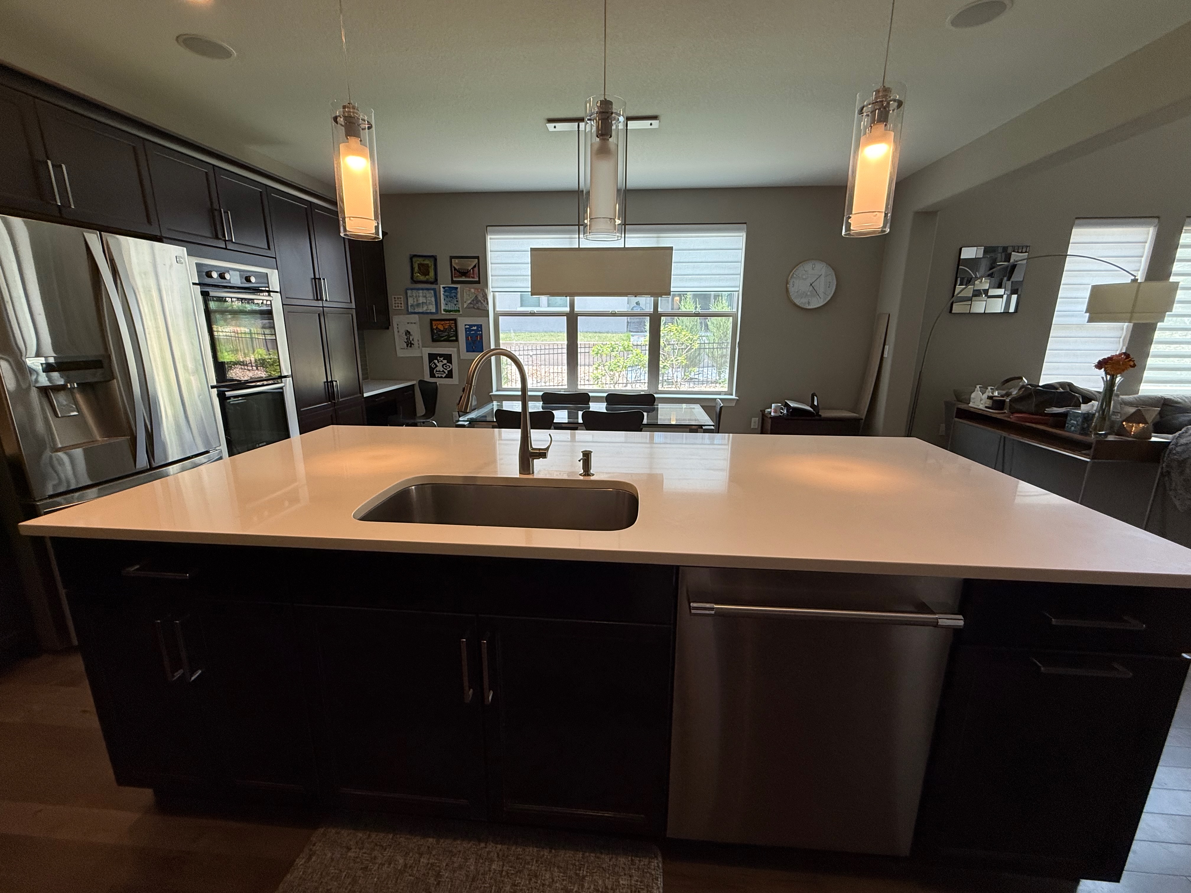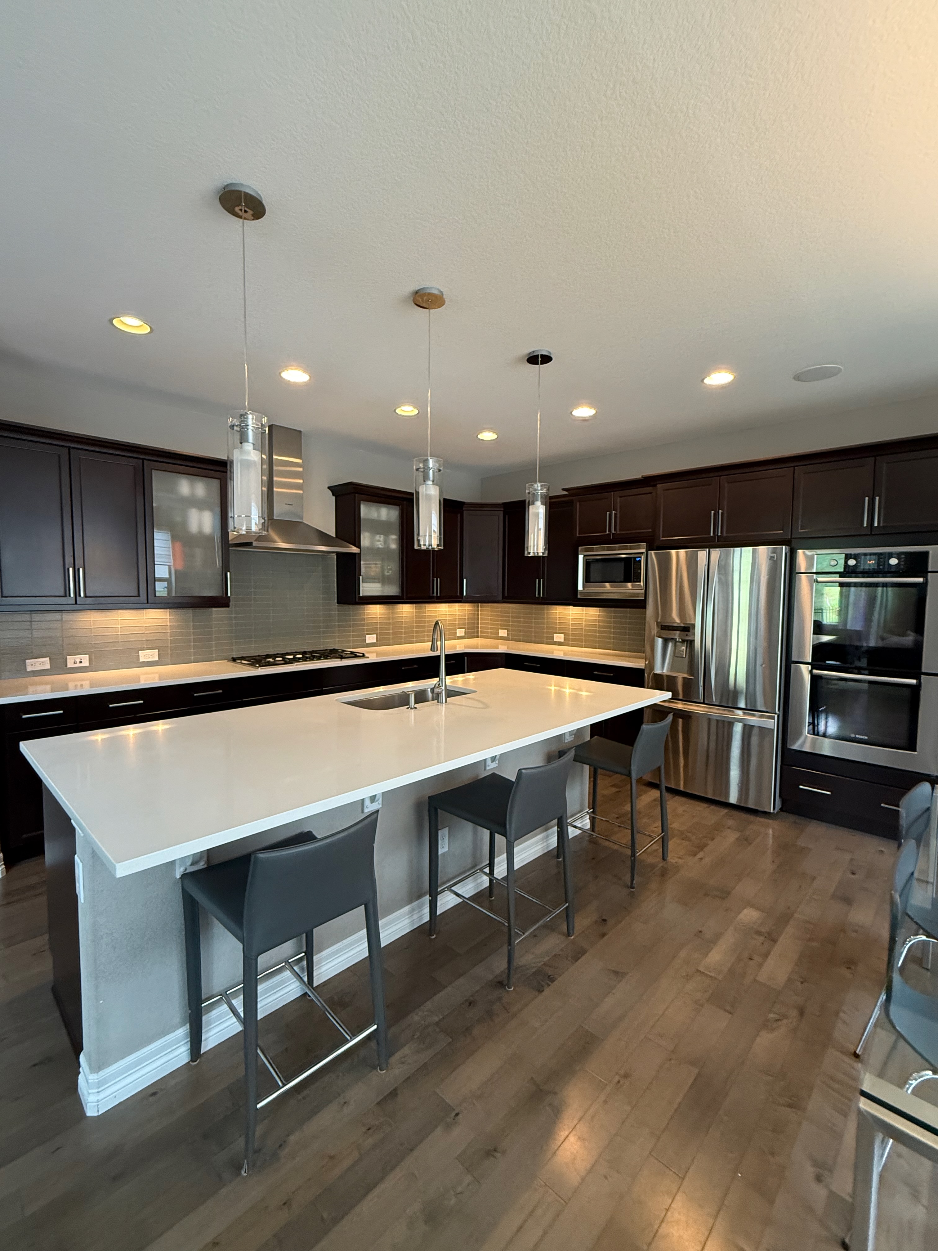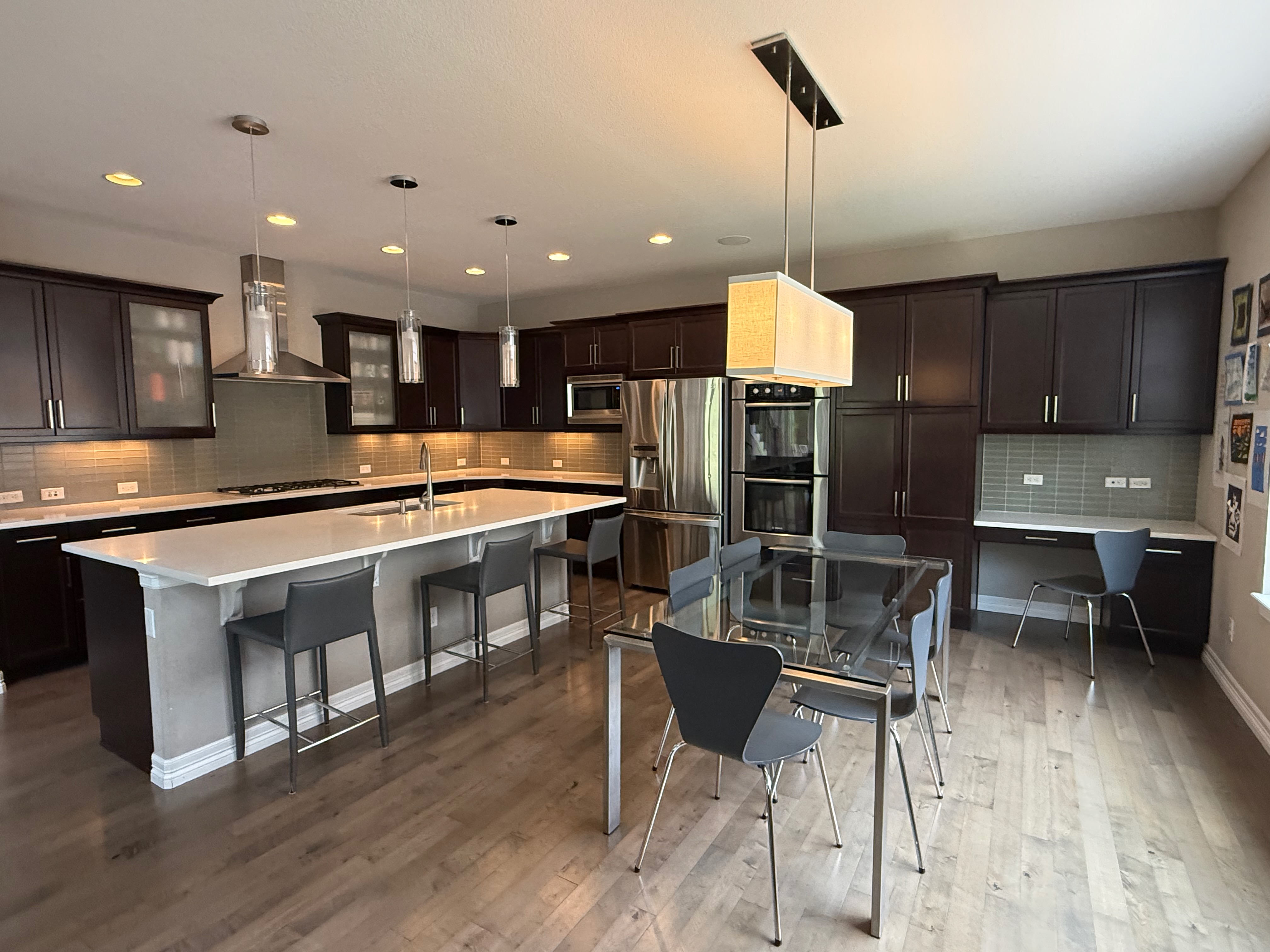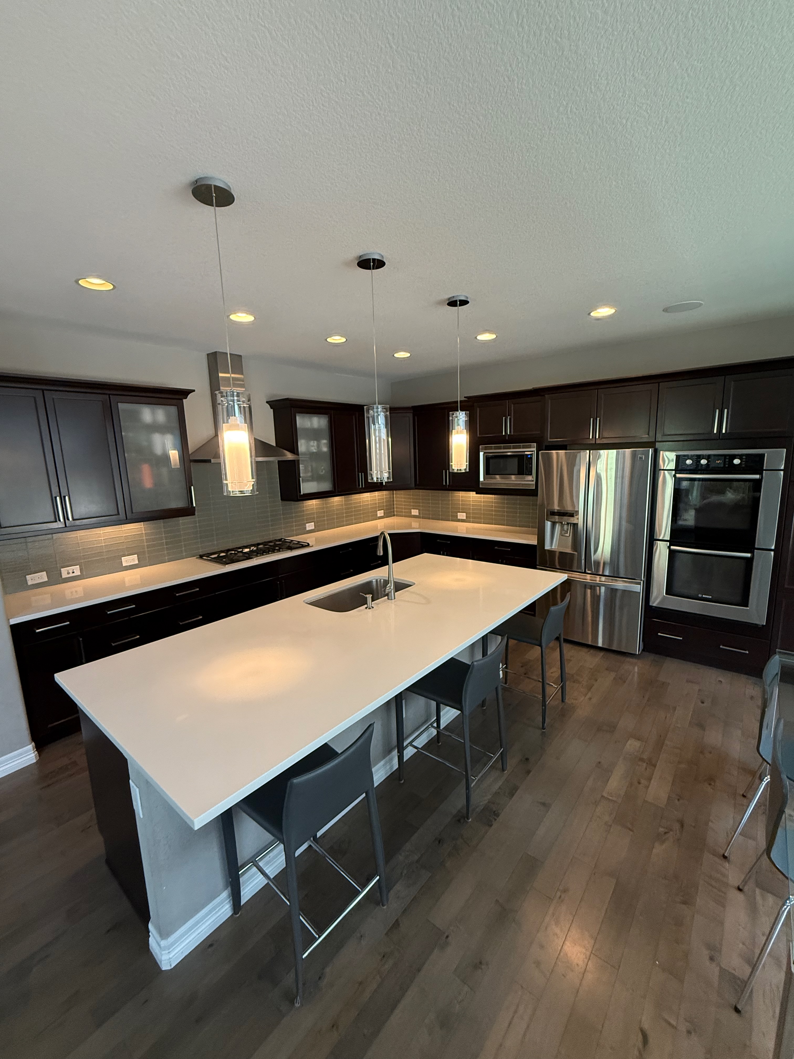 Nice Kitchen Craft Kitchen cabinets in an Espresso finish. The package includes nice Bosch Stainless steel appliances along with beautiful quartz slab countertops. The cabinets have dovetailed drawers. there is also a matching coffee/wine bar area included in the set. Available mid-end of July. Qualified buyers can remove the kitchen or licensed contractors and movers are available for hire. Price for the package below.