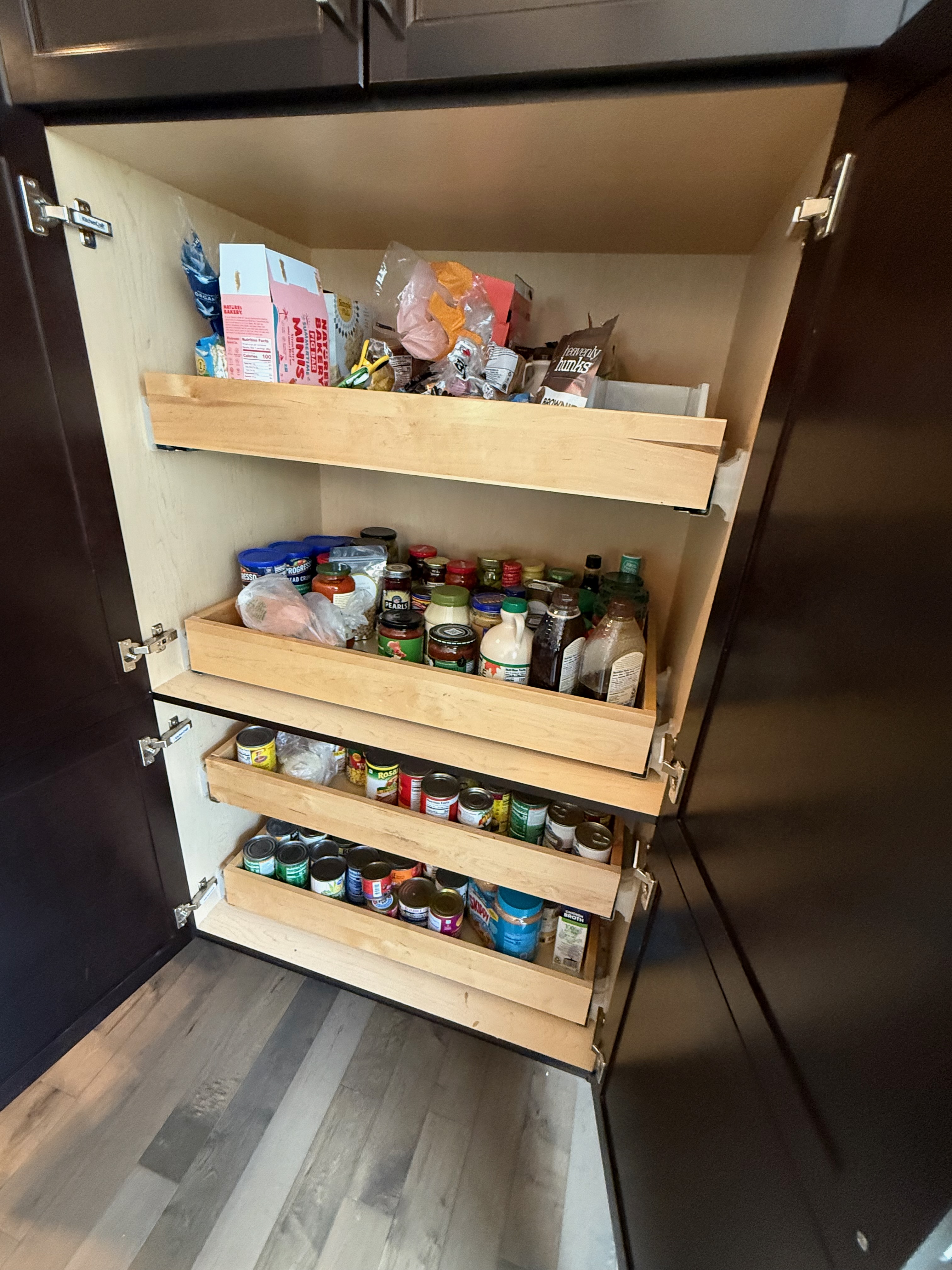 1-Four door double tall pantry cabinet w/four wood pull-out drawers Dim.: 36”w x 90 ¼”h cab. only/93 ¼”h w/ crown x 24”d