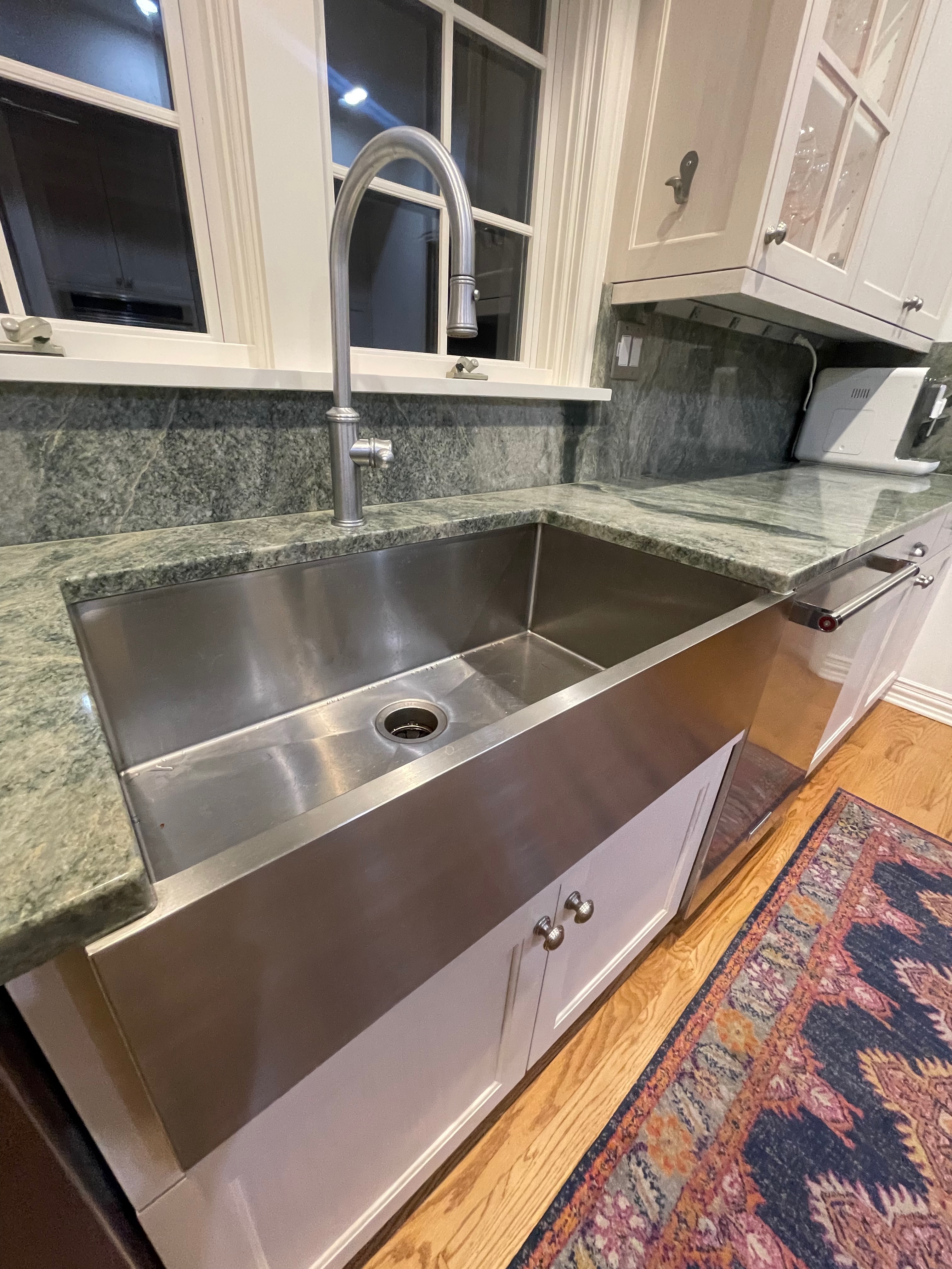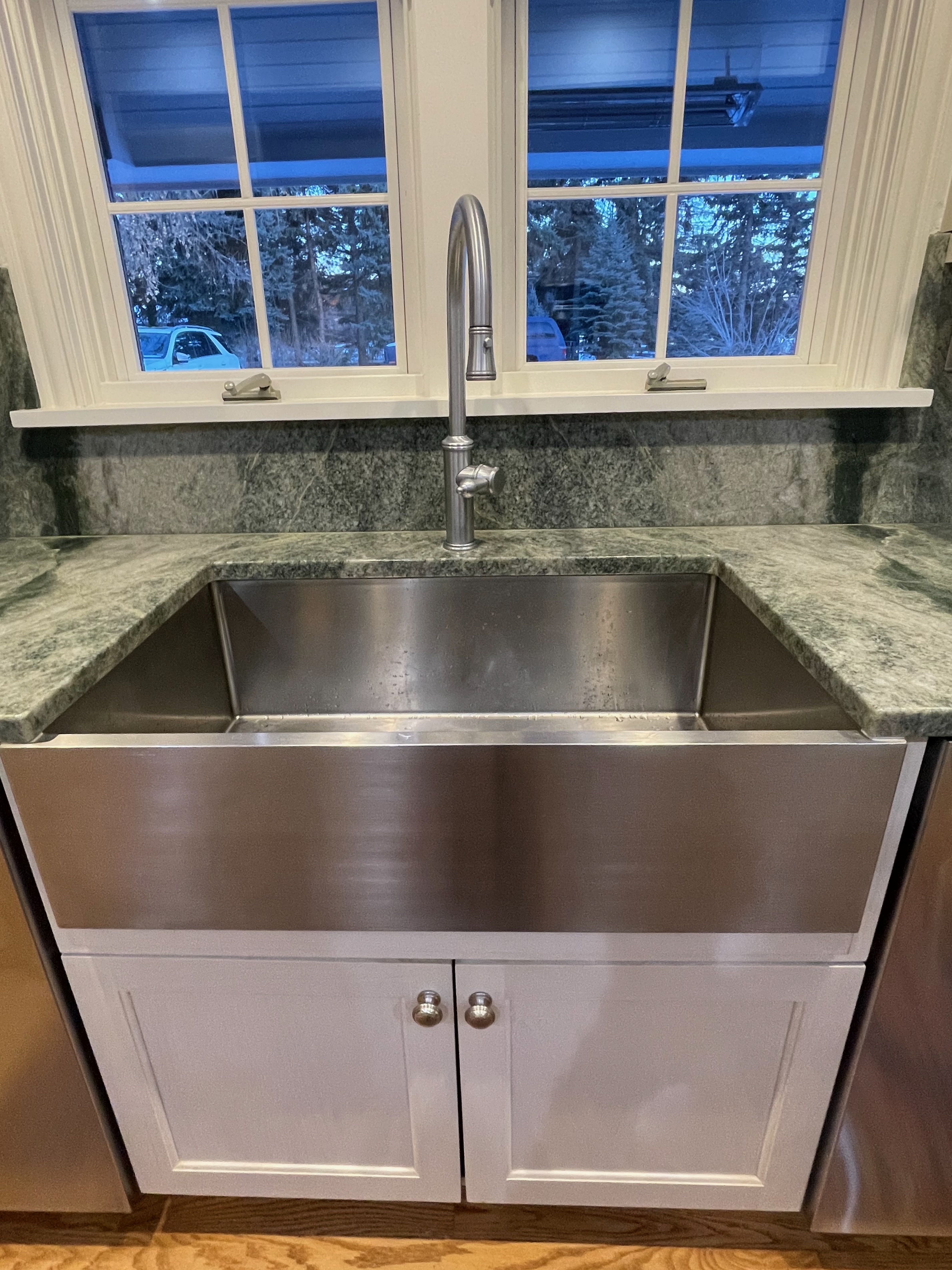 1-Two door apron sink base cabinet Dim.: 36” w x 25 3/4”h/36”h x 24” d, Stainless Steel Apron/Farmhouse sink