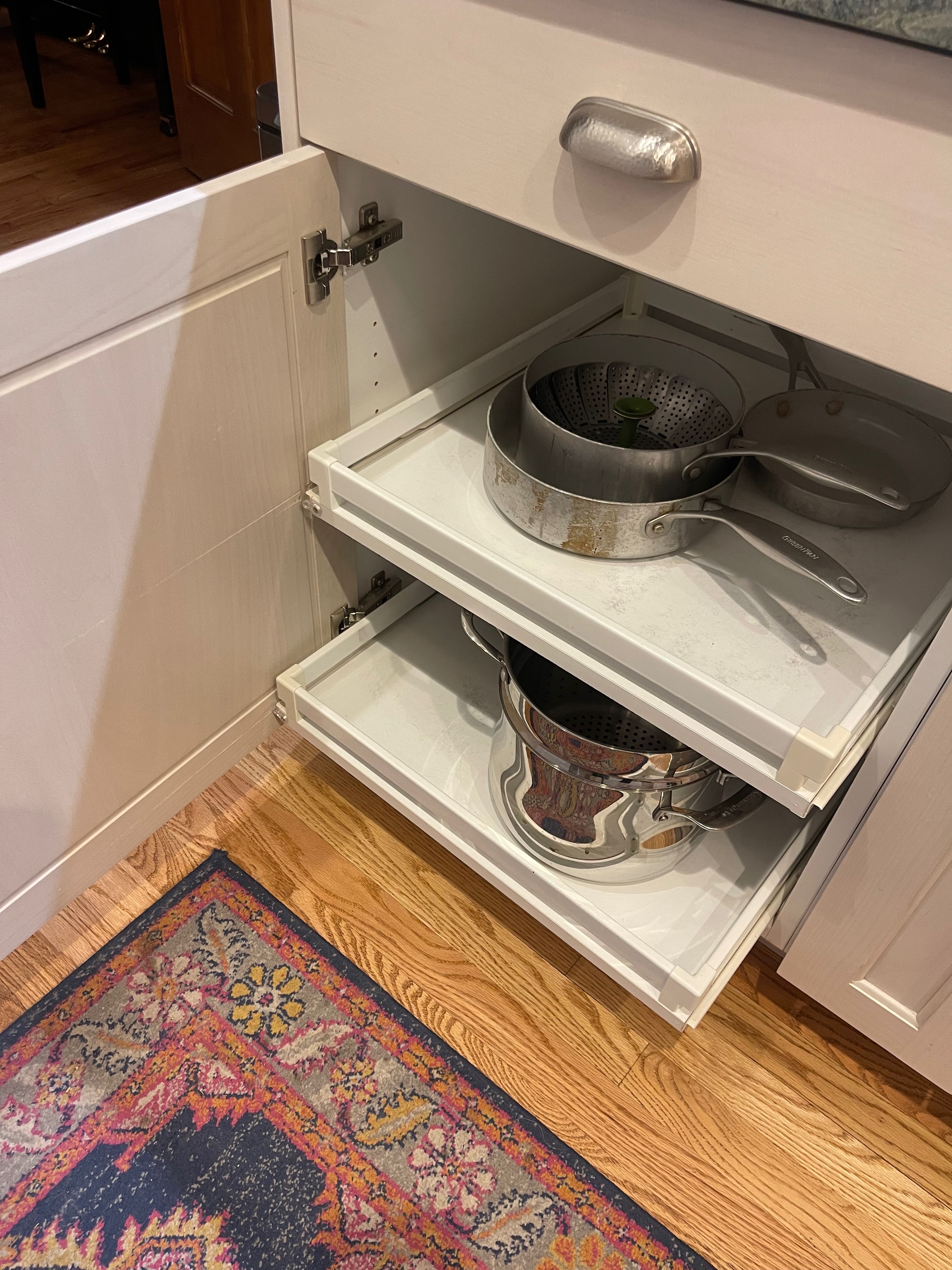 1-One drawer, One door base cabinet w/ two pull out drawers inside Dim.: 24” w x 34 1/2”h/36”h x 24” d