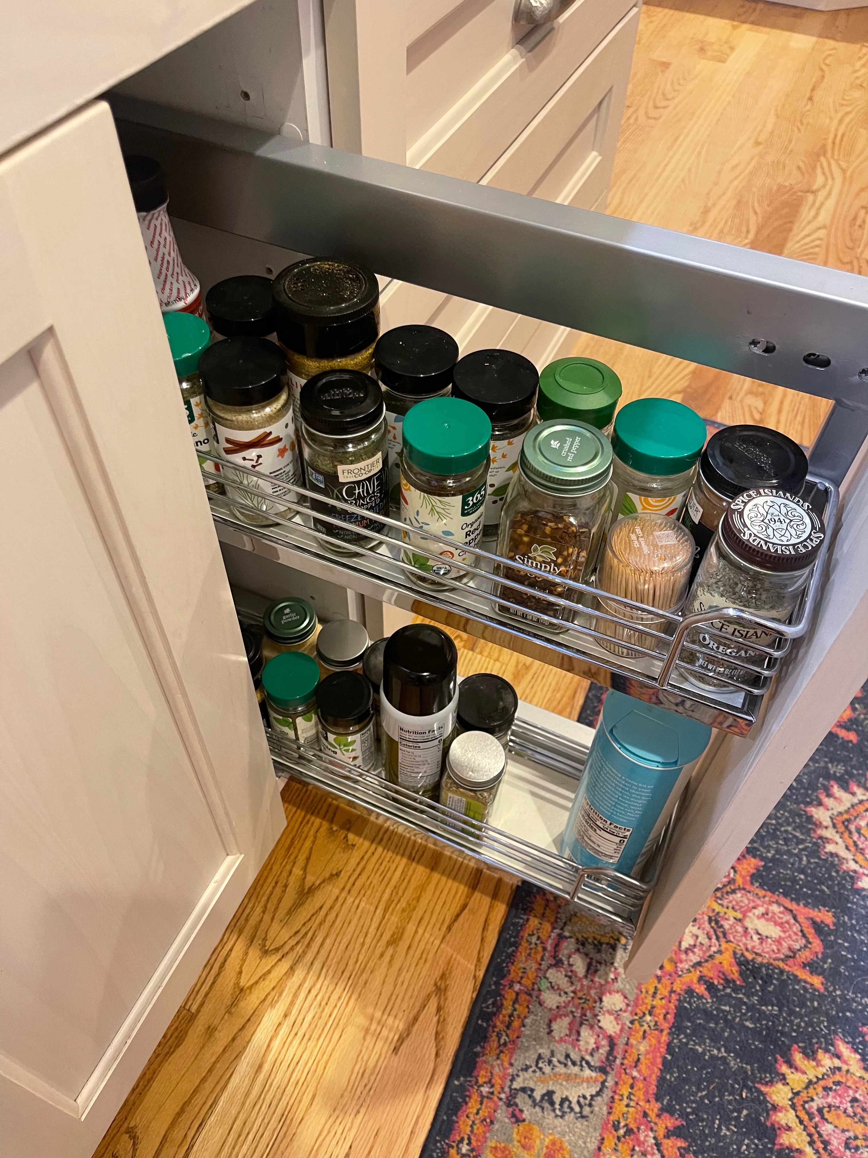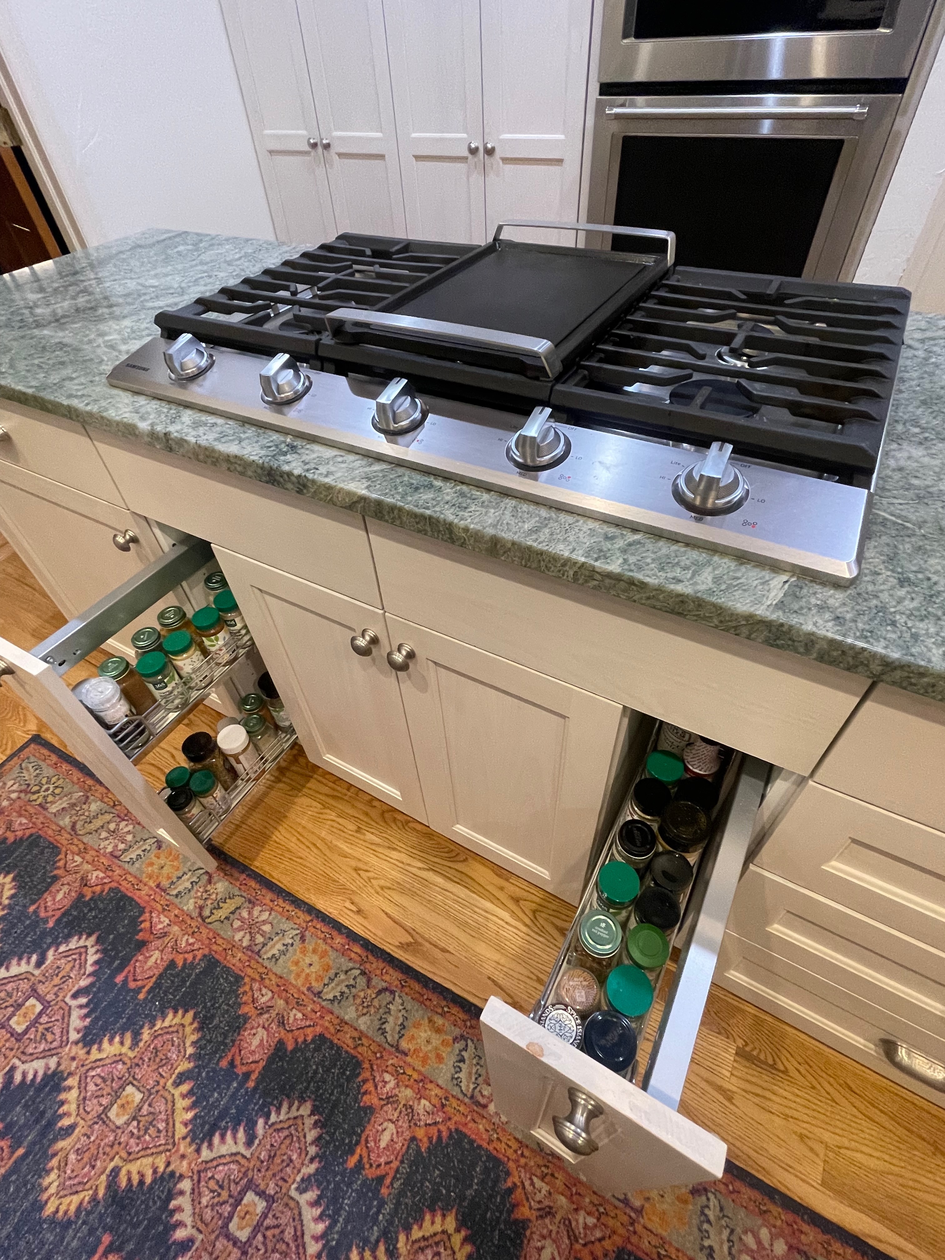 1-Two door cooktop base cabinet with two door pull out spice racks on each side Dim.: 39”w x 34 1/2”h/36”h x 24” d