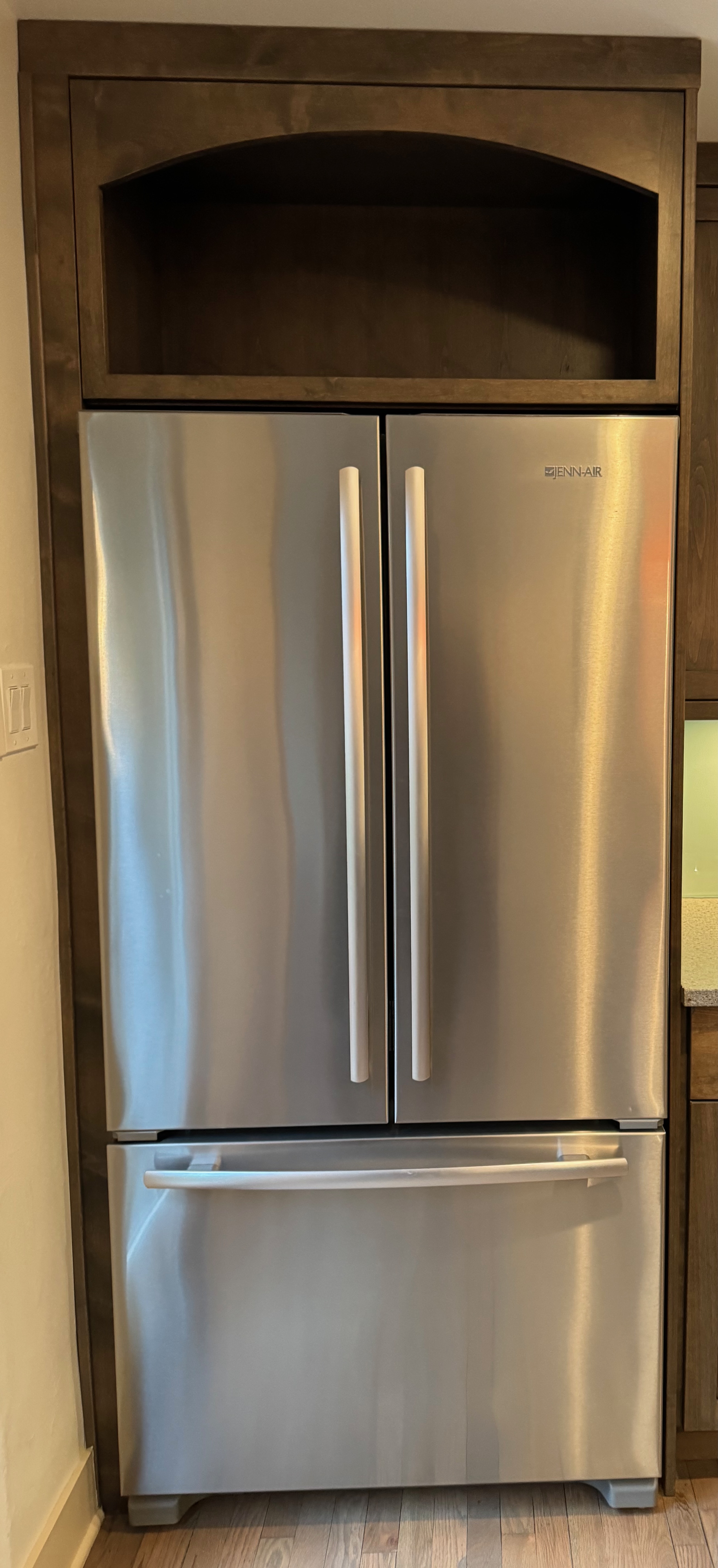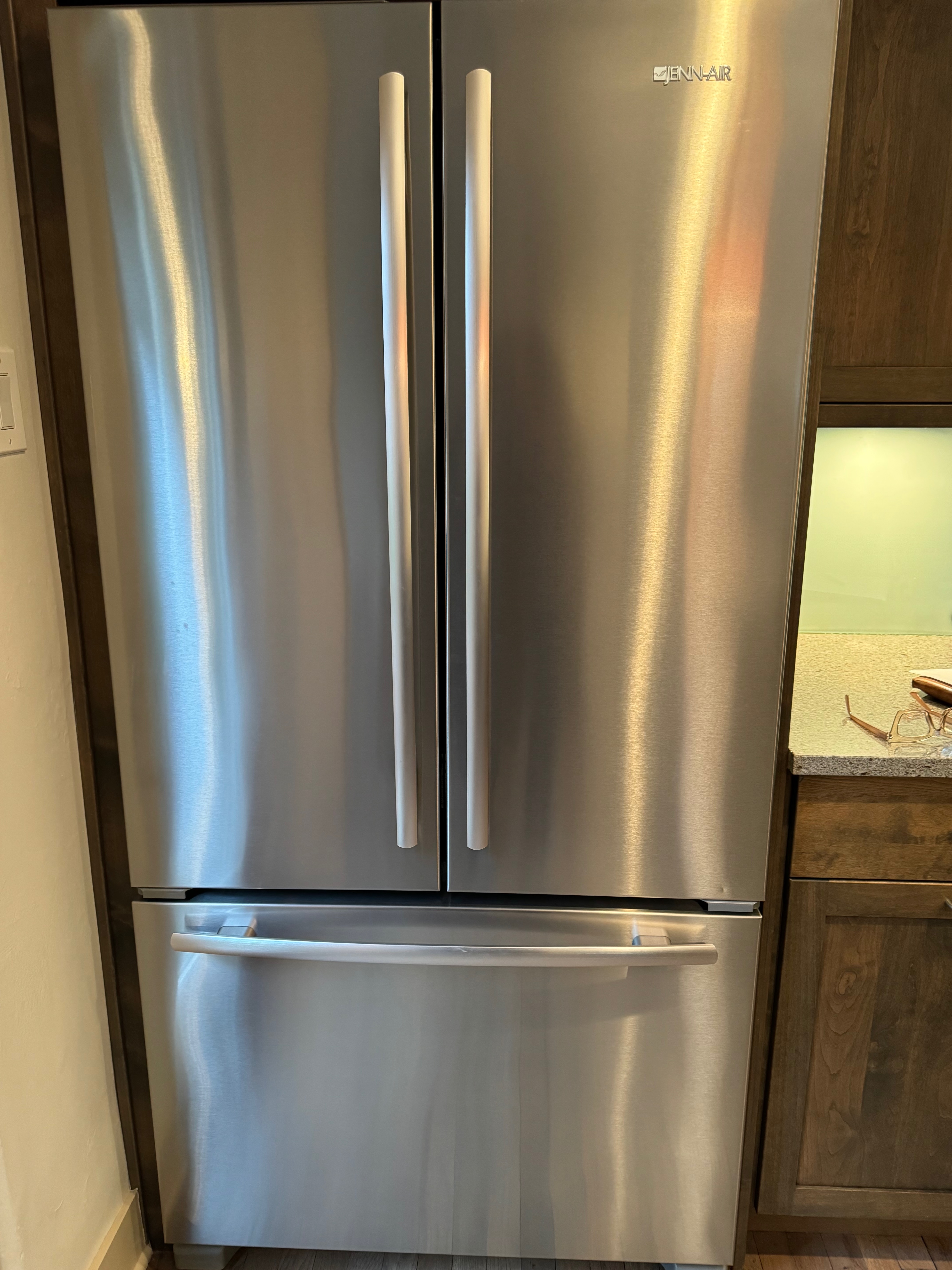 36” Jenn-Air French door, counter depth Refrigerator w/ water dispenser inside and ice maker, Tri-sensor electric climate control, adjustable humidity crisper drawers, control glide-out smooth close freezer drawer Model # JFC2290VEM8 Serial# K53704162 09/15 Listing Price New $4,199