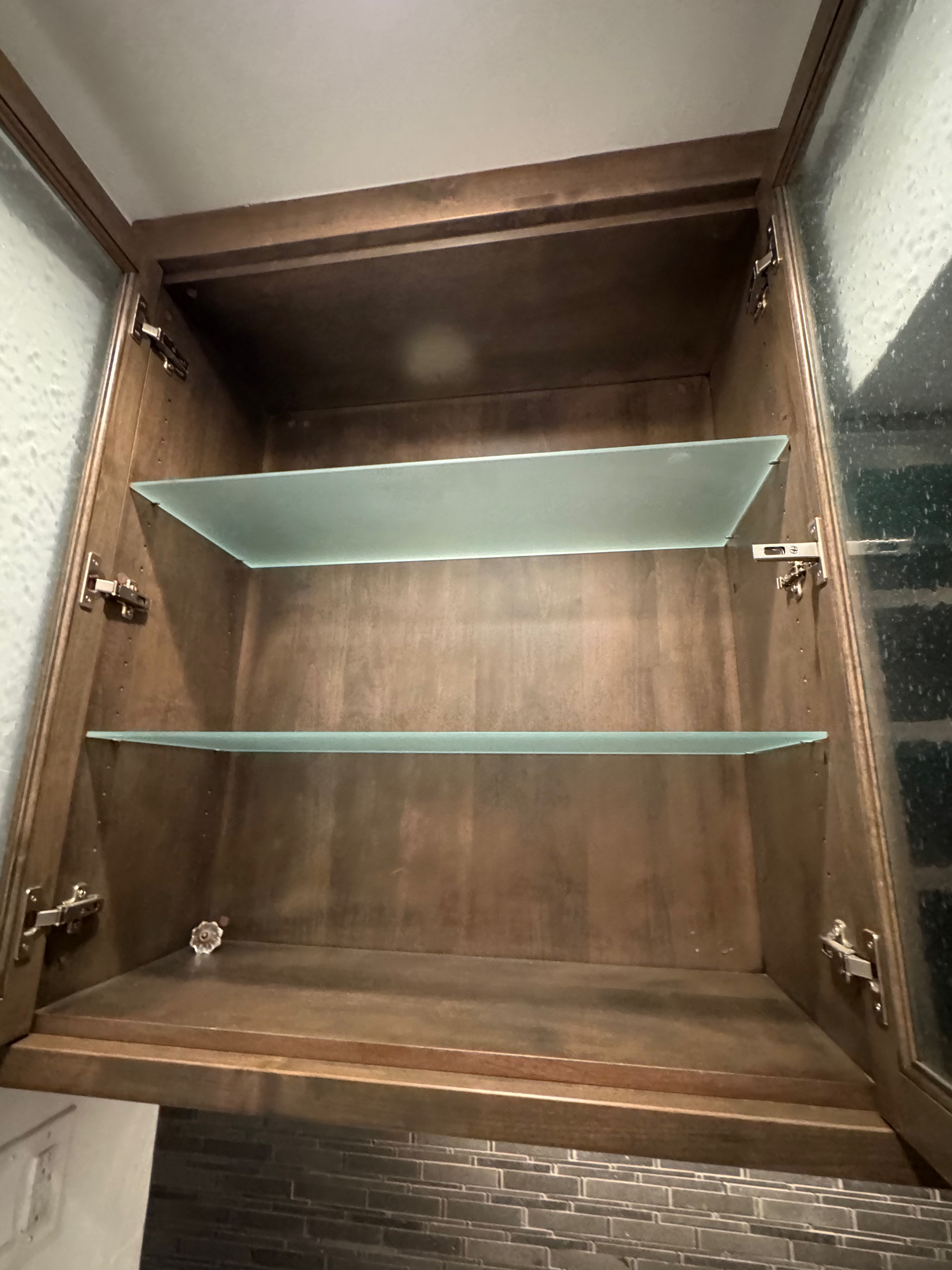 1-Two door glass front wall cabinets with glass shelves Dim.: 33” w x 37 ½”h cabinet only/40 ½”h w/crown/42”h x 14” d