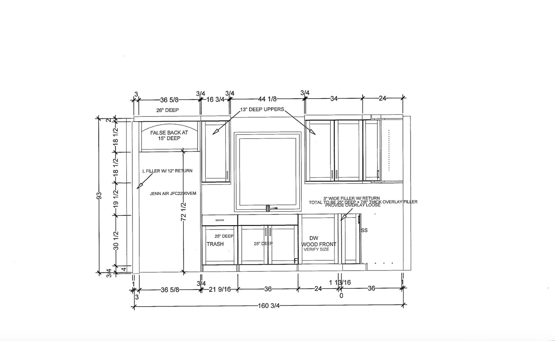 1-Two door upper cabinet Dim.: 34” w x 37”h cabinet only/40” w/ crown/ 41 ¼”h w/ bottom trim x 14” d