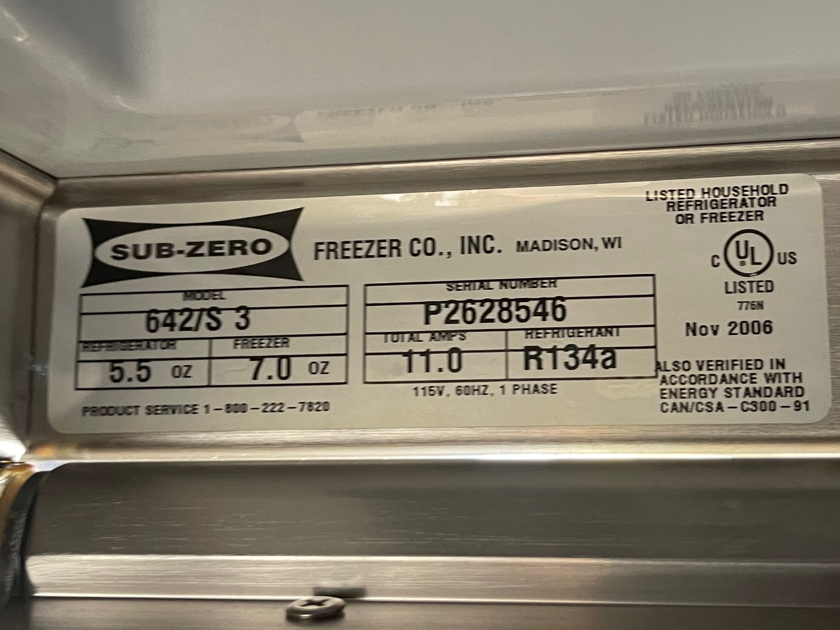42” Sub-Zero Stainless Steel side x side Refrigerator Model# 642/S 3 Serial #P2628546 11/06, Listing price new $7,900