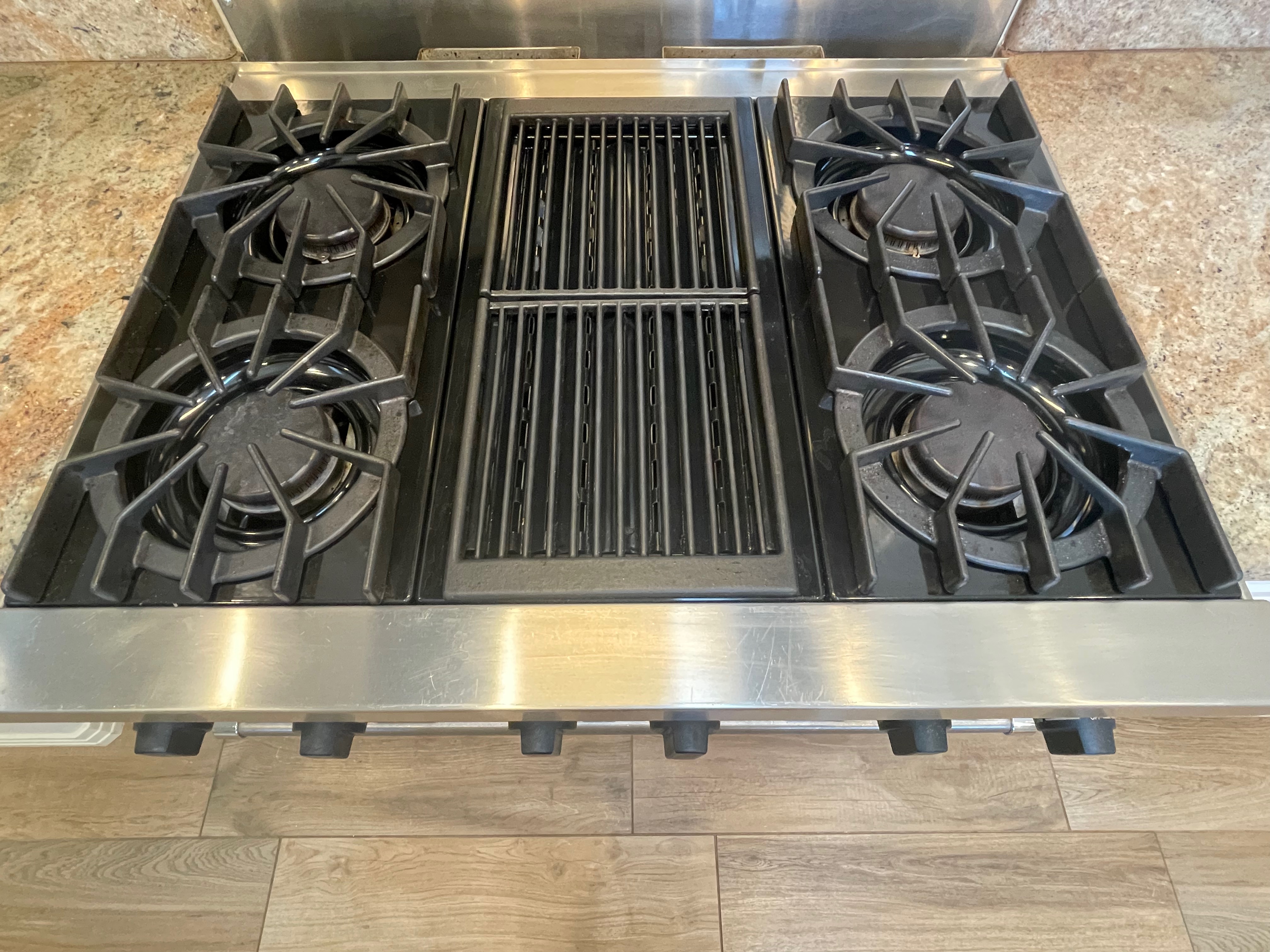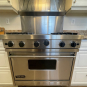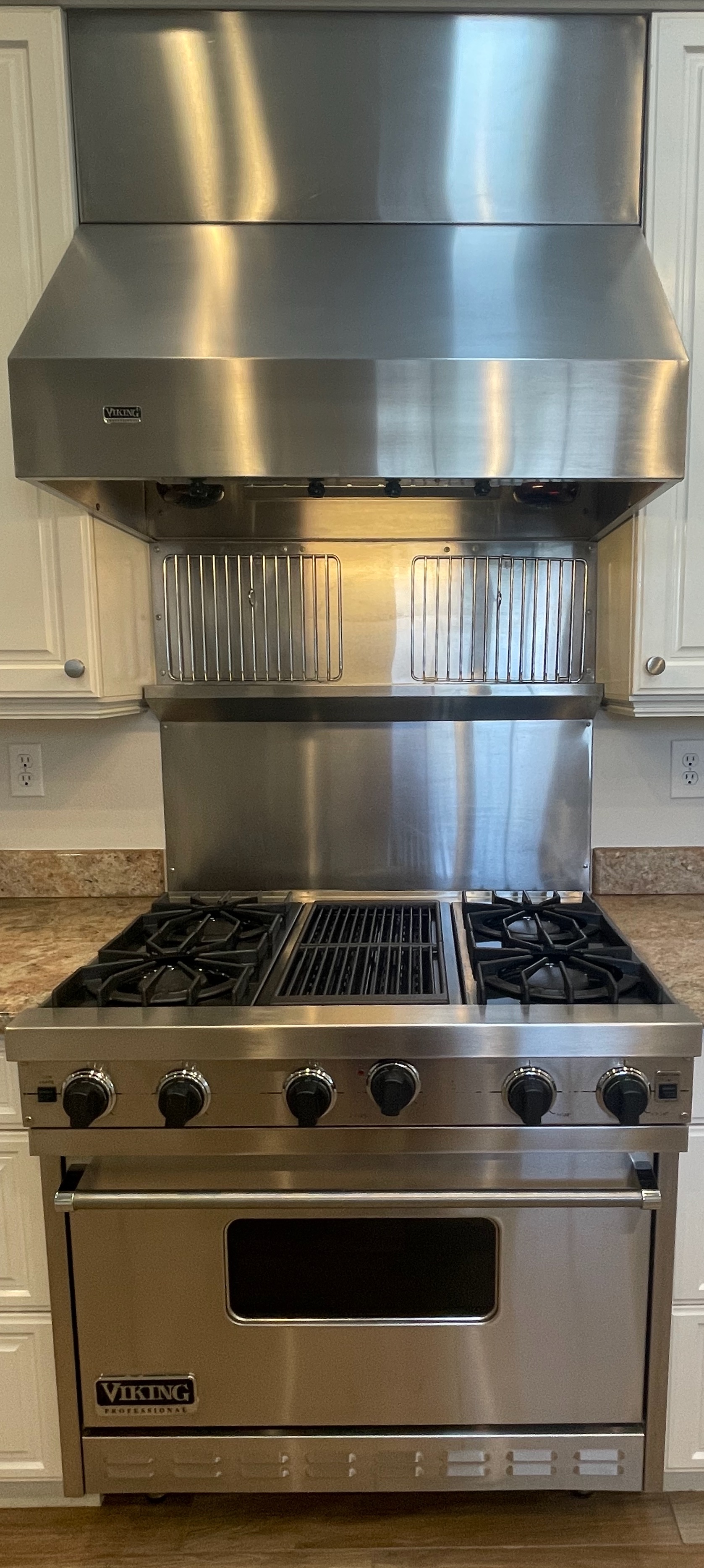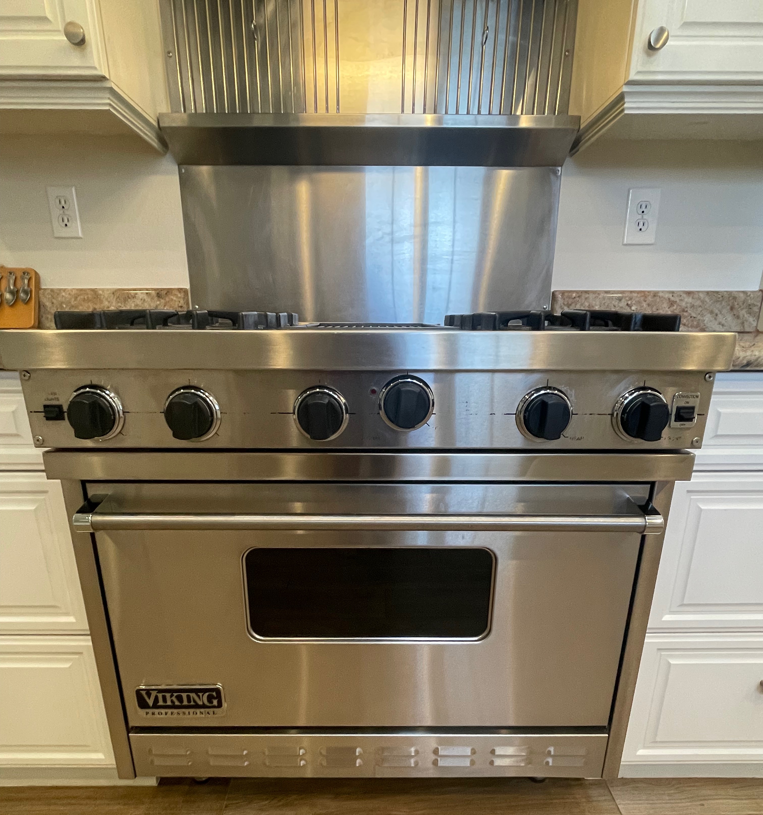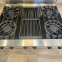 36” Viking S/S Range 36 Inch Pro-Style Commercial-Depth Gas Range, 4 Open Burners w/ VariSimmer, 12 Inch Char-Grill, Dual Baking Burners, 5.2 cu. ft. ProFlow Convection Oven,Model #VGRC365-4QDSS,Serial #R032503013 Listing price new $7,219