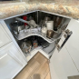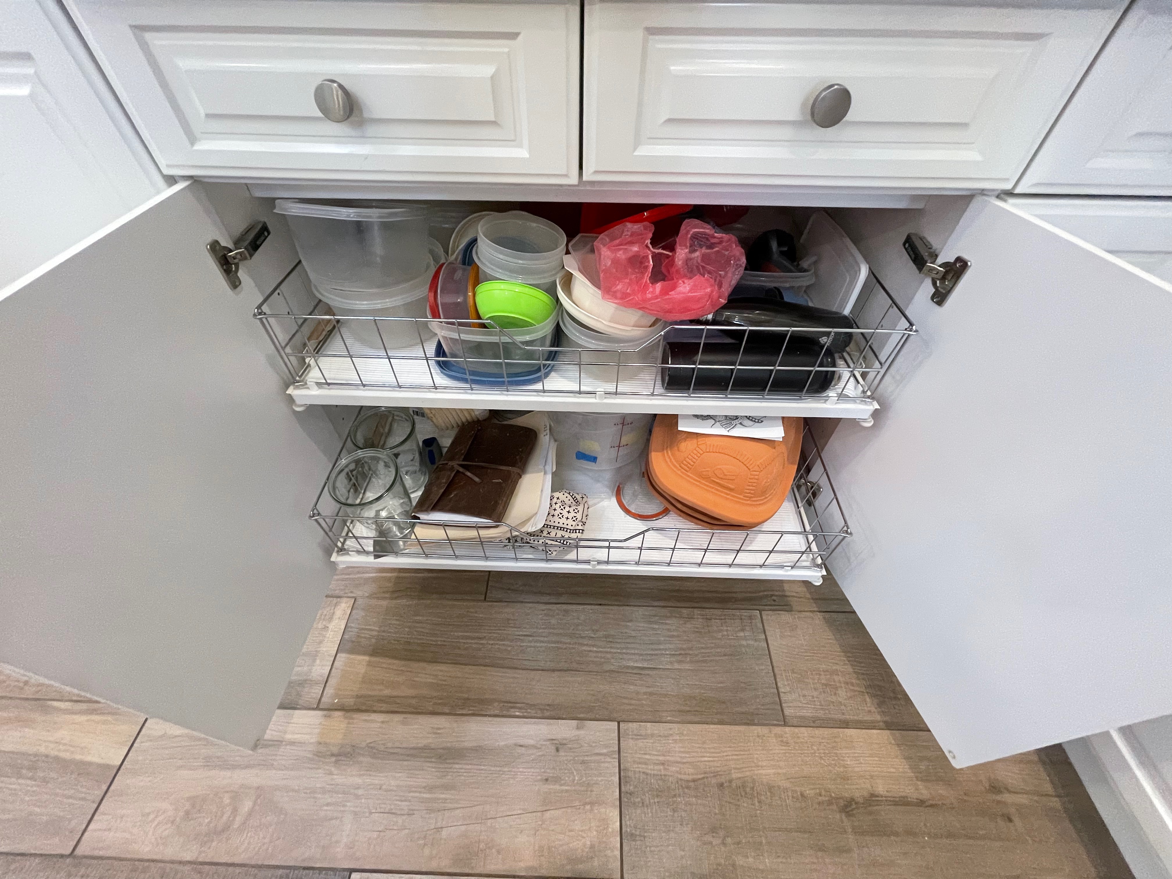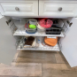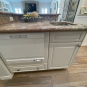 1-One drawer, two door base (actually one door) cabinet w/ 2 trash cans Dim.: 27”w x 36”h x 24”d