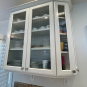 1-Two door glass wall cabinet w/shelf for a microwave/cookbooks Dim.:36“w x 26” h/42“h/ 44”h w/crown/45 ½”h x 12 “d