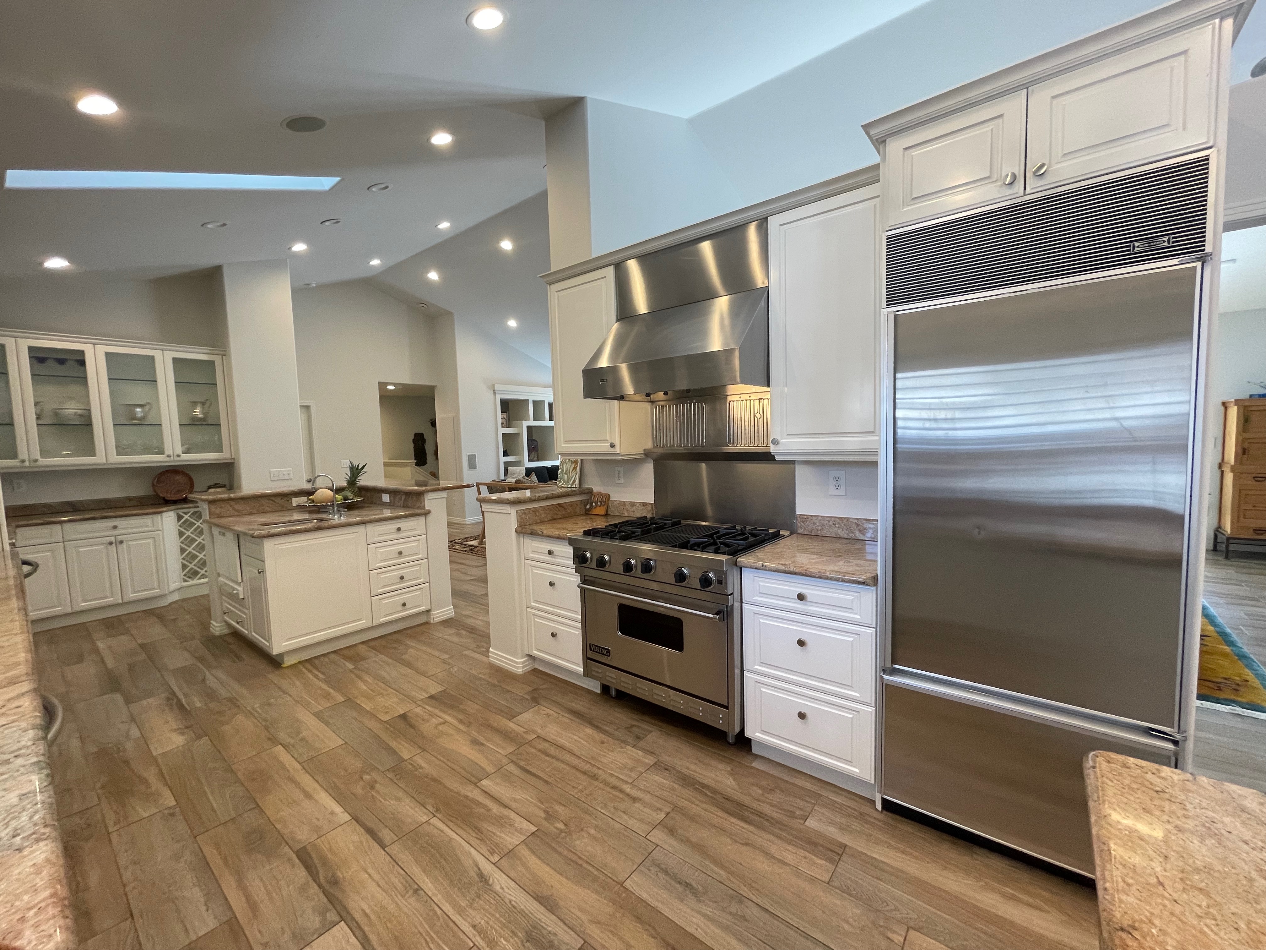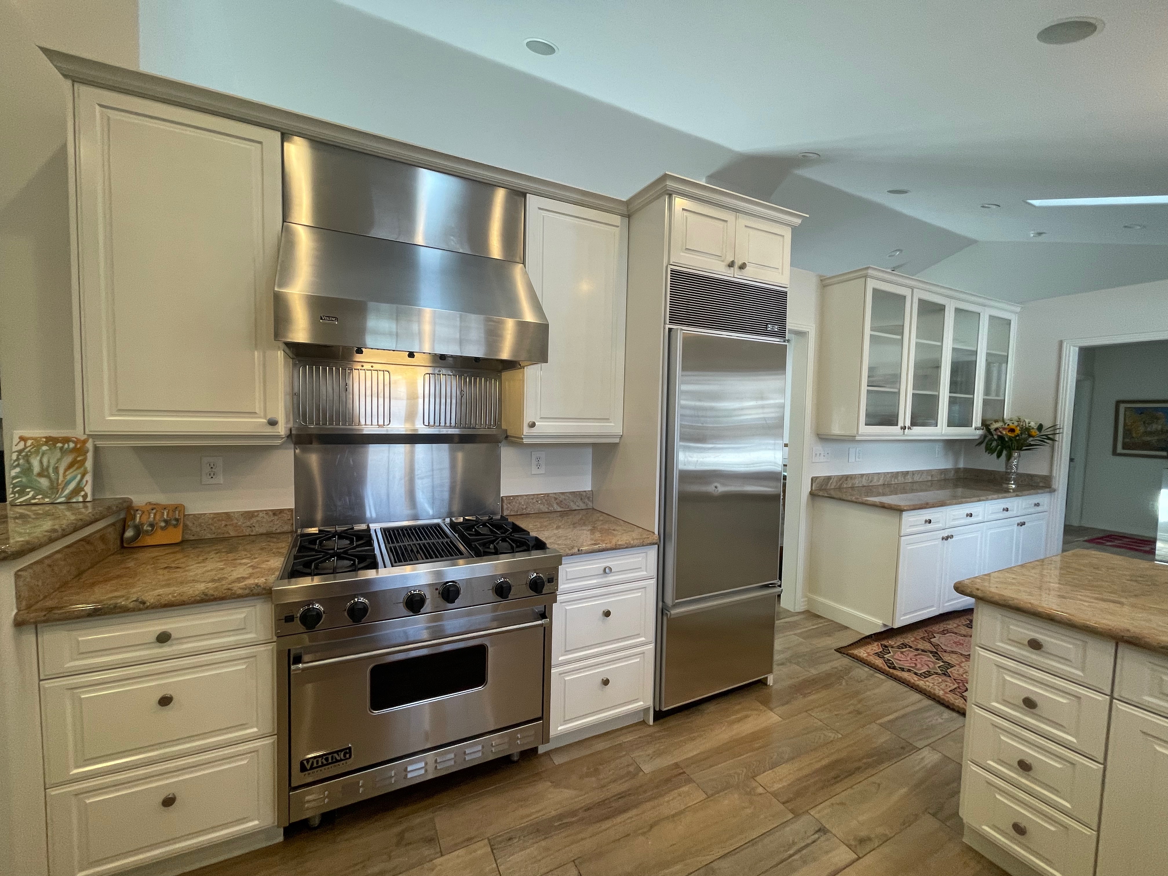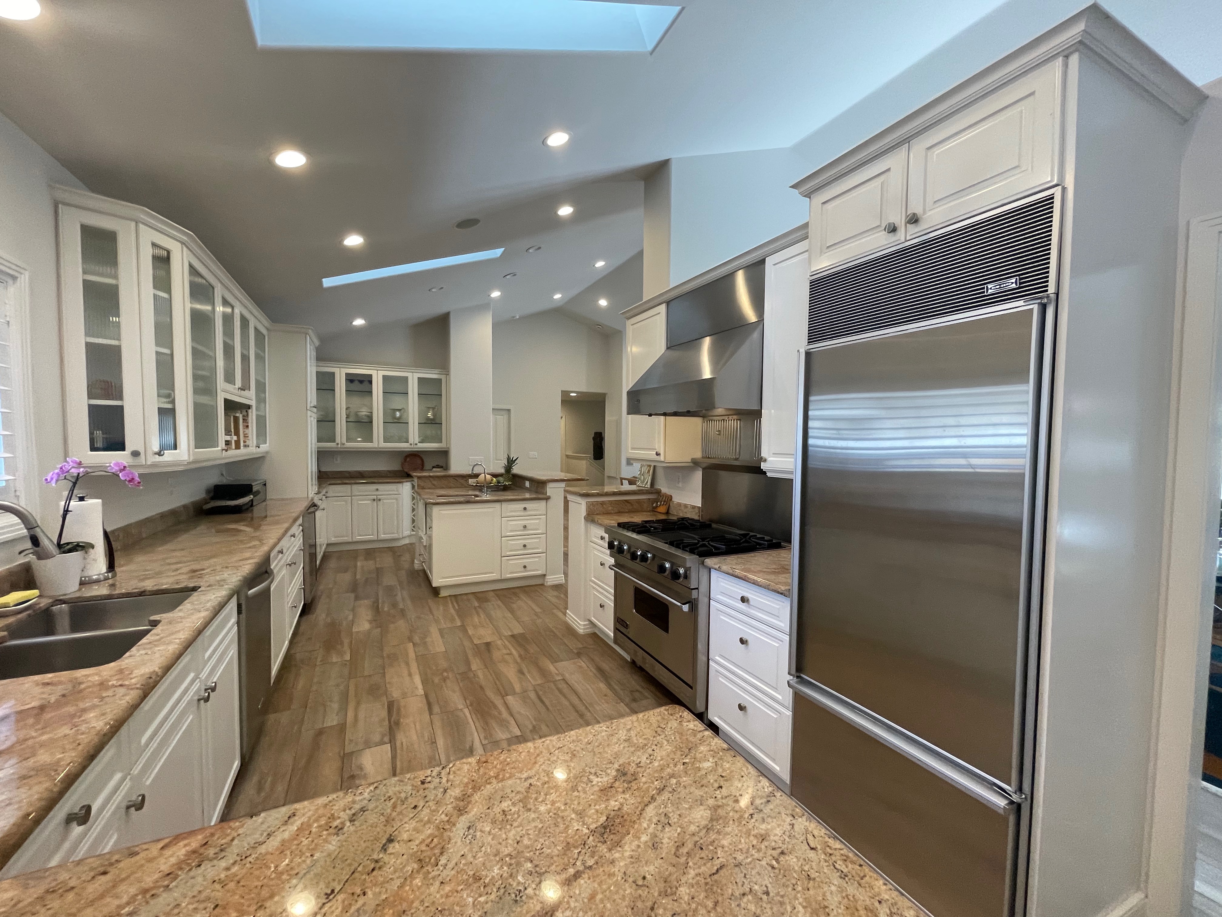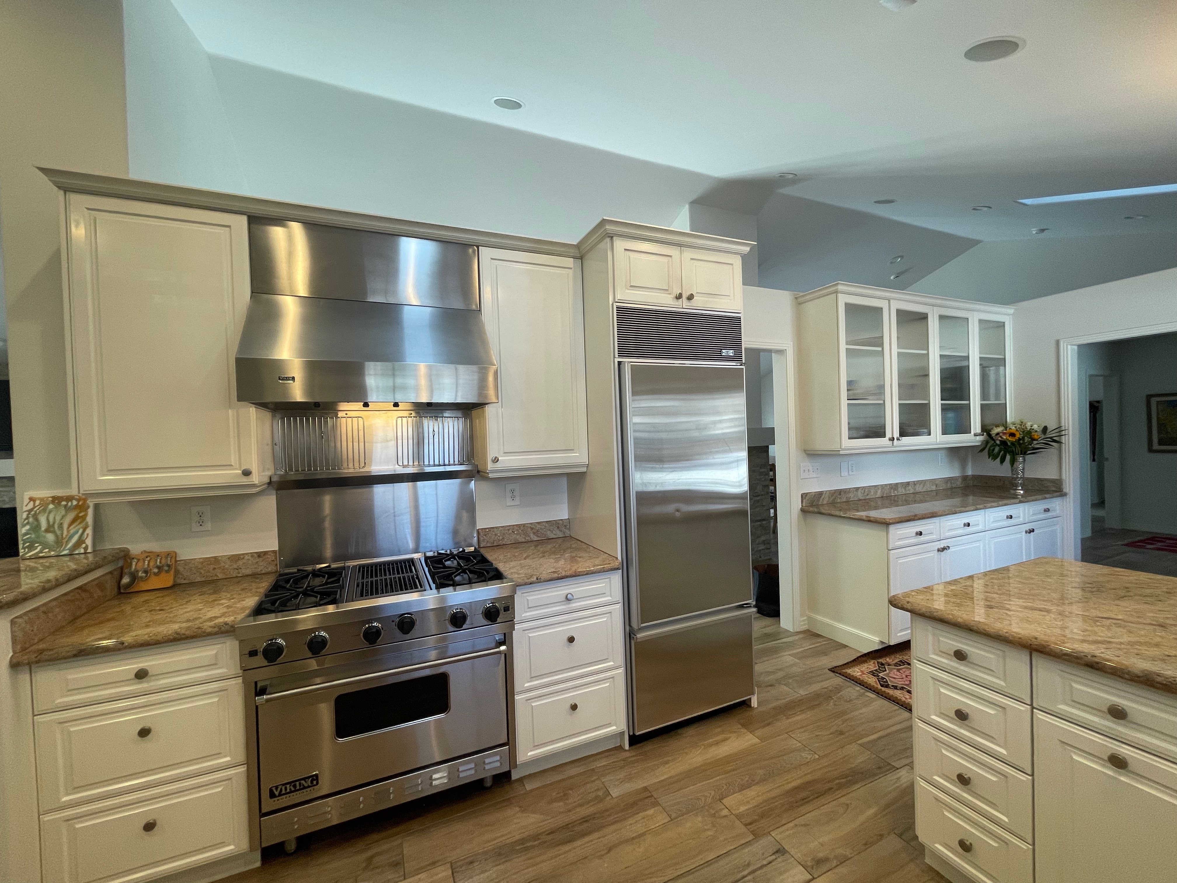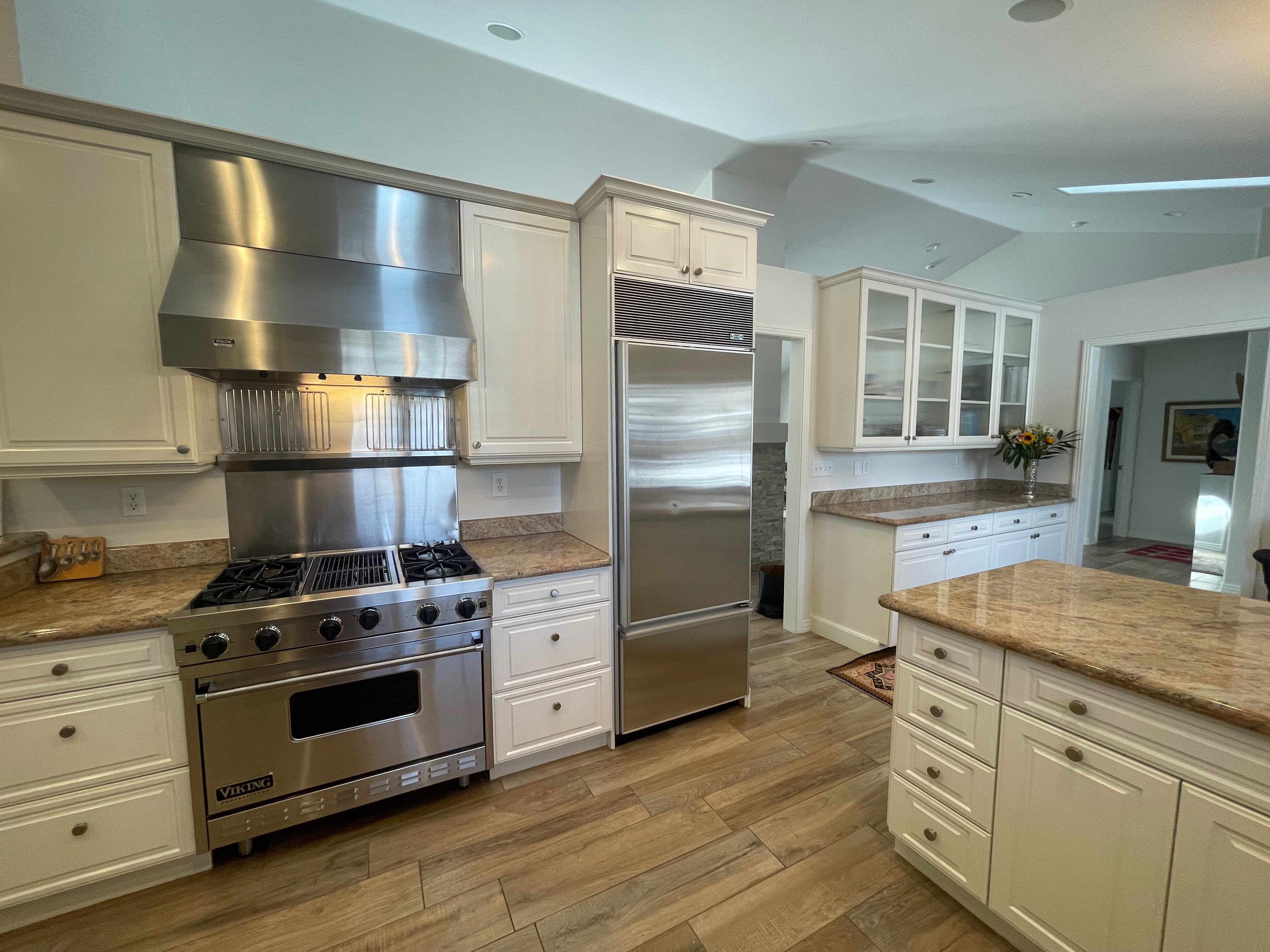 Nice! White “Crystal Cabinet Works” Kitchen Cabinets in excellent condition! This kitchen package comes with a Stainless-Steel Sub-Zero refrigerator, Viking range, Viking hood and more! Granite counter tops, sinks and faucet sets complete this kitchen set. The kitchen has been professionally removed and is ready to be picked up! The price for the package below.