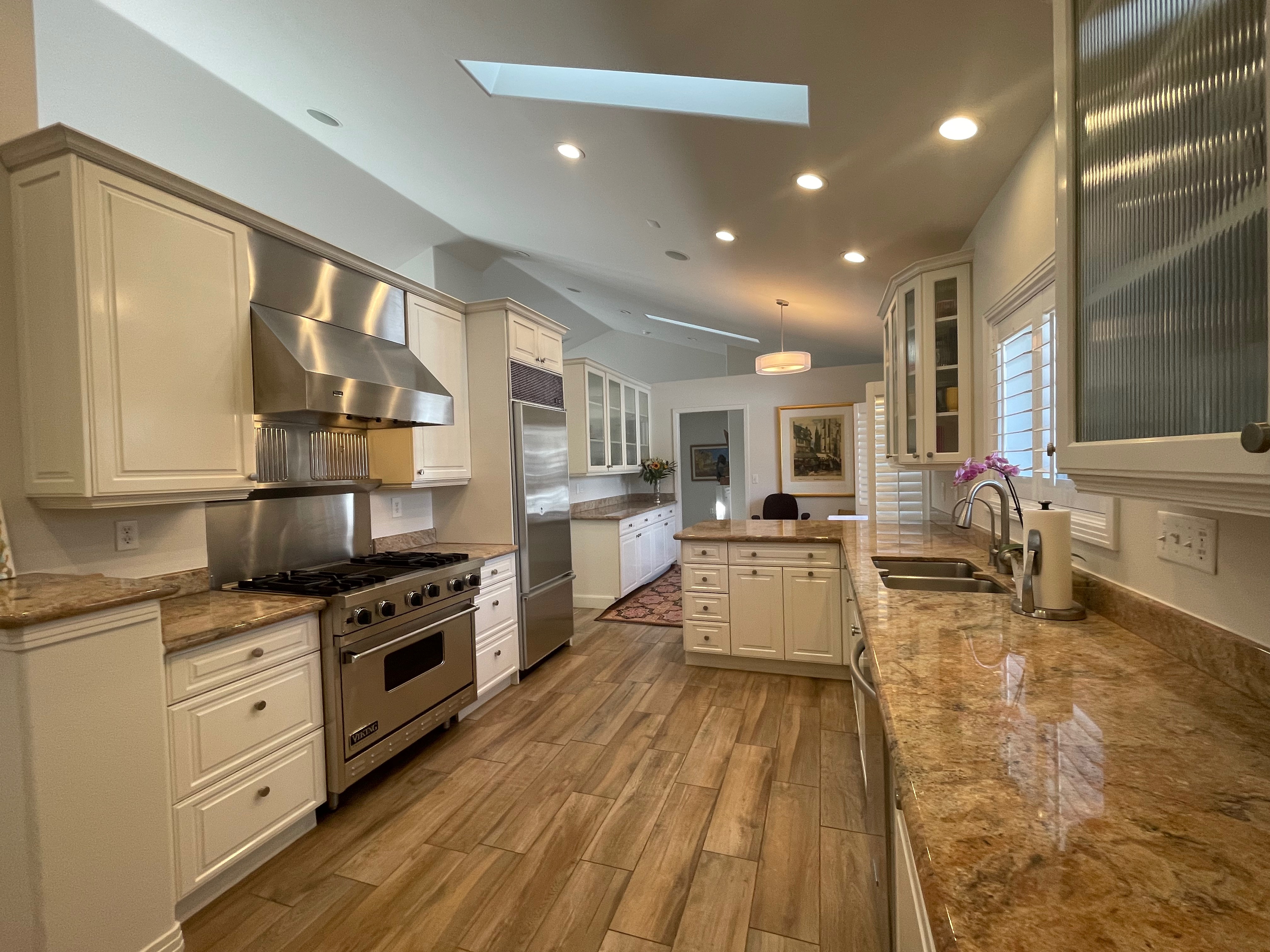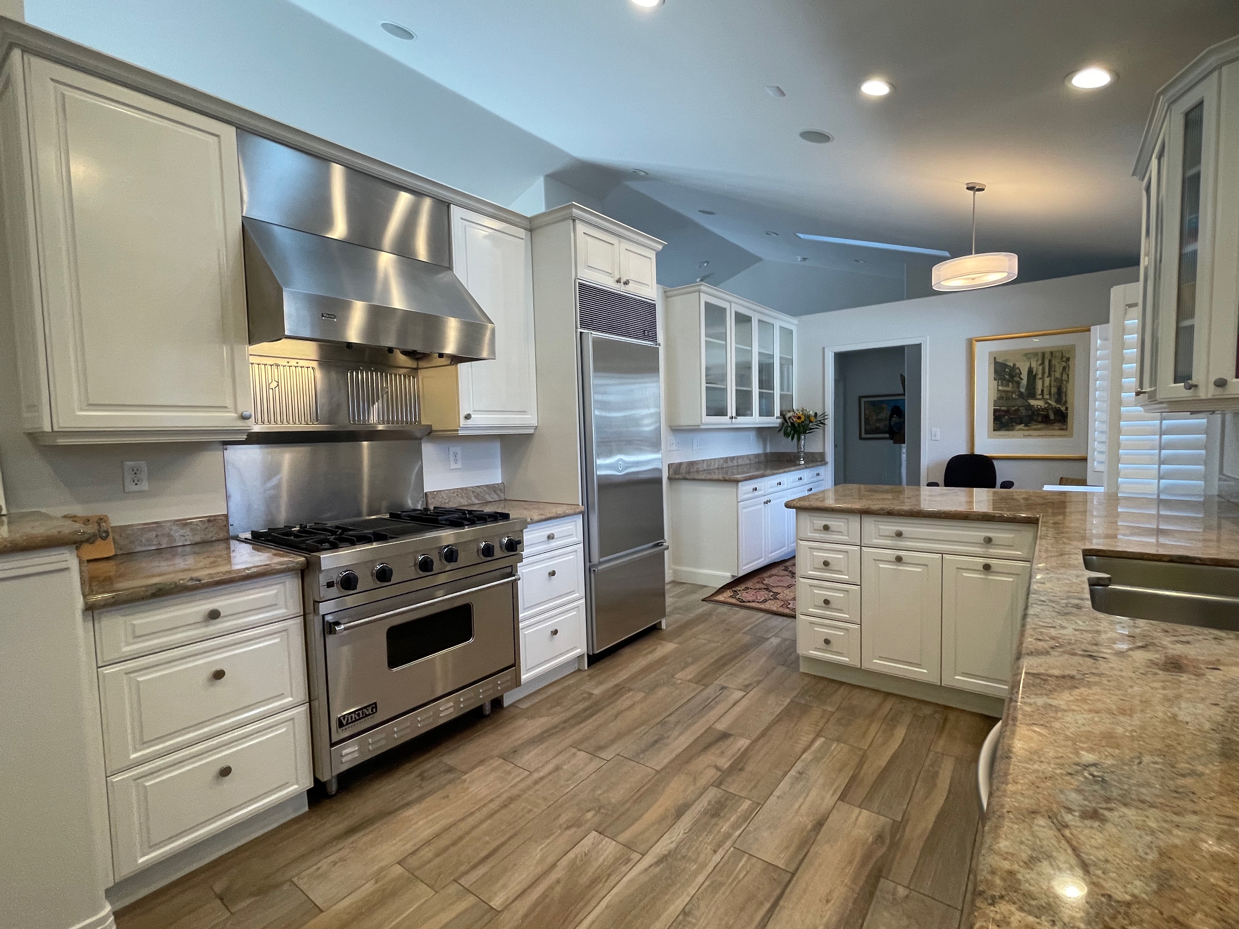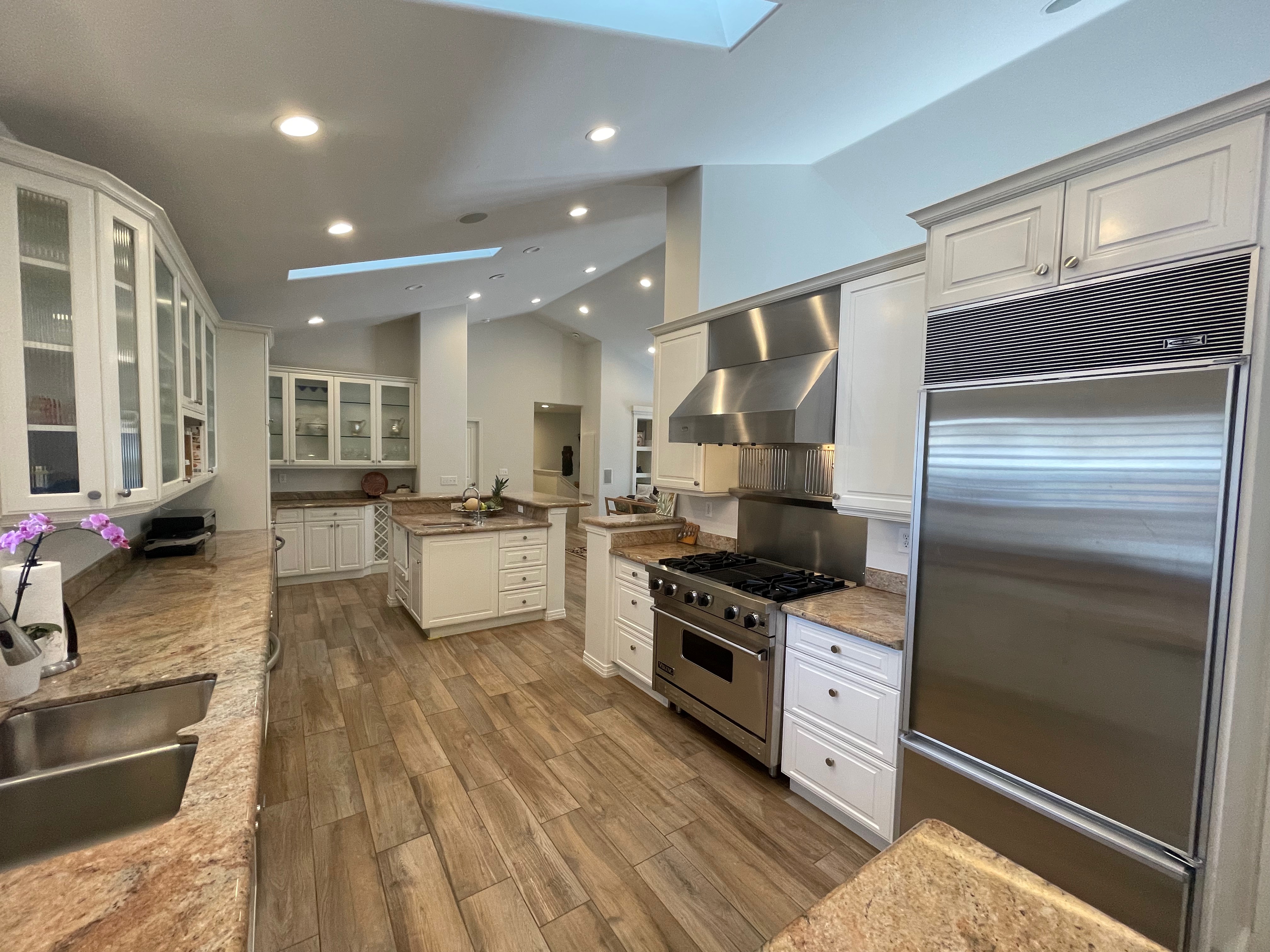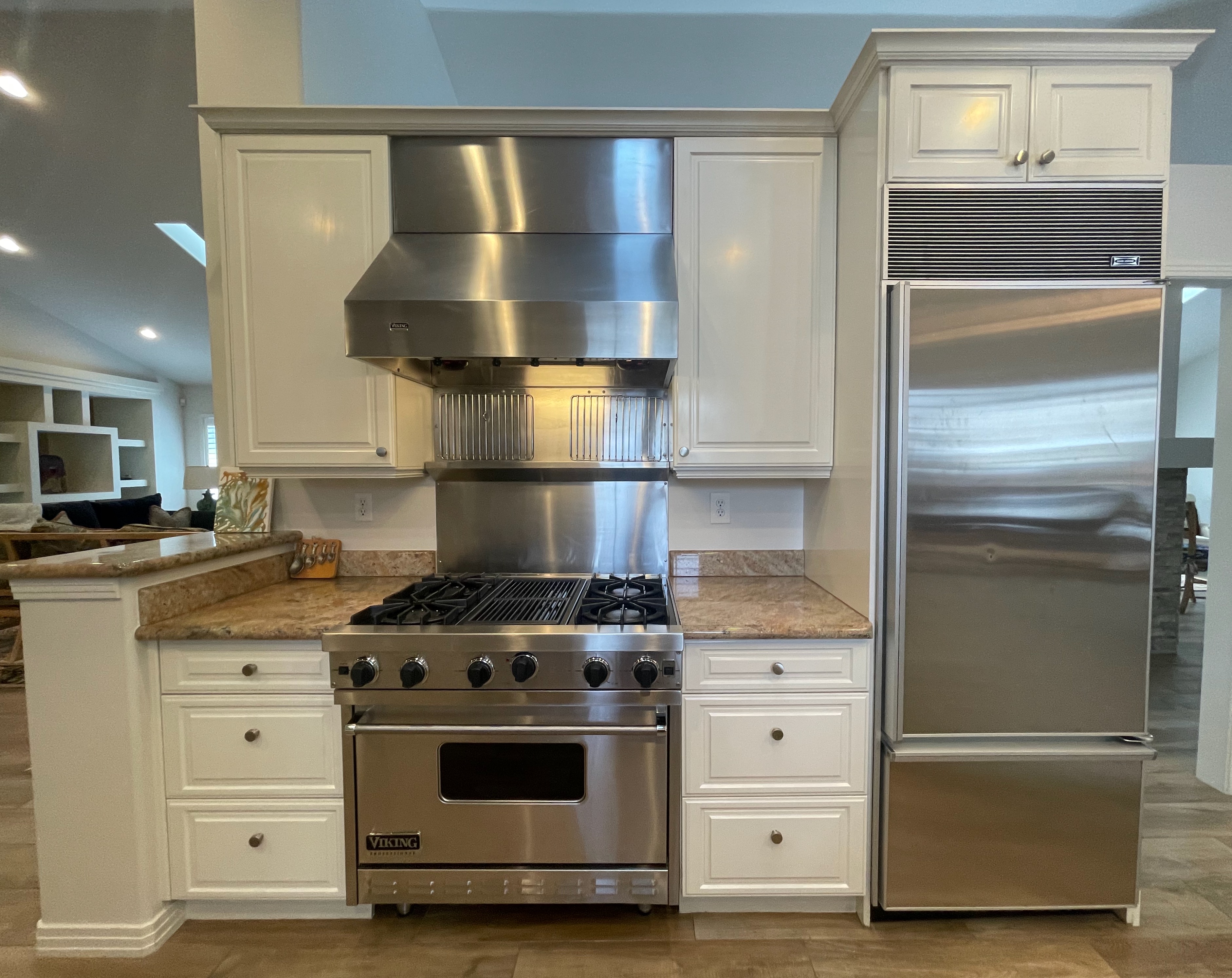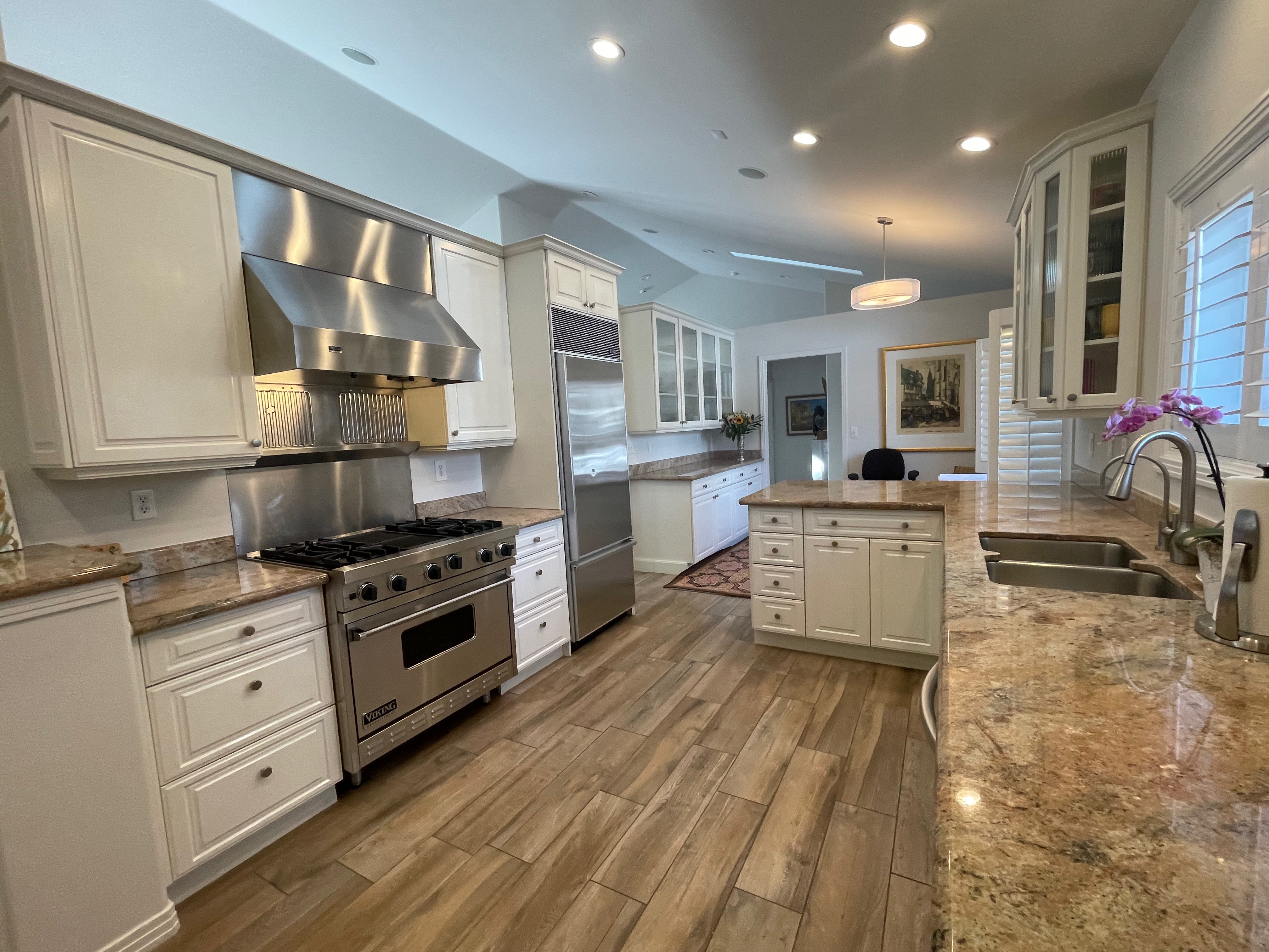 Nice! White “Crystal Cabinet Works” Kitchen Cabinets in excellent condition! This kitchen package comes with a Stainless-Steel Sub-Zero refrigerator, Viking range, Viking hood and more! Granite counter tops, sinks and faucet sets complete this kitchen set. The kitchen has been professionally removed and is ready to be picked up! The price for the package below.