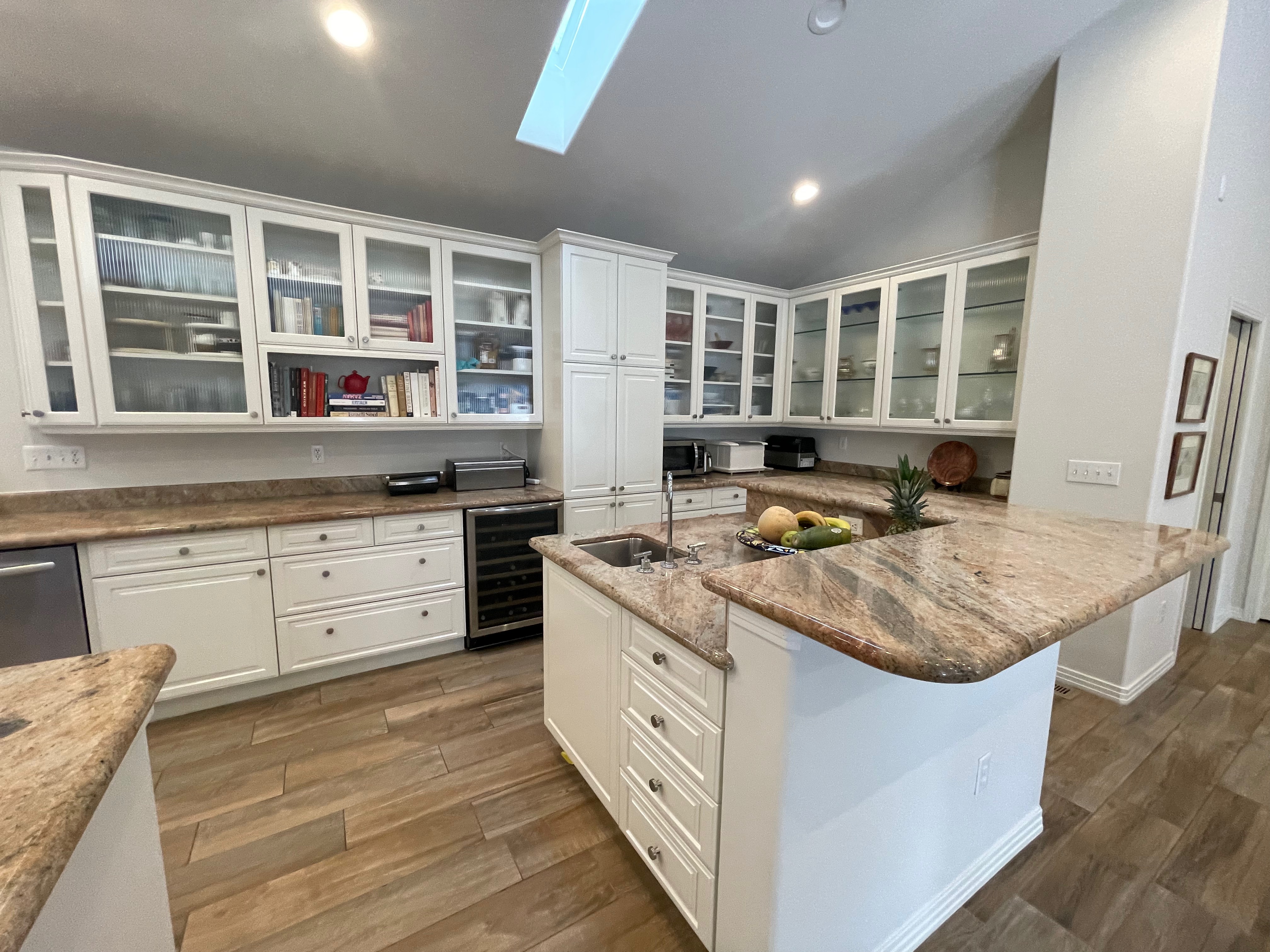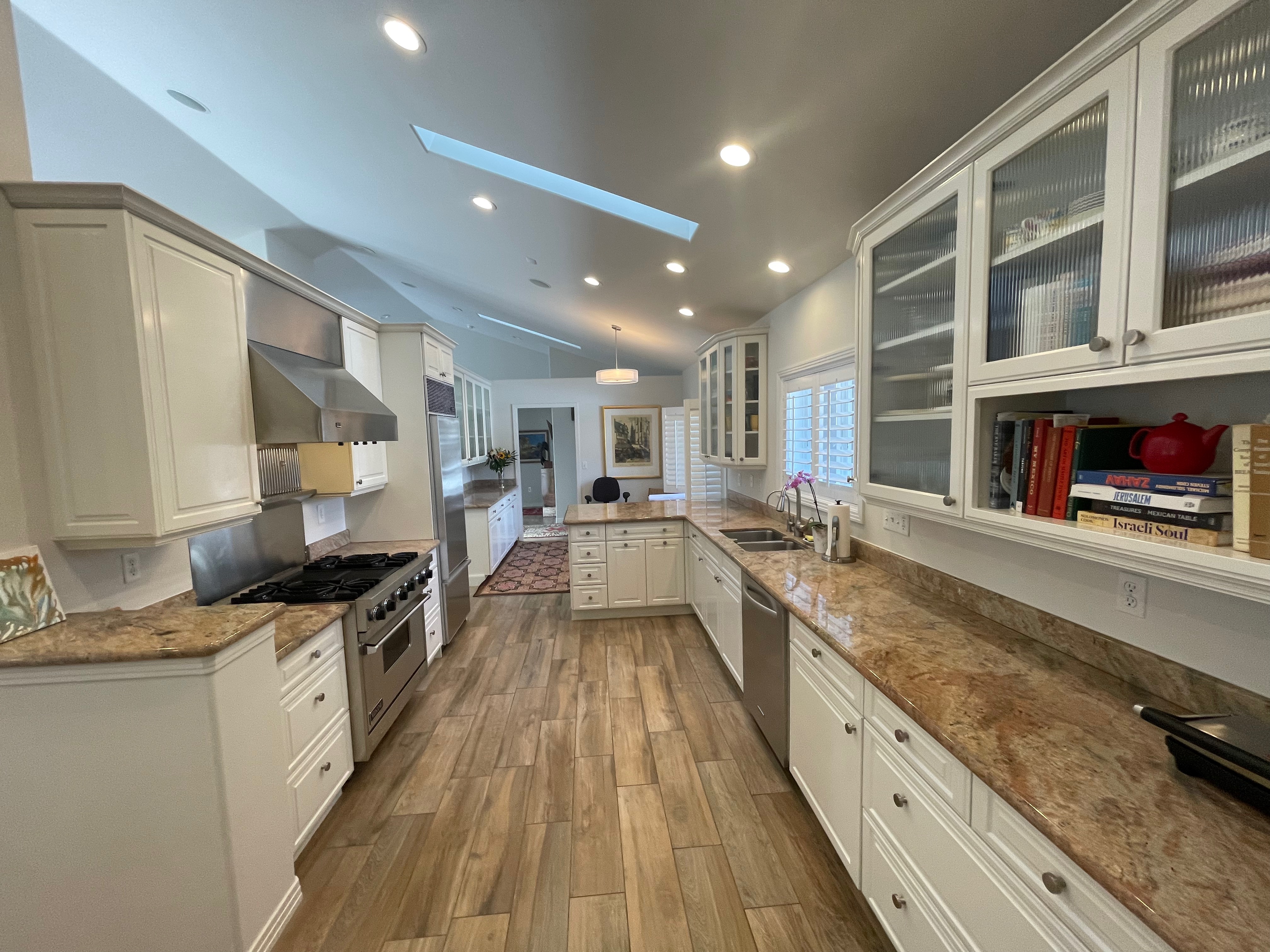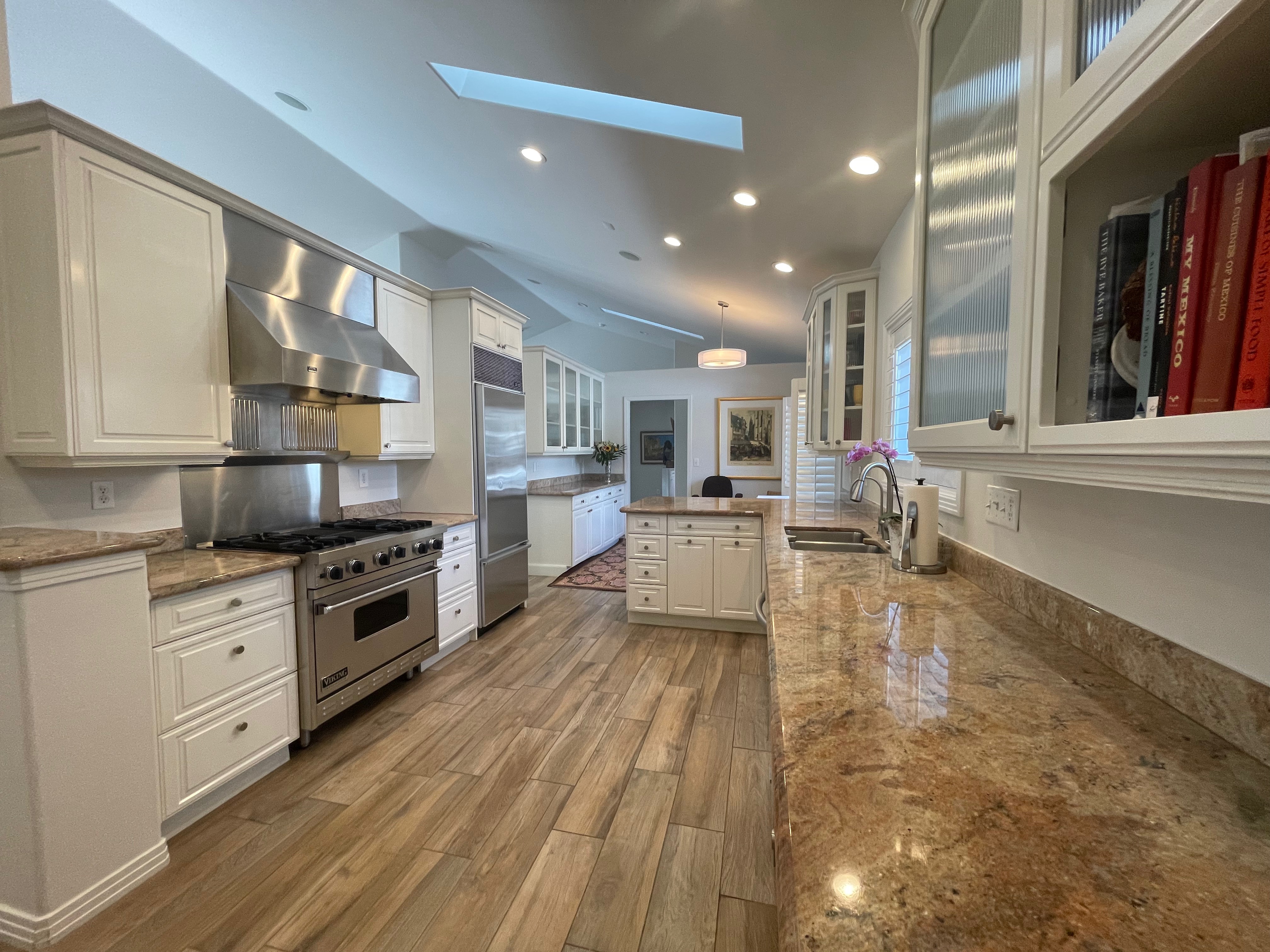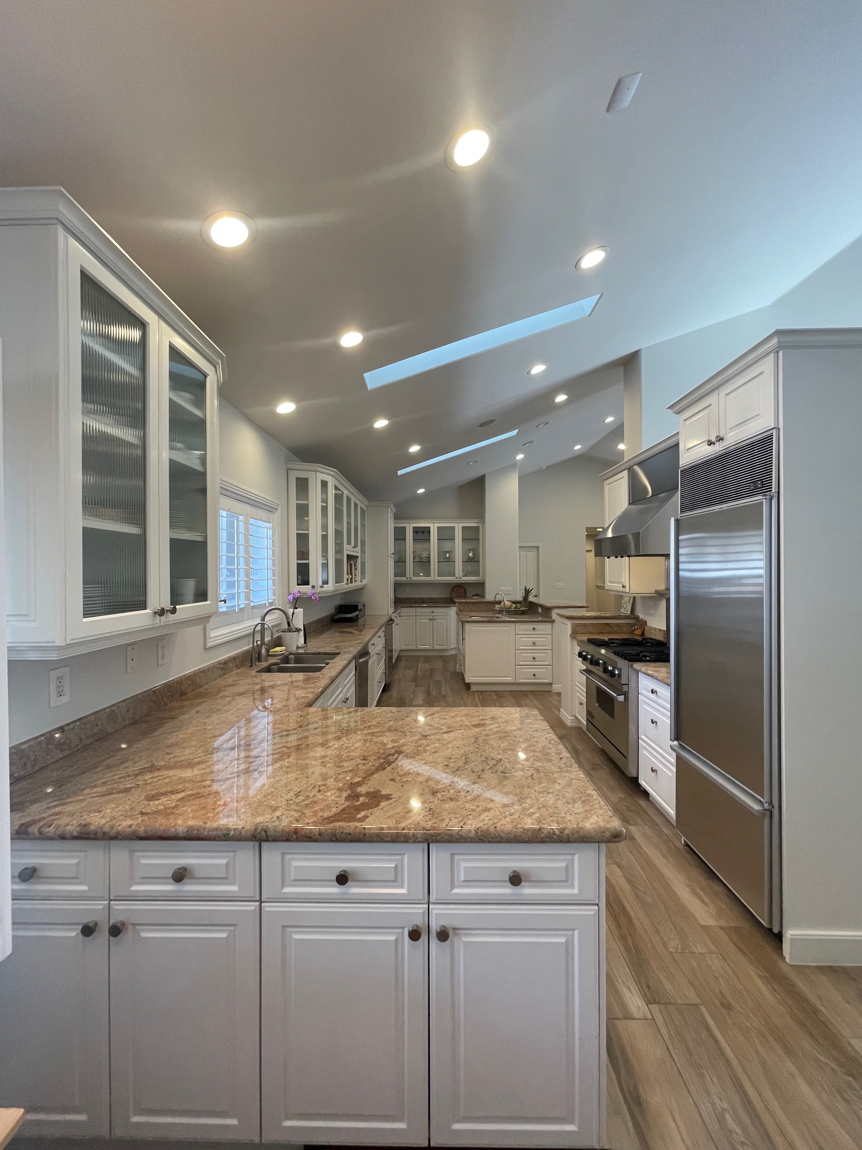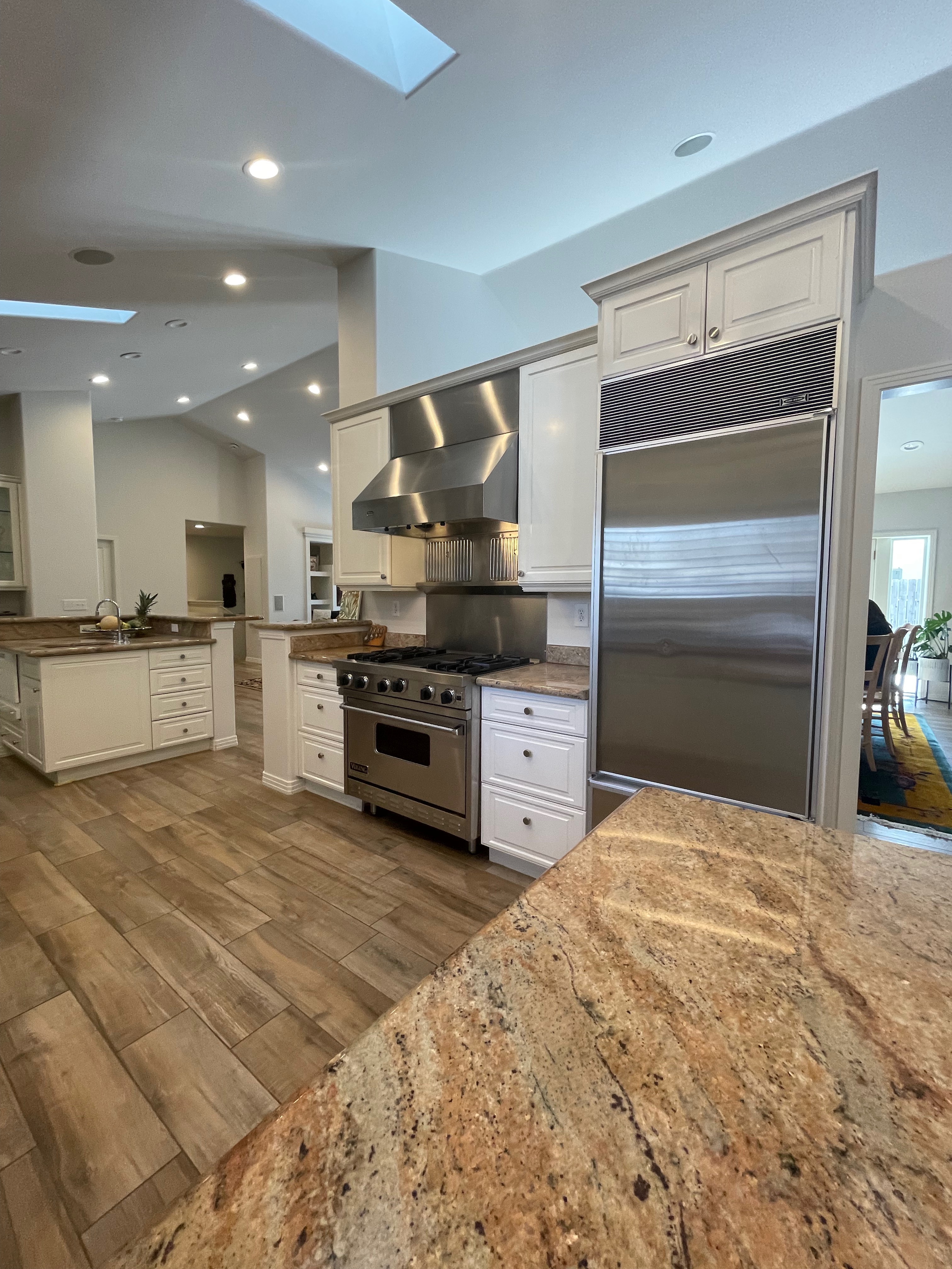 Nice! White “Crystal Cabinet Works” Kitchen Cabinets in excellent condition! This kitchen package comes with a Stainless-Steel Sub-Zero refrigerator, Viking range, Viking hood and more! Granite counter tops, sinks and faucet sets complete this kitchen set. The kitchen has been professionally removed and is ready to be picked up! The price for the package below.