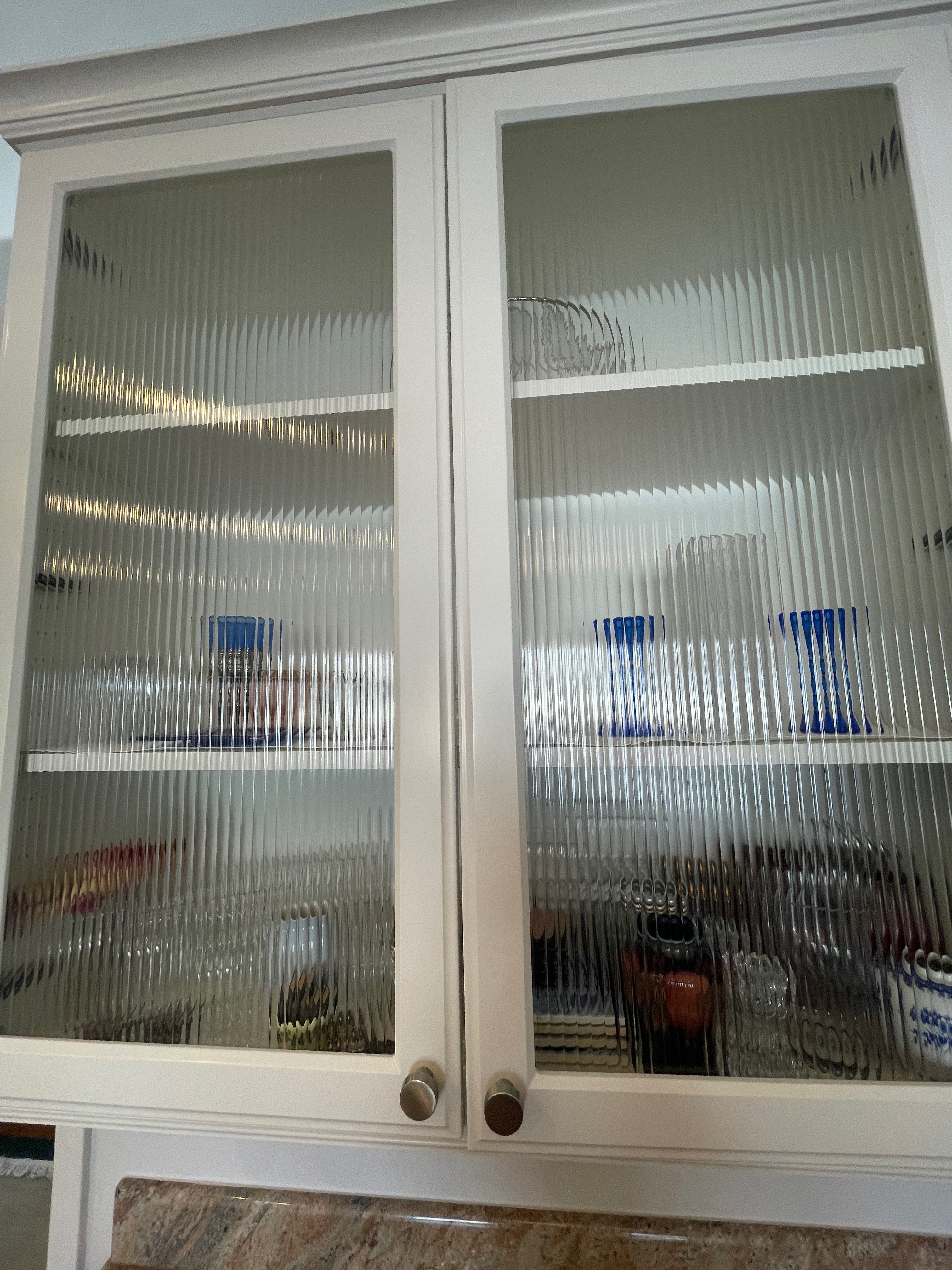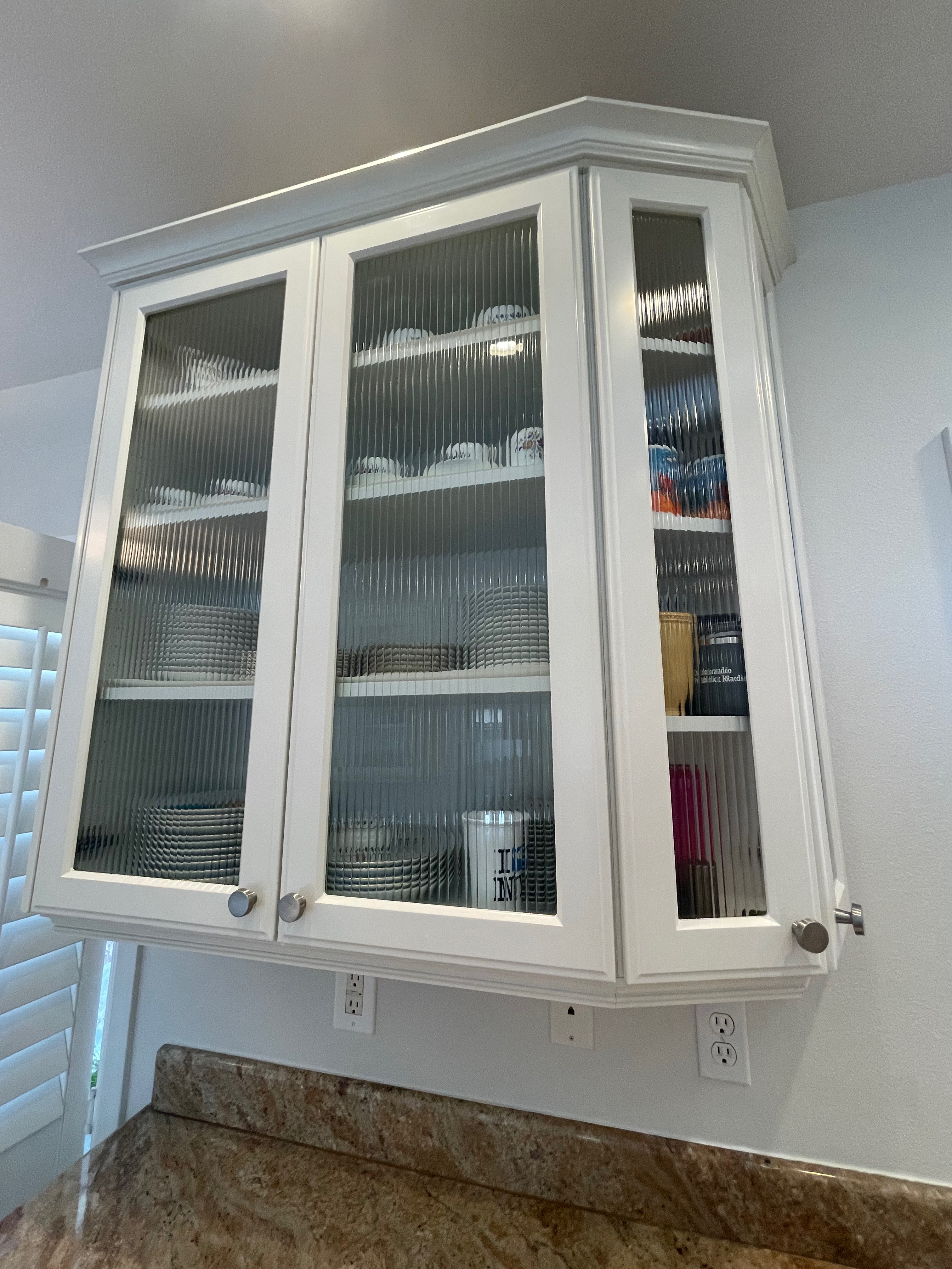 1-One door glass blind corner wall cabinet Dim.: 30”w x 42“h cab. only/44”h w/crown/45 ½”h x 12“d
